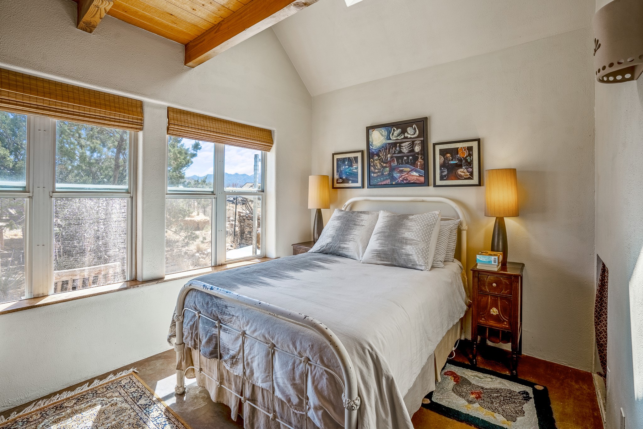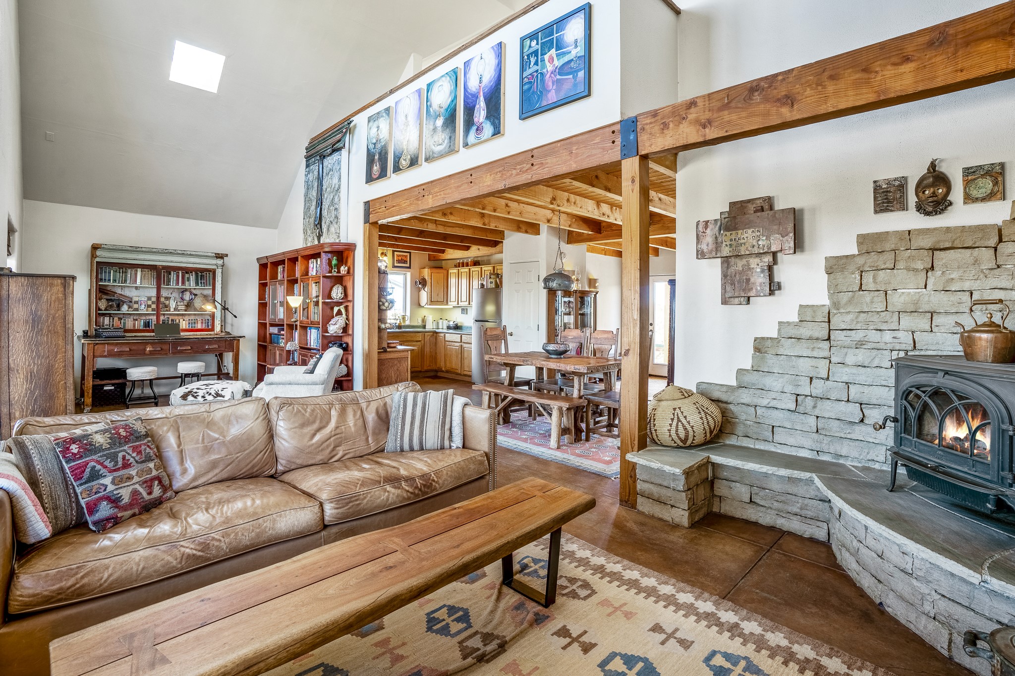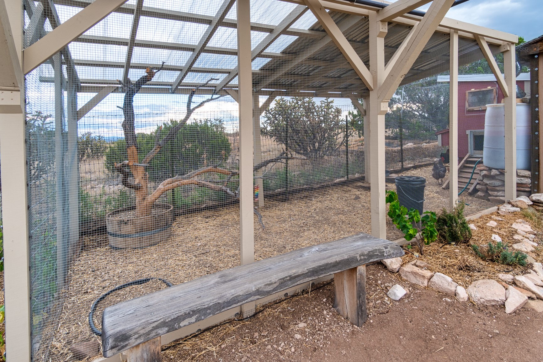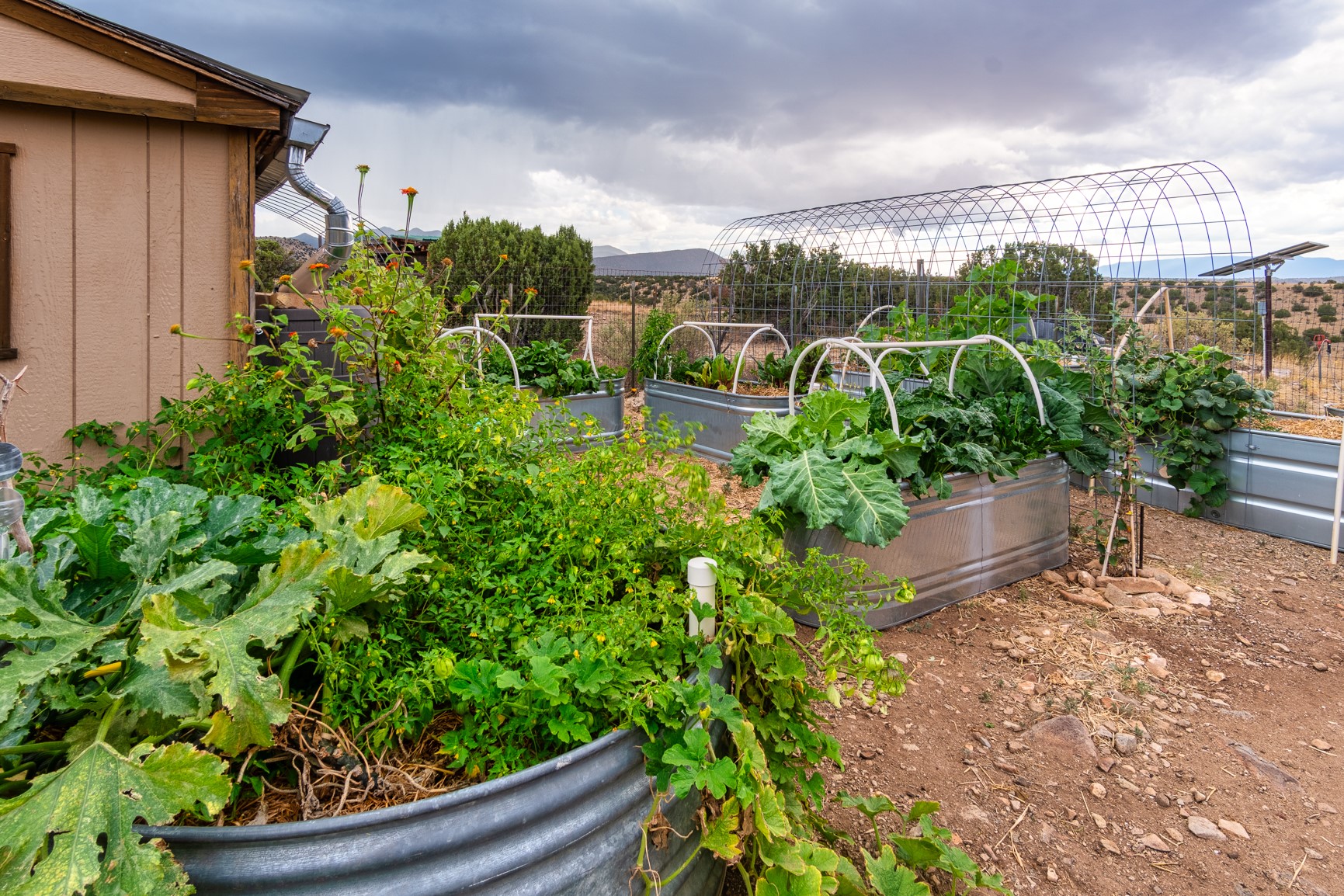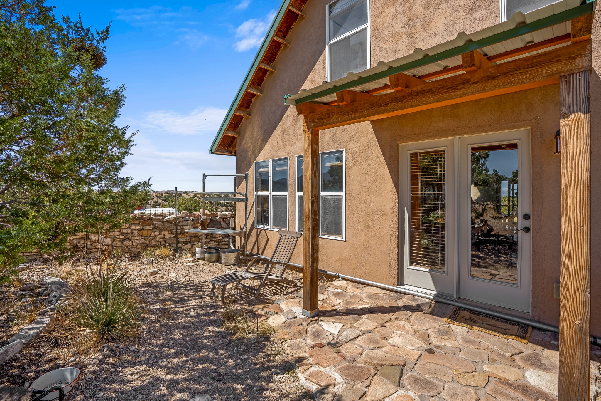 You'll find this high-desert homestead perched on a mesa's edge, with jaw-dropping views in every direction. A high-ceilinged, 1259 square foot home, with one bedroom and one bathroom, sits on 40 acres. This open floor plan home gives many configuration options- a roomy yet cozy space. Property has abundant, thriving gardens, a shed and chicken coop, as well as a corral and space for horses. Water is supplied by a private well, and electricity by the sun. Sellers have recently invested nearly $50,000 in the property, including new solar panels, charge controller, inverters, and batteries, 5600 gallons of water storage (in addition to 3100 gallons of rain catchment), new well pump, booster pump and whole house water filtration system. 3.5 miles from highway 14. Come experience the profound privacy, and quiet this property provides while only being a short hop to the thriving artist community of Madrid and a 45 min drive to Santa Fe. Excellent off the grid property with expansive vistas of the Cerrillos Hills and the Jemez, Sangre de Cristo, Ortiz, and Sandia Mountains.
