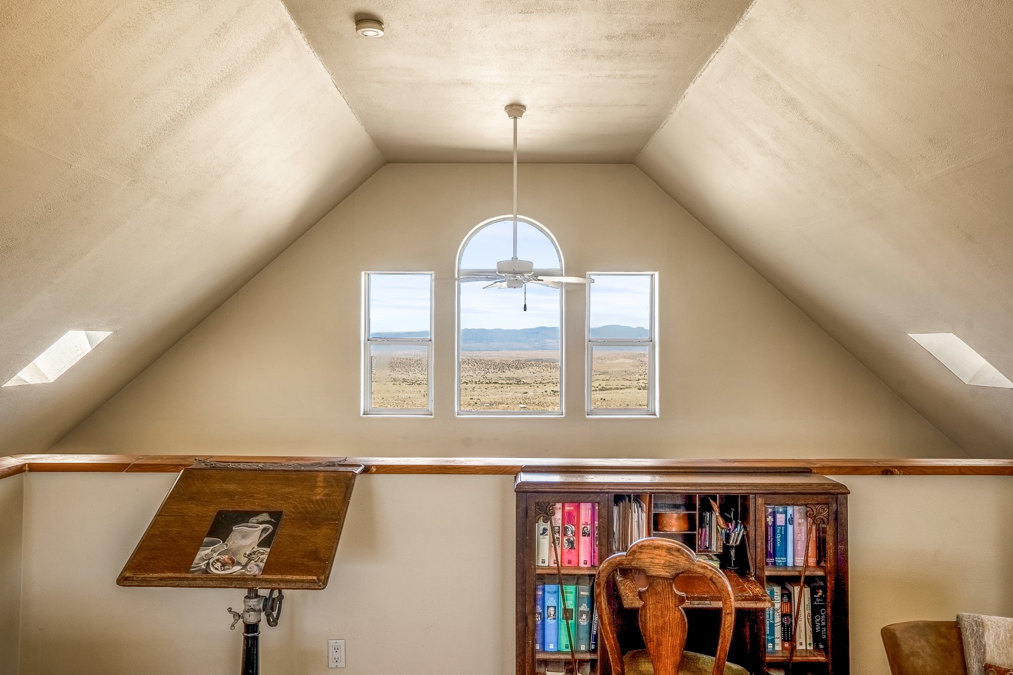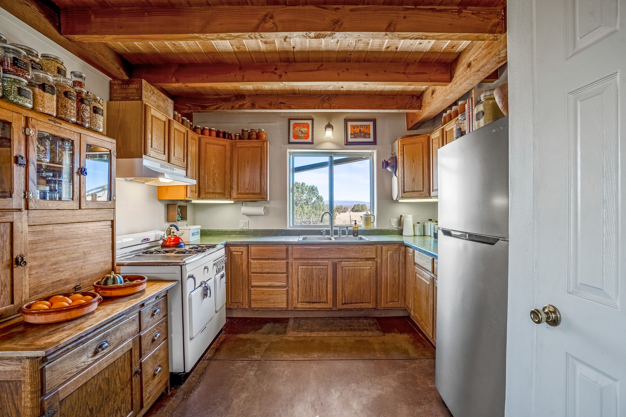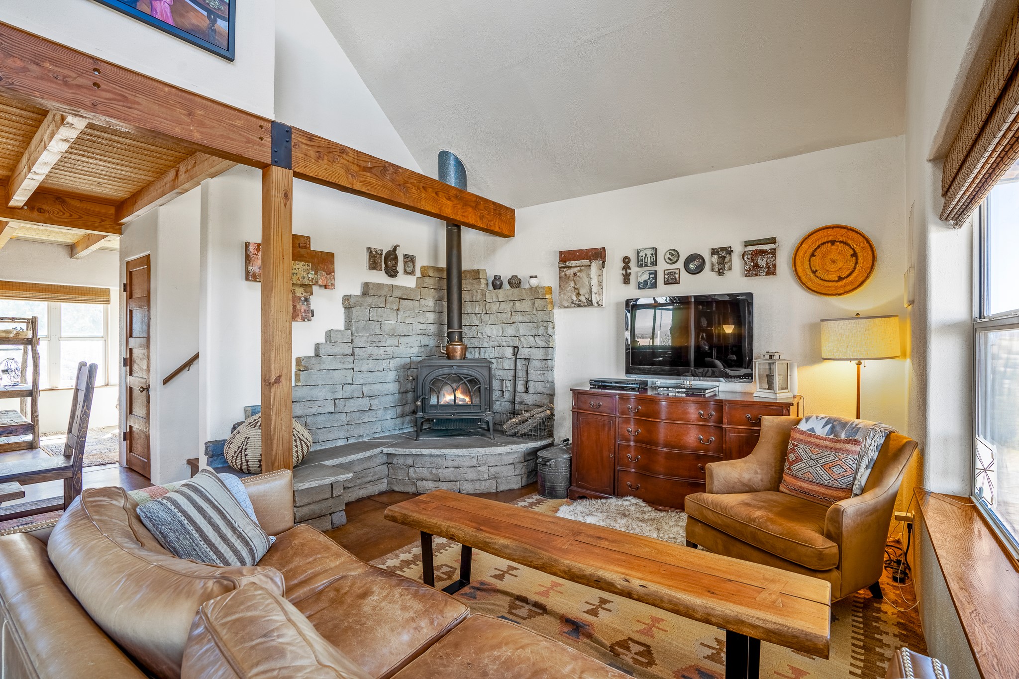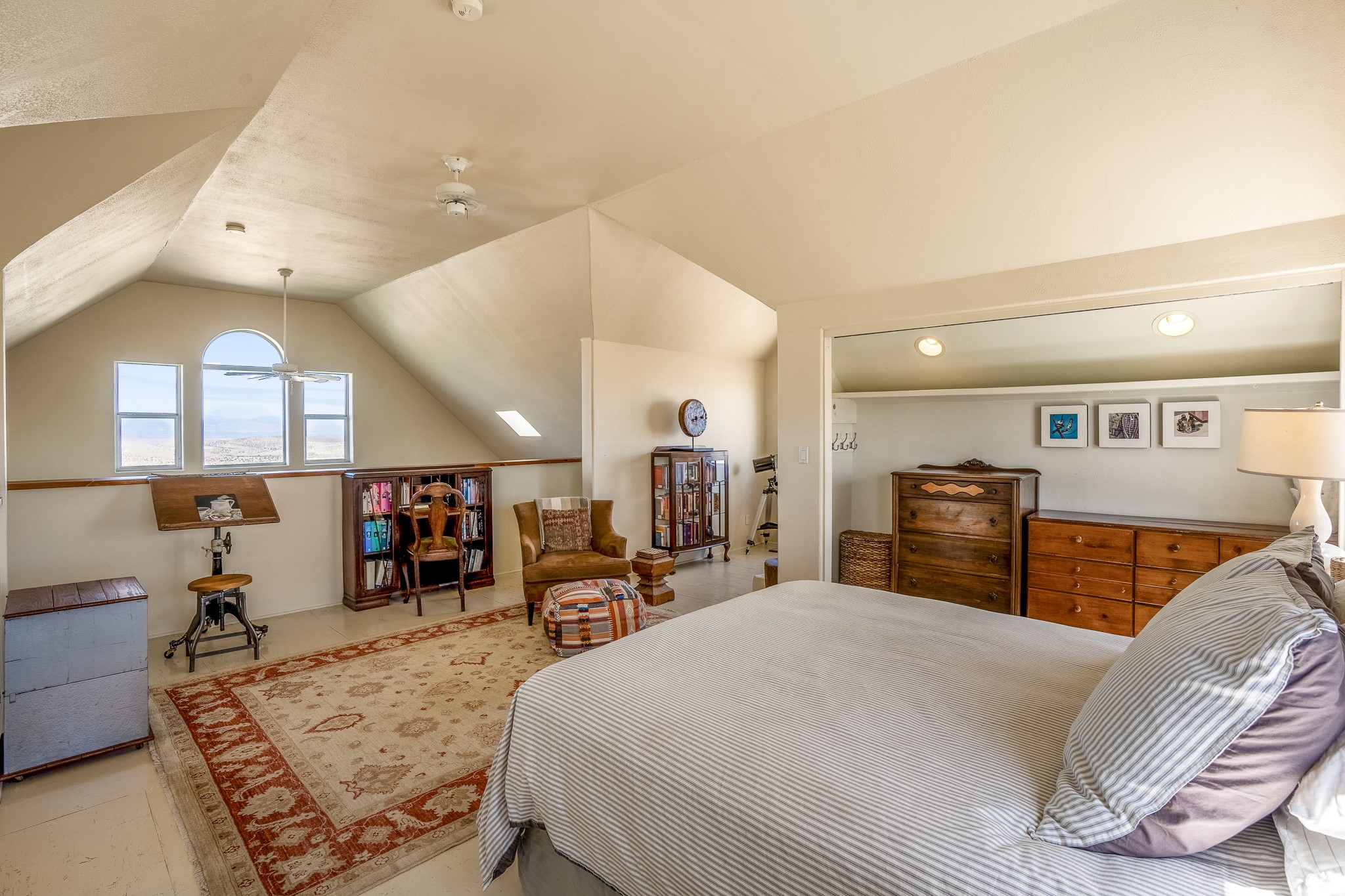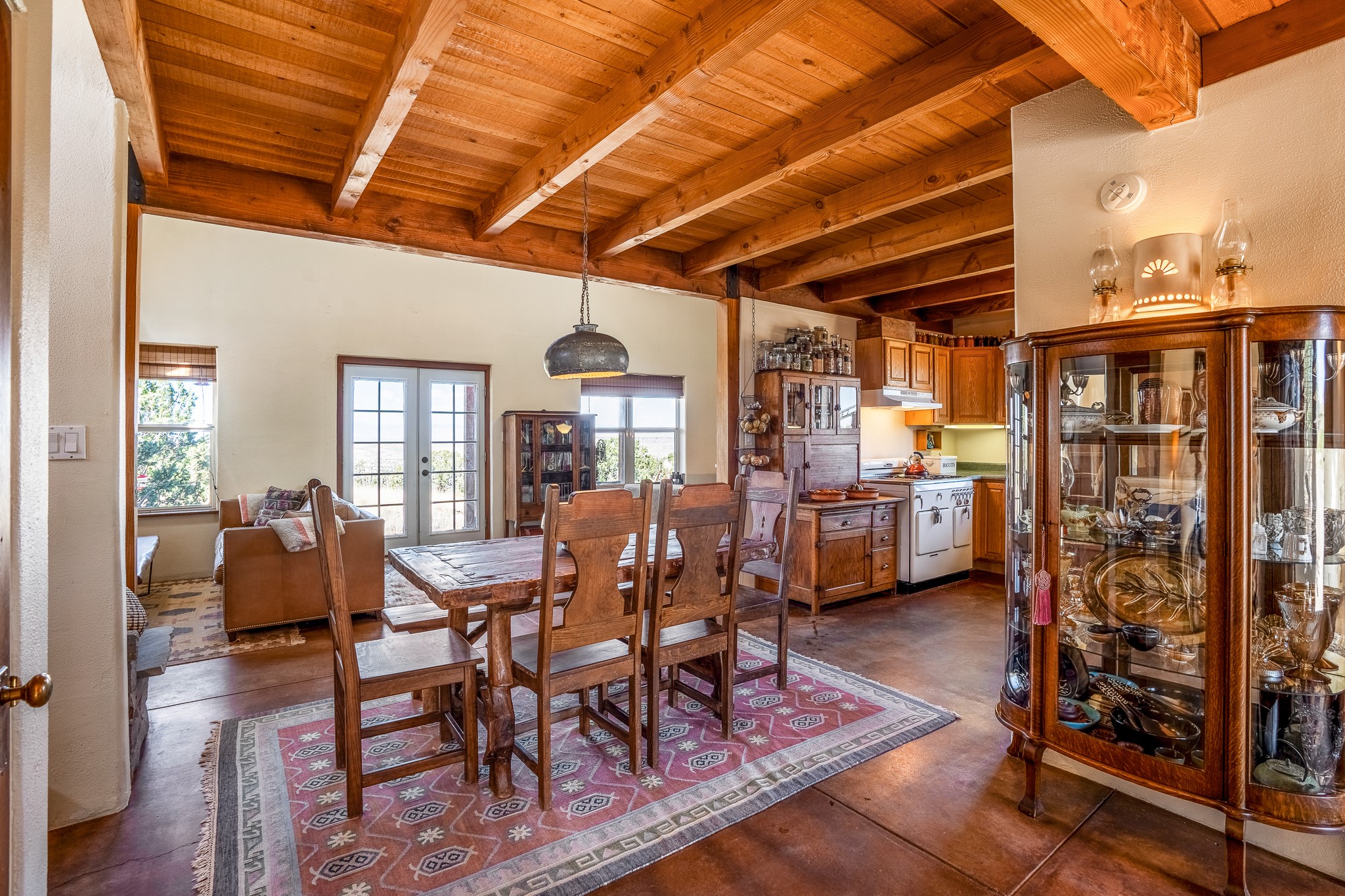 You'll find this high-desert homestead perched on a mesa's edge, with jaw-dropping views in every direction. A high-ceilinged, 1259 square foot home, with one bedroom and one bathroom, sits on 40 acres. This open floor plan home gives many configuration options- a roomy yet cozy space. Property has abundant, thriving gardens, a shed and chicken coop, as well as a corral and space for horses. Water is supplied by a private well, and electricity by the sun. Sellers have recently invested nearly $50,000 in the property, including new solar panels, charge controller, inverters, and batteries, 5600 gallons of water storage (in addition to 3100 gallons of rain catchment), new well pump, booster pump and whole house water filtration system. 3.5 miles from highway 14. Come experience the profound privacy, and quiet this property provides while only being a short hop to the thriving artist community of Madrid and a 45 min drive to Santa Fe. Excellent off the grid property with expansive vistas of the Cerrillos Hills and the Jemez, Sangre de Cristo, Ortiz, and Sandia Mountains.