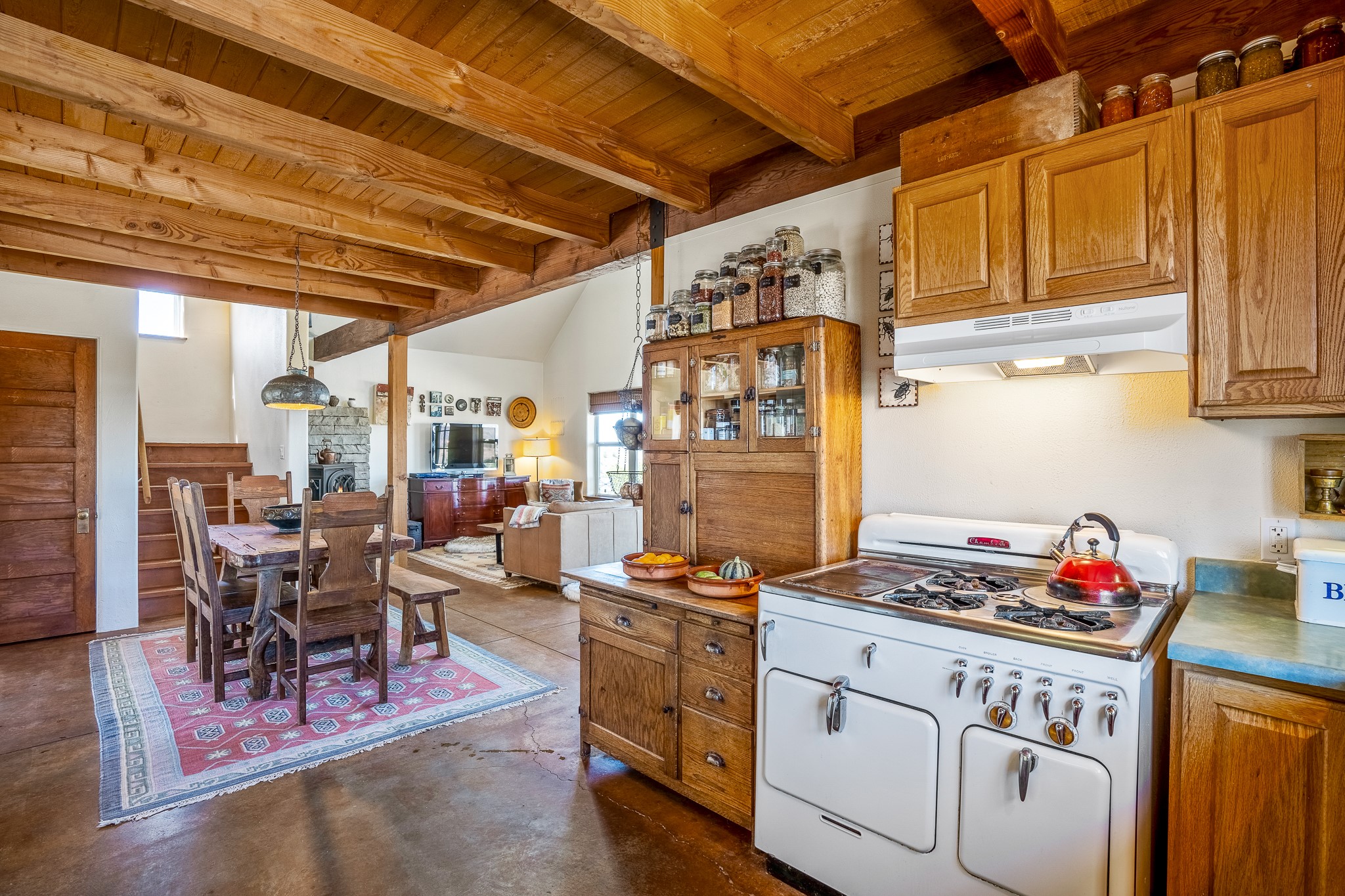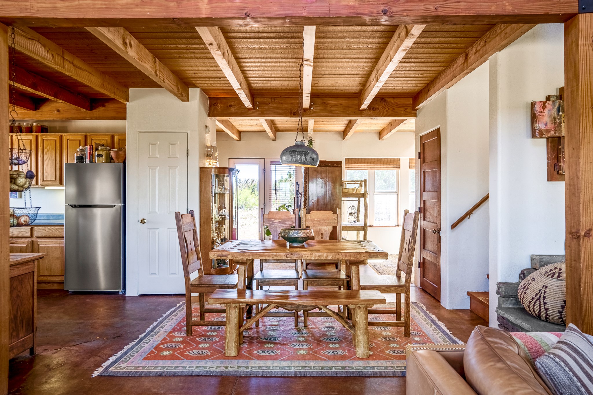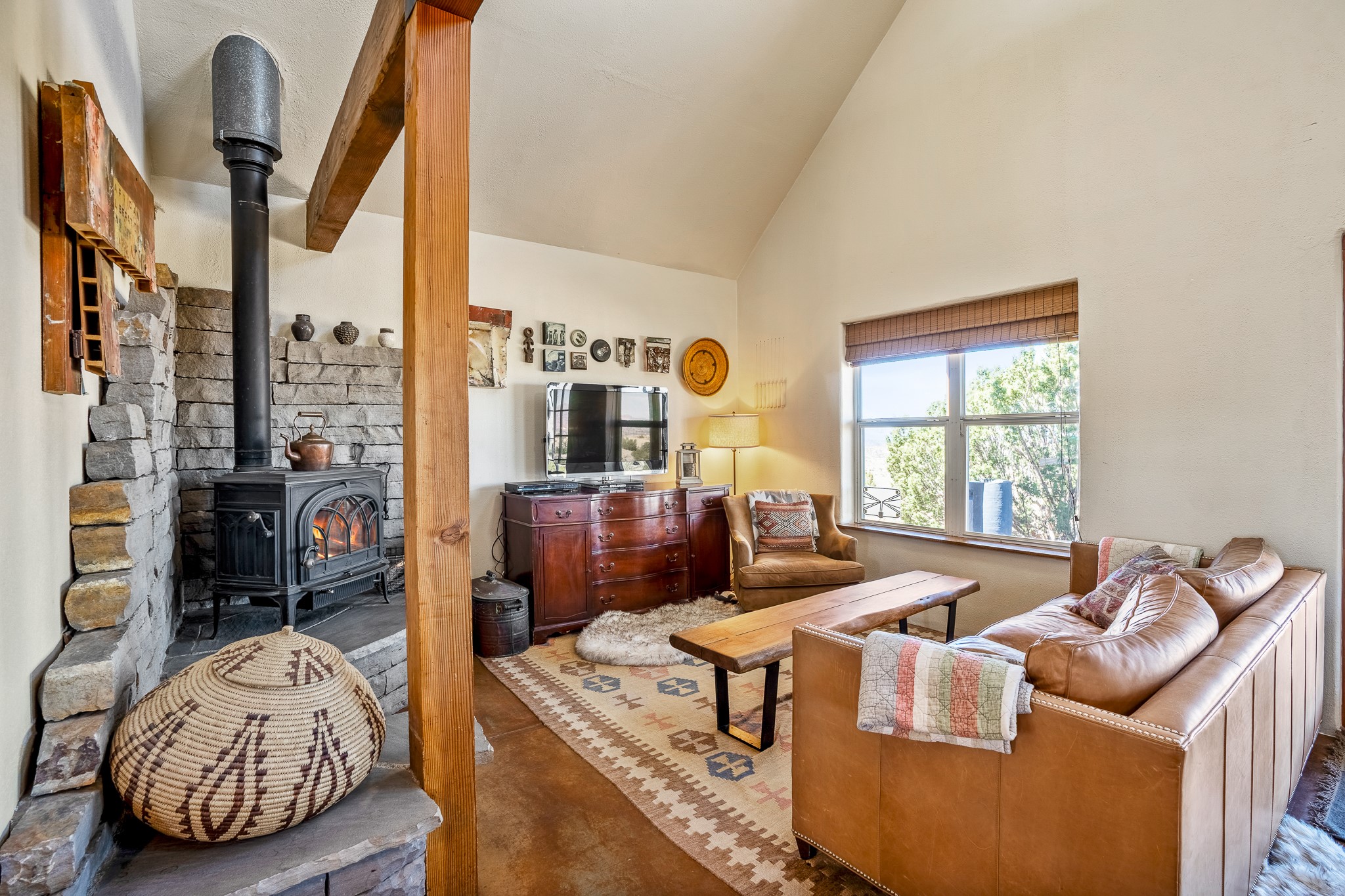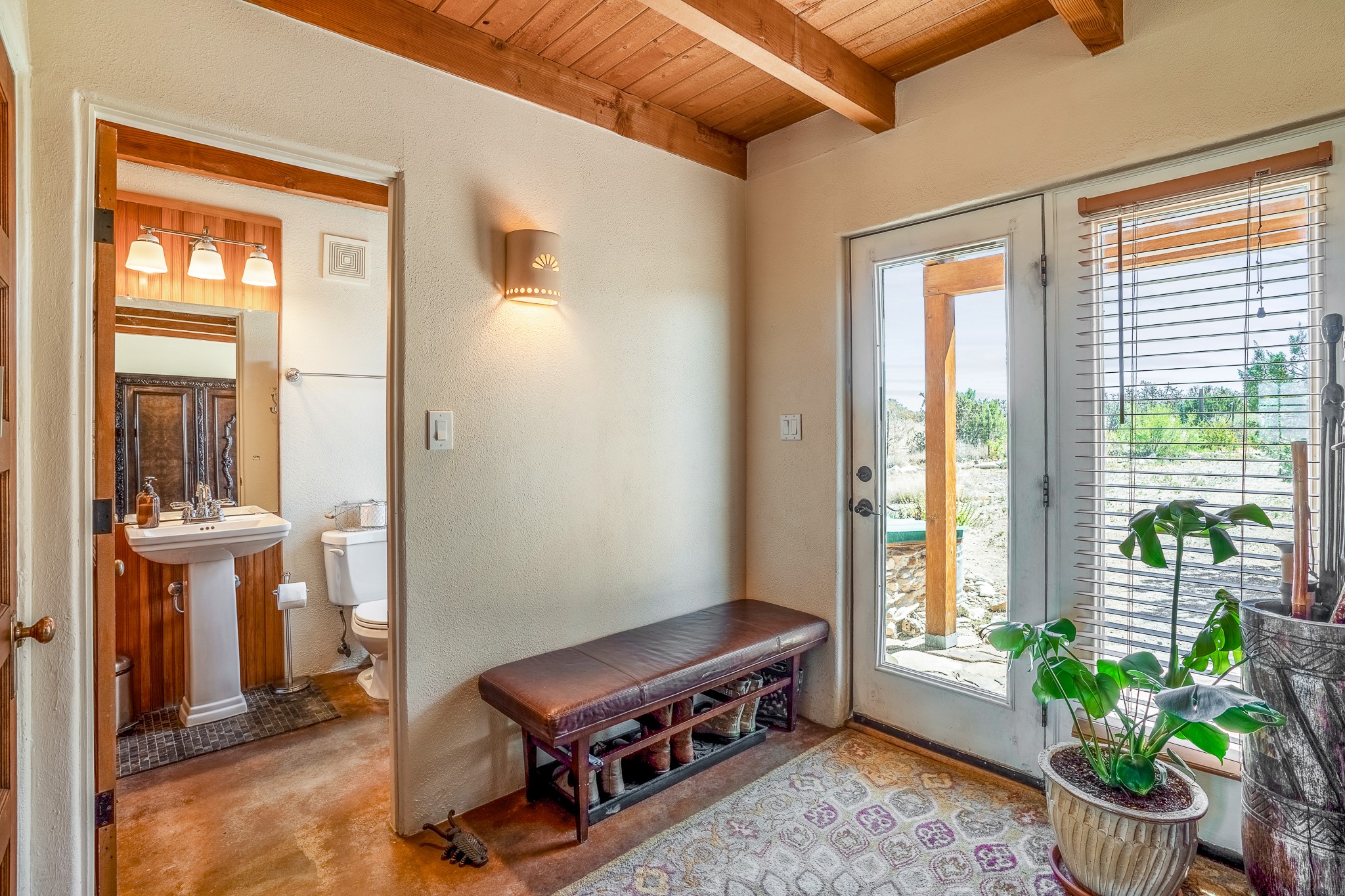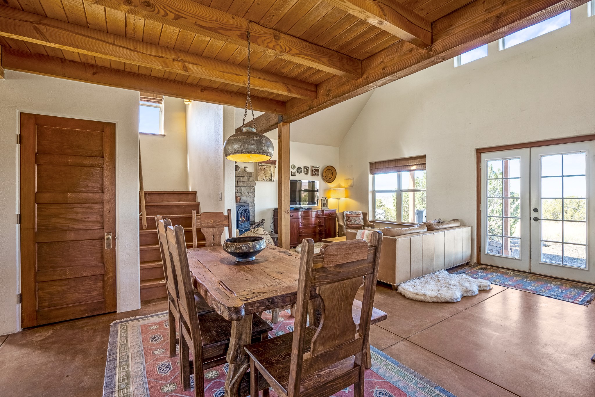 You'll find this high-desert homestead perched on a mesa's edge, with jaw-dropping views in every direction. A high-ceilinged, 1259 square foot home, with one bedroom and one bathroom, sits on 40 acres. This open floor plan home gives many configuration options- a roomy yet cozy space. Property has abundant, thriving gardens, a shed and chicken coop, as well as a corral and space for horses. Water is supplied by a private well, and electricity by the sun. Sellers have recently invested nearly $50,000 in the property, including new solar panels, charge controller, inverters, and batteries, 5600 gallons of water storage (in addition to 3100 gallons of rain catchment), new well pump, booster pump and whole house water filtration system. 3.5 miles from highway 14. Come experience the profound privacy, and quiet this property provides while only being a short hop to the thriving artist community of Madrid and a 45 min drive to Santa Fe. Excellent off the grid property with expansive vistas of the Cerrillos Hills and the Jemez, Sangre de Cristo, Ortiz, and Sandia Mountains.