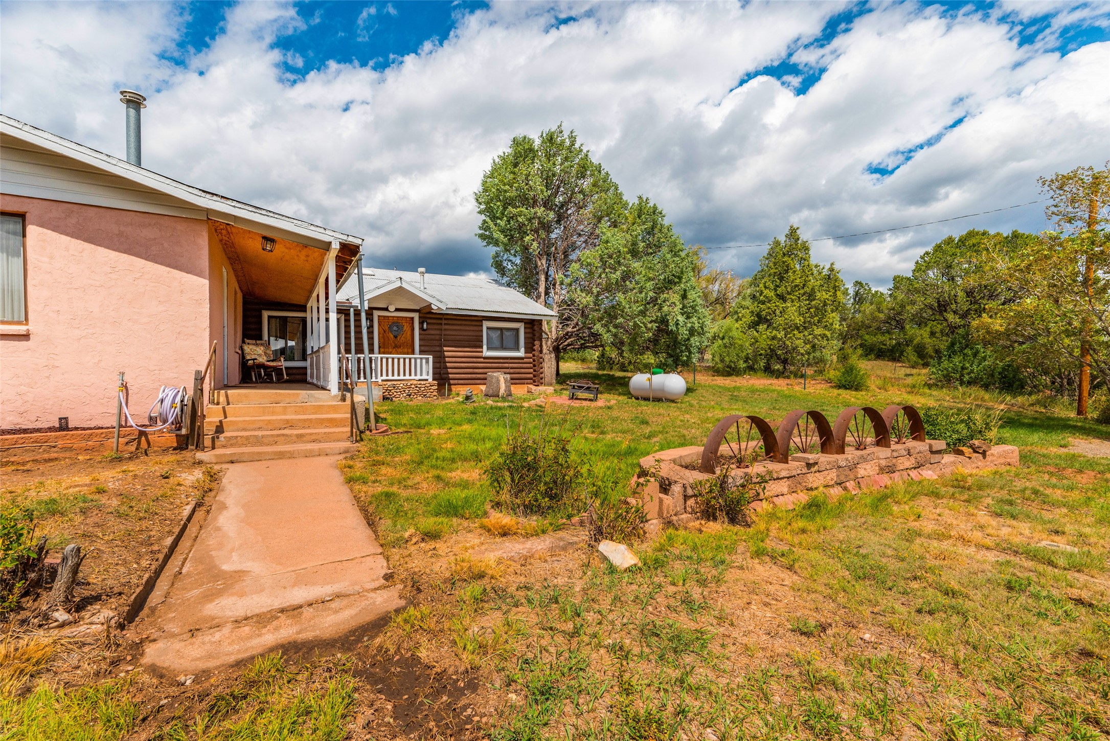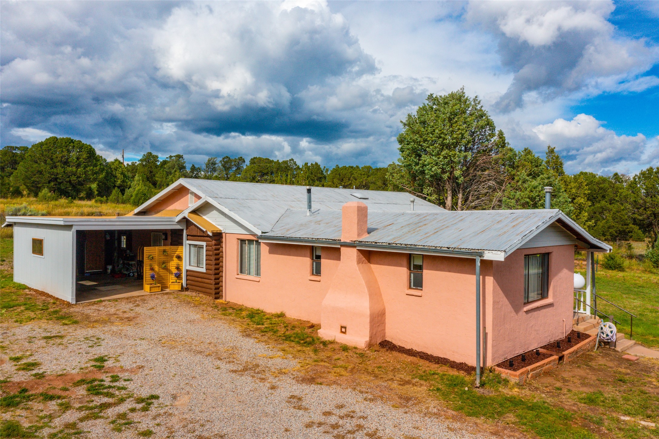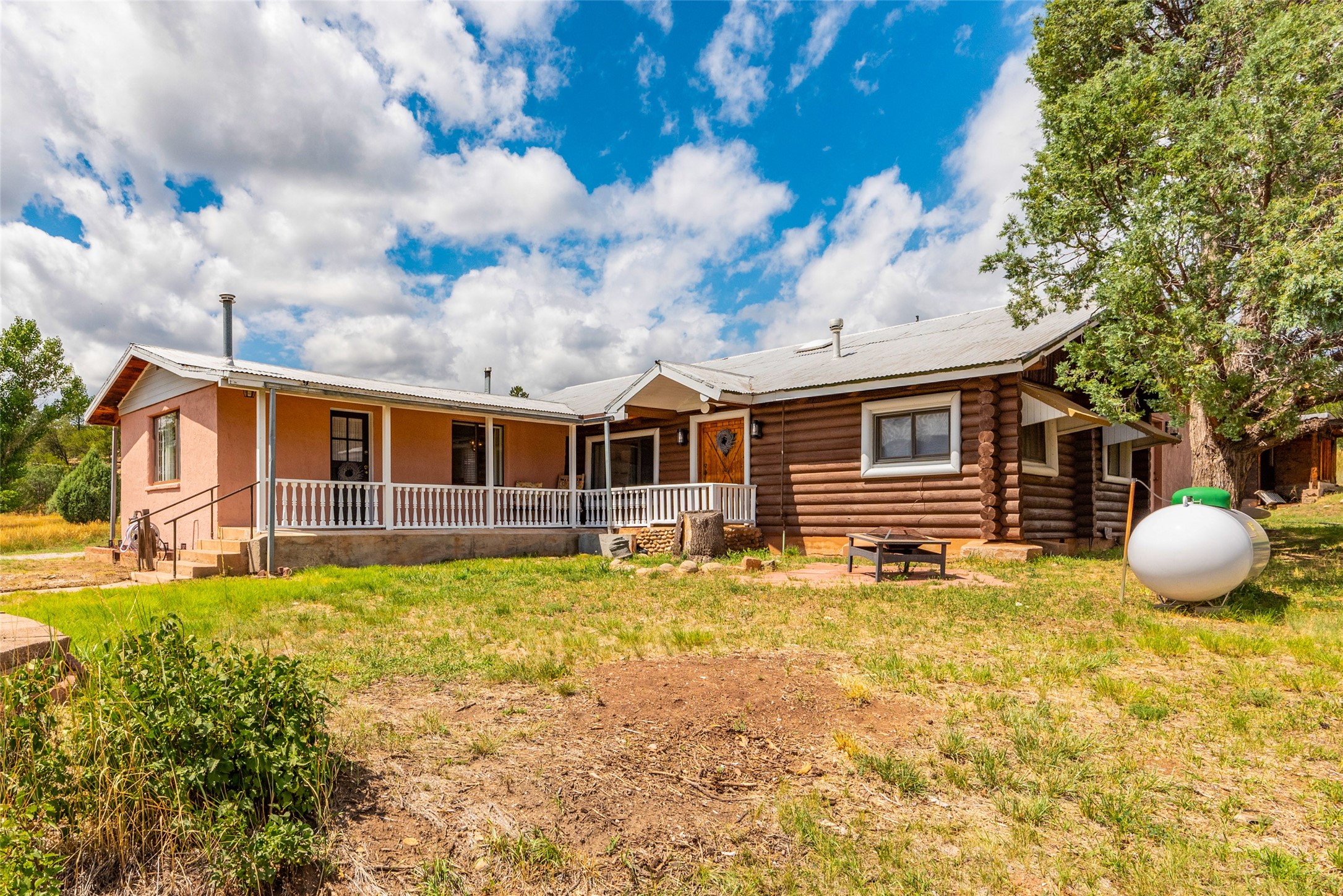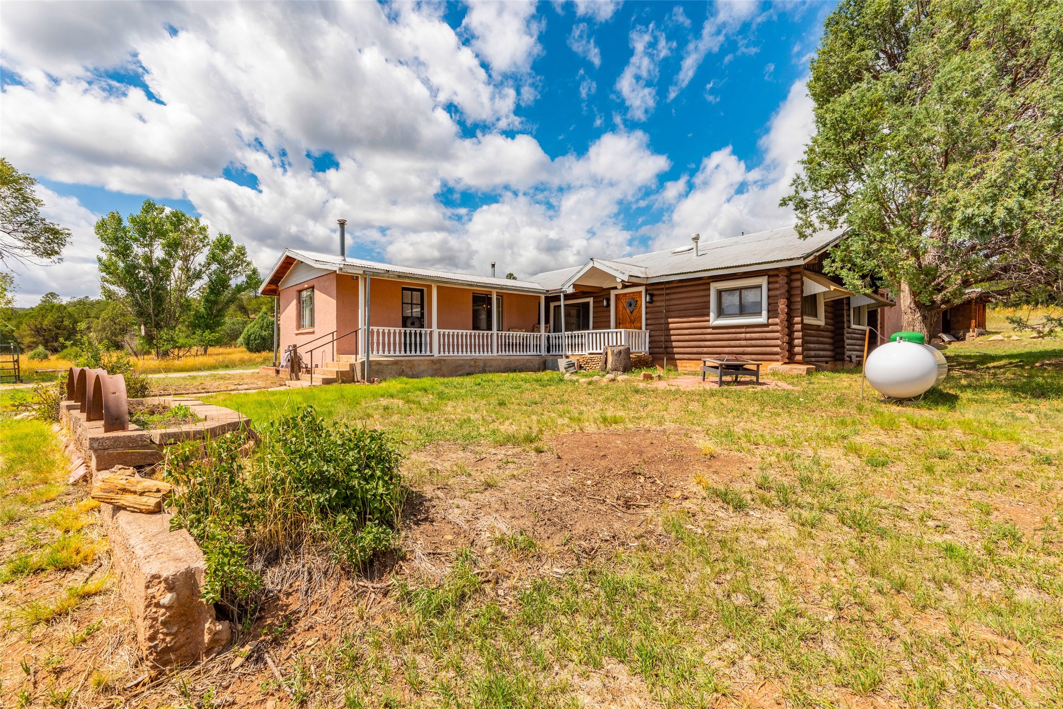 Beautiful recently updated. 2 br, +Den, 2 baths, great room, breakfast room. Huge country kitchen, pantry, utility room, and outbuildings. Conveniently located on the Santa Fe Trail between Glorieta and Pecos in Santa Fe County. This property began in 1940 as an authentic 416-square-foot Log Cabin. Over the years it has been thoughtfully expanded to this large comfortable family home. The original exterior front and side of the original cabin still boast exterior original logs! The interior is freshly painted with new luxury vinyl and carpet flooring. Enter the front door from the large L-shaped covered porch. Brightly lit great room with a formal dining area, and a comfortable sitting area complete with built-ins and a cozy fireplace with insert. The original curved hardwood stained ceiling. Storage is plentiful in the attached kitchen with its own original curved ceiling and over 25 cabinets, plenty of work areas, a new sink and faucet, a brand new stainless refrigerator, a gas oven/range with a new range hood, and a newer dishwasher. Continue through to what was the original log cabin kitchen now used as a pantry area with a large coat closet and room for future library shelving and storage. The property also has a storage shed that was once a casita perhaps destined for a remodel to become a workshop/study. Another outbuilding contains the well house and tool and equipment storage. Must See!