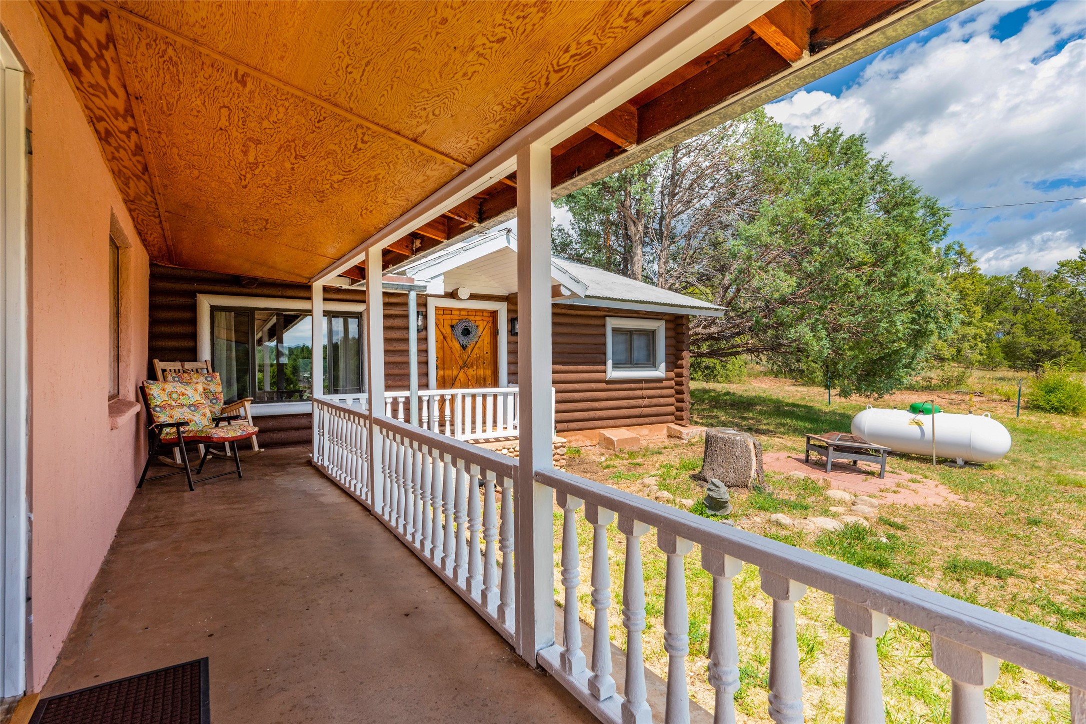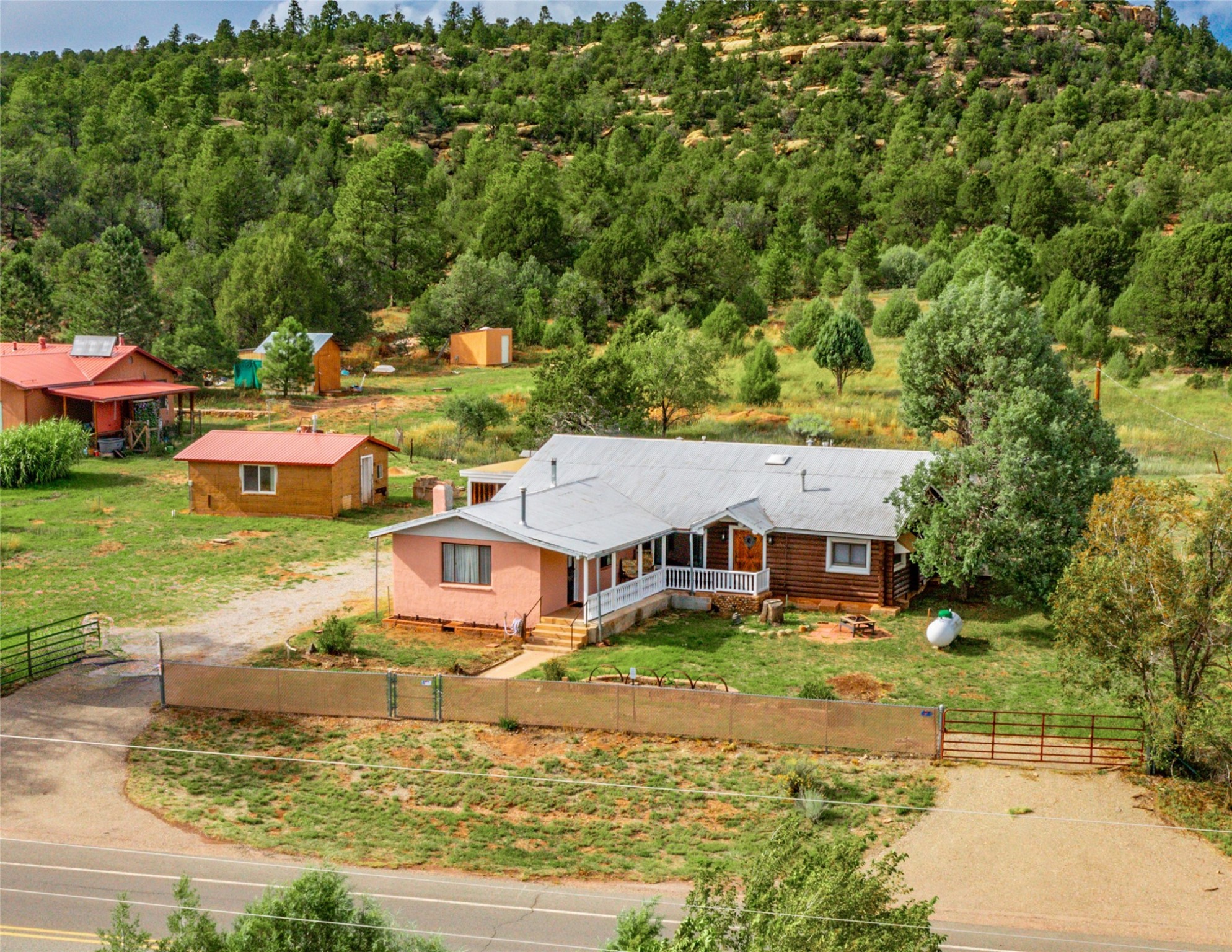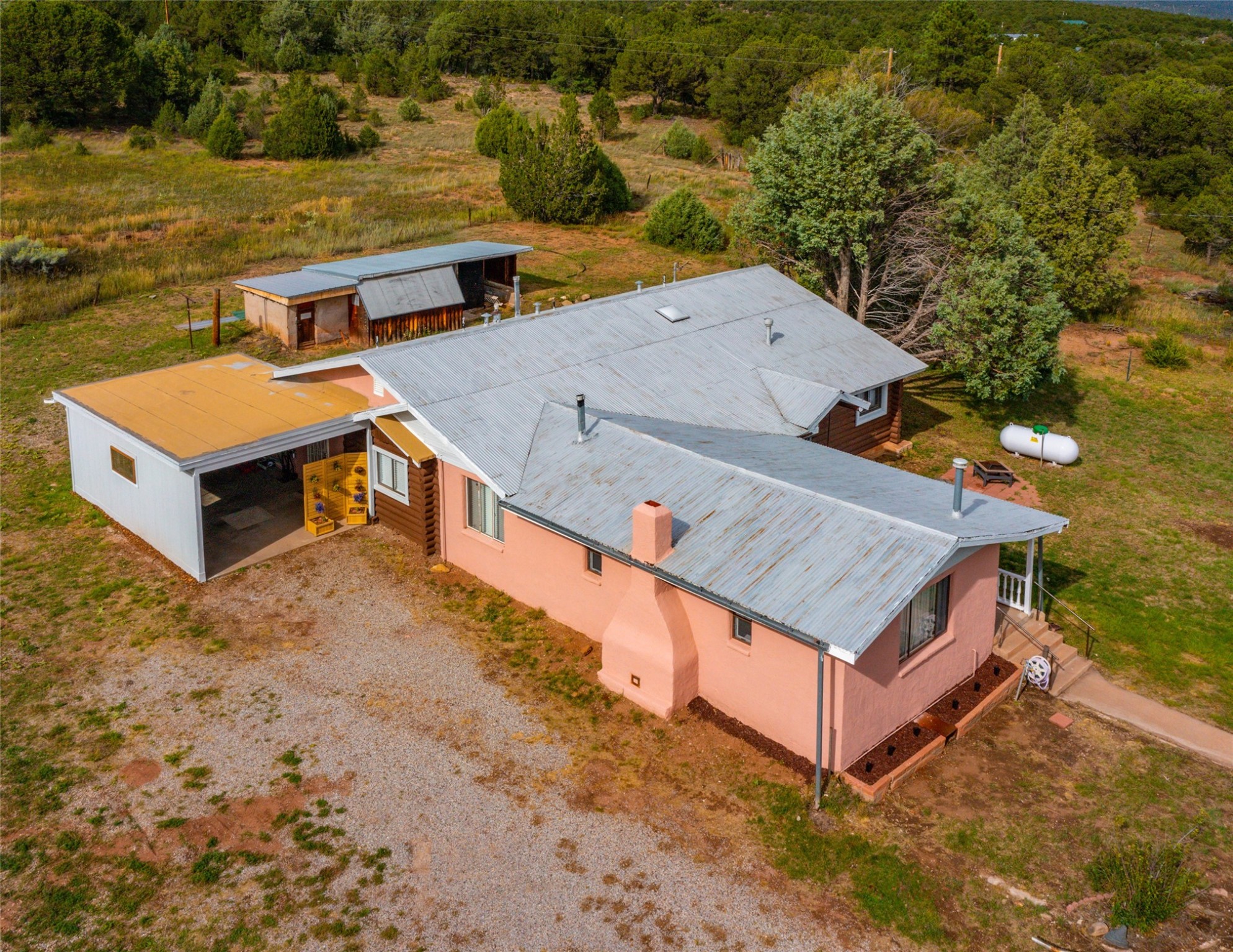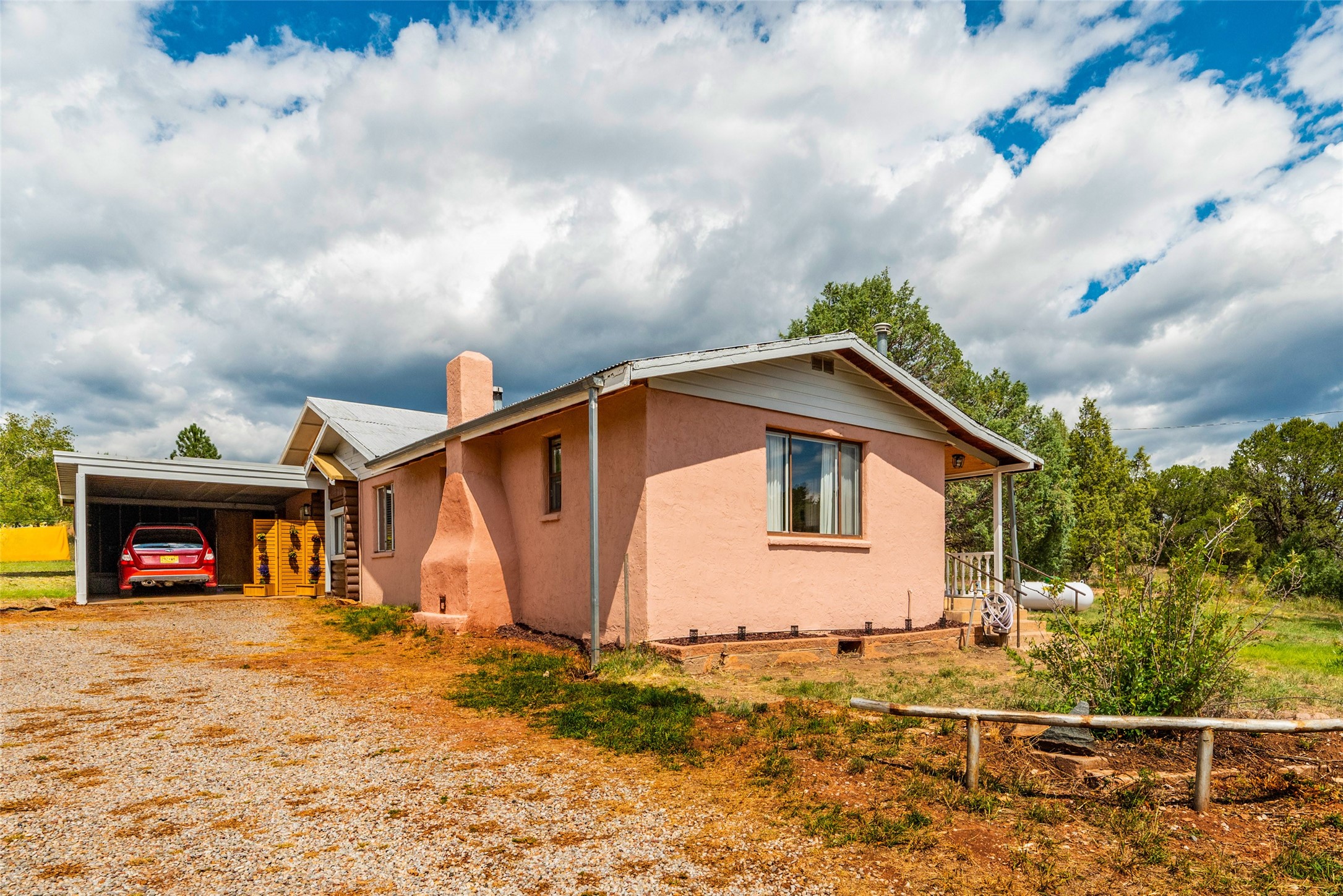 Beautiful recently updated. 2 br, +Den, 2 baths, great room, breakfast room. Huge country kitchen, pantry, utility room, and outbuildings. Conveniently located on the Santa Fe Trail between Glorieta and Pecos in Santa Fe County. This property began in 1940 as an authentic 416-square-foot Log Cabin. Over the years it has been thoughtfully expanded to this large comfortable family home. The original exterior front and side of the original cabin still boast exterior original logs! The interior is freshly painted with new luxury vinyl and carpet flooring. Enter the front door from the large L-shaped covered porch. Brightly lit great room with a formal dining area, and a comfortable sitting area complete with built-ins and a cozy fireplace with insert. The original curved hardwood stained ceiling. Storage is plentiful in the attached kitchen with its own original curved ceiling and over 25 cabinets, plenty of work areas, a new sink and faucet, a brand new stainless refrigerator, a gas oven/range with a new range hood, and a newer dishwasher. Continue through to what was the original log cabin kitchen now used as a pantry area with a large coat closet and room for future library shelving and storage. The property also has a storage shed that was once a casita perhaps destined for a remodel to become a workshop/study. Another outbuilding contains the well house and tool and equipment storage. Must See!