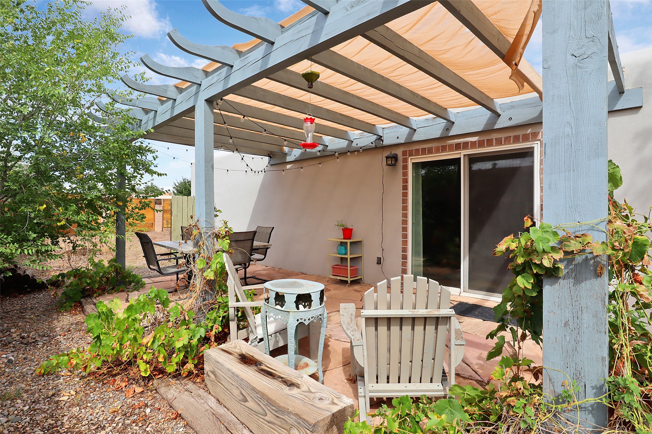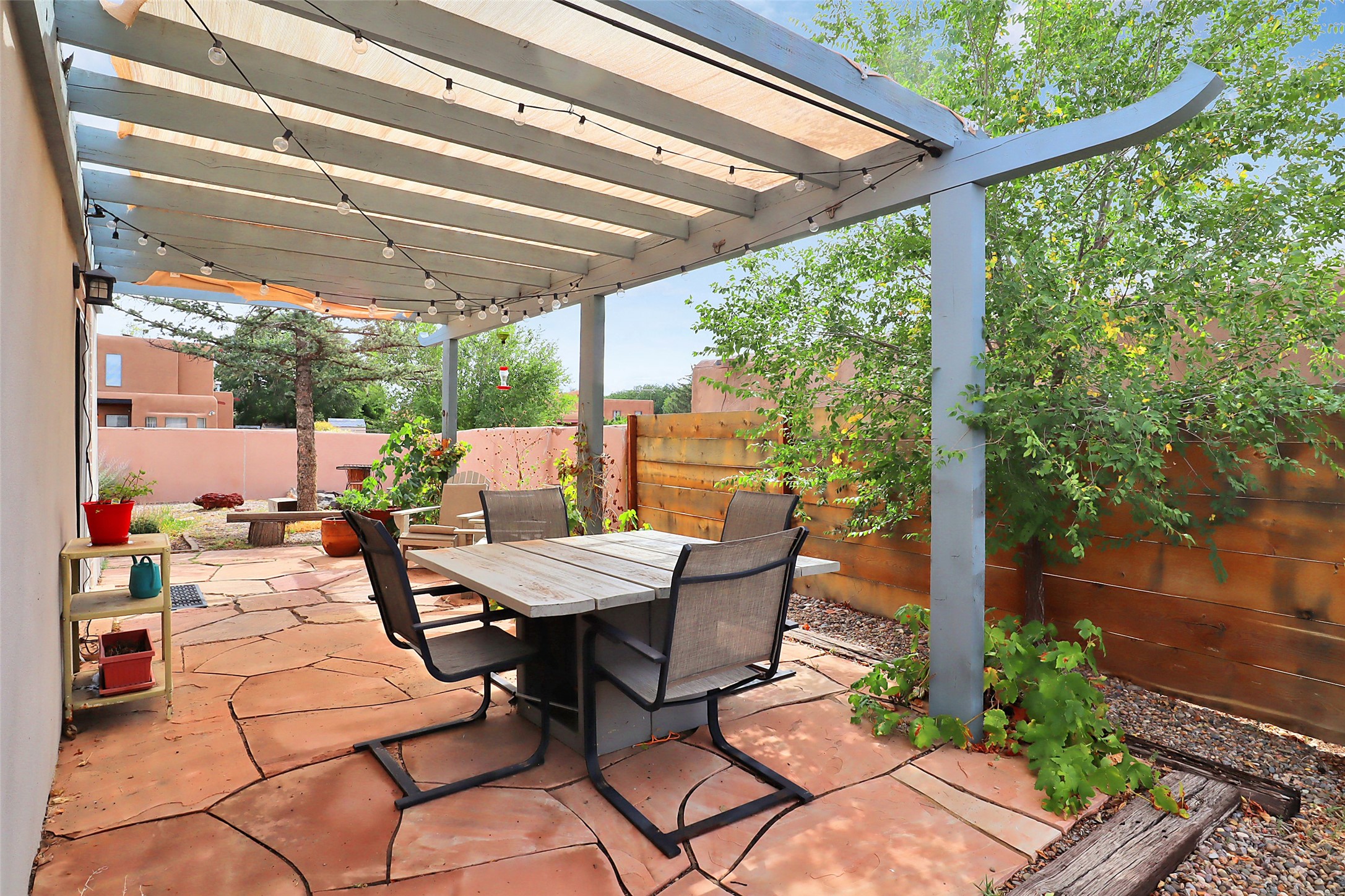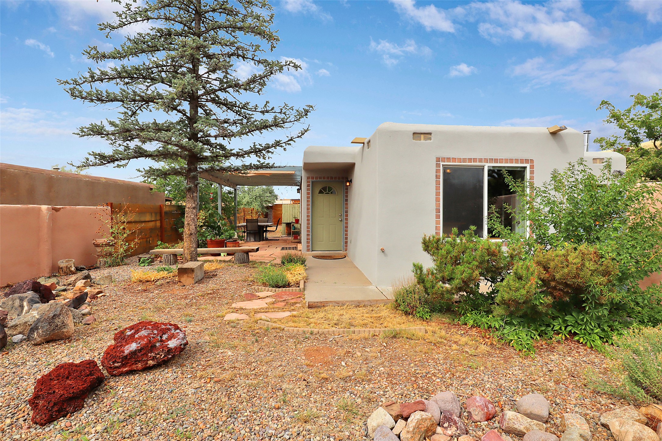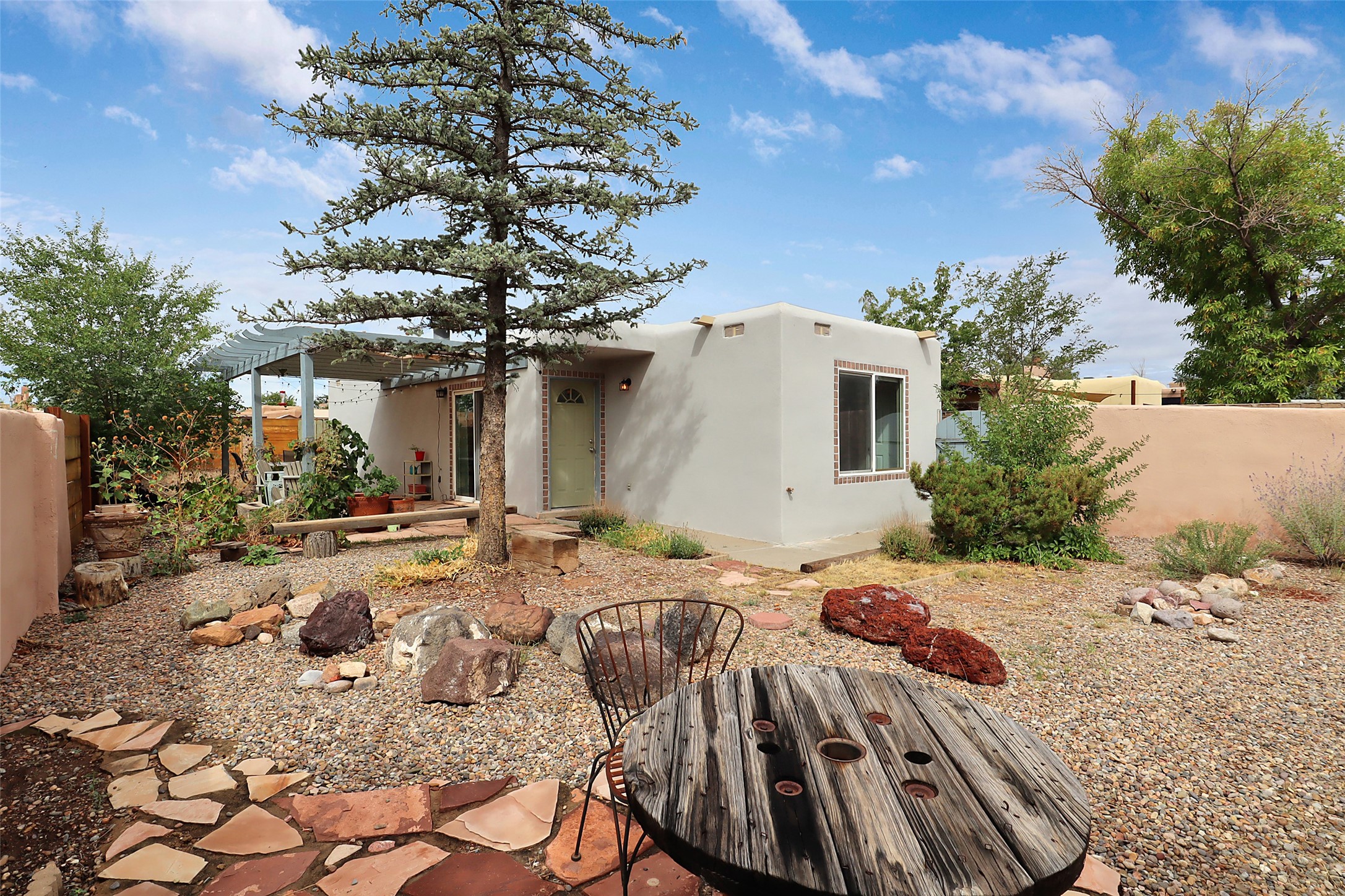 Calling all outdoor gardening enthusiasts! So much character abounds in this centrally-located bungalow. From the fully walled front yard to the freshly stucco'd calming sage green of the home, this place will quickly become your everyday oasis or home away from home. You'll love the tile accents embedded into the home's outside walls, the picture window from the spacious kitchen to the courtyard, and the mature grapevines and landscaping. A paved patio with pergola provides perfect indoor-outdoor living just off the living room - perfect for your morning coffee time. The back yard fire pit is ready for the chilly Fall evenings, and there's so much room for future gardening possibilities.Immediately upon entering the living room, you'll appreciate the wood-burning fireplace as the centerpiece to the home. The built-in wooden shelving and sturdy wooden table provide a high quality utilitarian space, while remaining easily removable if someone desires a larger living space and smaller dining area. The open floor plan allows versatility in the way you'd like to set it up! What a kitchen! Ample counter space, and plenty of room to make this a dining-in kitchen. The two bedrooms are adorned with warm wood-plank flooring, with one of the two having a door directly to the bathroom. The primary bedroom can easily host a king-sized bed along with a sitting area and other furniture. The second bedroom is also adequately-sized.A half-mile to tons of shopping and dining, and a quick 10 minute drive to the Plaza, Railyards, and Canyon Road - this home's location is truly ideal for ease of reaching the best of Santa Fe and beyond.