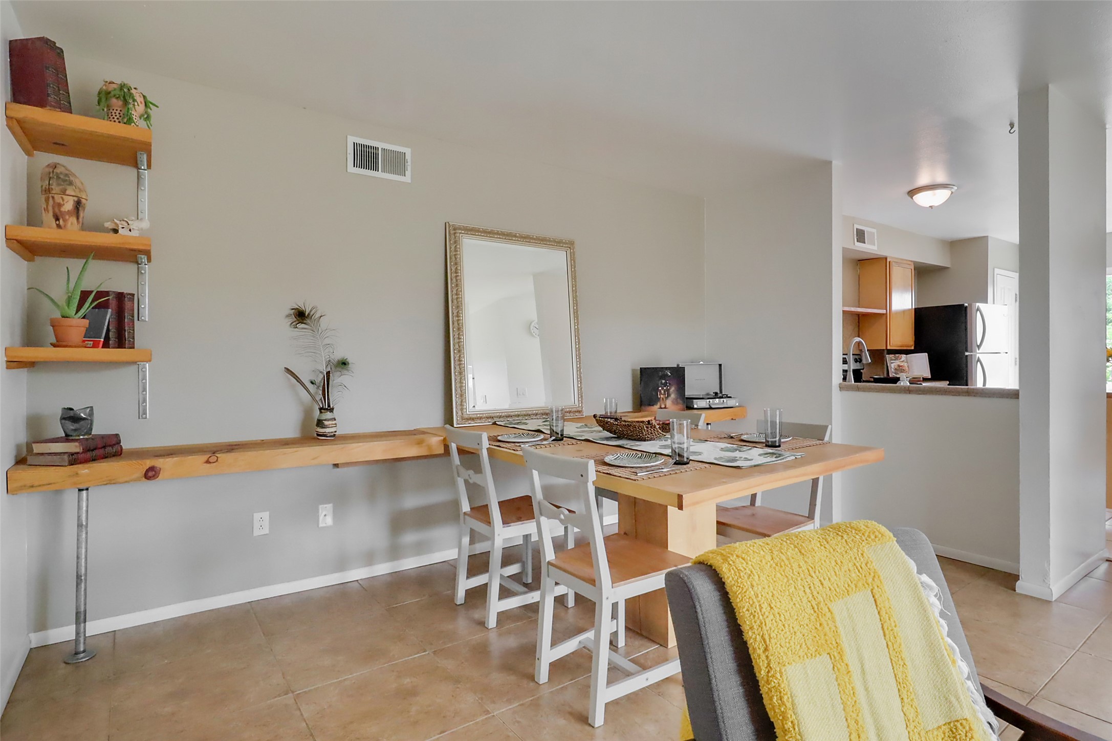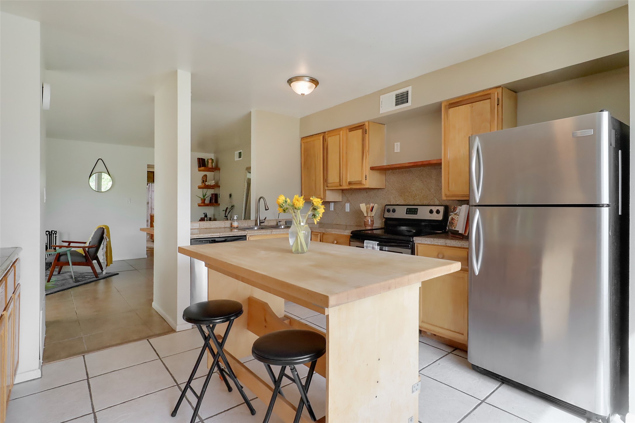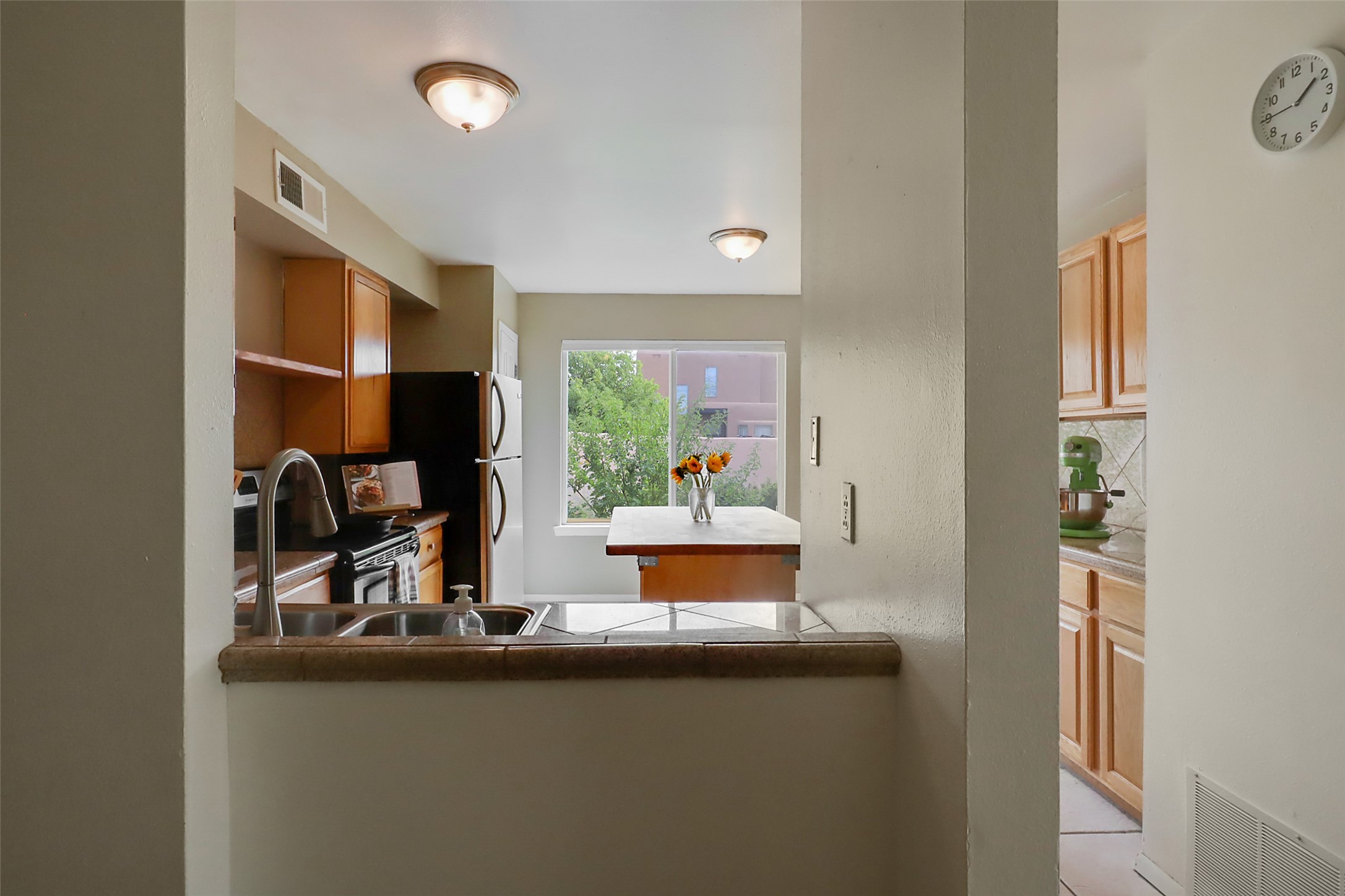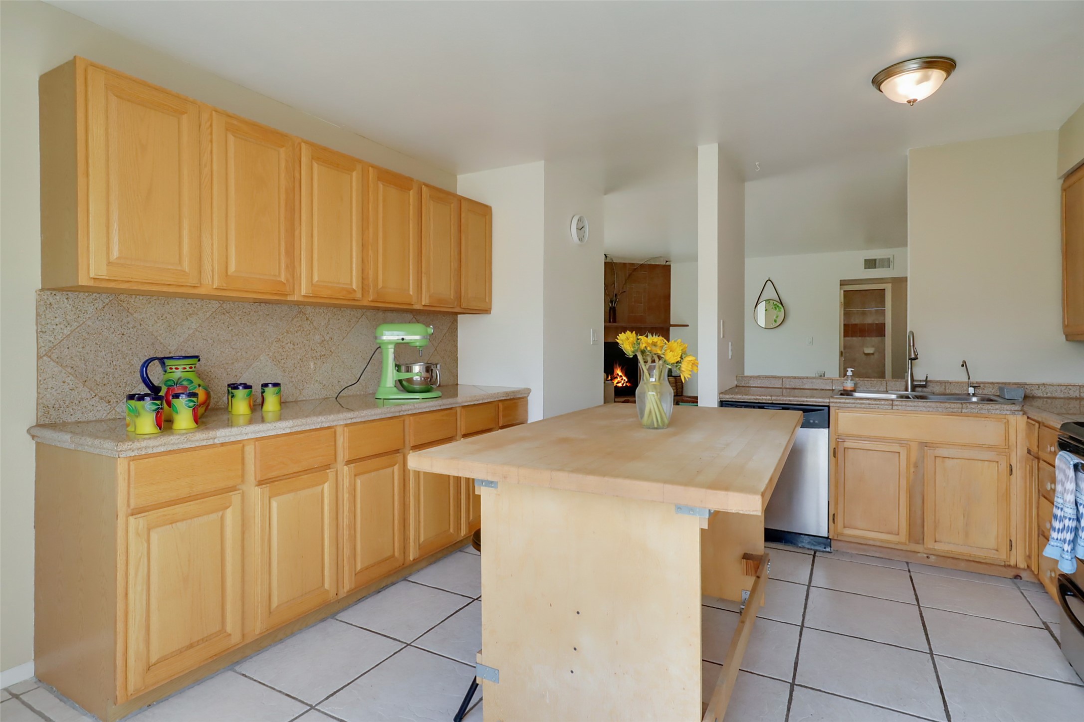 Calling all outdoor gardening enthusiasts! So much character abounds in this centrally-located bungalow. From the fully walled front yard to the freshly stucco'd calming sage green of the home, this place will quickly become your everyday oasis or home away from home. You'll love the tile accents embedded into the home's outside walls, the picture window from the spacious kitchen to the courtyard, and the mature grapevines and landscaping. A paved patio with pergola provides perfect indoor-outdoor living just off the living room - perfect for your morning coffee time. The back yard fire pit is ready for the chilly Fall evenings, and there's so much room for future gardening possibilities.Immediately upon entering the living room, you'll appreciate the wood-burning fireplace as the centerpiece to the home. The built-in wooden shelving and sturdy wooden table provide a high quality utilitarian space, while remaining easily removable if someone desires a larger living space and smaller dining area. The open floor plan allows versatility in the way you'd like to set it up! What a kitchen! Ample counter space, and plenty of room to make this a dining-in kitchen. The two bedrooms are adorned with warm wood-plank flooring, with one of the two having a door directly to the bathroom. The primary bedroom can easily host a king-sized bed along with a sitting area and other furniture. The second bedroom is also adequately-sized.A half-mile to tons of shopping and dining, and a quick 10 minute drive to the Plaza, Railyards, and Canyon Road - this home's location is truly ideal for ease of reaching the best of Santa Fe and beyond.