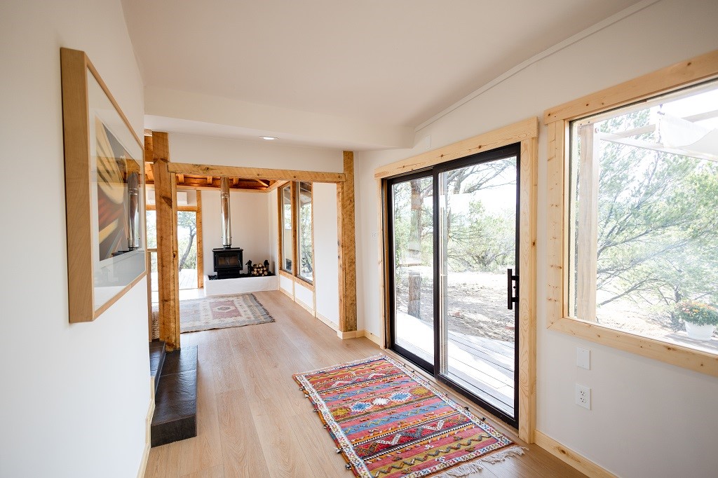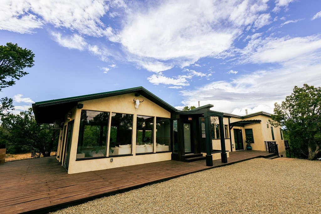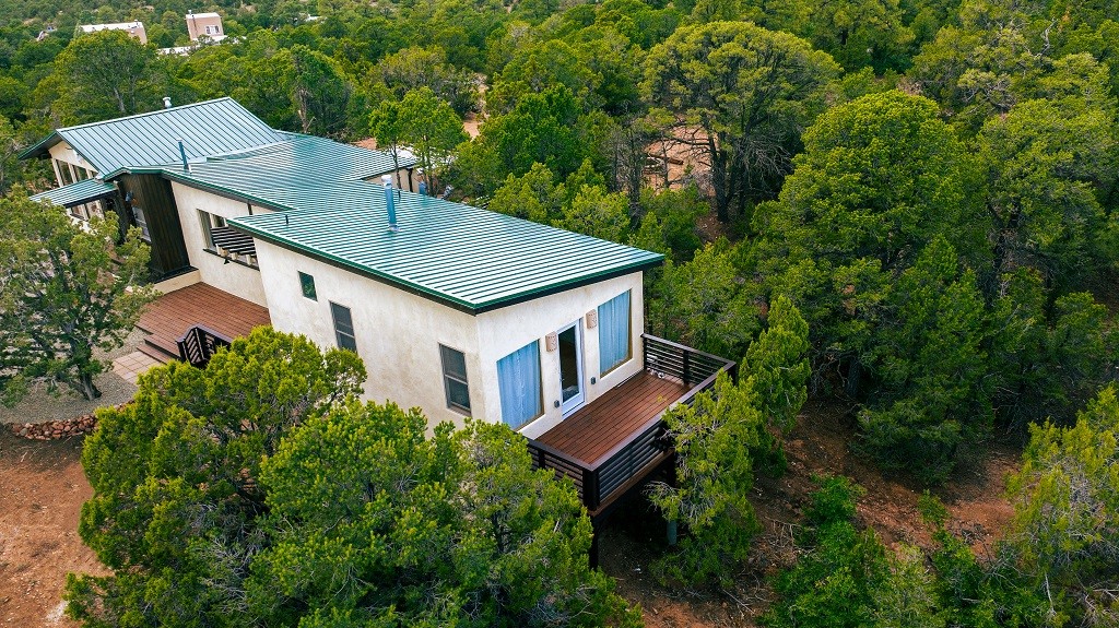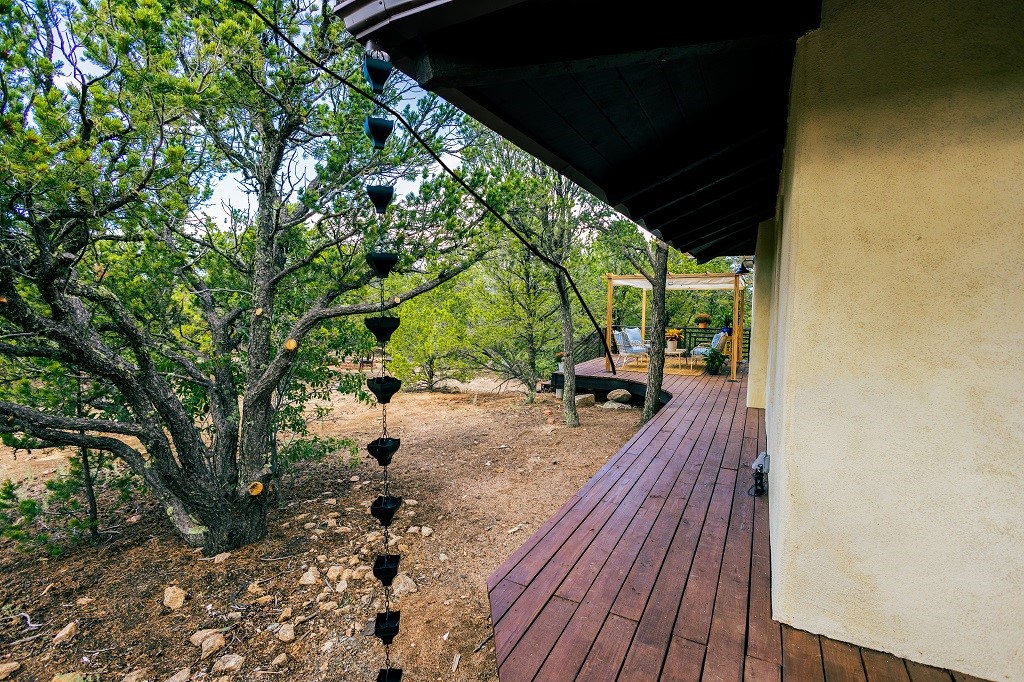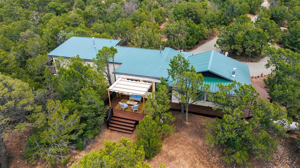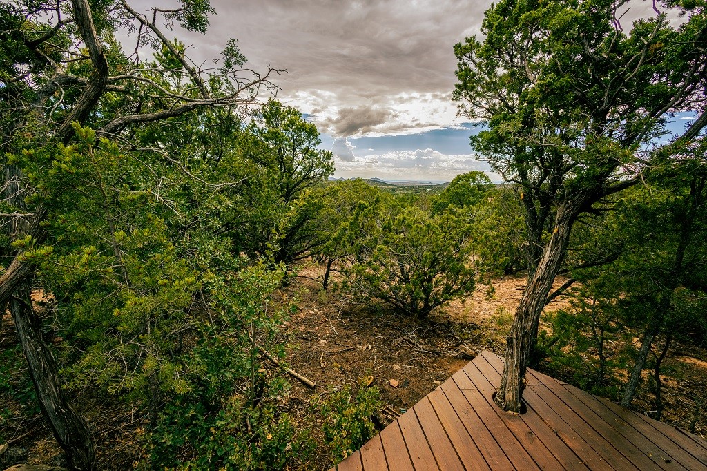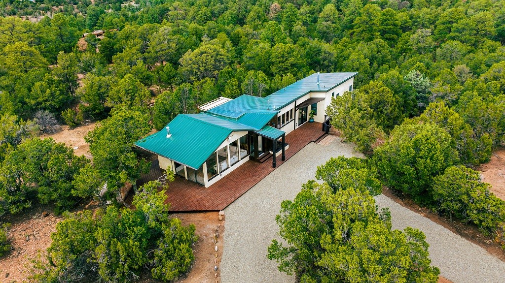 Beautifully remodeled hilltop oasis! Enjoy your personal getaway nestled in 6.4 acres of pristine land in the foothills of the Sangre de Cristo mountains. This elegantly and completely remodeled home integrates seamlessly into the natural landscape of mature junipers, ponderosas and pinons. Over 800 square feet of deck space, large windows on every wall, vaulted timber ceilings and custom woodworking throughout, make for true sleek southwestern and zen style home. With an updated kitchen and bathrooms, 200 amp electrical system, brand new mini splits heating/cooling system, new wood stove, radiant heated bathroom floors, luxury vinyl plank, new on-demand water heater, fresh stucco and high-end finishes, this overhauled renovation spared no expense. A mere 15 minutes from the historic Santa Fe plaza, in the desirable Apache Ridge neighborhood, there is no HOA and plenty of room to continue growing this gorgeous property. Owner is NMREL
