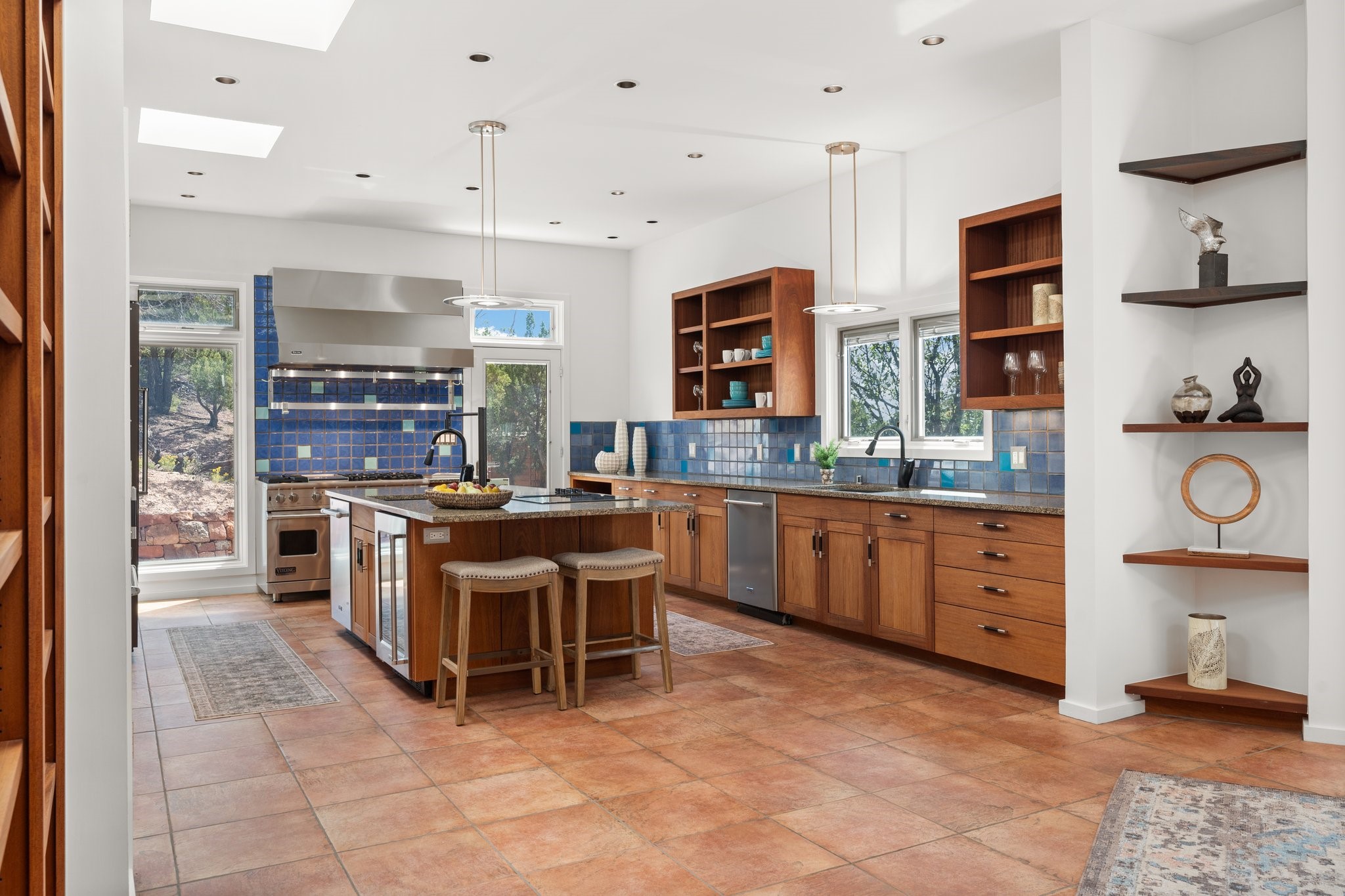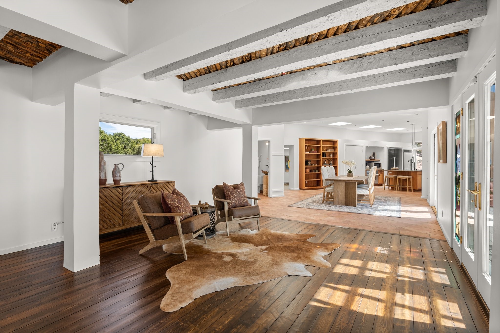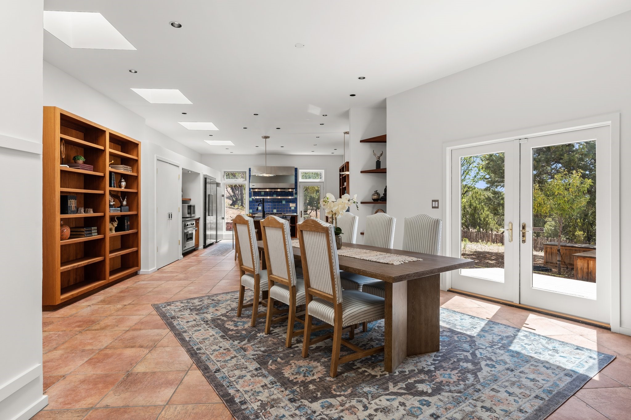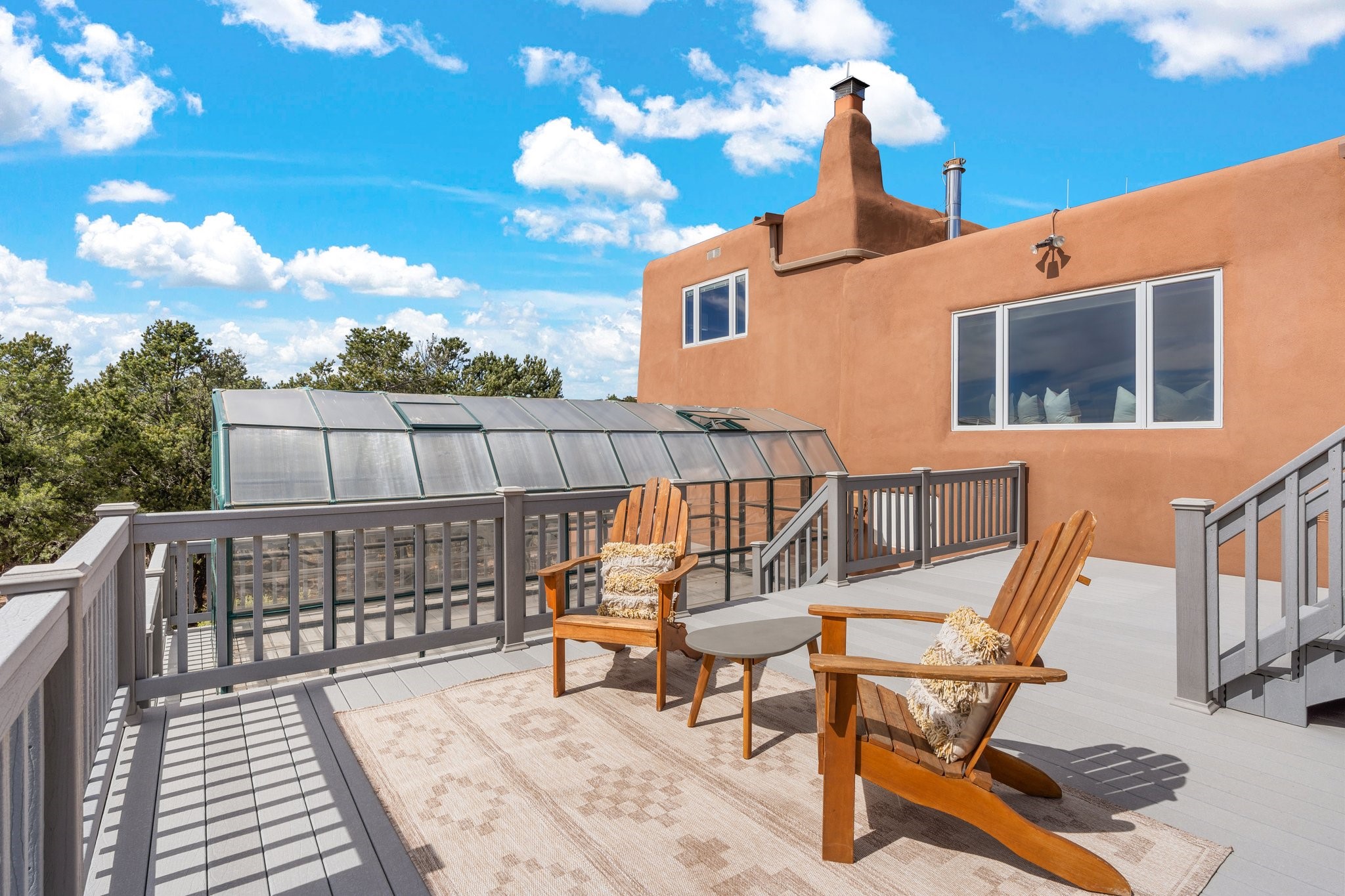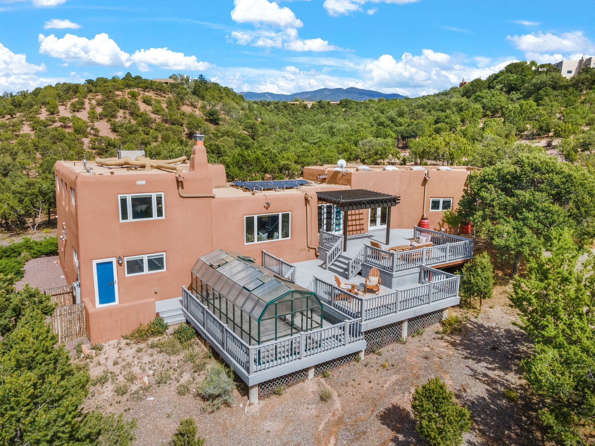 This stunning 4,000 +/- sq. ft home boasts 2 full bedroom suites, each with its own bathroom and sitting room. The upstairs suite additionally has an office while the downstairs bedroom suite with direct entry from the outside has a kitchenette. Nestled in the serene Santa Fe mountains and surrounded by magnificent views, this meticulously maintained home sitting on 1.9 acres is but minutes from downtown Santa Fe and its many amenities. Ideal for year-round entertaining, the generous great-room (living, dining, kitchen), offers easy access to the 900 sq. ft. Trex deck from which to enjoy amazing sunset views. The bespoke chef's-kitchen boasts a full range of top-of-the-line, Energy-Star, stainless steel appliances -- two stove tops, one electric with downdraft, and one gas; three ovens, one electric and two gas; two dishwashers, a wine cooler, microwave, a Viking fridge/freezer combo as well as a separate upright freezer, two sinks, and a very generous island. Quartz countertops and custom cabinetry complete the kitchen. The adjoining studio with storage for paintings can double as a family room or be built out into a stunning main bedroom suite. A 20 x 8 ft greenhouse and a garden shed allow you to give flight to all your gardening dreams. Paid off solar panels on the roof keep the electric bills to a minimum. A composite roof slopes gently to allow for drainage. The house is protected with lightning rods around the perimeter of the roof. This home offers so many more extras that it is impossible to list them all here. Please see additional info in document section of listing. All measurements are estimates and if of material interest, Buyer to independently verify. Neither Seller nor Listing Broker warrant house or lot size.