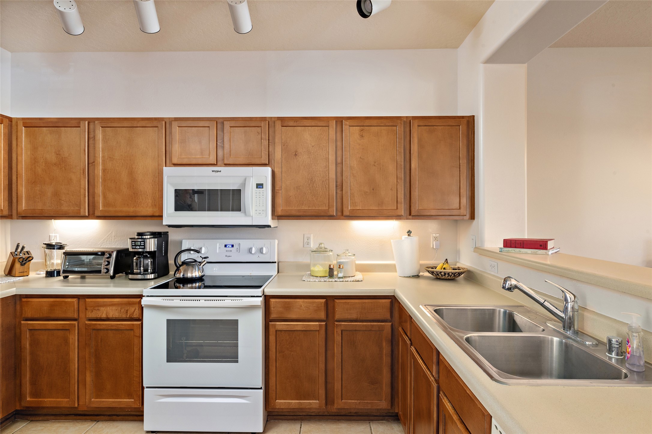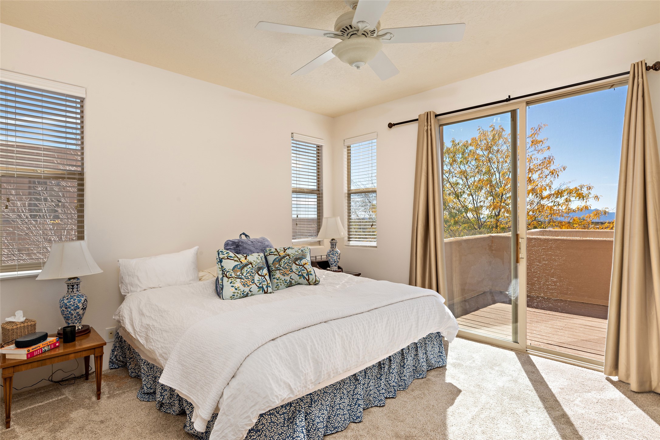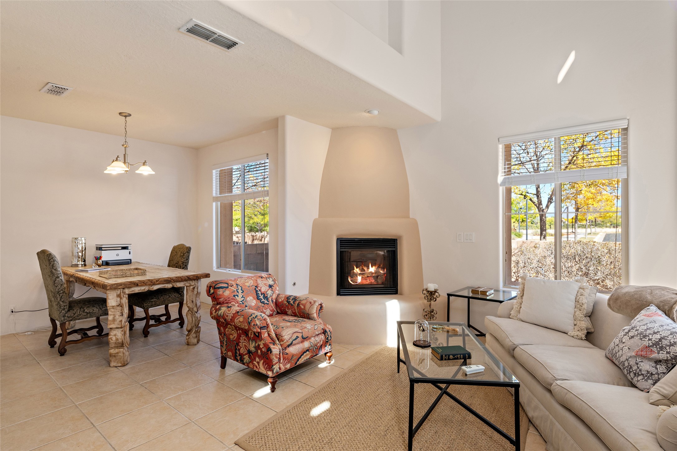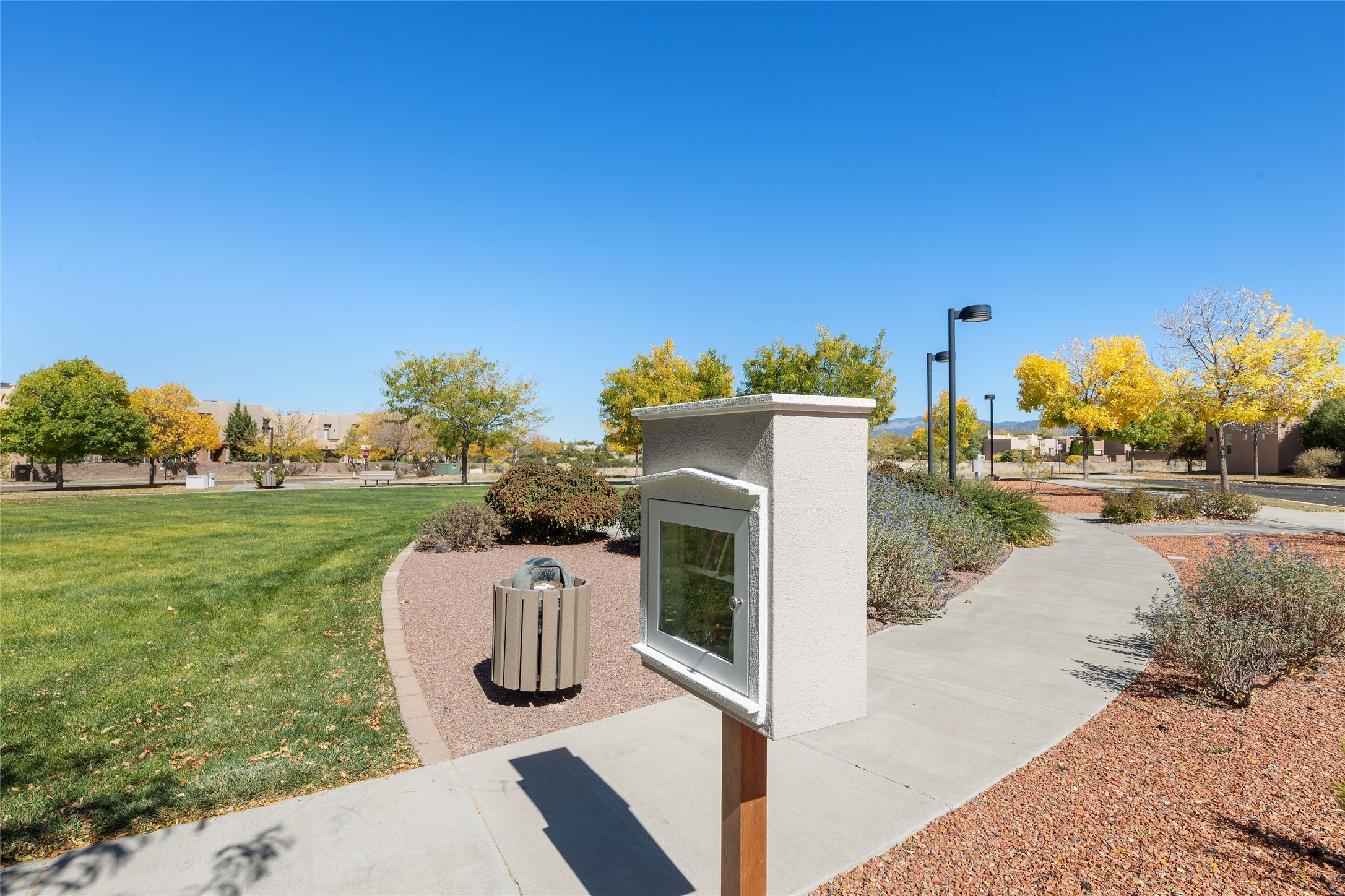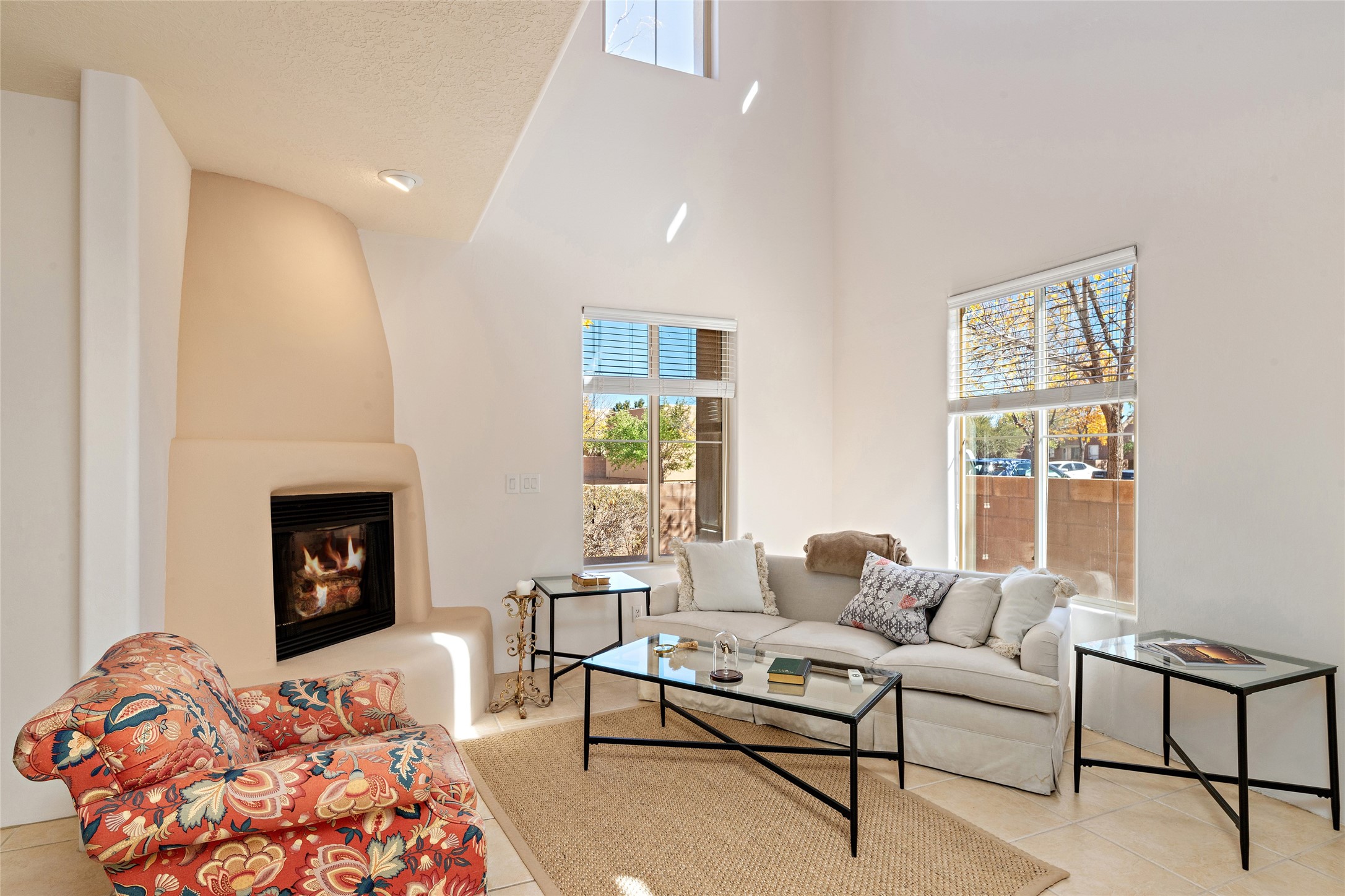This desirable end unit located on a lovely park in Rancho Viejo, has two bedrooms, 2 and 1/2 baths and a flexroom that can serve as a den or office space. It was built with many upgrades and has tile floors in the downstairs, nice cabinets, T&G ceilings with vigas, a gas kiva fireplace and much more. The primary suite has a private deck with wonderful views. The current owners put in new washer/dryer and kitchen appliances in 2019 (with exception of dishwasher). The courtyard exterior space is low maintenance and has great possibilities and views of the park.