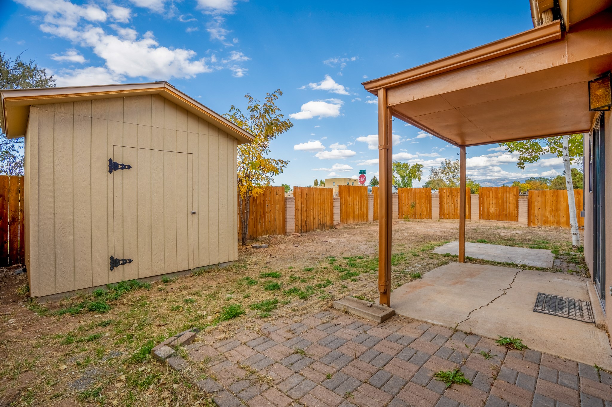 Super cute, single family, single level, 1 bedroom, 1 bath, 1 car carport home in Las Acequias full of upgrades is sited on a corner lot with mountain views. The light and bright living room has high ceiling, wood burning fireplace and clear story windows. The kitchen has been updated with soft close cabinets and drawers, lovely tile counters, track lighting and has an eat in kitchen nook. The owner's suite is adorned with an en-suite bathroom including a closet and an absolutely beautiful remodeled tiled walk-in shower including double vanities with tile counters. From the bedroom, there are sliding doors leading to the large back yard with a covered porch, an appx 2 year old 8 x 10 storage shed, trees, plenty of room for plantings and mountain views. The front yard is enclosed, has a huge apricot tree and covered porch. Amenities and features: Tile floors with carpet in bedroom-Forced air heat-Evaporative cooling-2 closets in bedroom-Concrete pad and wired for hot tub-Front exterior storage closet-Stackable washer and dryer and there is a park in the community.