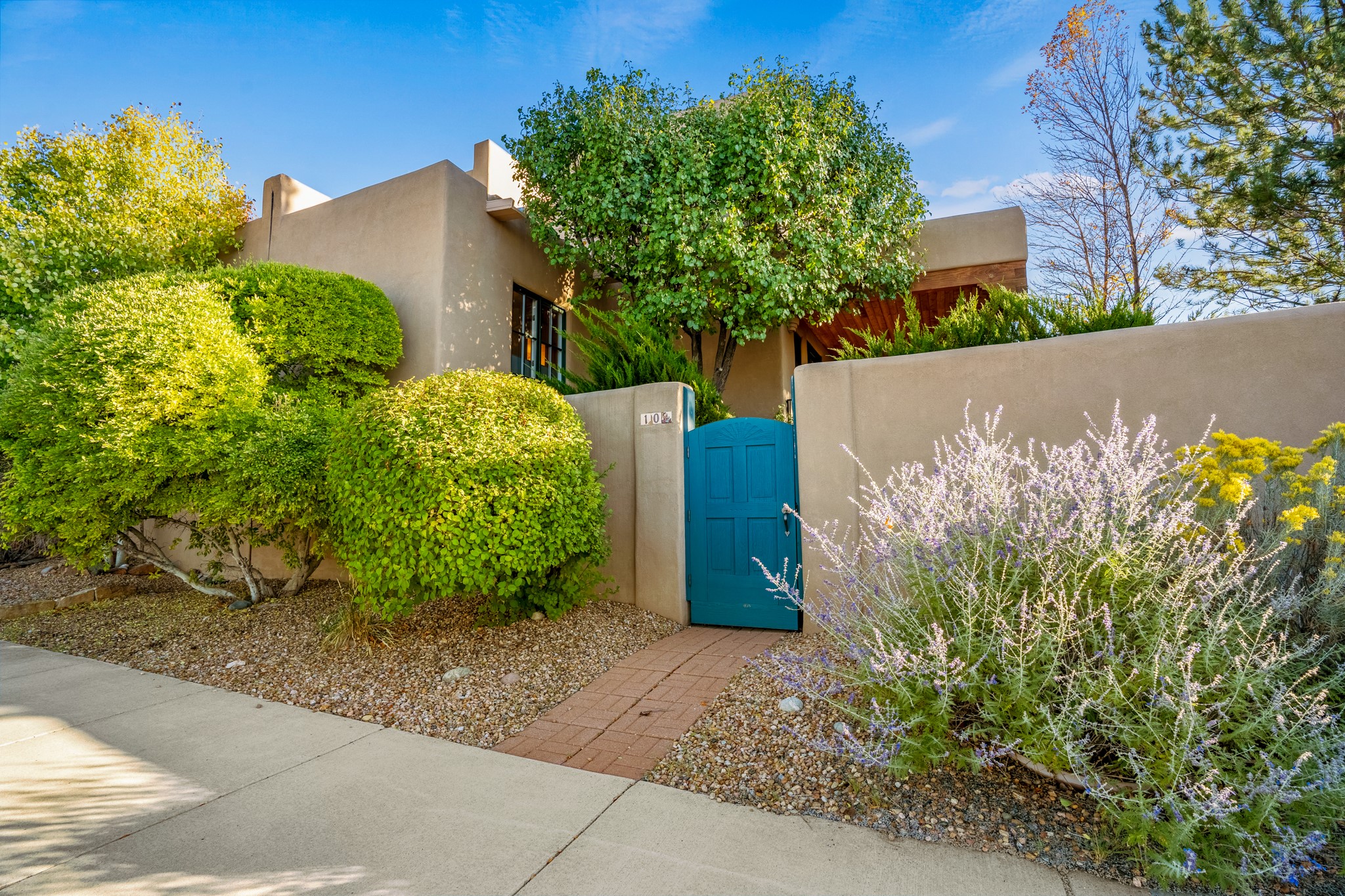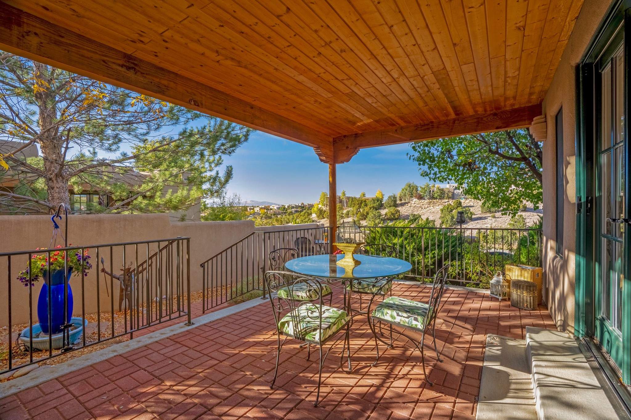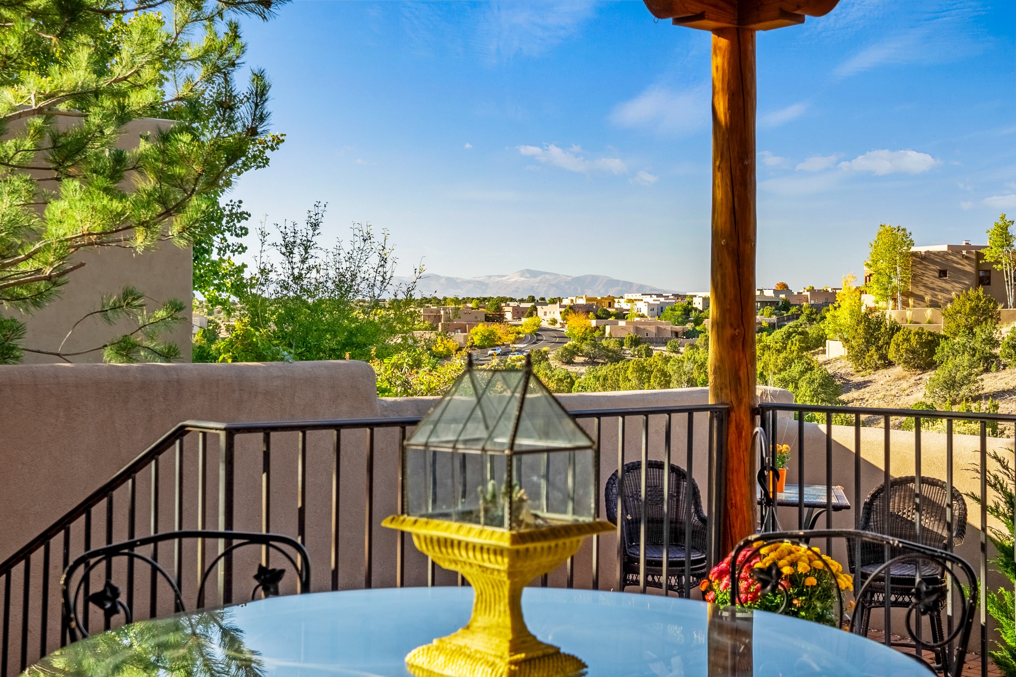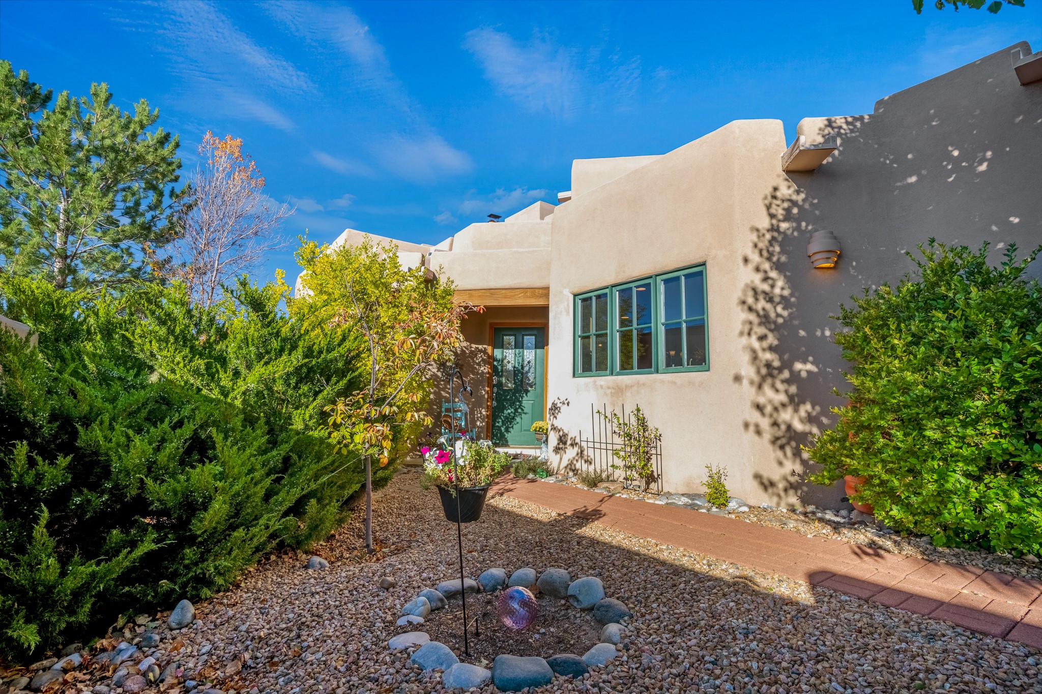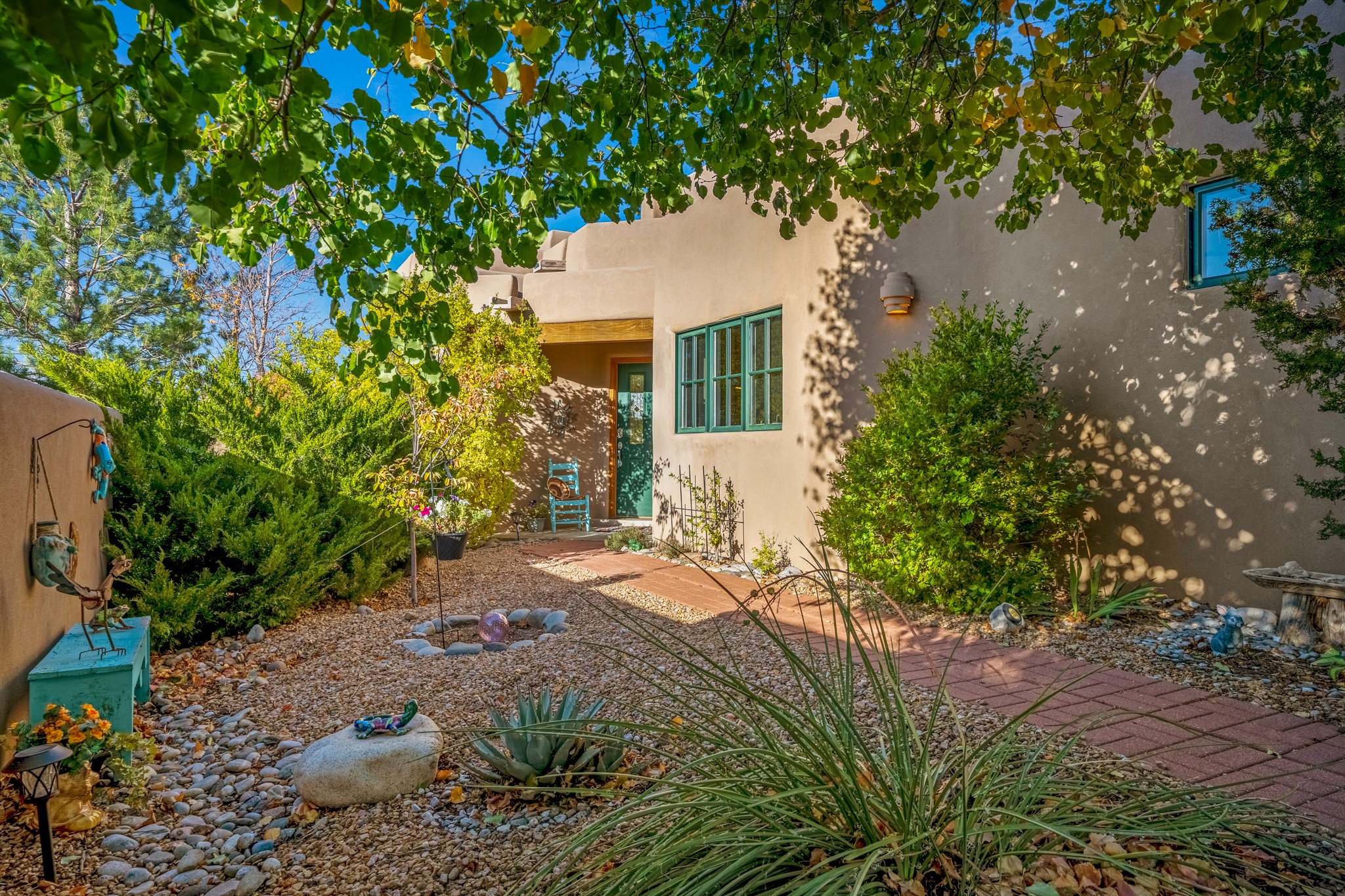 Bright, airy, contemporary patio home located in the heart of Aldea de Santa Fe. This light filled home features an open concept floor plan, first floor master suite, attached garage, radiant in floor heat, evaporative cooling, beautiful landscaping, drip irrigation and a large, covered patio with Jemez mountain views. The main living area has a high ceiling, vigas, large windows, faux paint and wood burning kiva fireplace. Kitchen features spacious pantries, maple cabinets, a center island and stainless Bosch and Amana appliances. The master suite includes a walk-in closet, jetted tub and large shower. French doors with screens in both the living room and master suite open directly to the patio. Two spacious, carpeted bedrooms and full bath are located on the second floor. The lovely and peaceful yard is completely walled for your furry friends. The front of the house faces Aldea open space, offering stunning mountain views and the serenity of a walkable community with fitness amenities, parks, and miles of walking trails. The home backs up to a large parking area for guests. Great location with easy access to NM 599, Los Alamos, downtown Santa Fe. Aldea de Santa Fe is a new urbanist subdivision that offers 13 miles of walking trails, community center, Bocci ball, tennis and basket-ball courts. Just steps away from Aldea plaza and specialty shops, caf, and businesses. community is great place to meet new friends with many special interest clubs in place.