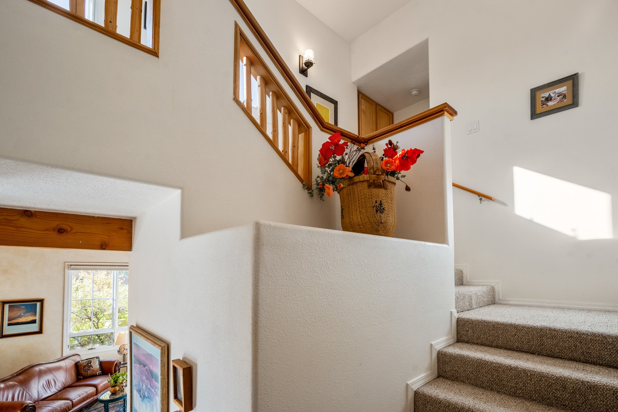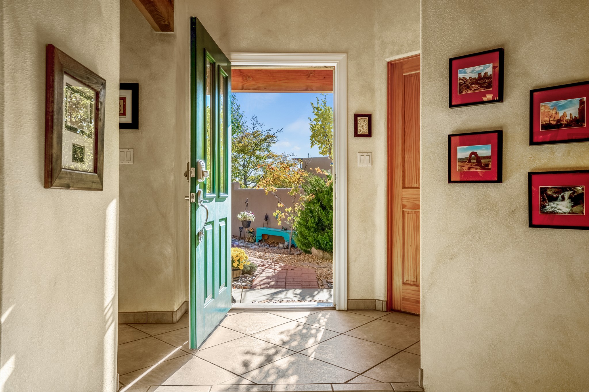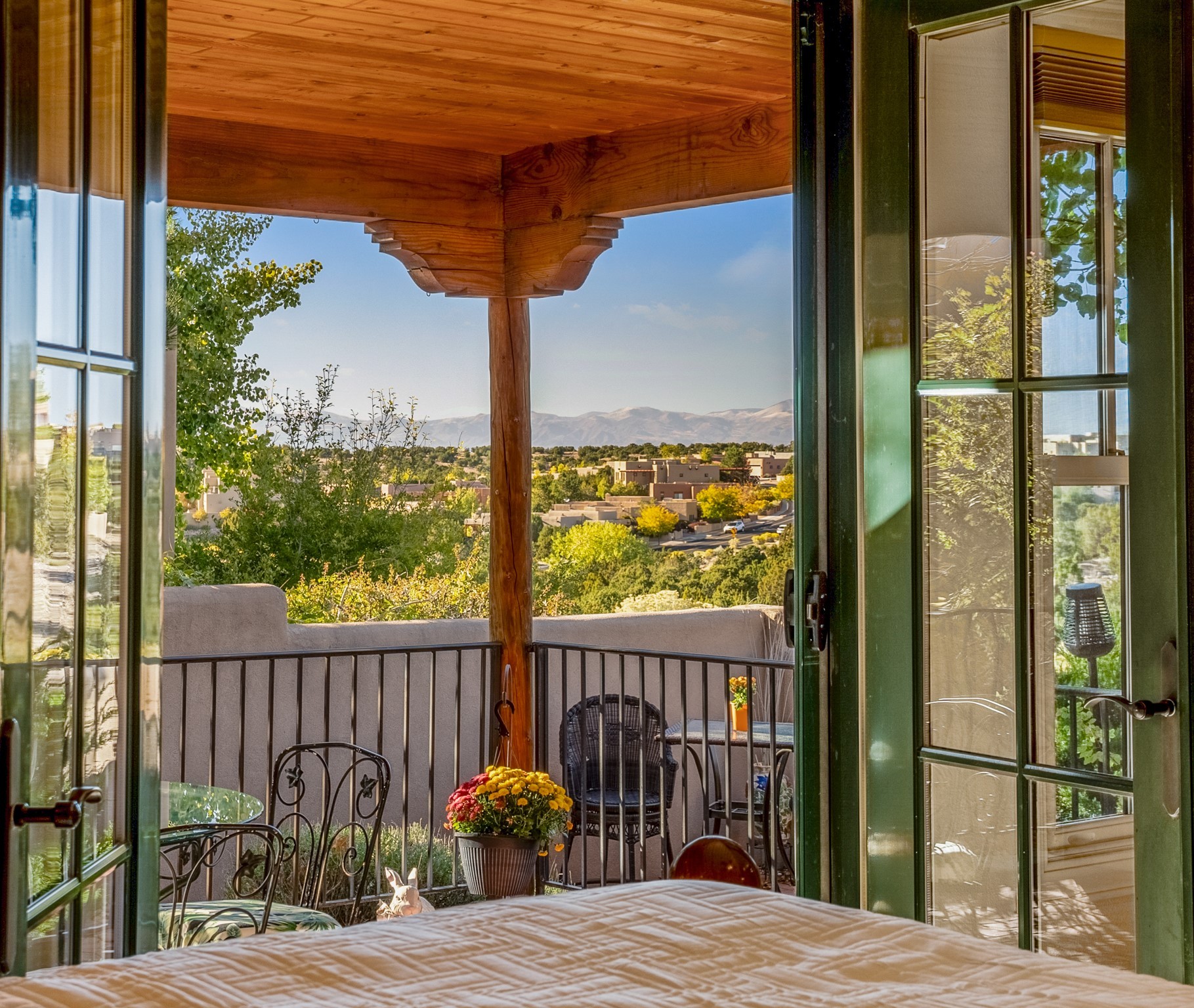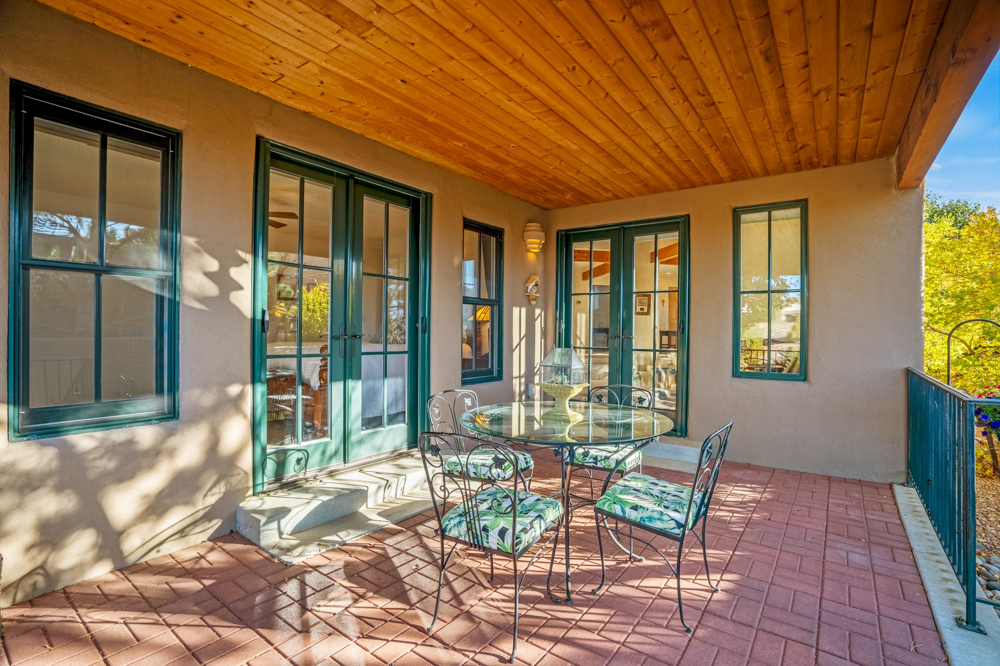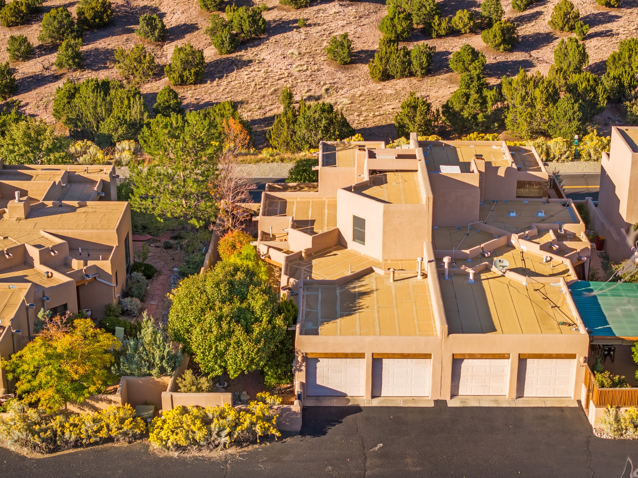 Bright, airy, contemporary patio home located in the heart of Aldea de Santa Fe. This light filled home features an open concept floor plan, first floor master suite, attached garage, radiant in floor heat, evaporative cooling, beautiful landscaping, drip irrigation and a large, covered patio with Jemez mountain views. The main living area has a high ceiling, vigas, large windows, faux paint and wood burning kiva fireplace. Kitchen features spacious pantries, maple cabinets, a center island and stainless Bosch and Amana appliances. The master suite includes a walk-in closet, jetted tub and large shower. French doors with screens in both the living room and master suite open directly to the patio. Two spacious, carpeted bedrooms and full bath are located on the second floor. The lovely and peaceful yard is completely walled for your furry friends. The front of the house faces Aldea open space, offering stunning mountain views and the serenity of a walkable community with fitness amenities, parks, and miles of walking trails. The home backs up to a large parking area for guests. Great location with easy access to NM 599, Los Alamos, downtown Santa Fe. Aldea de Santa Fe is a new urbanist subdivision that offers 13 miles of walking trails, community center, Bocci ball, tennis and basket-ball courts. Just steps away from Aldea plaza and specialty shops, caf, and businesses. community is great place to meet new friends with many special interest clubs in place.