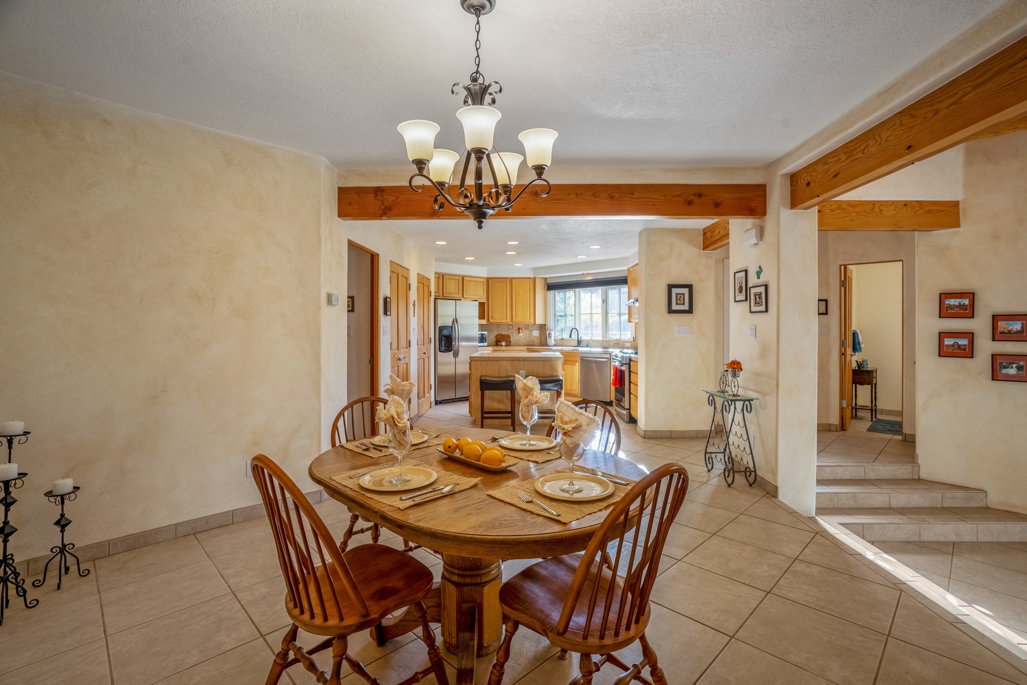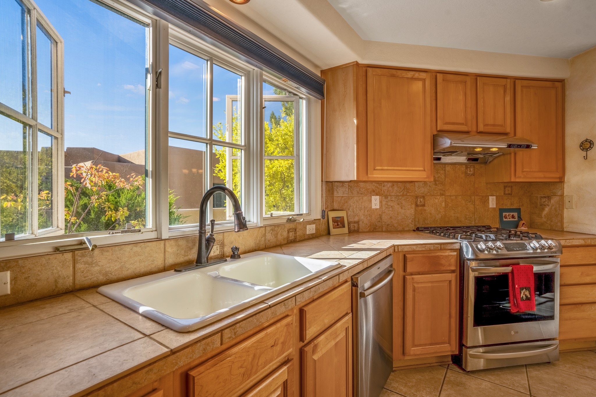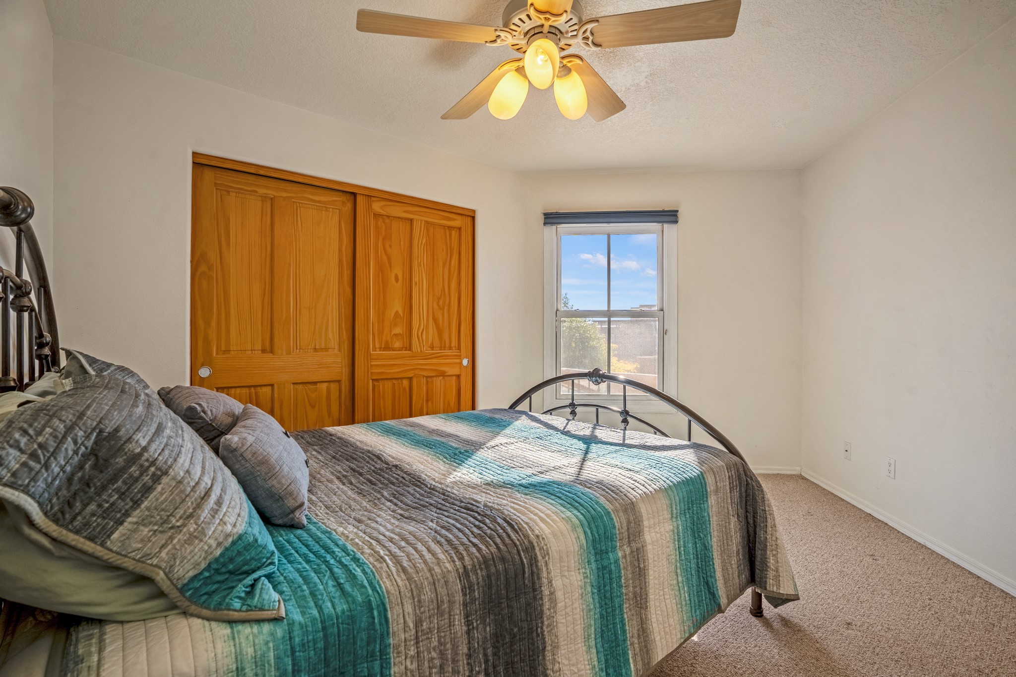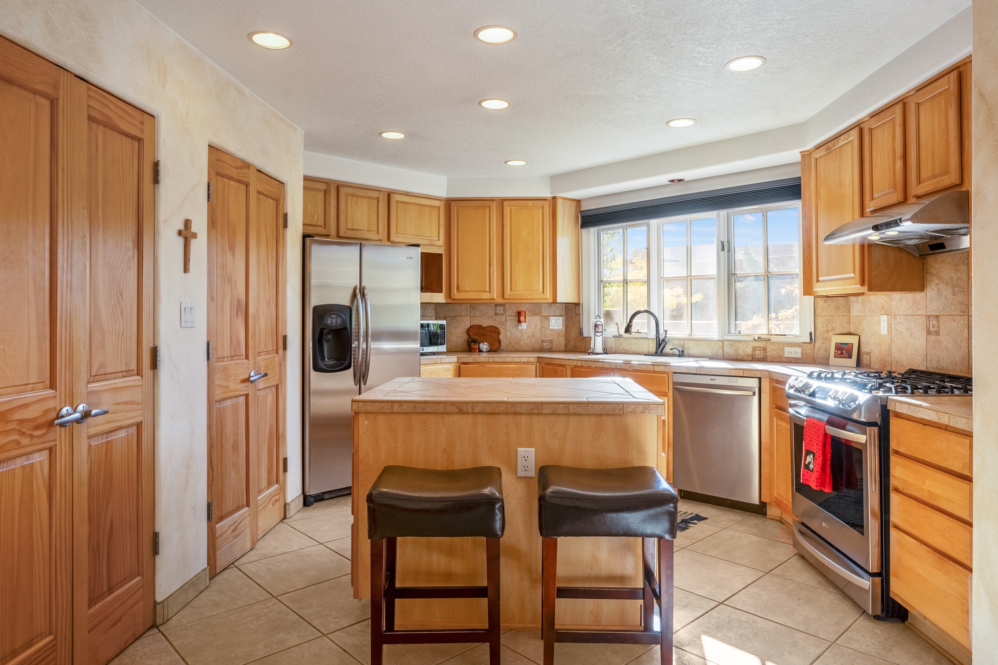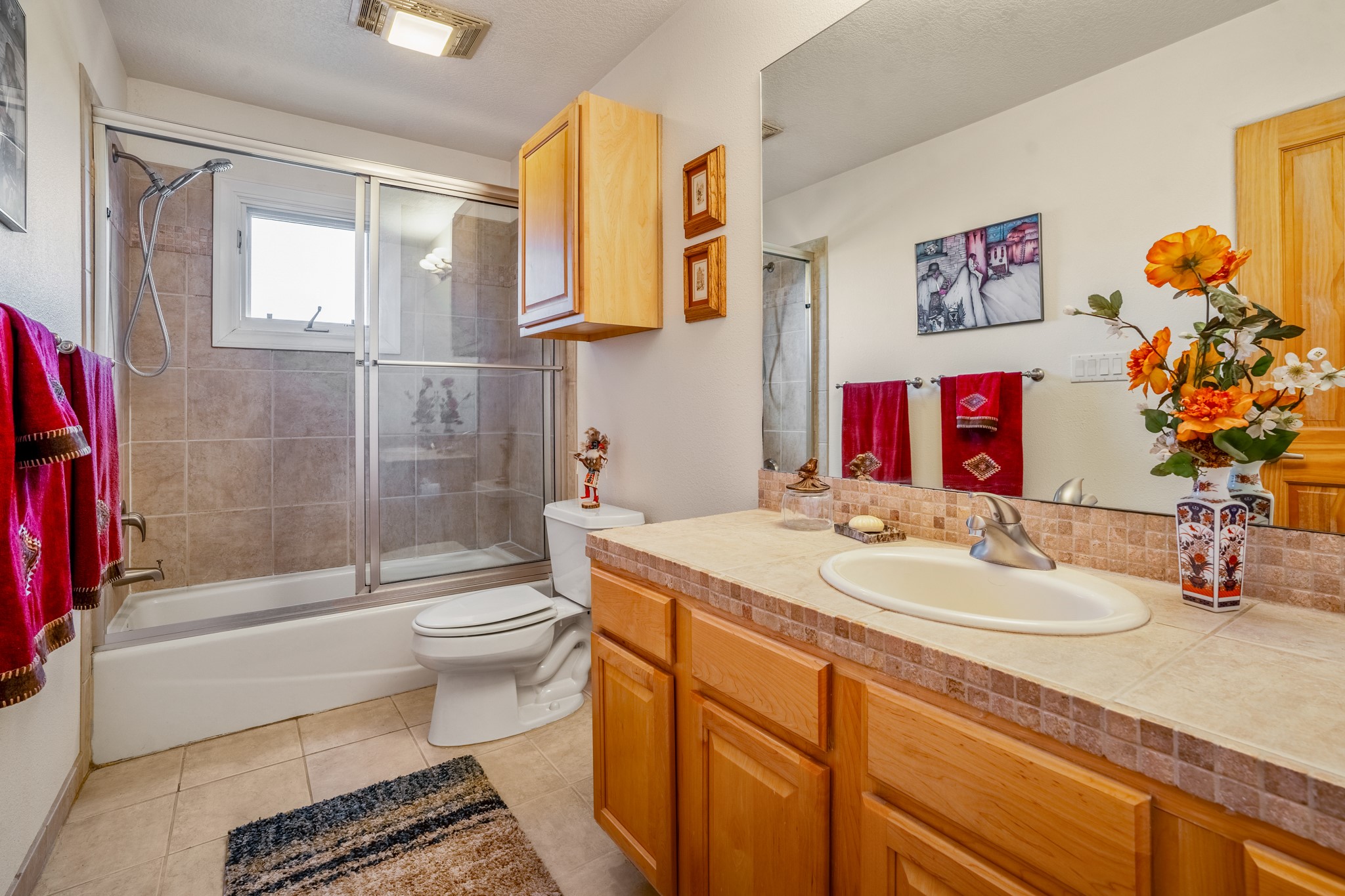 Bright, airy, contemporary patio home located in the heart of Aldea de Santa Fe. This light filled home features an open concept floor plan, first floor master suite, attached garage, radiant in floor heat, evaporative cooling, beautiful landscaping, drip irrigation and a large, covered patio with Jemez mountain views. The main living area has a high ceiling, vigas, large windows, faux paint and wood burning kiva fireplace. Kitchen features spacious pantries, maple cabinets, a center island and stainless Bosch and Amana appliances. The master suite includes a walk-in closet, jetted tub and large shower. French doors with screens in both the living room and master suite open directly to the patio. Two spacious, carpeted bedrooms and full bath are located on the second floor. The lovely and peaceful yard is completely walled for your furry friends. The front of the house faces Aldea open space, offering stunning mountain views and the serenity of a walkable community with fitness amenities, parks, and miles of walking trails. The home backs up to a large parking area for guests. Great location with easy access to NM 599, Los Alamos, downtown Santa Fe. Aldea de Santa Fe is a new urbanist subdivision that offers 13 miles of walking trails, community center, Bocci ball, tennis and basket-ball courts. Just steps away from Aldea plaza and specialty shops, caf, and businesses. community is great place to meet new friends with many special interest clubs in place.