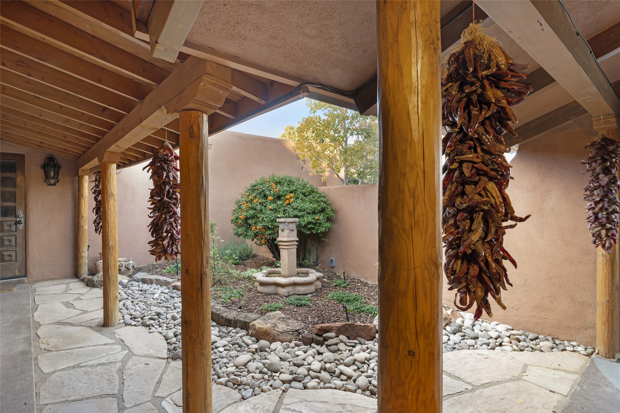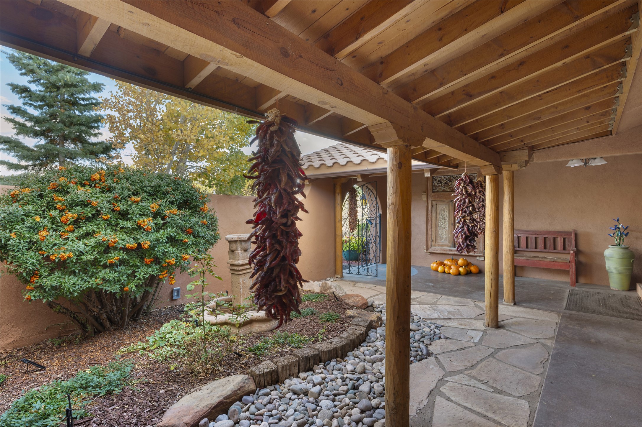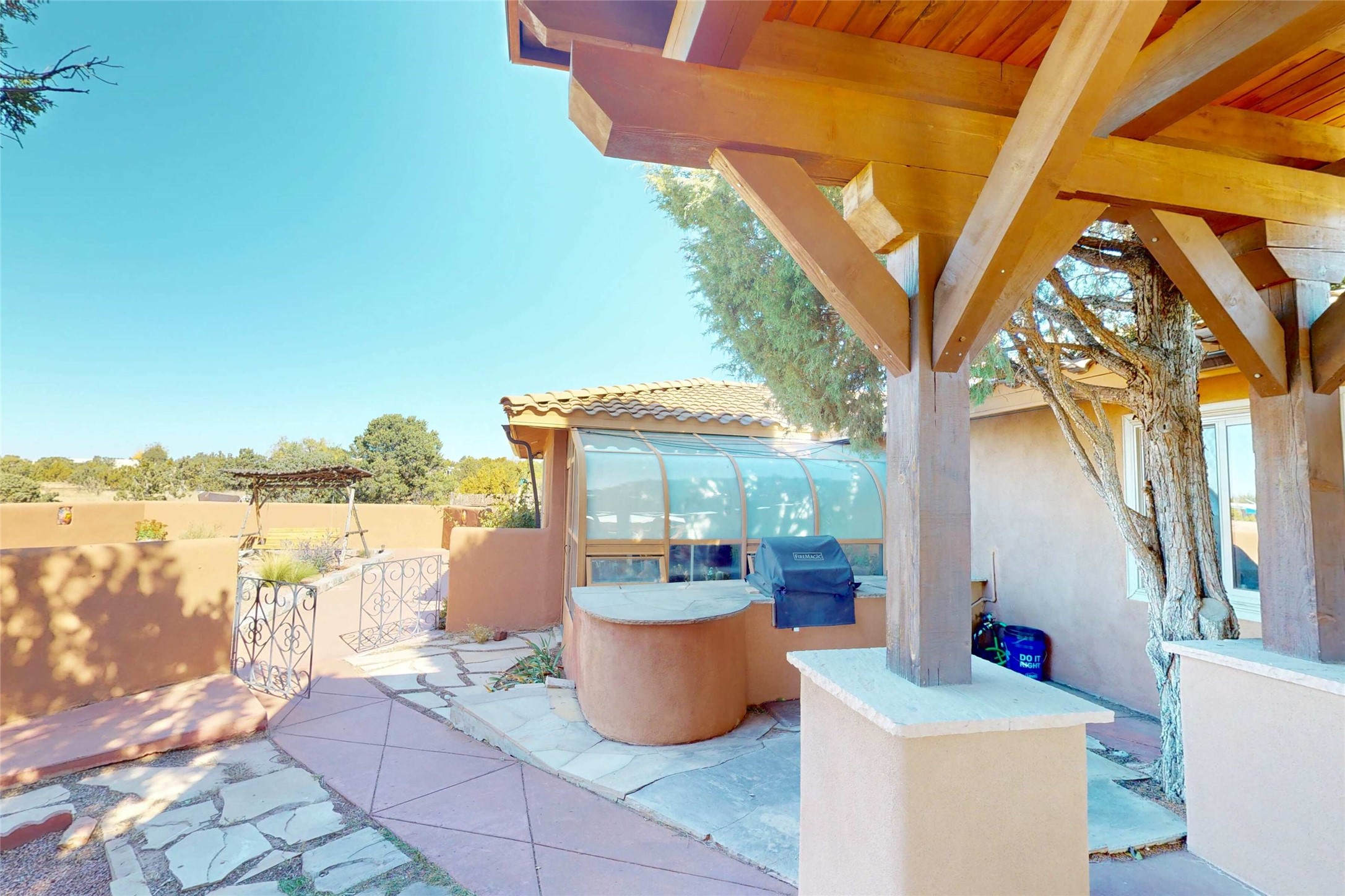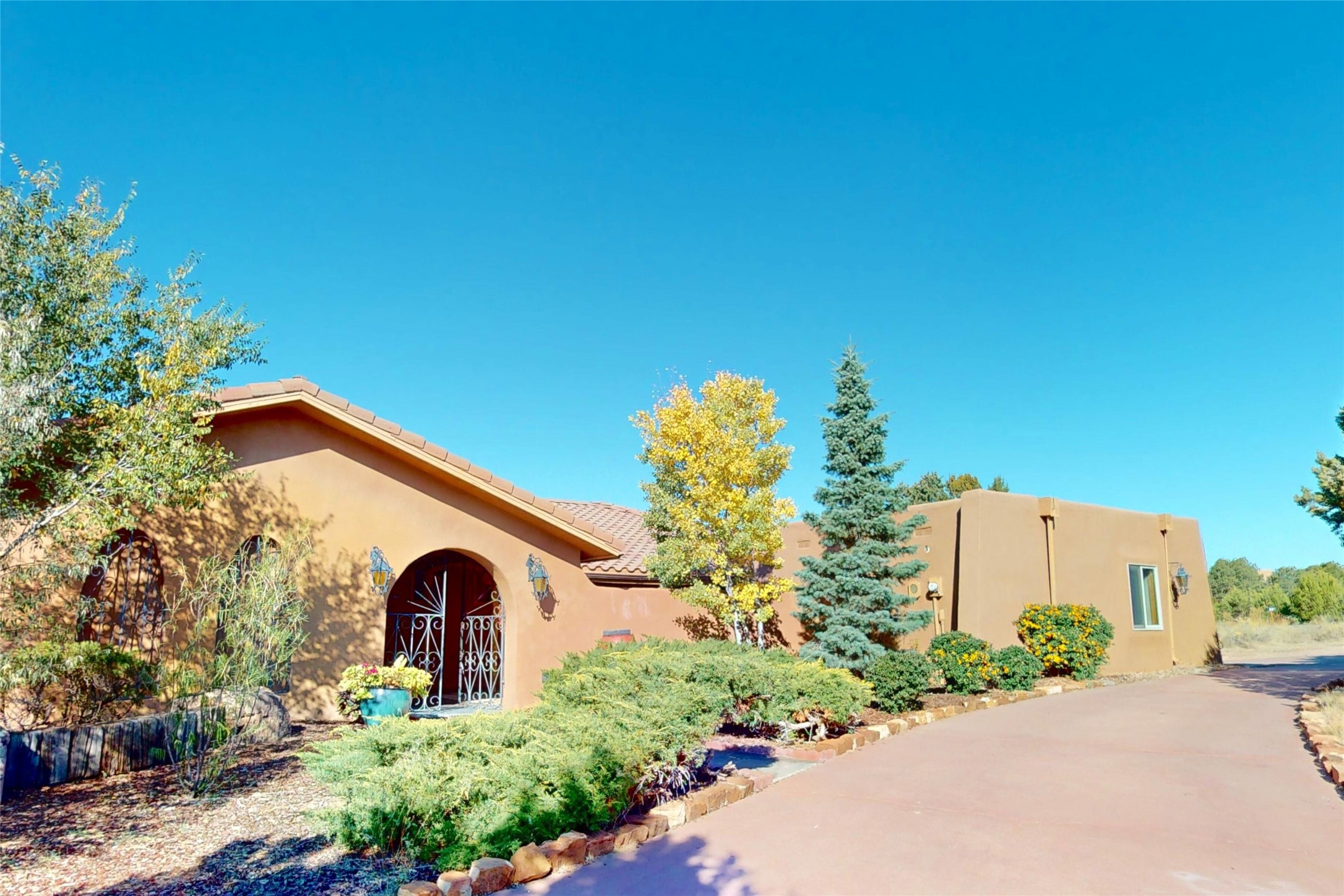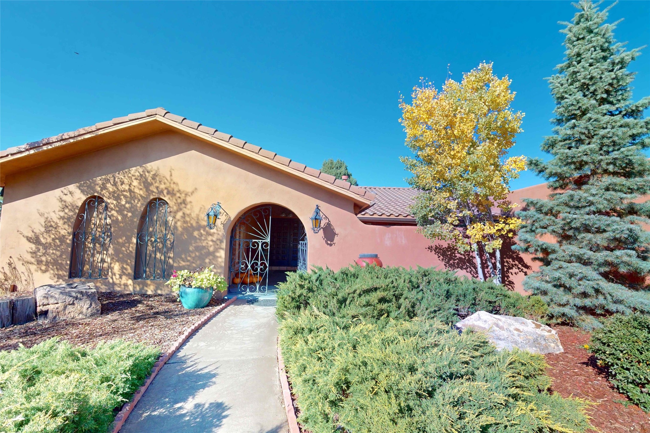 Attractive home in Eldorado with plenty of living and outdoor spaces for family & friends to gather. Circular drive & front courtyard with lovely fountain welcomes you to this well cared for property. From the main entry, the living/dining areas have vaulted T&G ceilings & beams. An impressive wood burning fireplace with stacked rock hearth and wood mantle is the focal point of this living space. Glass doors lead to multiple outdoor entertaining areas. The dining room has a wet bar with sink & built-in ice maker. The kitchen is ideal for entertaining, & features an expansive wall of windows with beautiful Eldorado views, plus an eat-in kitchen area. Pantry & laundry are nearby the kitchen. The spacious bedrooms & baths are located down the hallway. The primary suite has dual closets & sinks, a clawfoot tub, & private access to an outdoor area. The bedroom at the end of the hallway adjoins a greenhouse with access to outdoor spaces. Doors from the kitchen open to a covered patio with Kiva fireplace nearby & impressive built-in grill. Enclosed area with masterful hardscaping with plants, rock borders and amazing water feature. Oversized 2 car garage. Owners recently replaced two furnaces (w/warranty), and water heater. Garage roof was replaced approximately 3 years ago. Pristine home in a beautiful & peaceful location. Property has direct access to the rail trail & is nearby the community center with pickle ball, tennis courts, pool, dog park & more! Eldorado K-8 nearby too!