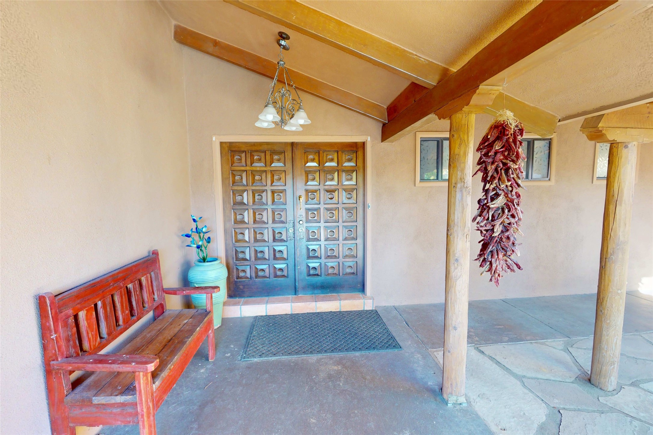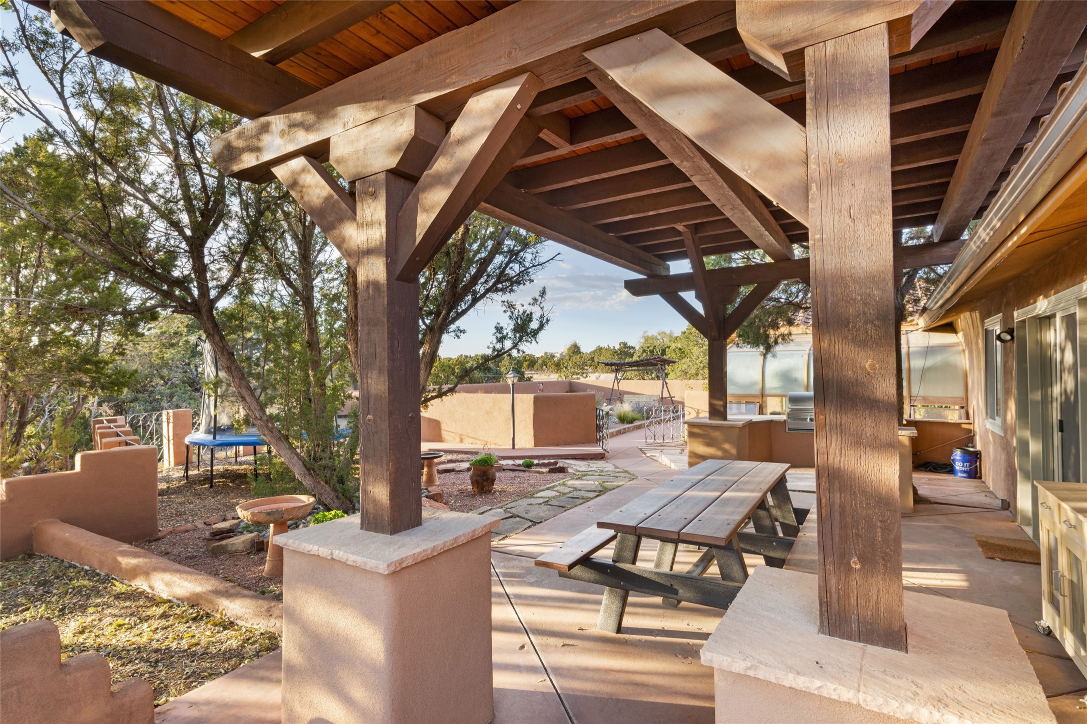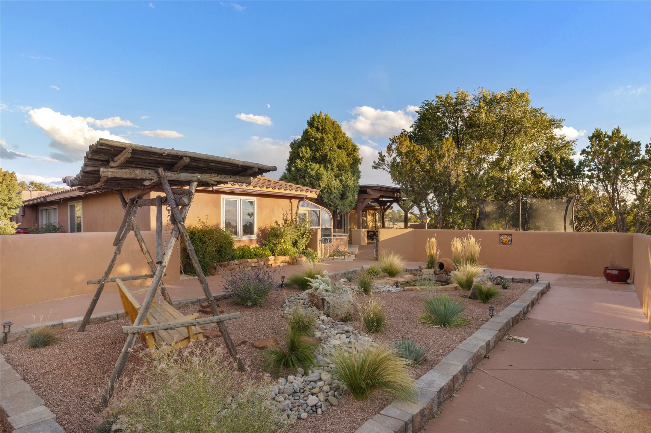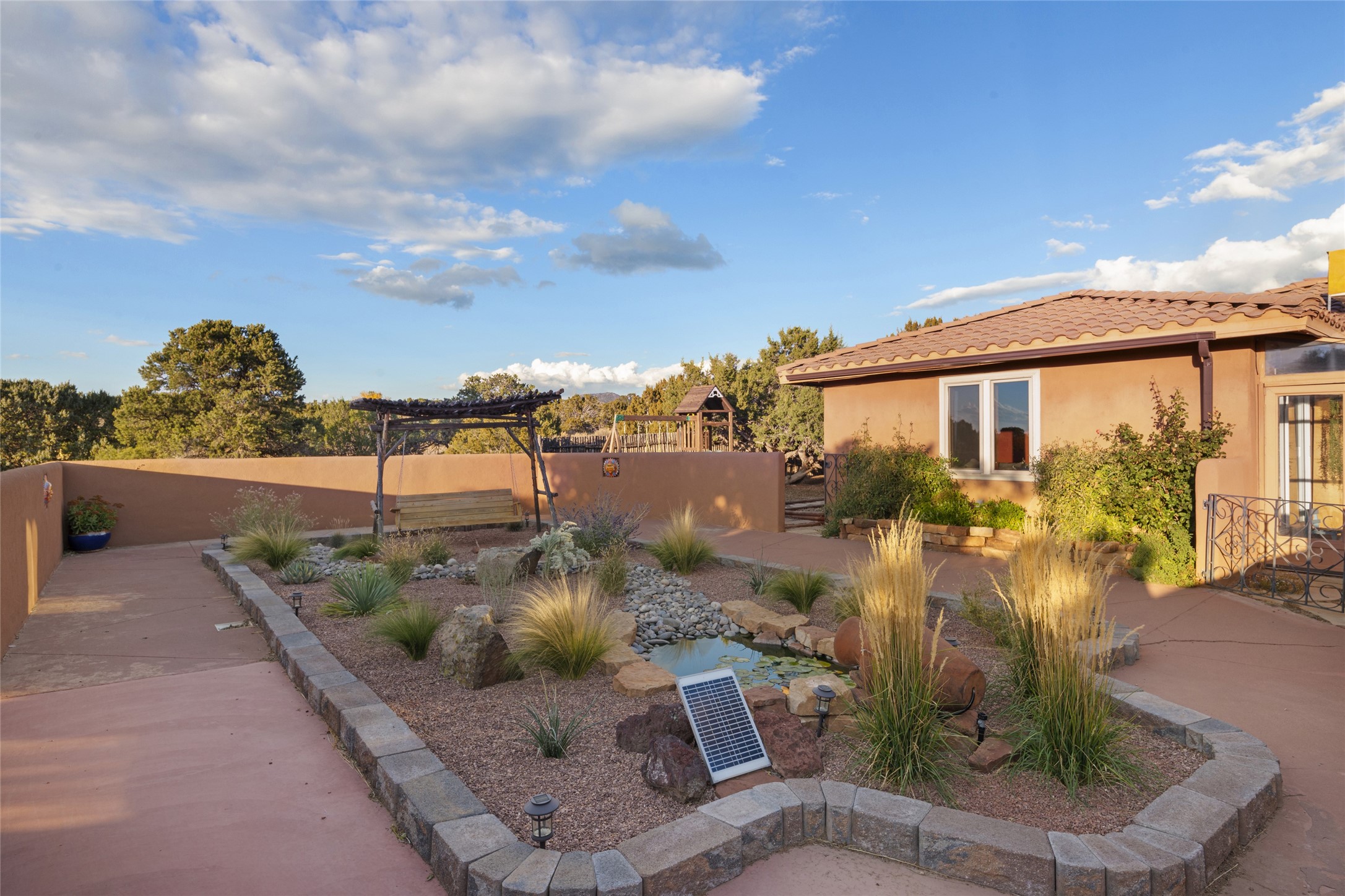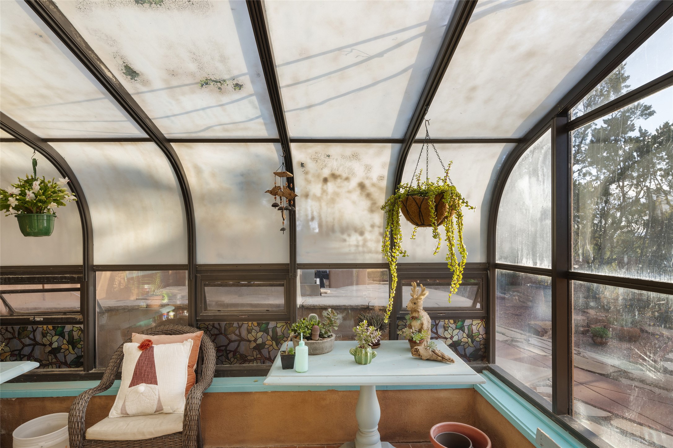 Attractive home in Eldorado with plenty of living and outdoor spaces for family & friends to gather. Circular drive & front courtyard with lovely fountain welcomes you to this well cared for property. From the main entry, the living/dining areas have vaulted T&G ceilings & beams. An impressive wood burning fireplace with stacked rock hearth and wood mantle is the focal point of this living space. Glass doors lead to multiple outdoor entertaining areas. The dining room has a wet bar with sink & built-in ice maker. The kitchen is ideal for entertaining, & features an expansive wall of windows with beautiful Eldorado views, plus an eat-in kitchen area. Pantry & laundry are nearby the kitchen. The spacious bedrooms & baths are located down the hallway. The primary suite has dual closets & sinks, a clawfoot tub, & private access to an outdoor area. The bedroom at the end of the hallway adjoins a greenhouse with access to outdoor spaces. Doors from the kitchen open to a covered patio with Kiva fireplace nearby & impressive built-in grill. Enclosed area with masterful hardscaping with plants, rock borders and amazing water feature. Oversized 2 car garage. Owners recently replaced two furnaces (w/warranty), and water heater. Garage roof was replaced approximately 3 years ago. Pristine home in a beautiful & peaceful location. Property has direct access to the rail trail & is nearby the community center with pickle ball, tennis courts, pool, dog park & more! Eldorado K-8 nearby too!