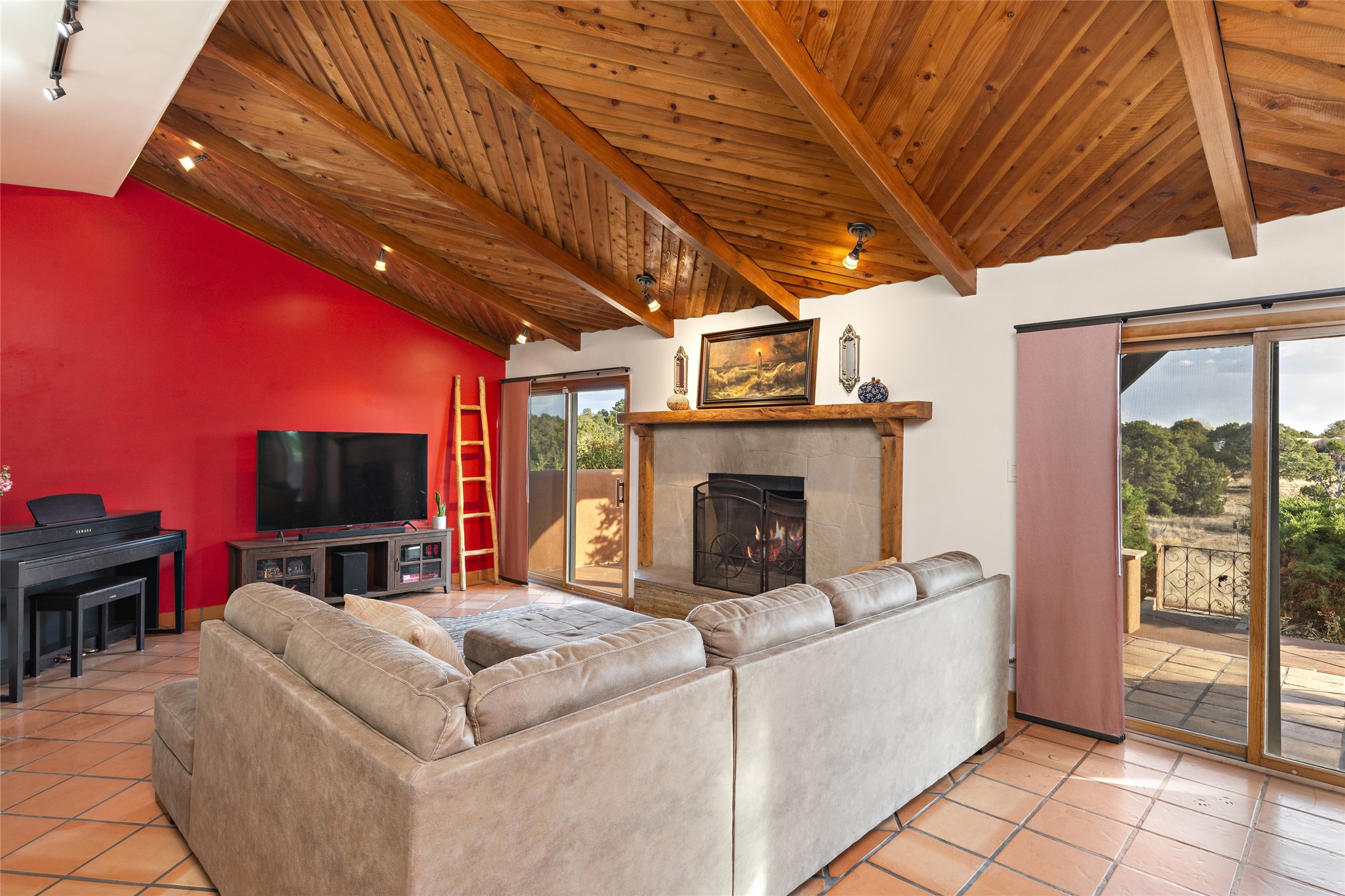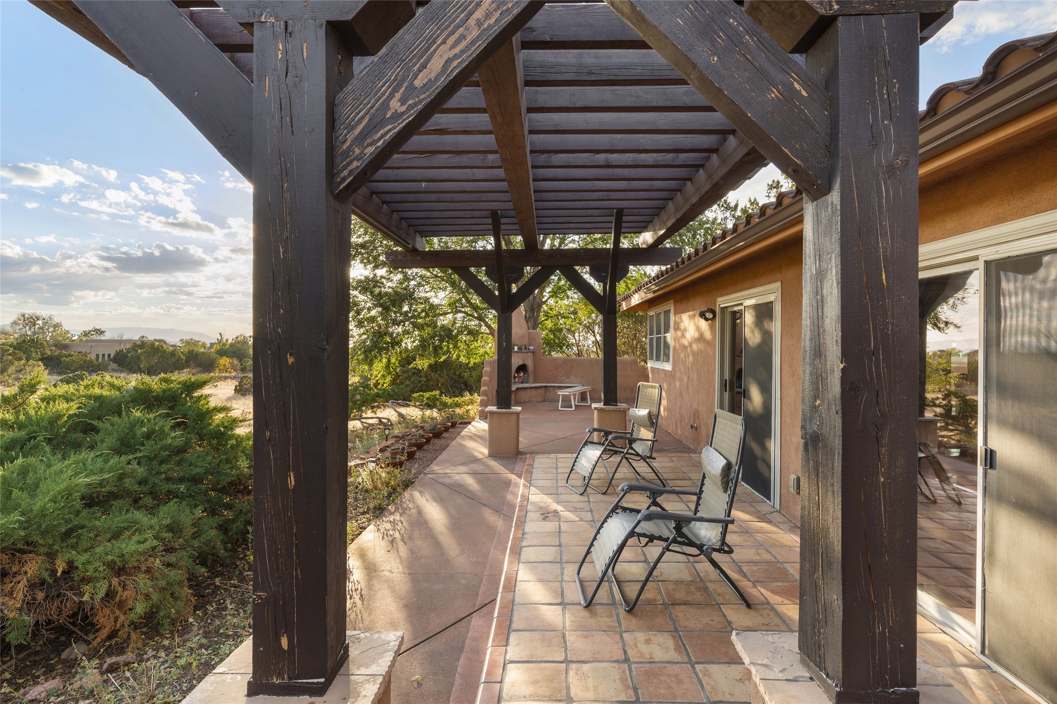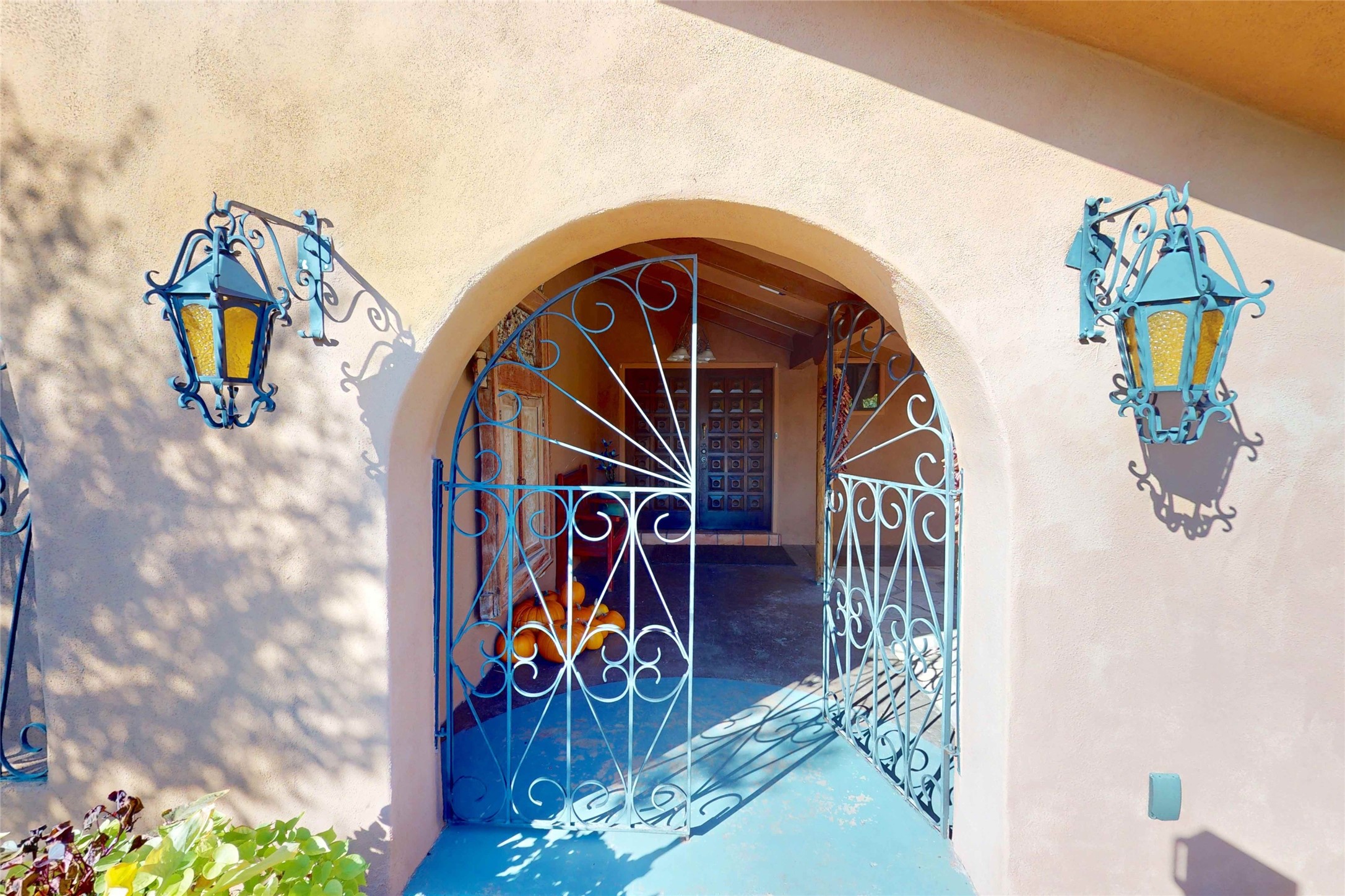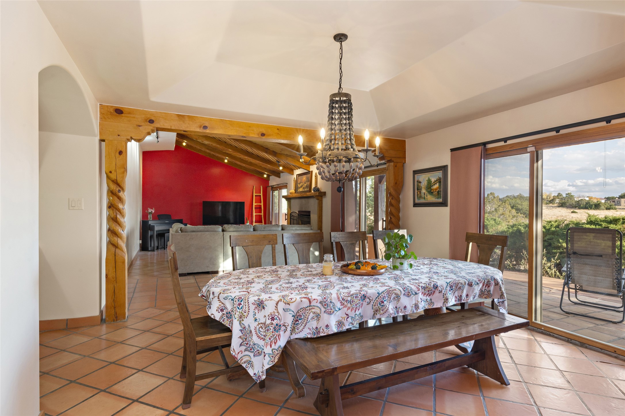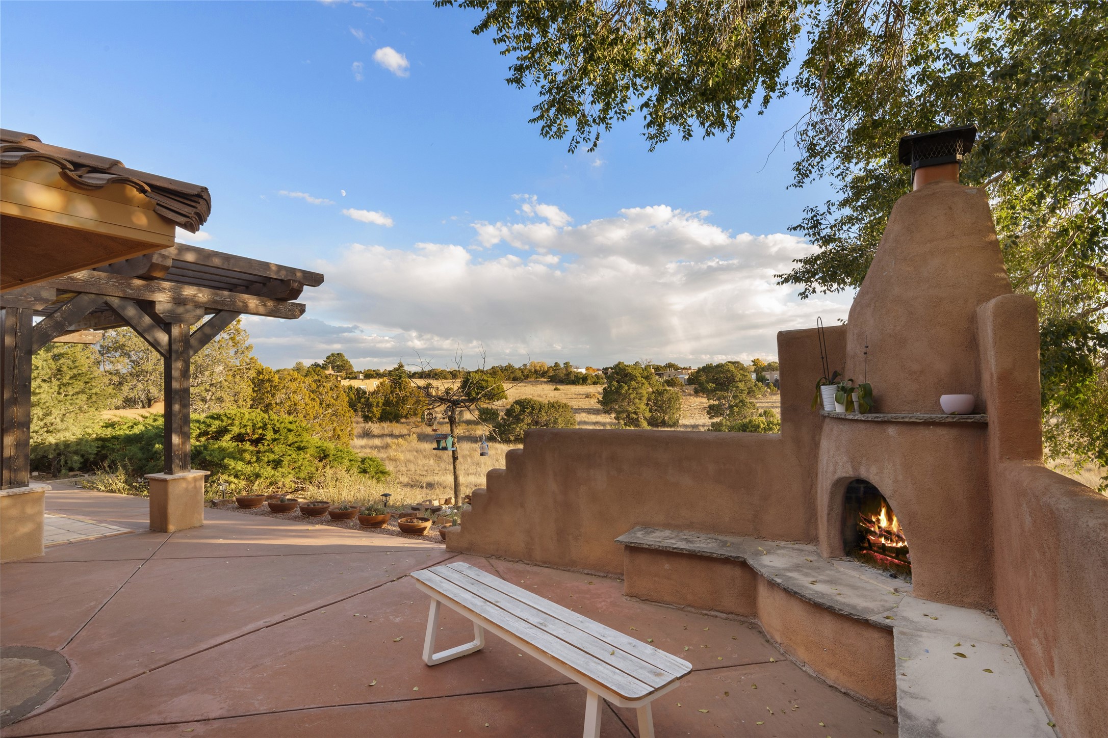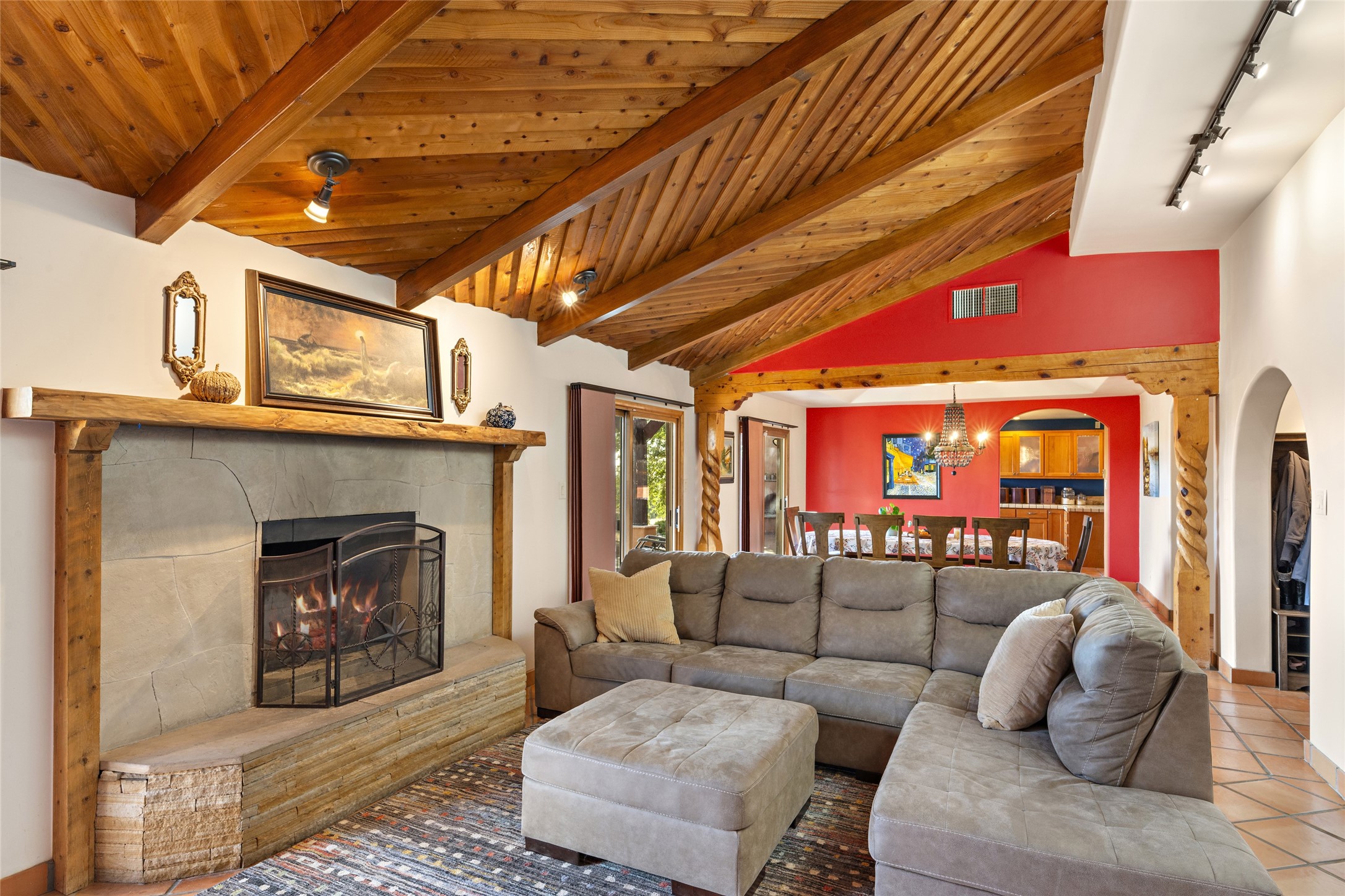 Attractive home in Eldorado with plenty of living and outdoor spaces for family & friends to gather. Circular drive & front courtyard with lovely fountain welcomes you to this well cared for property. From the main entry, the living/dining areas have vaulted T&G ceilings & beams. An impressive wood burning fireplace with stacked rock hearth and wood mantle is the focal point of this living space. Glass doors lead to multiple outdoor entertaining areas. The dining room has a wet bar with sink & built-in ice maker. The kitchen is ideal for entertaining, & features an expansive wall of windows with beautiful Eldorado views, plus an eat-in kitchen area. Pantry & laundry are nearby the kitchen. The spacious bedrooms & baths are located down the hallway. The primary suite has dual closets & sinks, a clawfoot tub, & private access to an outdoor area. The bedroom at the end of the hallway adjoins a greenhouse with access to outdoor spaces. Doors from the kitchen open to a covered patio with Kiva fireplace nearby & impressive built-in grill. Enclosed area with masterful hardscaping with plants, rock borders and amazing water feature. Oversized 2 car garage. Owners recently replaced two furnaces (w/warranty), and water heater. Garage roof was replaced approximately 3 years ago. Pristine home in a beautiful & peaceful location. Property has direct access to the rail trail & is nearby the community center with pickle ball, tennis courts, pool, dog park & more! Eldorado K-8 nearby too!