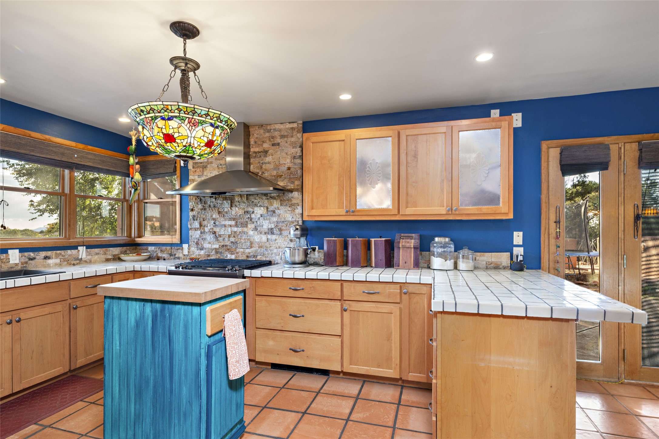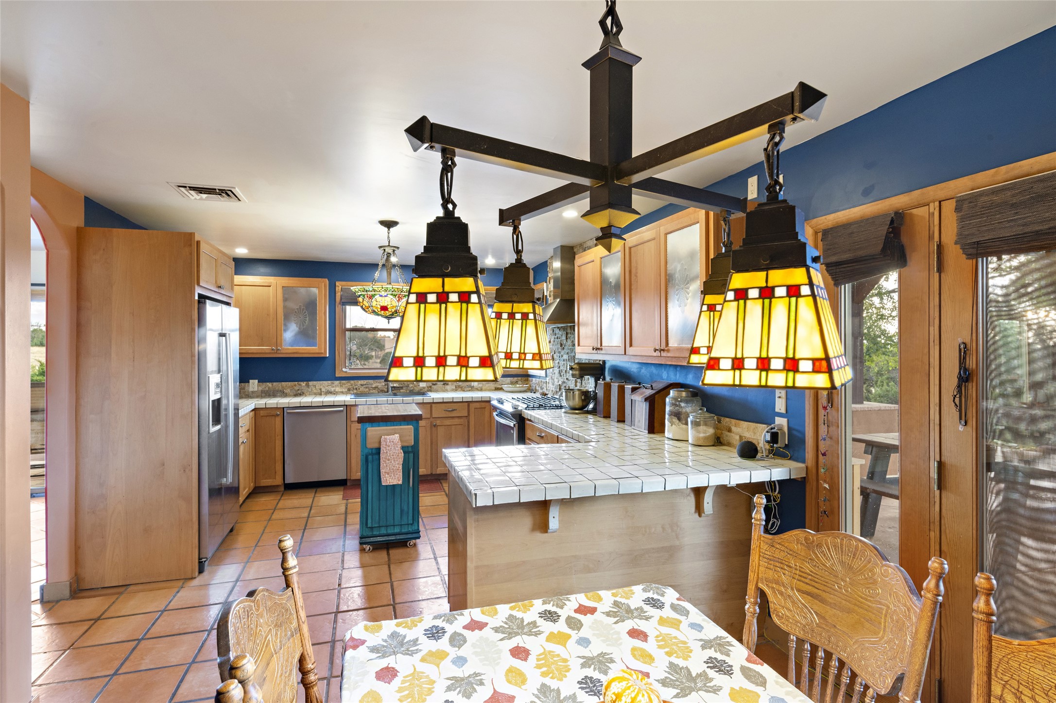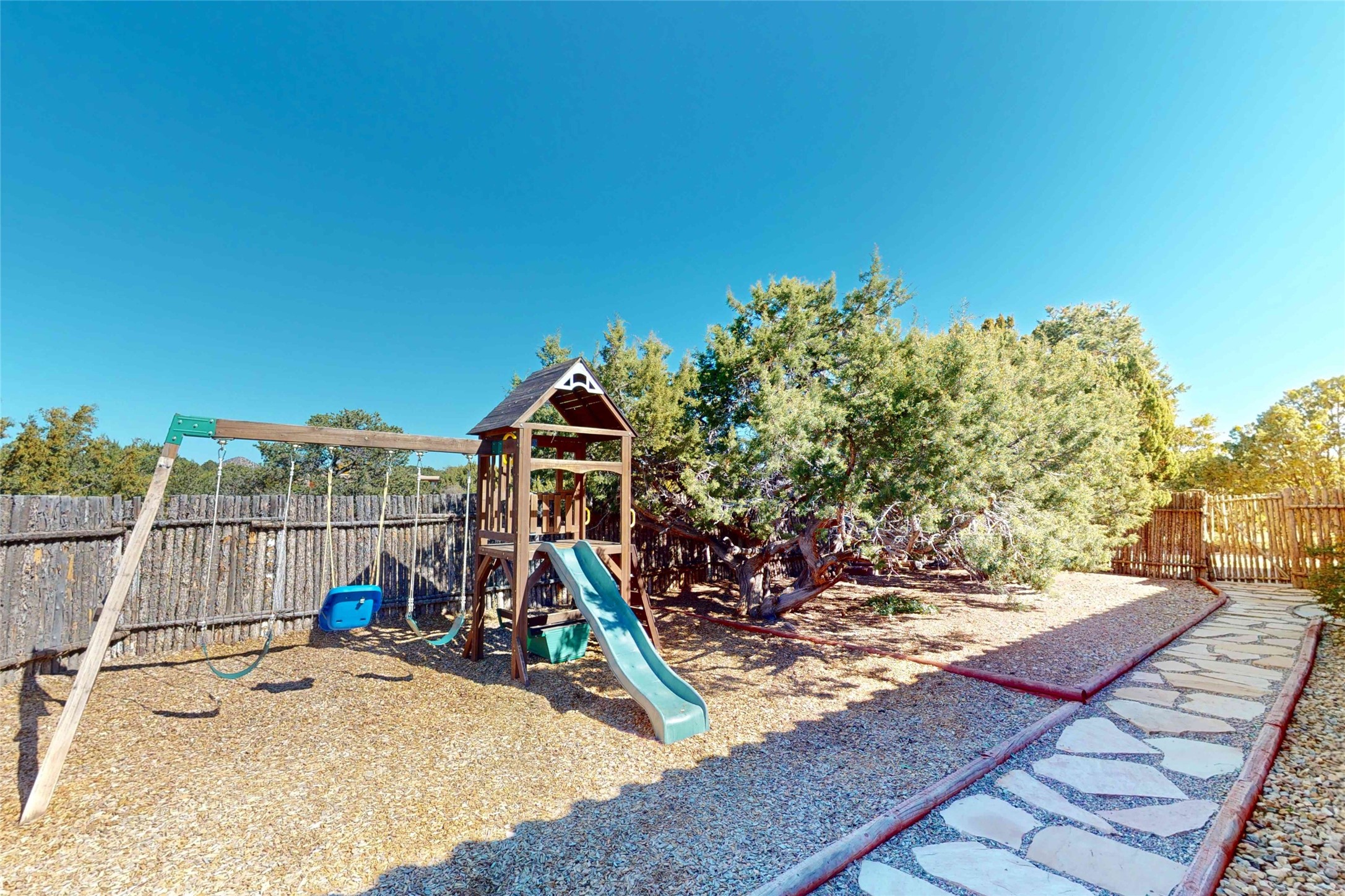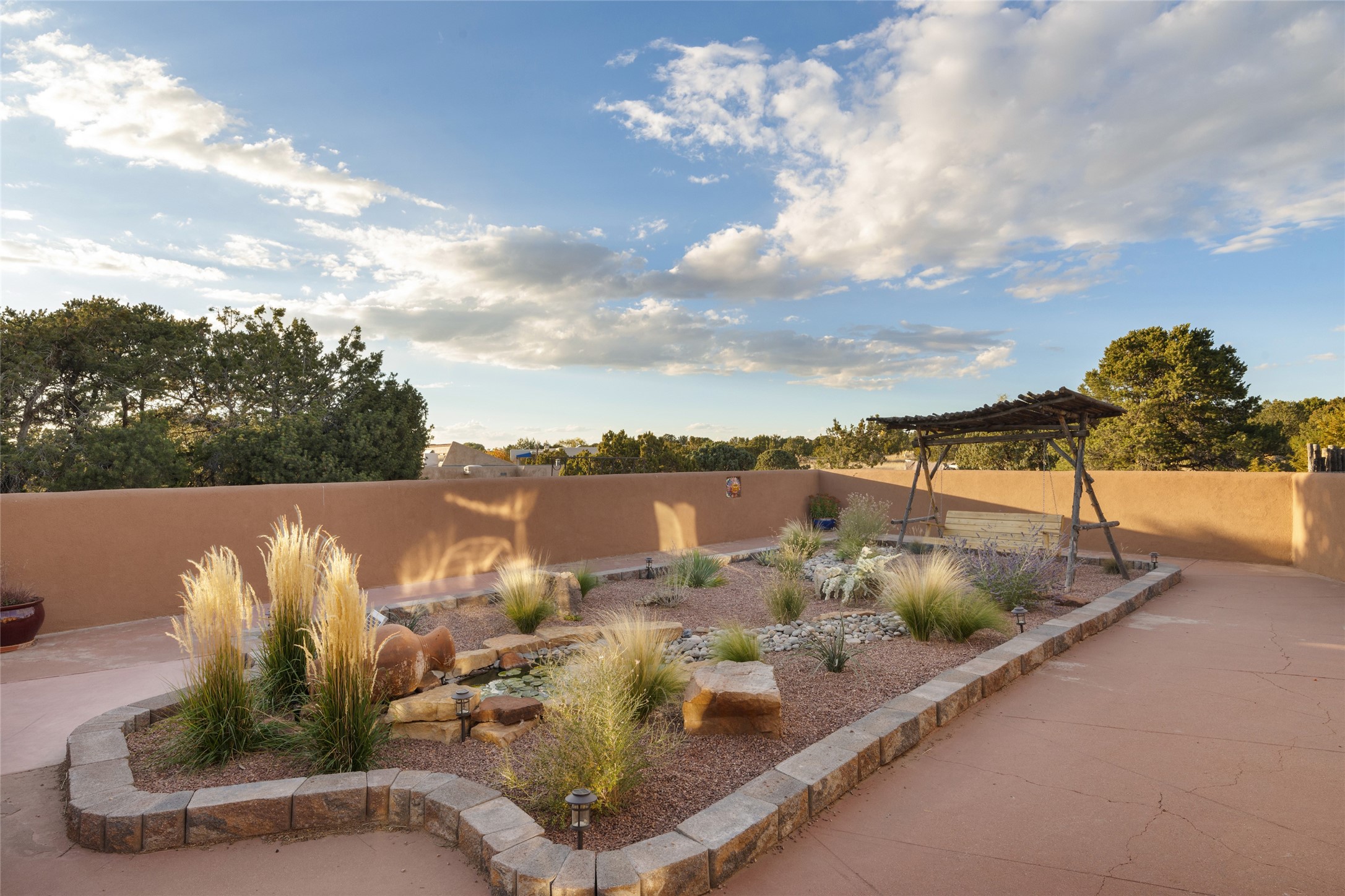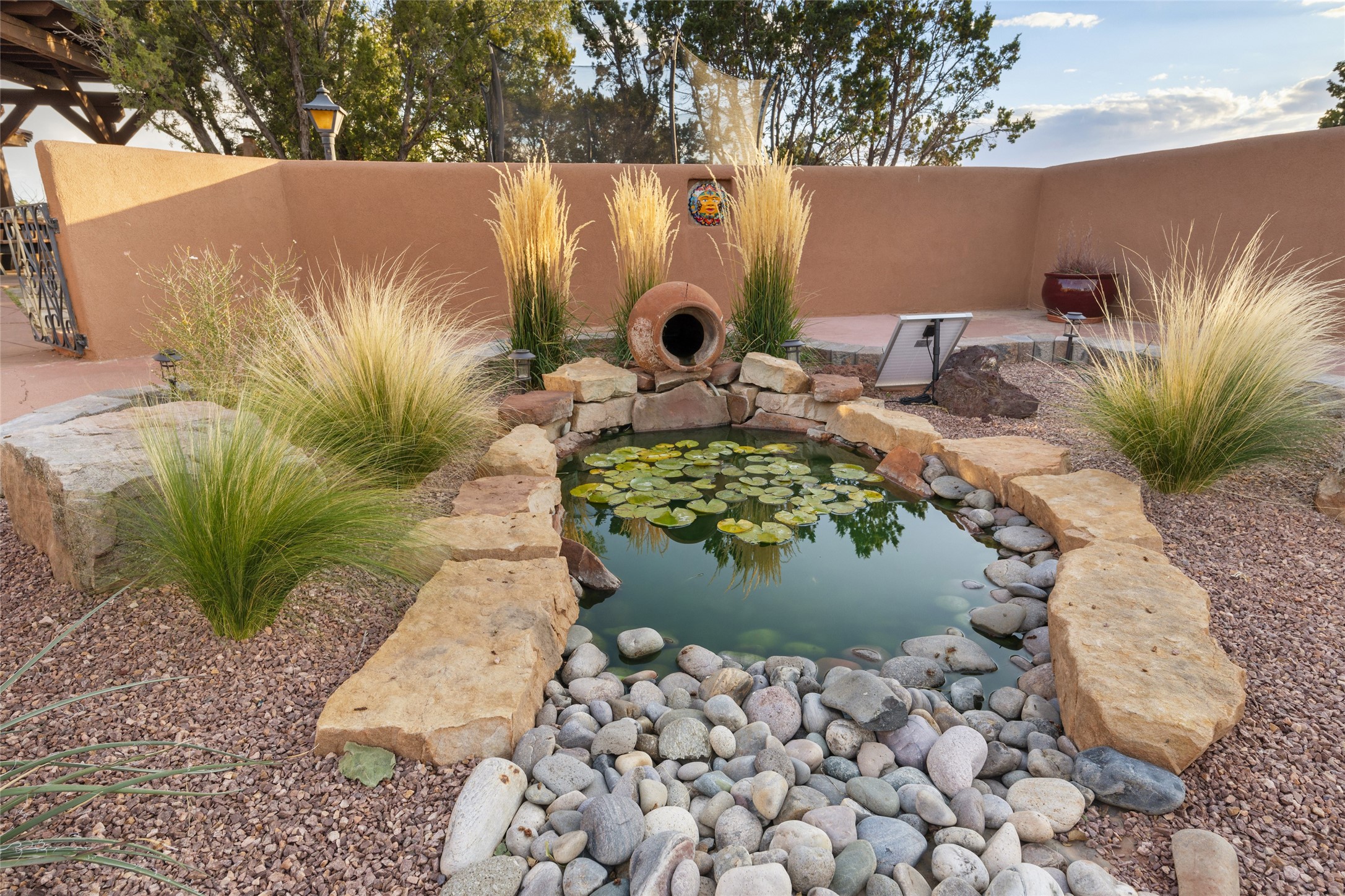 Attractive home in Eldorado with plenty of living and outdoor spaces for family & friends to gather. Circular drive & front courtyard with lovely fountain welcomes you to this well cared for property. From the main entry, the living/dining areas have vaulted T&G ceilings & beams. An impressive wood burning fireplace with stacked rock hearth and wood mantle is the focal point of this living space. Glass doors lead to multiple outdoor entertaining areas. The dining room has a wet bar with sink & built-in ice maker. The kitchen is ideal for entertaining, & features an expansive wall of windows with beautiful Eldorado views, plus an eat-in kitchen area. Pantry & laundry are nearby the kitchen. The spacious bedrooms & baths are located down the hallway. The primary suite has dual closets & sinks, a clawfoot tub, & private access to an outdoor area. The bedroom at the end of the hallway adjoins a greenhouse with access to outdoor spaces. Doors from the kitchen open to a covered patio with Kiva fireplace nearby & impressive built-in grill. Enclosed area with masterful hardscaping with plants, rock borders and amazing water feature. Oversized 2 car garage. Owners recently replaced two furnaces (w/warranty), and water heater. Garage roof was replaced approximately 3 years ago. Pristine home in a beautiful & peaceful location. Property has direct access to the rail trail & is nearby the community center with pickle ball, tennis courts, pool, dog park & more! Eldorado K-8 nearby too!