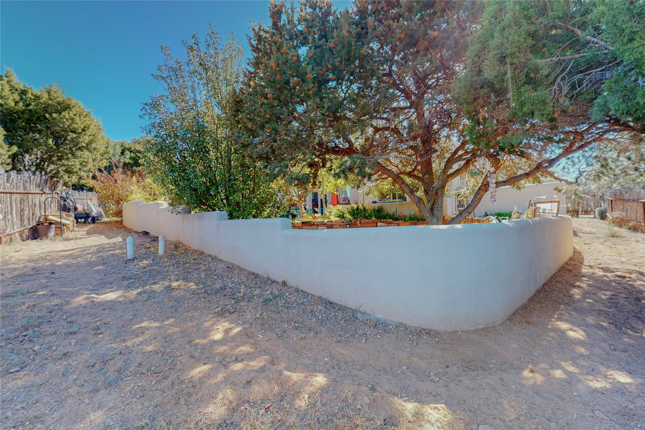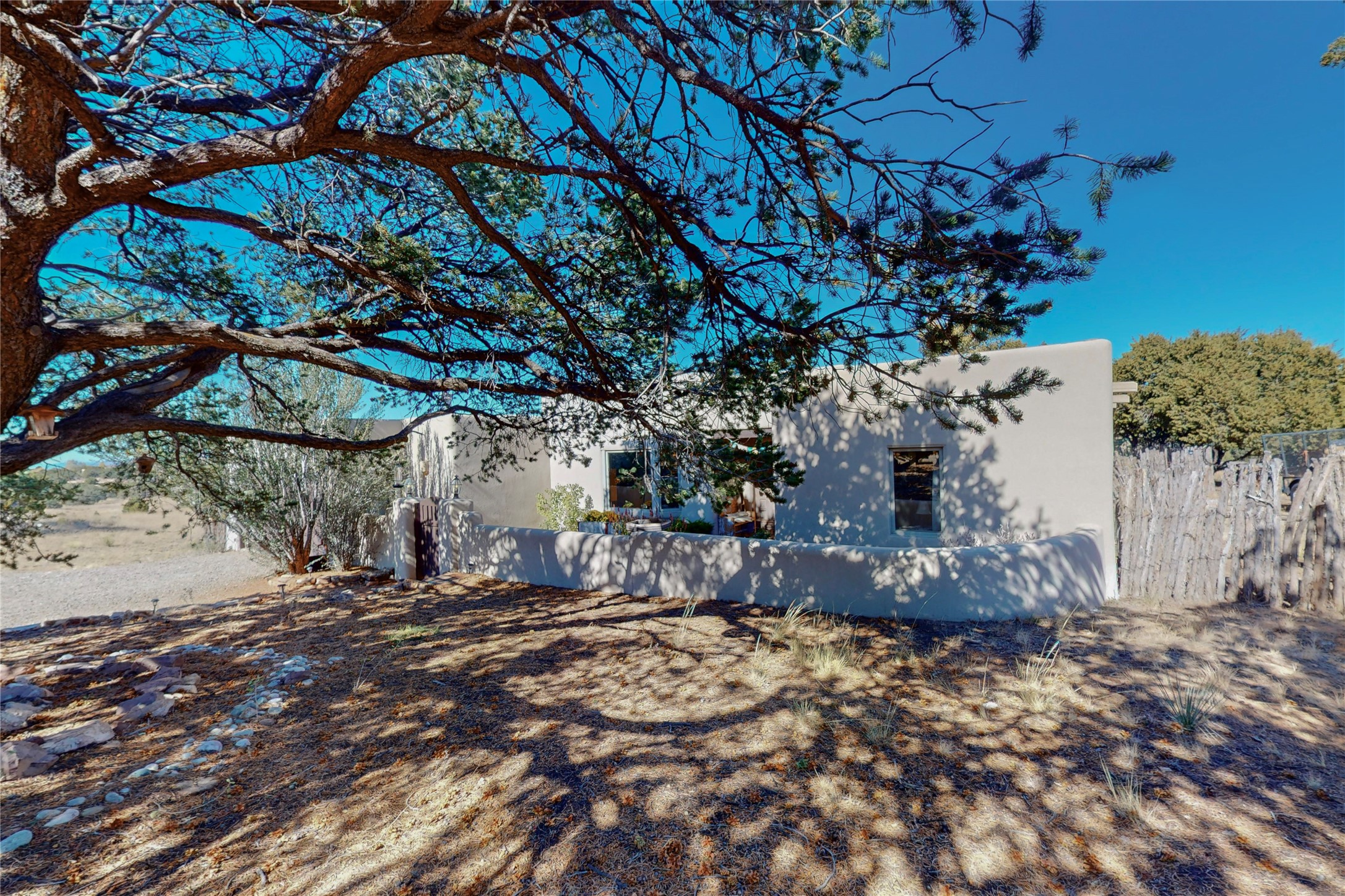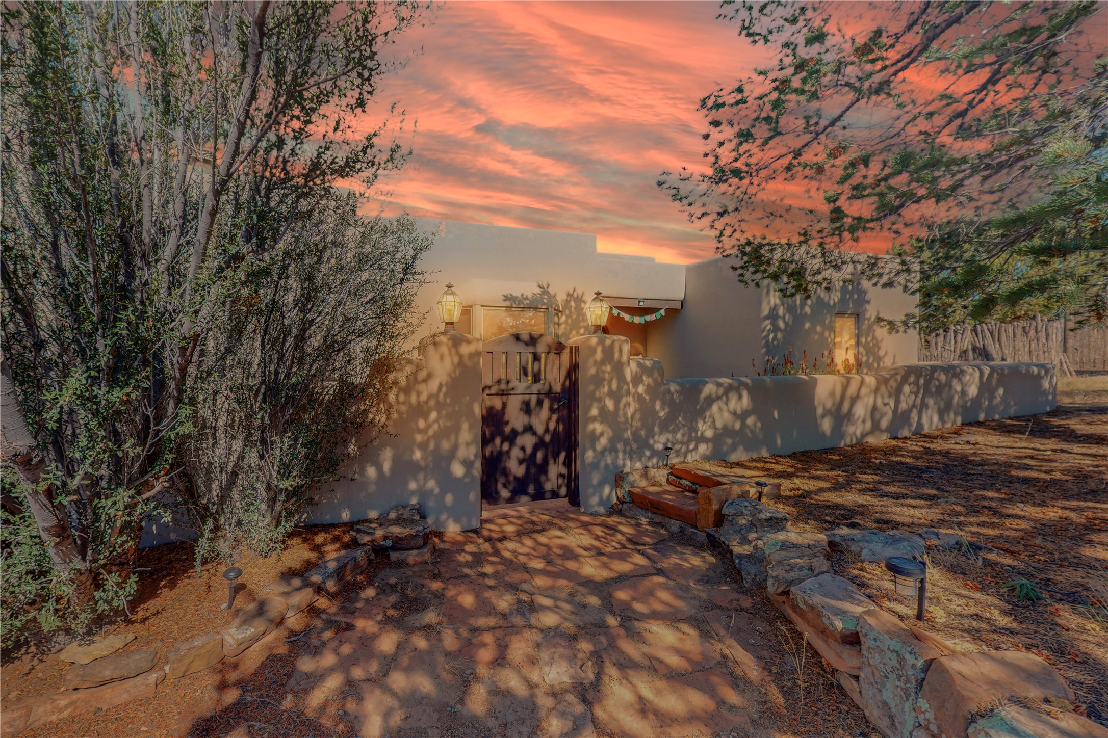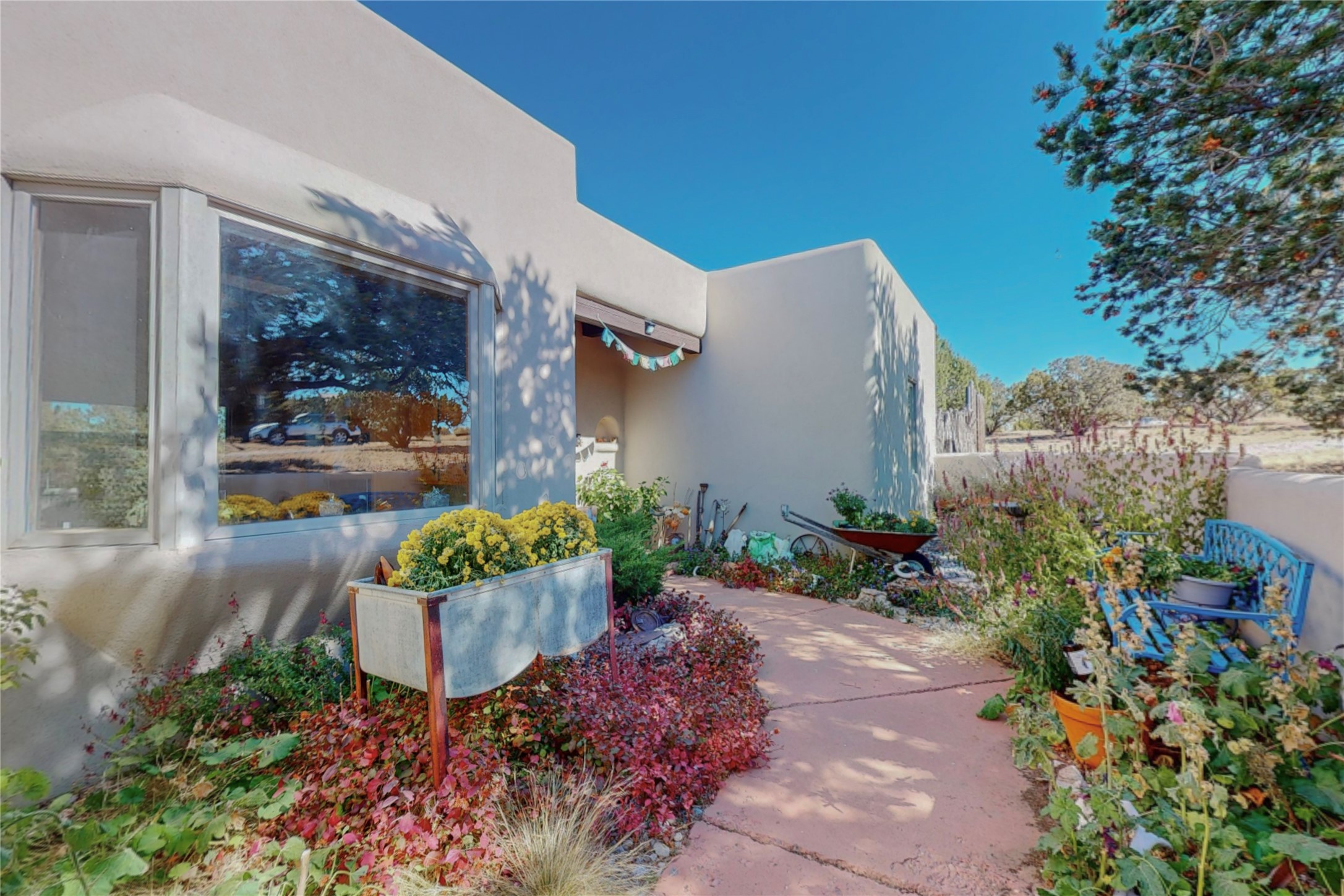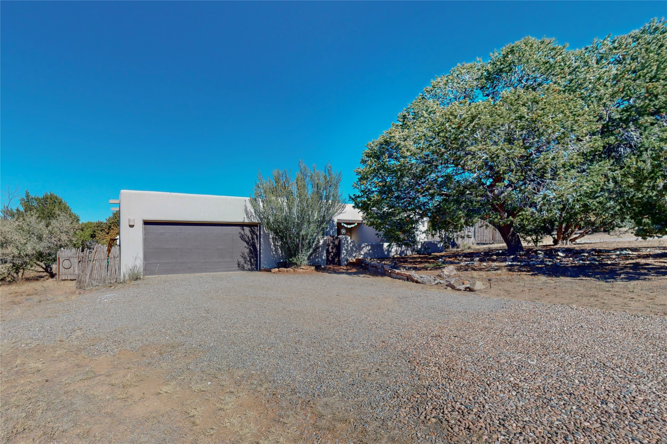 A wonderful home to come home to, custom built by Tom Yoder and lovingly looked after both inside and the surrounding gardens. A privately walled landscaped courtyard entry beckons you in to an impressive foyer, mind the step - you may not look down awed by the Santa Fe style architectural features that delight the eye. A large country kitchen equipped with a professional Thermador cooktop, double ovens and a farmhouse sink and wow what a lovely bay window kitchen view. Gleaming Saltillo tile floors and high ceilings throughout add to a spaciousness yet cosy feel. In 2014 a new roof which was upgraded with a 2 year warranty in 2023. In 2015 the boiler was replaced, in 2017 a new hot water heater, and in 2022 mini splits were added. The natural gas radiant heating system has been inspected, found to be Entran 3 and currently working fine. This year the stucco, canales, and windows all repaired. Washer and dryer replaced in 2016 and kitchen appliances were upgraded in 2021. Even the drip irrigation system was upgraded in 2013, 2 car garage plus a side approved parking area for an RV. Sitting on almost 1.5 acres bordered by a large greenbelt yet close to paved road with easy access to Eldorado amenities and local shopping this home is hard to beat.
