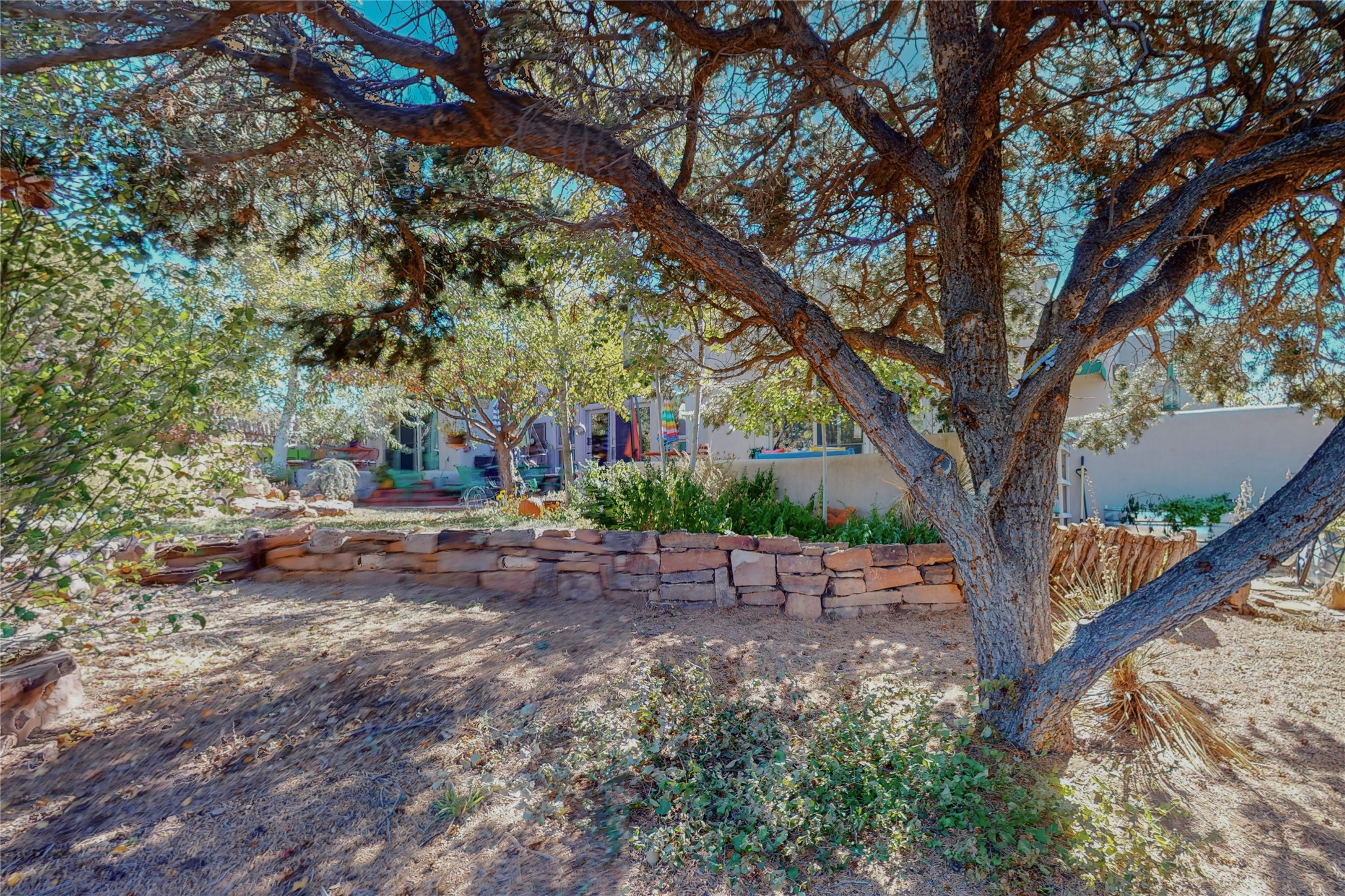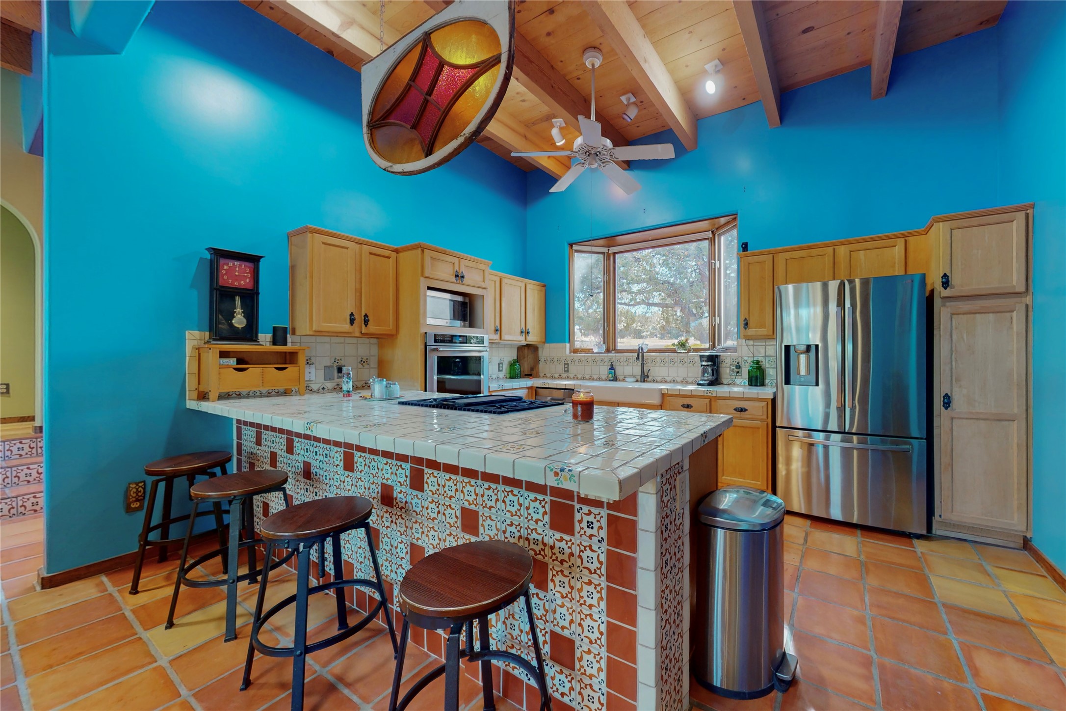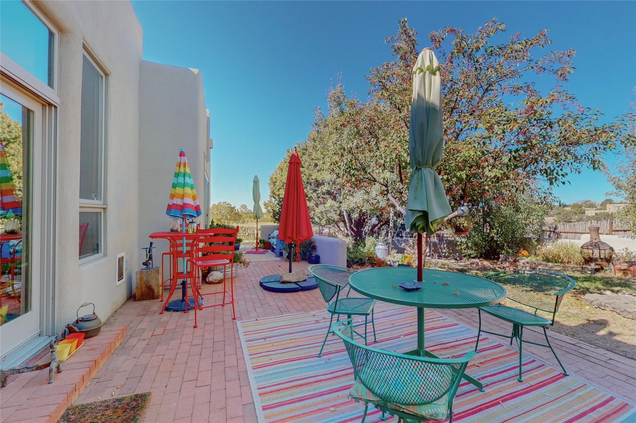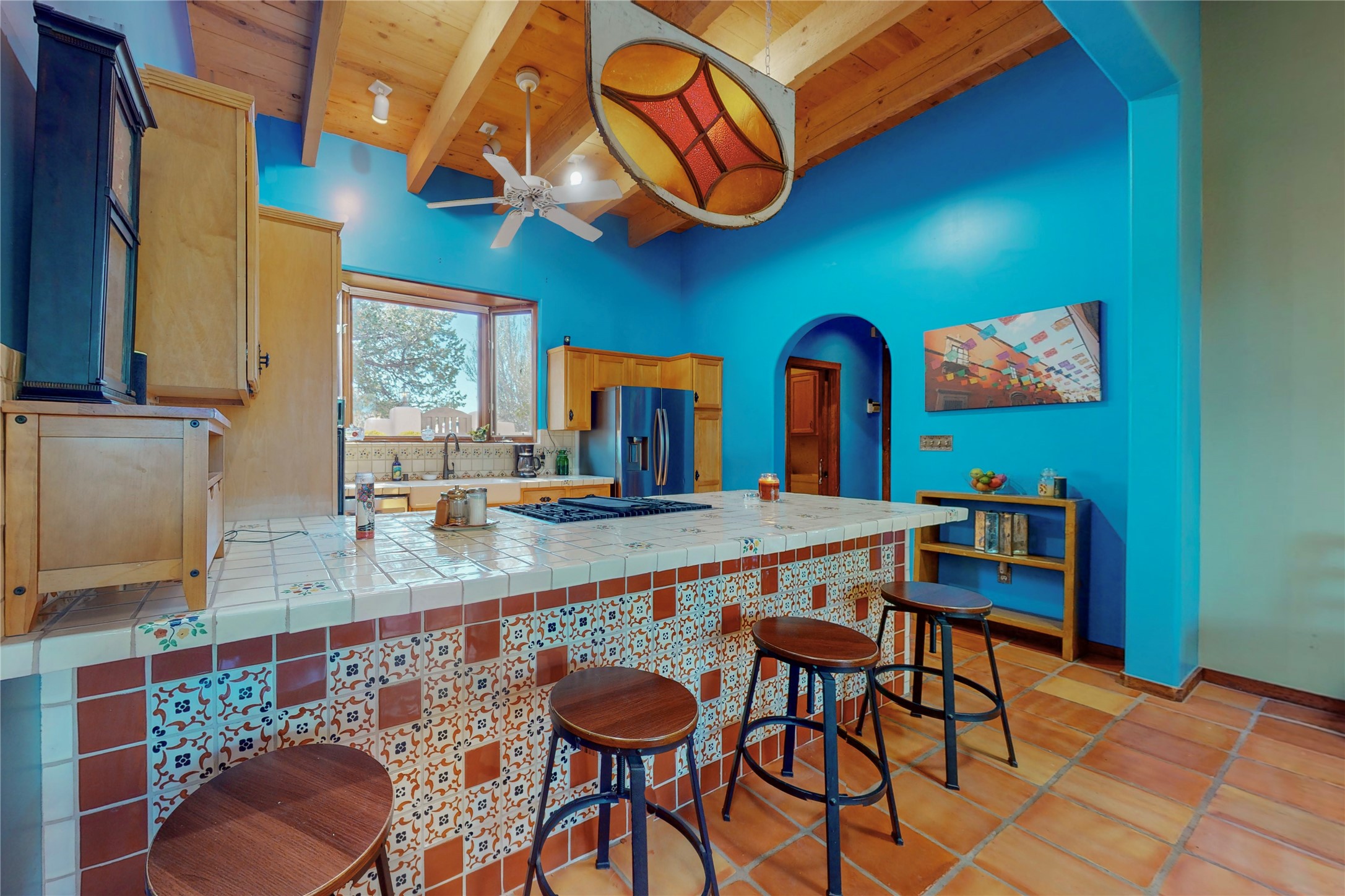 A wonderful home to come home to, custom built by Tom Yoder and lovingly looked after both inside and the surrounding gardens. A privately walled landscaped courtyard entry beckons you in to an impressive foyer, mind the step - you may not look down awed by the Santa Fe style architectural features that delight the eye. A large country kitchen equipped with a professional Thermador cooktop, double ovens and a farmhouse sink and wow what a lovely bay window kitchen view. Gleaming Saltillo tile floors and high ceilings throughout add to a spaciousness yet cosy feel. In 2014 a new roof which was upgraded with a 2 year warranty in 2023. In 2015 the boiler was replaced, in 2017 a new hot water heater, and in 2022 mini splits were added. The natural gas radiant heating system has been inspected, found to be Entran 3 and currently working fine. This year the stucco, canales, and windows all repaired. Washer and dryer replaced in 2016 and kitchen appliances were upgraded in 2021. Even the drip irrigation system was upgraded in 2013, 2 car garage plus a side approved parking area for an RV. Sitting on almost 1.5 acres bordered by a large greenbelt yet close to paved road with easy access to Eldorado amenities and local shopping this home is hard to beat.