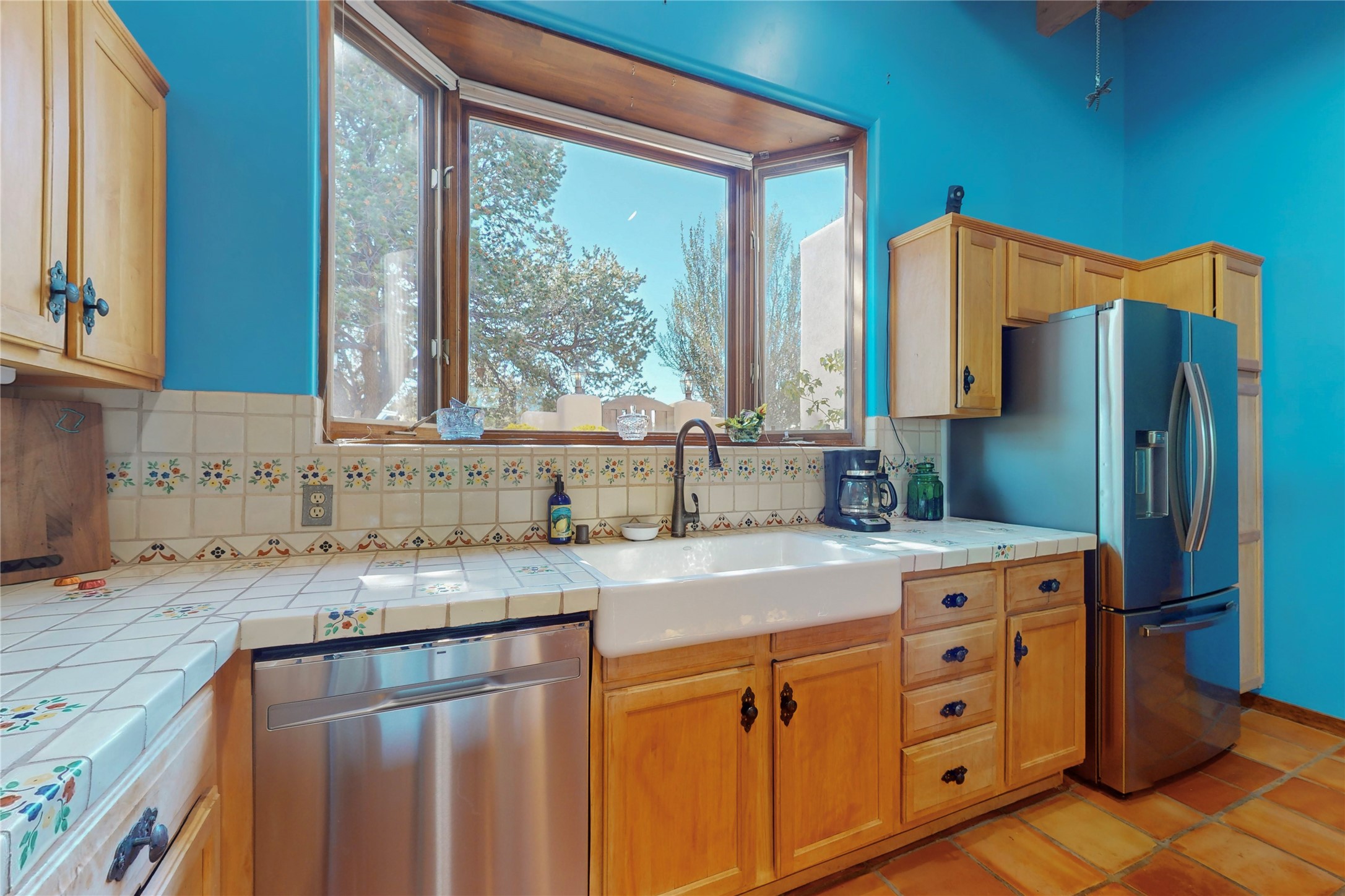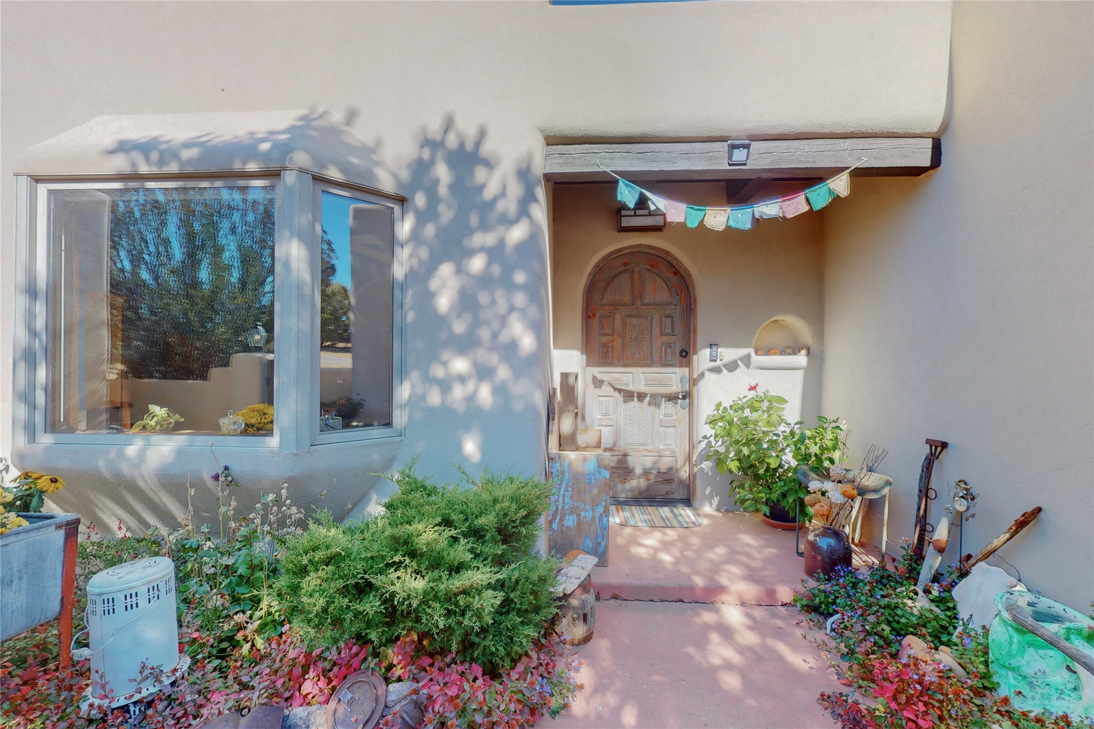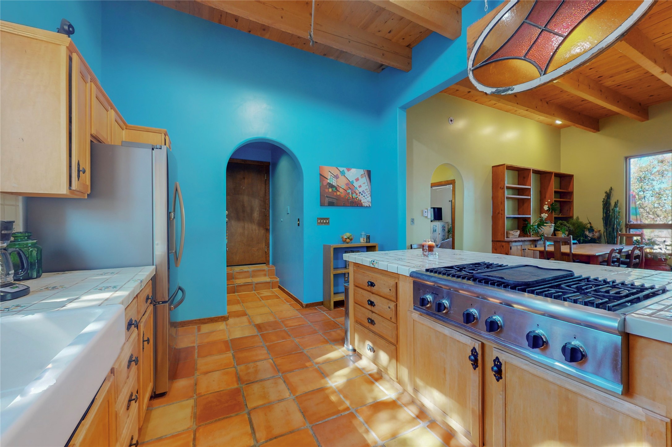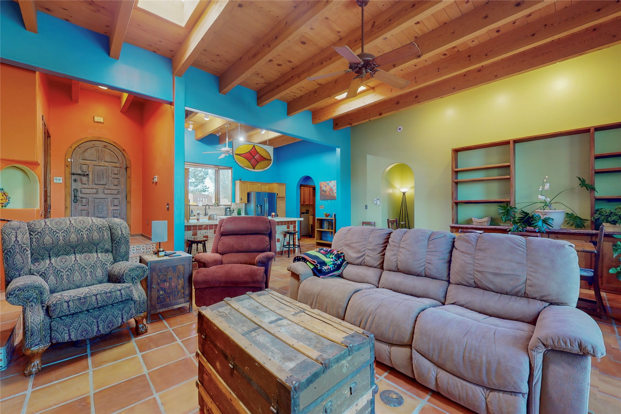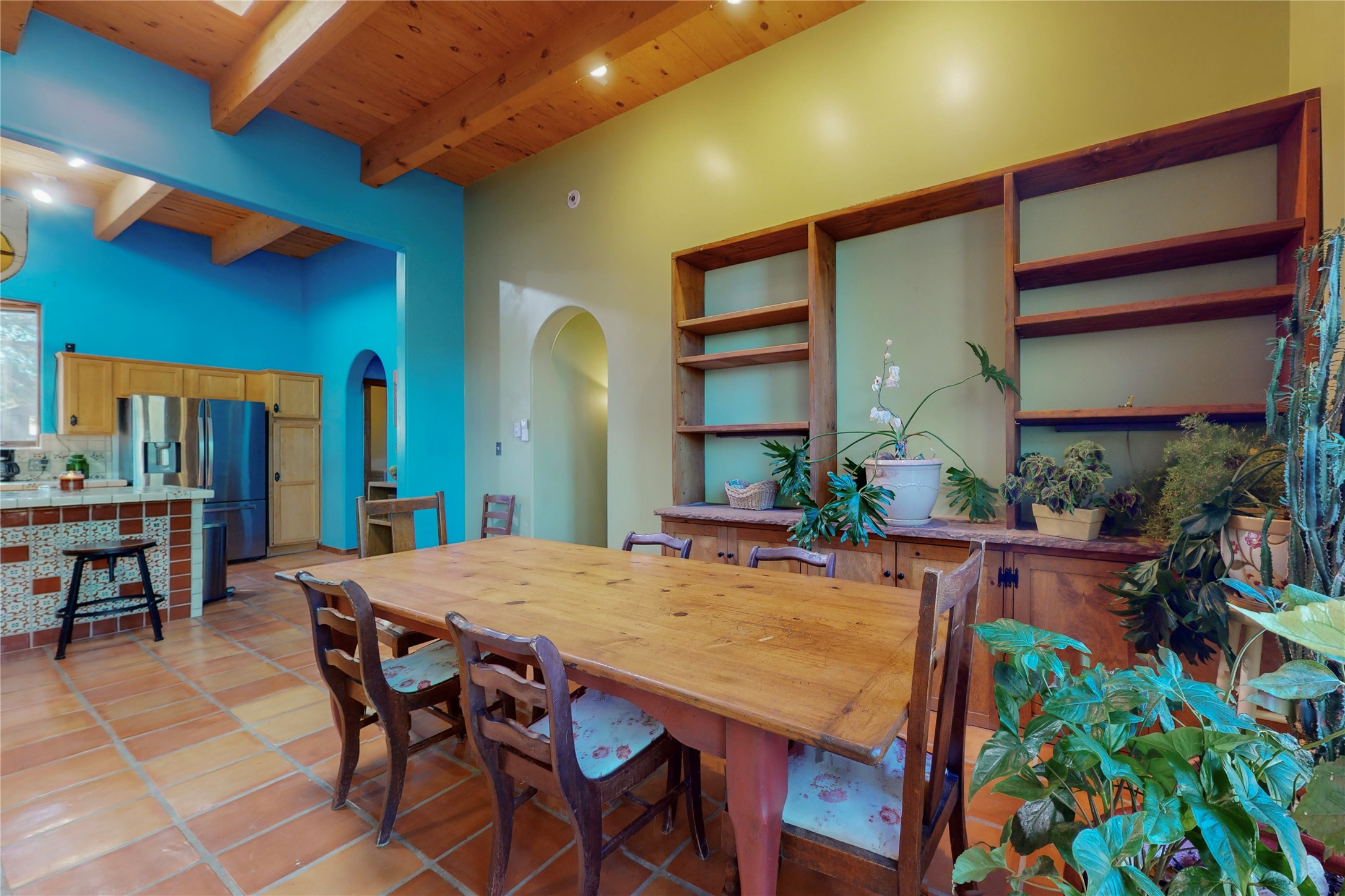 A wonderful home to come home to, custom built by Tom Yoder and lovingly looked after both inside and the surrounding gardens. A privately walled landscaped courtyard entry beckons you in to an impressive foyer, mind the step - you may not look down awed by the Santa Fe style architectural features that delight the eye. A large country kitchen equipped with a professional Thermador cooktop, double ovens and a farmhouse sink and wow what a lovely bay window kitchen view. Gleaming Saltillo tile floors and high ceilings throughout add to a spaciousness yet cosy feel. In 2014 a new roof which was upgraded with a 2 year warranty in 2023. In 2015 the boiler was replaced, in 2017 a new hot water heater, and in 2022 mini splits were added. The natural gas radiant heating system has been inspected, found to be Entran 3 and currently working fine. This year the stucco, canales, and windows all repaired. Washer and dryer replaced in 2016 and kitchen appliances were upgraded in 2021. Even the drip irrigation system was upgraded in 2013, 2 car garage plus a side approved parking area for an RV. Sitting on almost 1.5 acres bordered by a large greenbelt yet close to paved road with easy access to Eldorado amenities and local shopping this home is hard to beat.