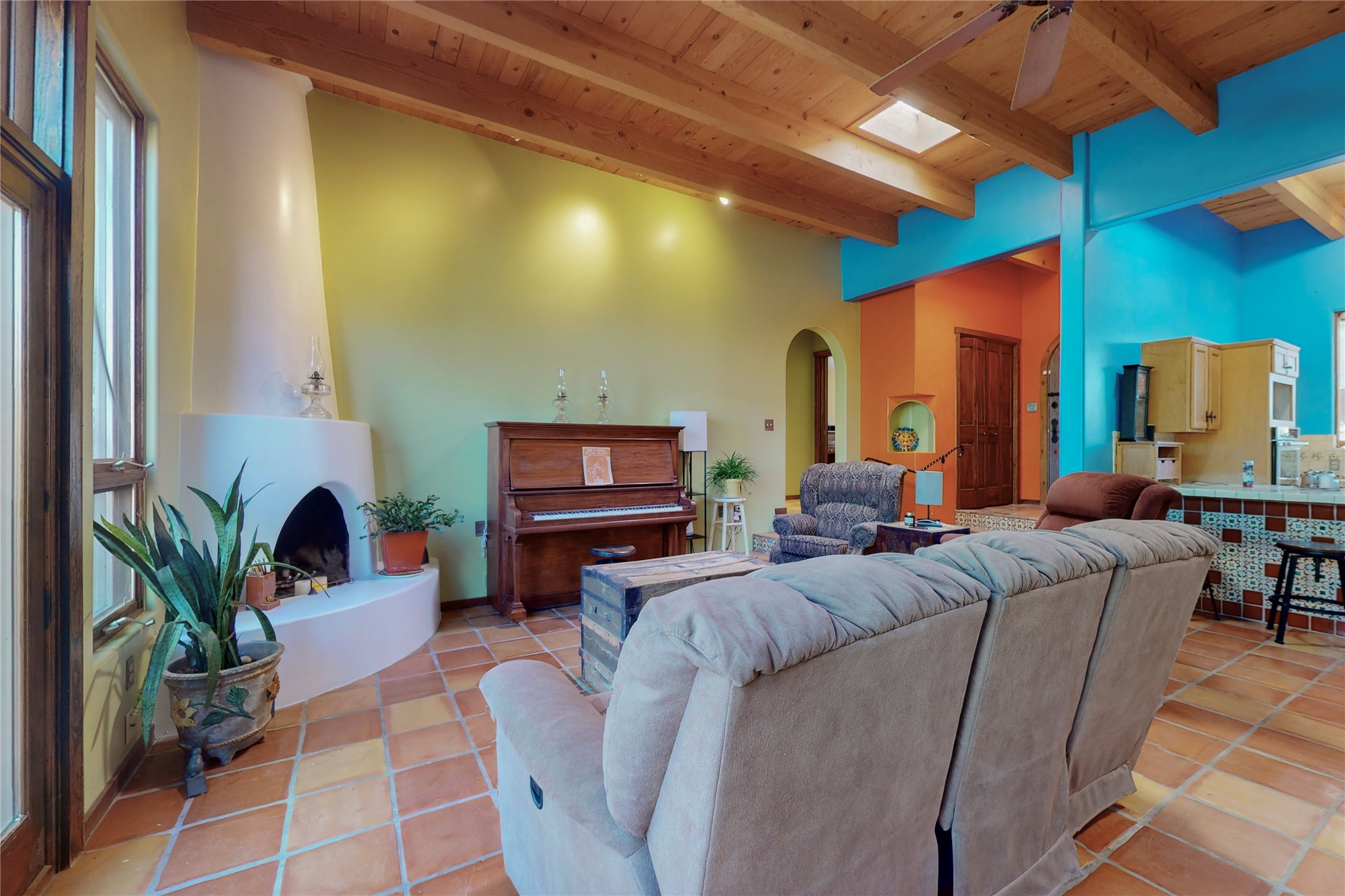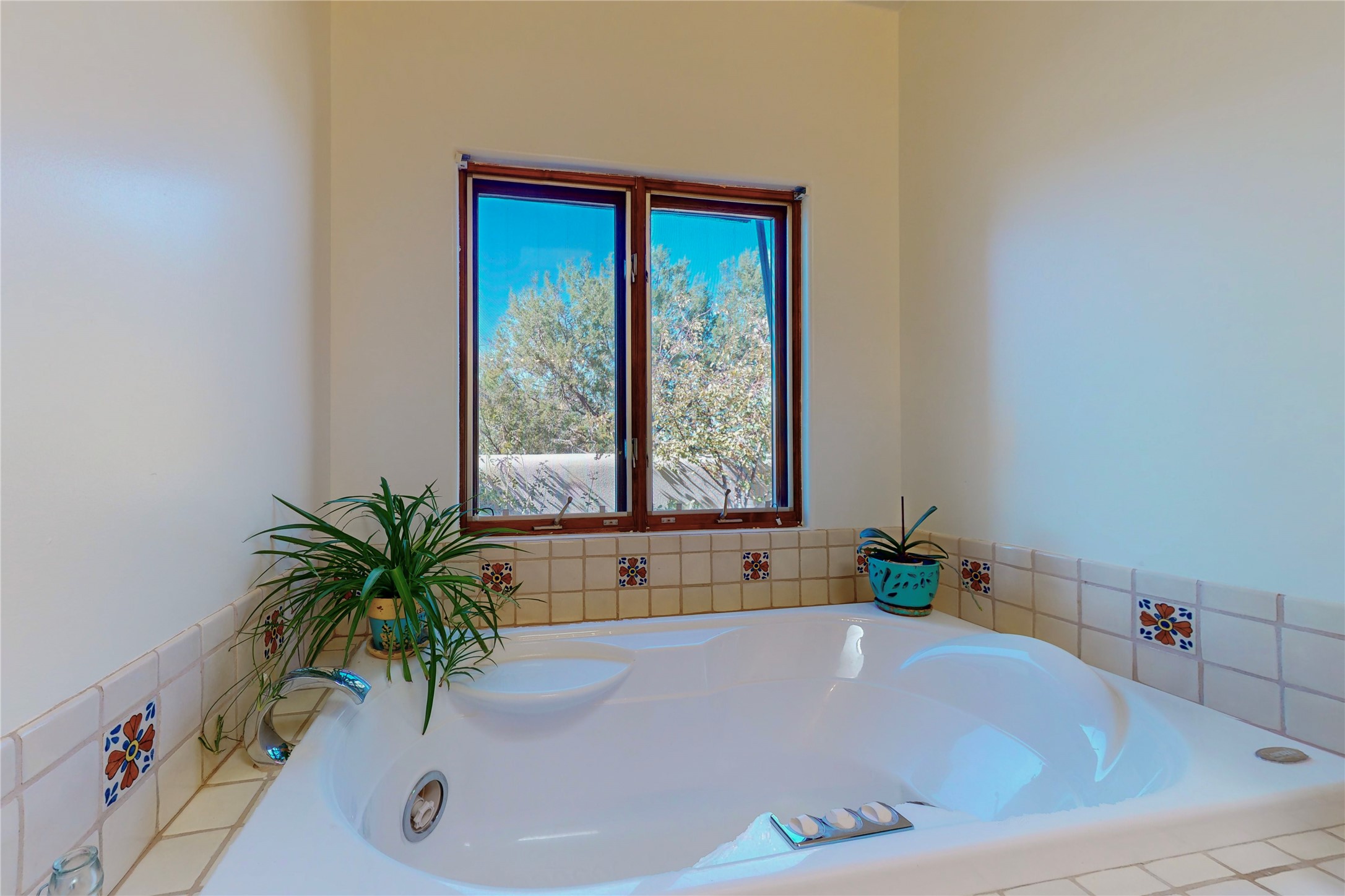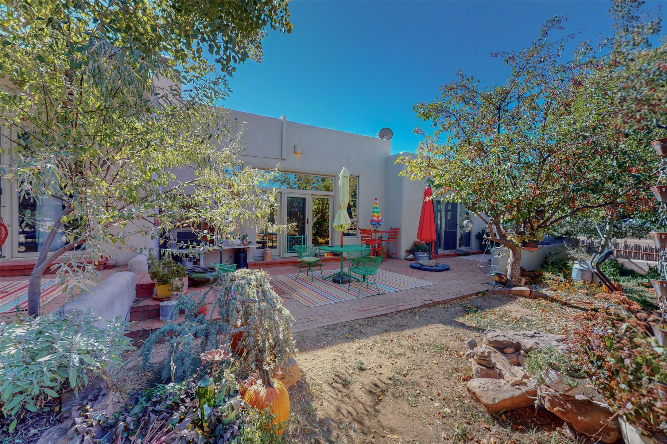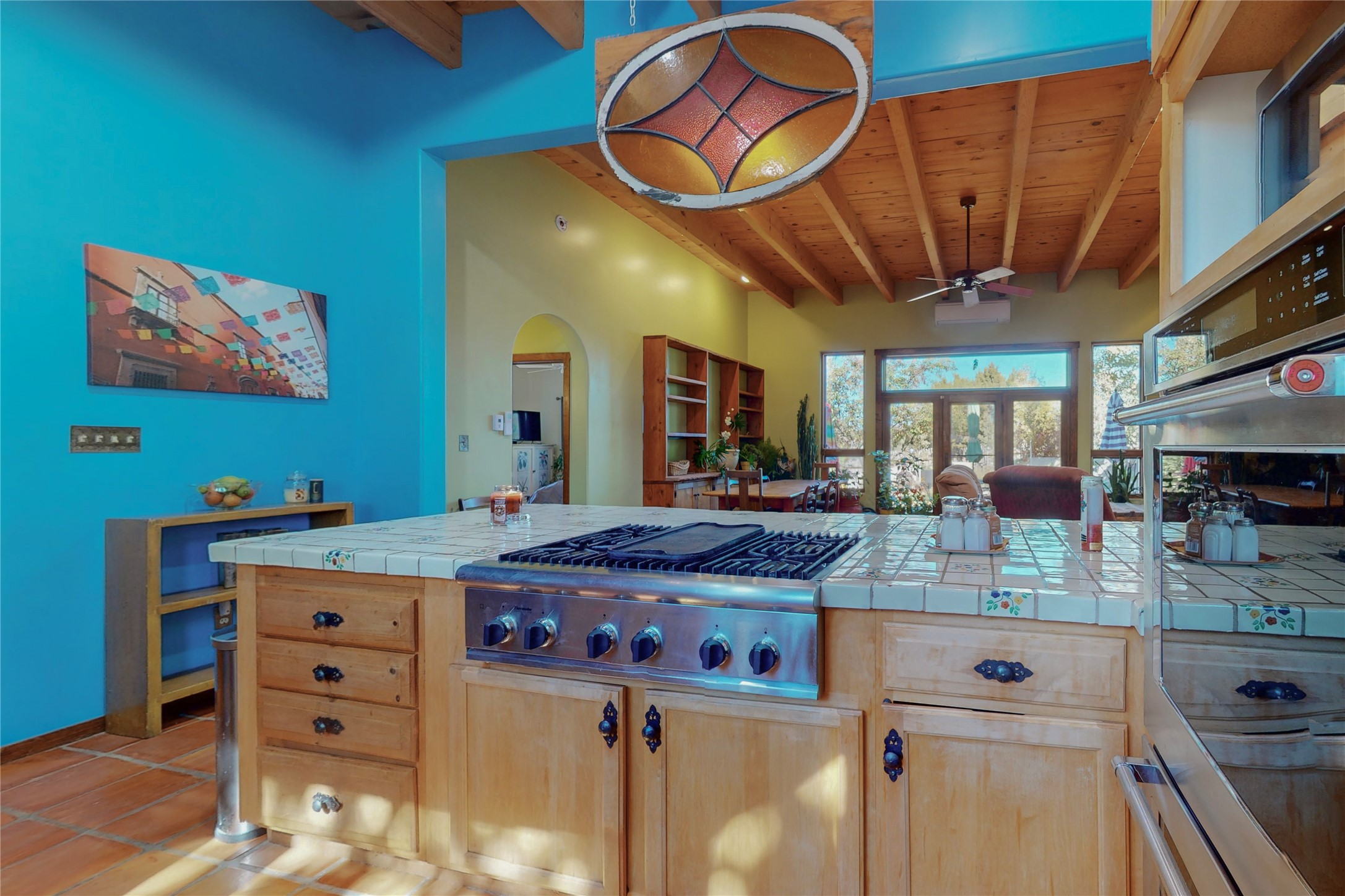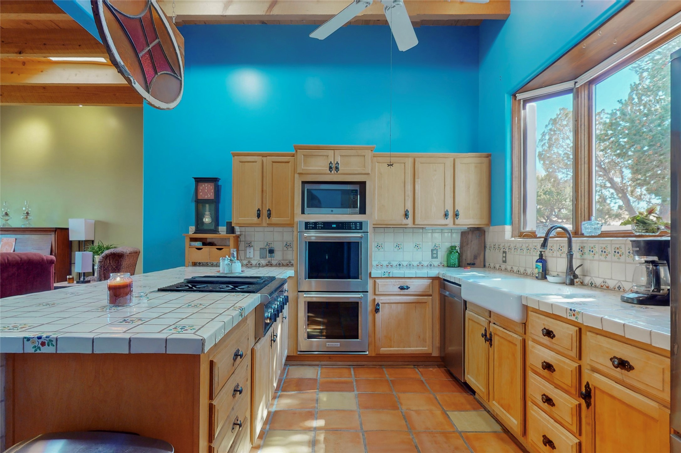 A wonderful home to come home to, custom built by Tom Yoder and lovingly looked after both inside and the surrounding gardens. A privately walled landscaped courtyard entry beckons you in to an impressive foyer, mind the step - you may not look down awed by the Santa Fe style architectural features that delight the eye. A large country kitchen equipped with a professional Thermador cooktop, double ovens and a farmhouse sink and wow what a lovely bay window kitchen view. Gleaming Saltillo tile floors and high ceilings throughout add to a spaciousness yet cosy feel. In 2014 a new roof which was upgraded with a 2 year warranty in 2023. In 2015 the boiler was replaced, in 2017 a new hot water heater, and in 2022 mini splits were added. The natural gas radiant heating system has been inspected, found to be Entran 3 and currently working fine. This year the stucco, canales, and windows all repaired. Washer and dryer replaced in 2016 and kitchen appliances were upgraded in 2021. Even the drip irrigation system was upgraded in 2013, 2 car garage plus a side approved parking area for an RV. Sitting on almost 1.5 acres bordered by a large greenbelt yet close to paved road with easy access to Eldorado amenities and local shopping this home is hard to beat.