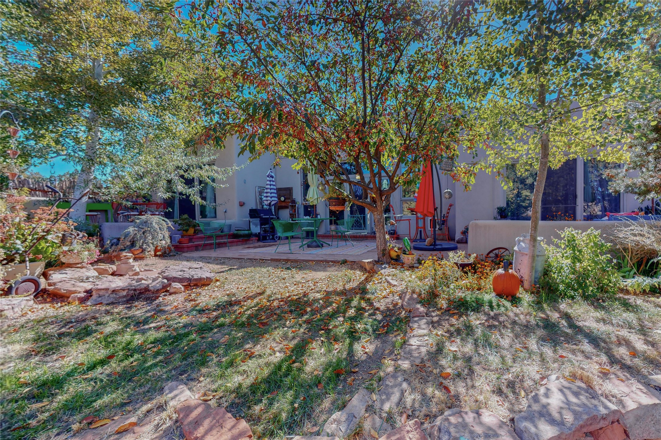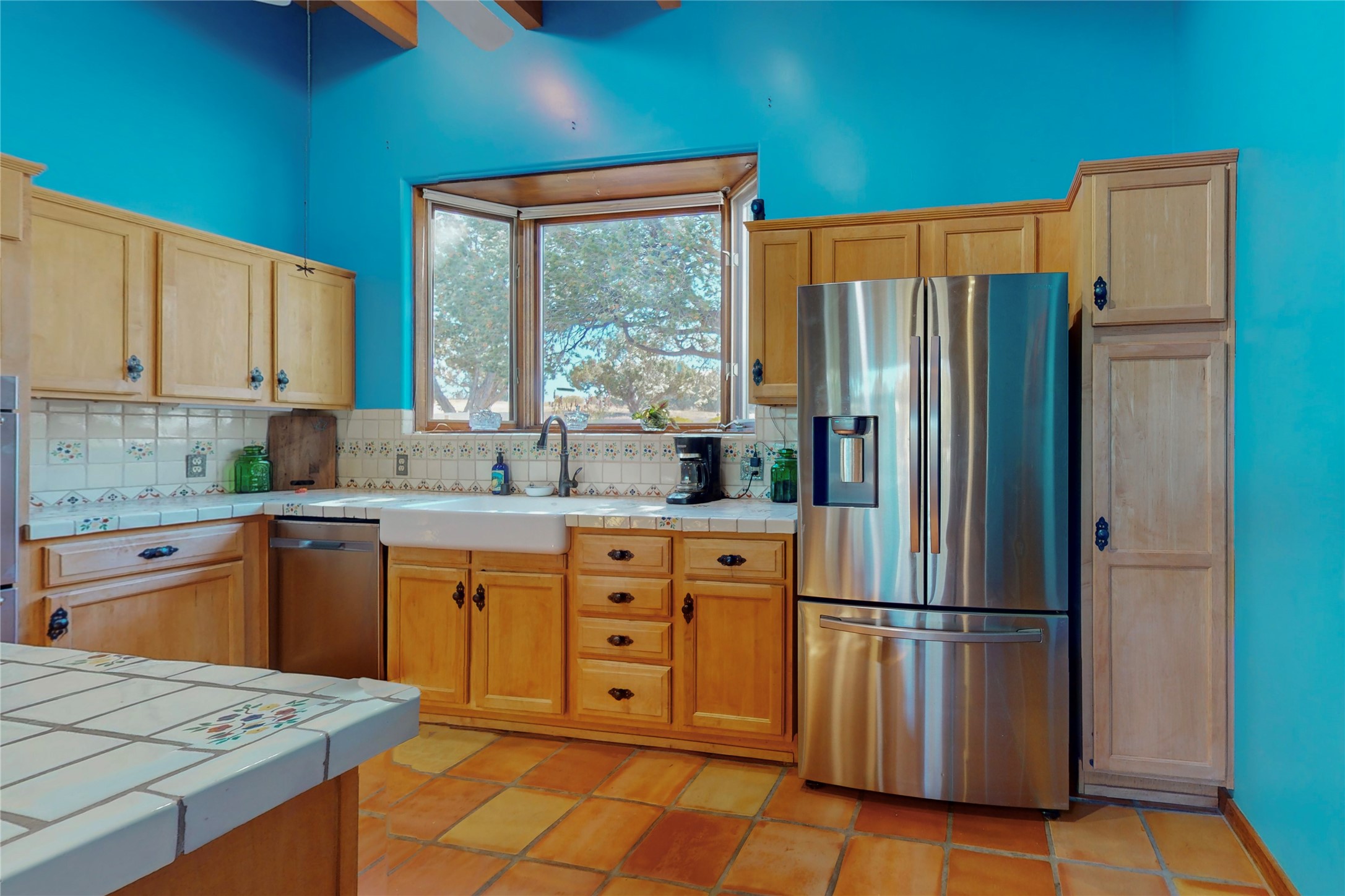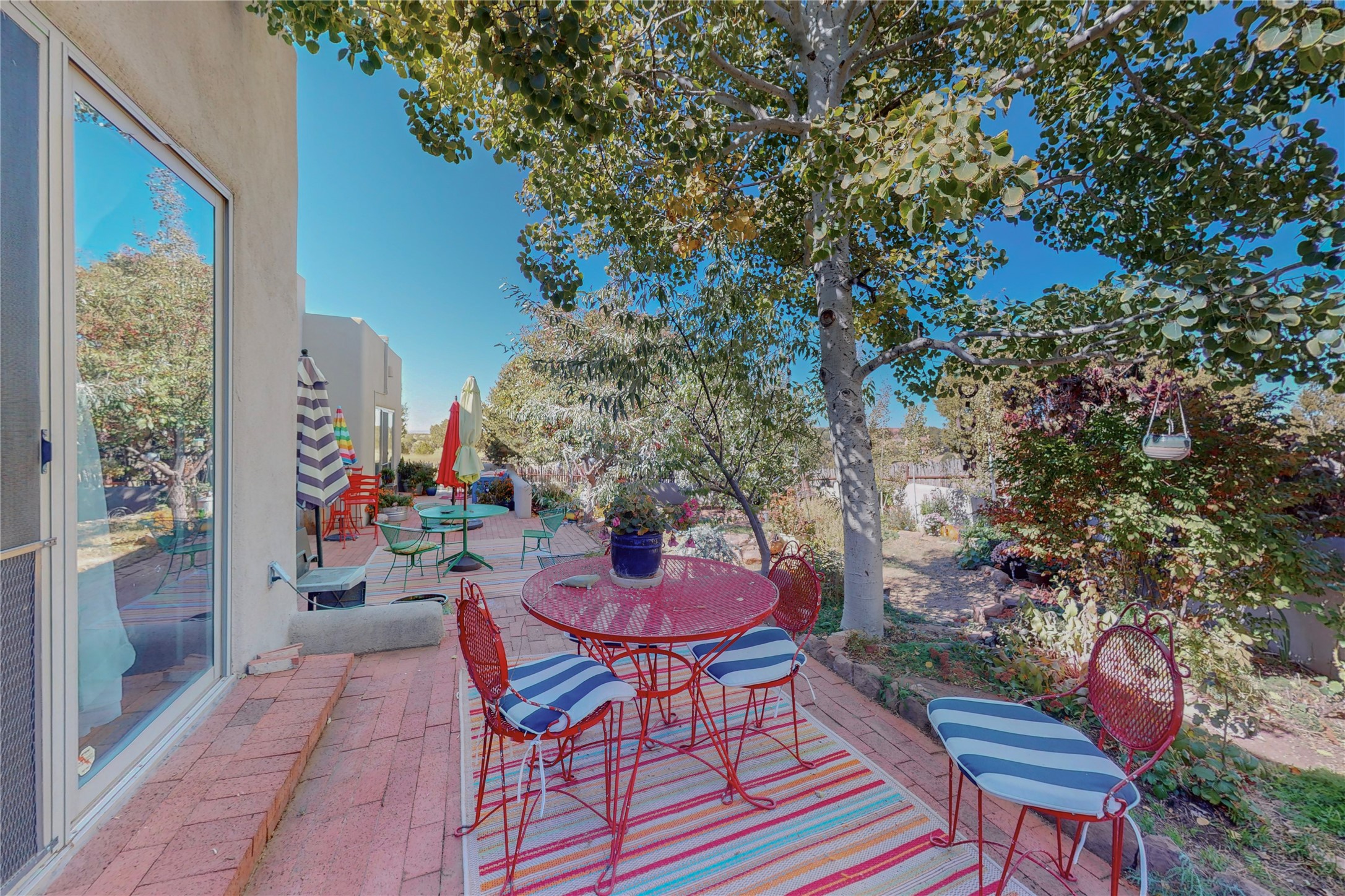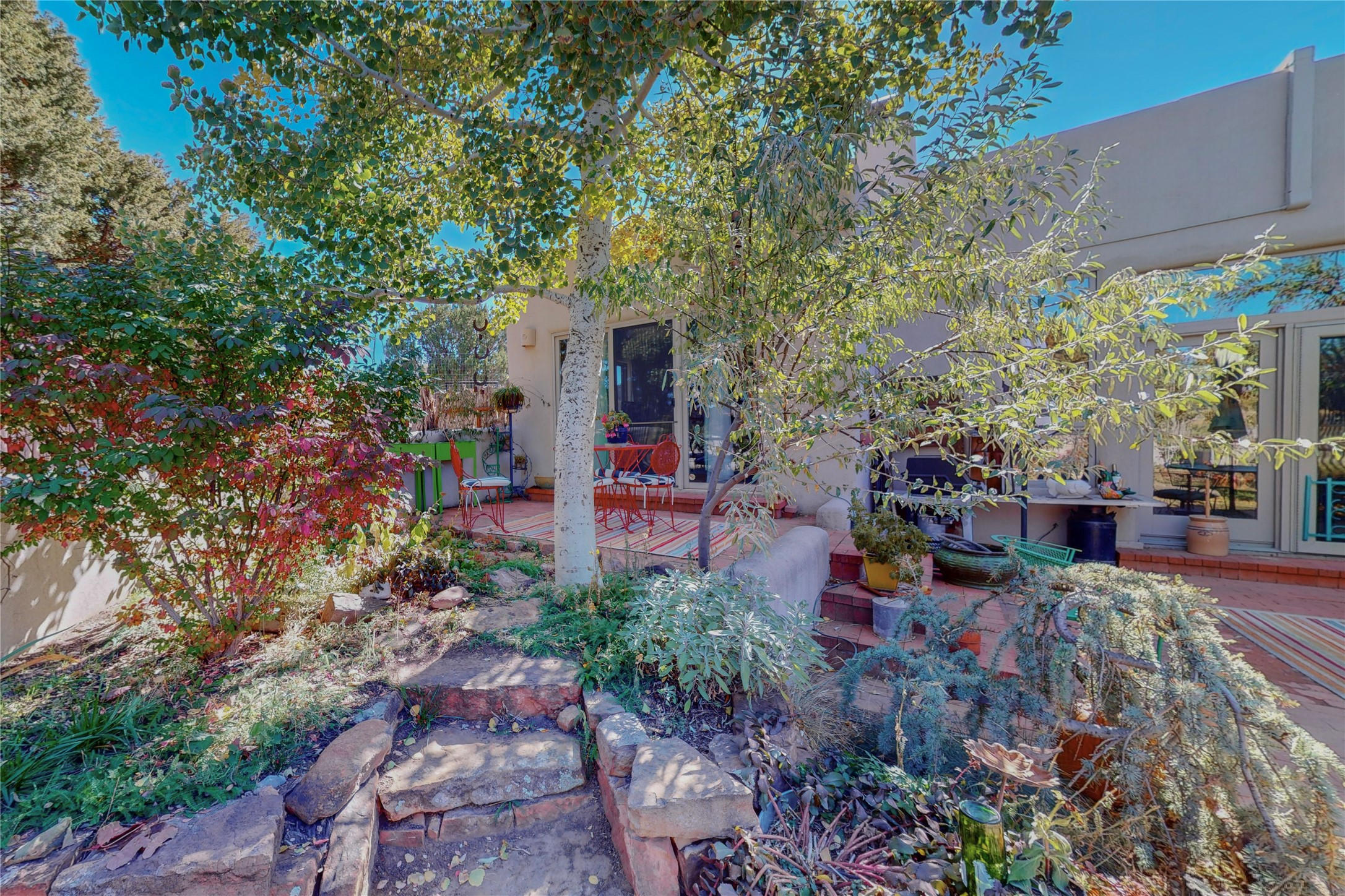 A wonderful home to come home to, custom built by Tom Yoder and lovingly looked after both inside and the surrounding gardens. A privately walled landscaped courtyard entry beckons you in to an impressive foyer, mind the step - you may not look down awed by the Santa Fe style architectural features that delight the eye. A large country kitchen equipped with a professional Thermador cooktop, double ovens and a farmhouse sink and wow what a lovely bay window kitchen view. Gleaming Saltillo tile floors and high ceilings throughout add to a spaciousness yet cosy feel. In 2014 a new roof which was upgraded with a 2 year warranty in 2023. In 2015 the boiler was replaced, in 2017 a new hot water heater, and in 2022 mini splits were added. The natural gas radiant heating system has been inspected, found to be Entran 3 and currently working fine. This year the stucco, canales, and windows all repaired. Washer and dryer replaced in 2016 and kitchen appliances were upgraded in 2021. Even the drip irrigation system was upgraded in 2013, 2 car garage plus a side approved parking area for an RV. Sitting on almost 1.5 acres bordered by a large greenbelt yet close to paved road with easy access to Eldorado amenities and local shopping this home is hard to beat.
