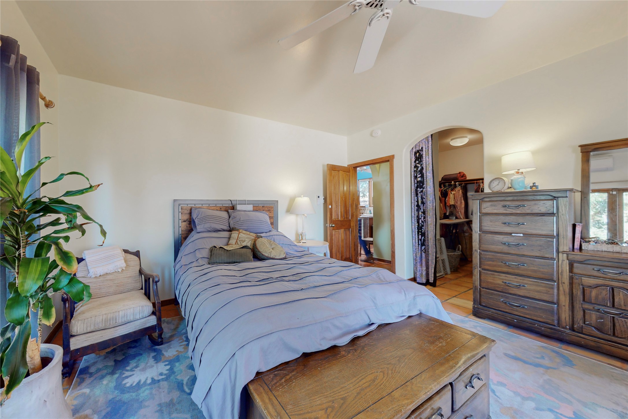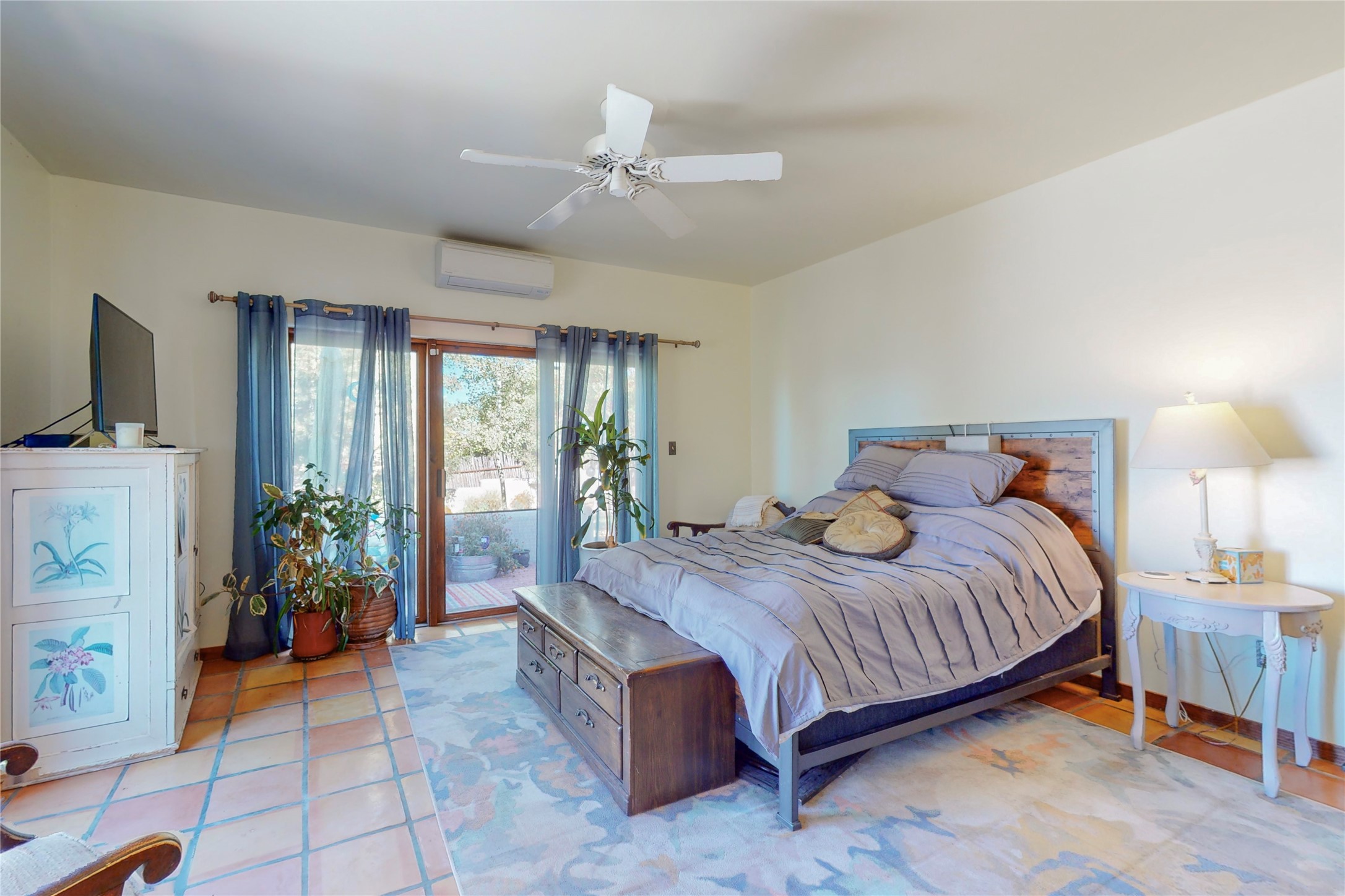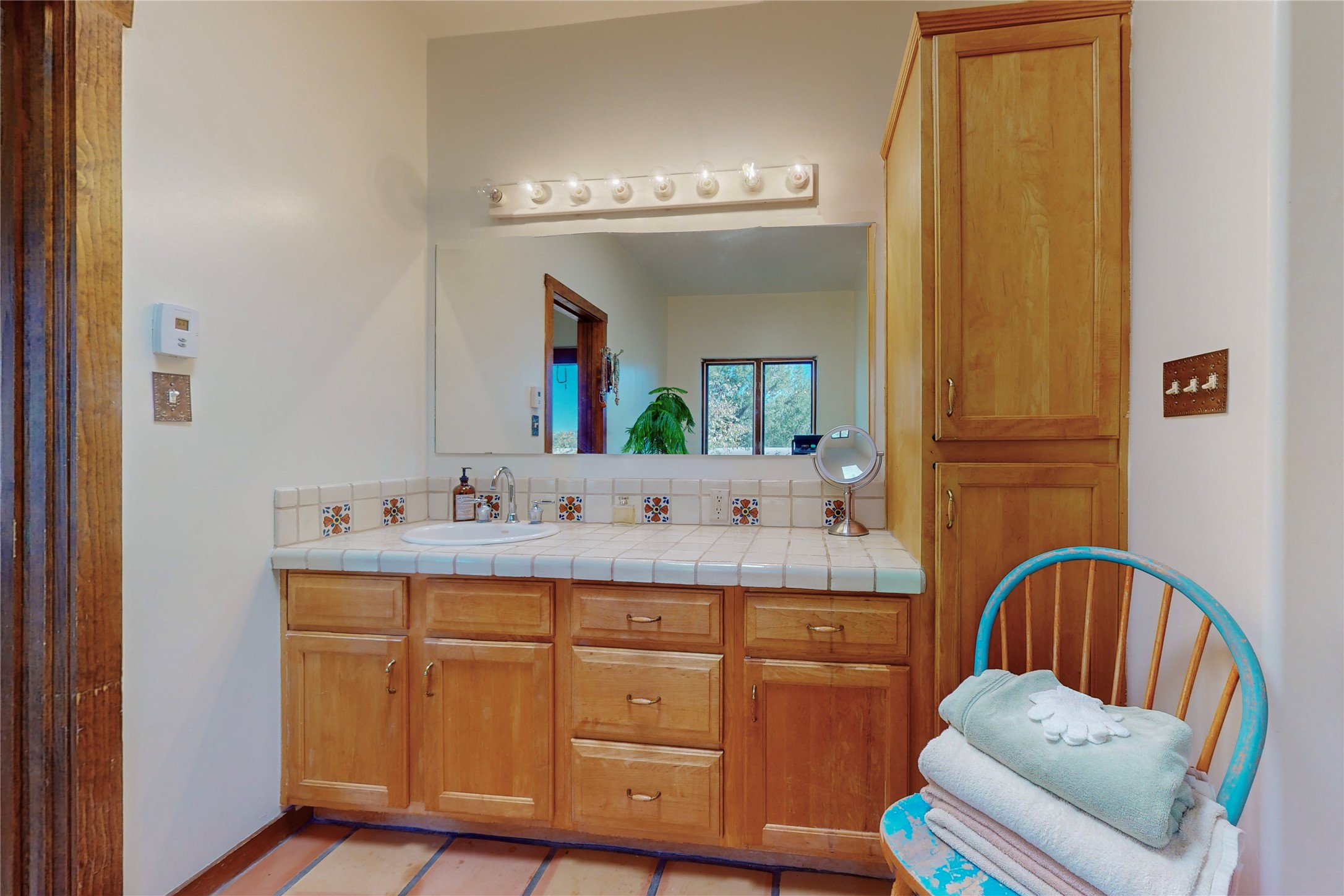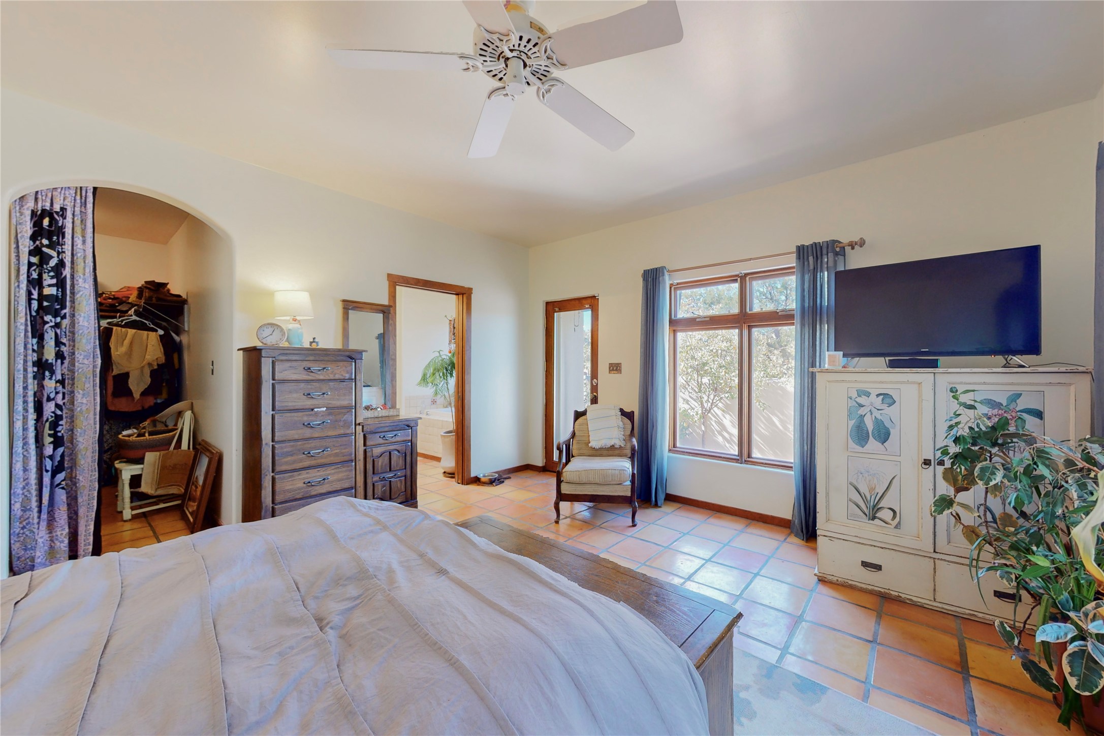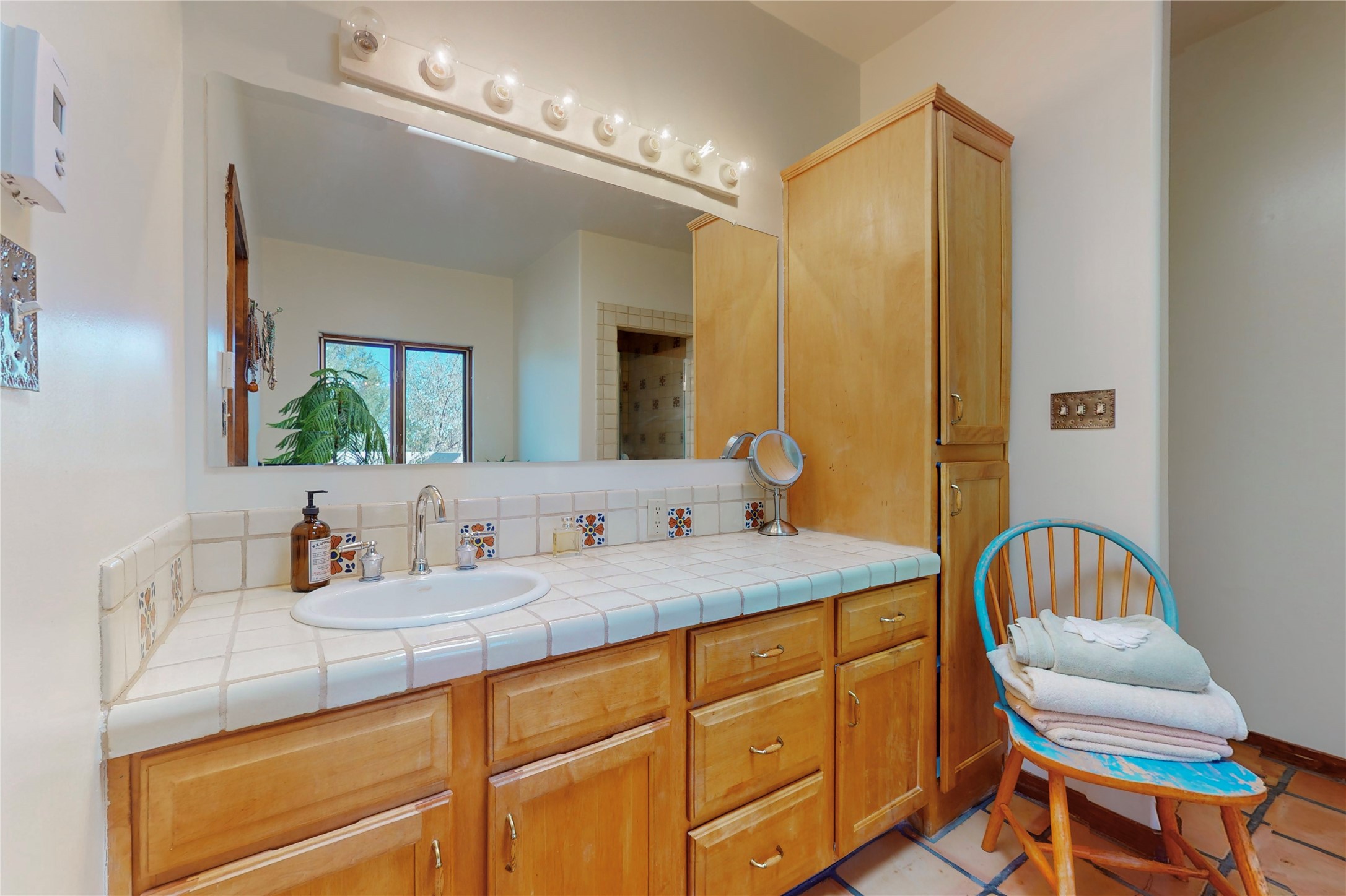 A wonderful home to come home to, custom built by Tom Yoder and lovingly looked after both inside and the surrounding gardens. A privately walled landscaped courtyard entry beckons you in to an impressive foyer, mind the step - you may not look down awed by the Santa Fe style architectural features that delight the eye. A large country kitchen equipped with a professional Thermador cooktop, double ovens and a farmhouse sink and wow what a lovely bay window kitchen view. Gleaming Saltillo tile floors and high ceilings throughout add to a spaciousness yet cosy feel. In 2014 a new roof which was upgraded with a 2 year warranty in 2023. In 2015 the boiler was replaced, in 2017 a new hot water heater, and in 2022 mini splits were added. The natural gas radiant heating system has been inspected, found to be Entran 3 and currently working fine. This year the stucco, canales, and windows all repaired. Washer and dryer replaced in 2016 and kitchen appliances were upgraded in 2021. Even the drip irrigation system was upgraded in 2013, 2 car garage plus a side approved parking area for an RV. Sitting on almost 1.5 acres bordered by a large greenbelt yet close to paved road with easy access to Eldorado amenities and local shopping this home is hard to beat.
