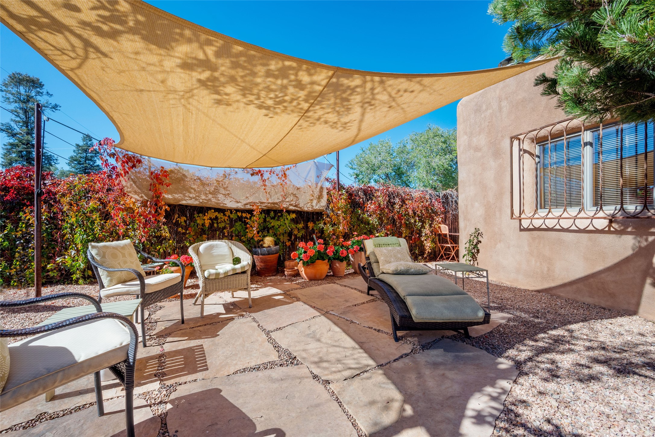 Charming original Pueblo-style condo in the Westside Guadalupe Historic District, 1 bedroom 1 bath with small den/workspace. A special historic property remodeled and upgraded in 2008, excellent location close to Santa Fe Plaza, and the Railyard with Santa Fe Farmers' Market. Entrance has stone wall and 6ft high coyote fence covered with Virginia creepers that surrounds the entire property. Enter to the serene and private flagstone and gravel garden with Aspens, Bosnian Pine, Roses, Lilacs and Russian Sage, and shade sails for outdoor dining and leisure. Automated irrigation watering system, door and windows have decorative security ironwork, and ADT installed. The entry portal has a water fountain, and traditional vigas that continue into the kitchen that has a gas range/oven, refrigerator, 2021 washer and dryer, and Mexican tile counter space. There are brick floors throughout the home, and the ceilings are broad plank rough-cut pine. The living-dining room has west and south facing windows, a traditional working Kiva fireplace appointed with Mexican tile, and a skylight over the dining area. The bedroom has a wall-to-wall closet. The full-bath has a tub-shower with sliding glass doors, a ceiling heater, and a small window. The den/workspace has a window in the deep walls that are traditional in original adobe structures. There is on street parking in this private neighborhood with residential parking only and a non-fee decal permit in addition to guest permits.