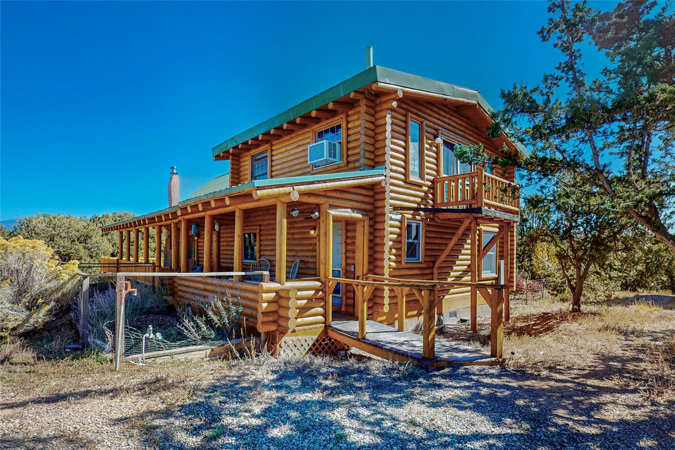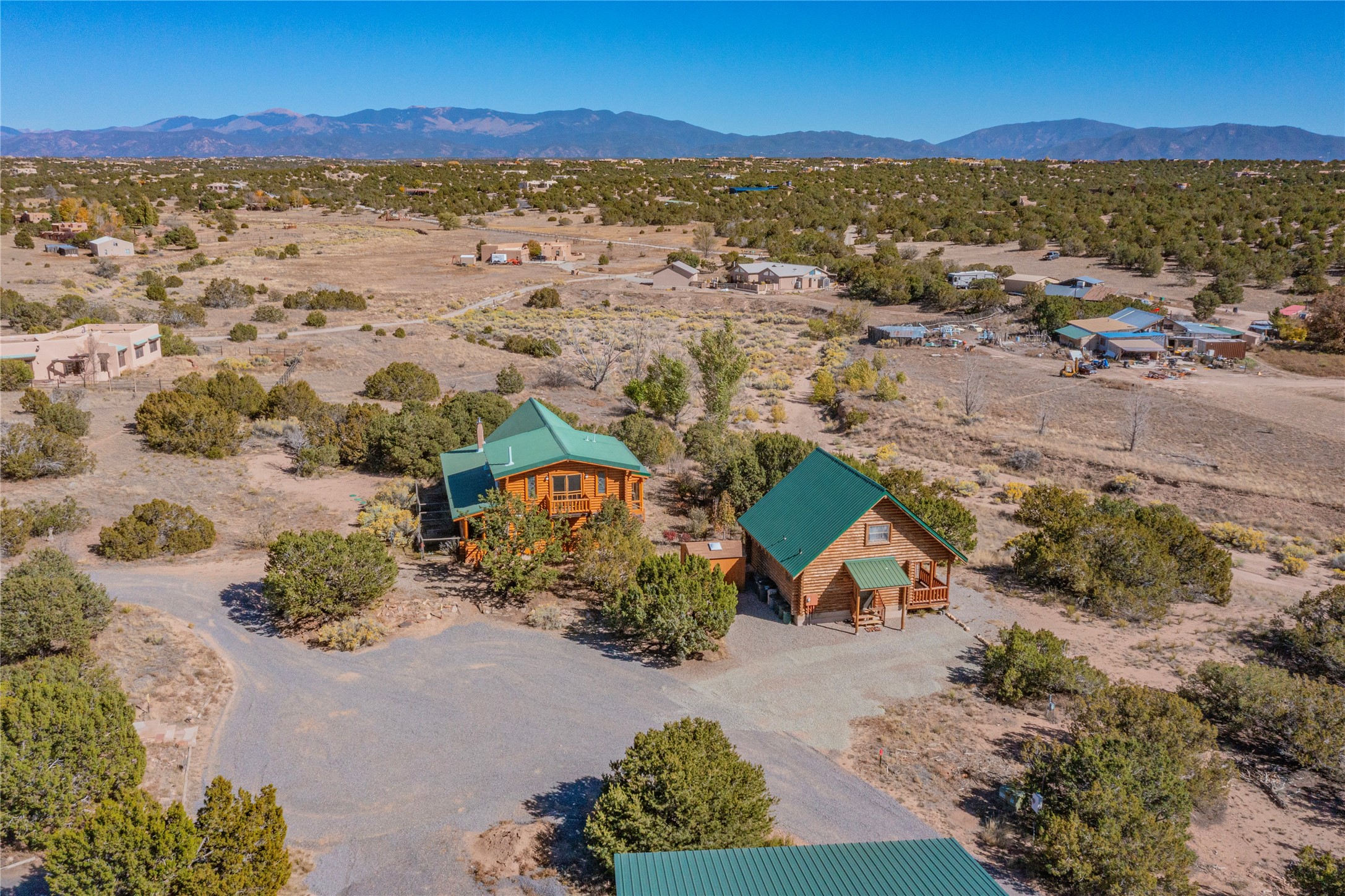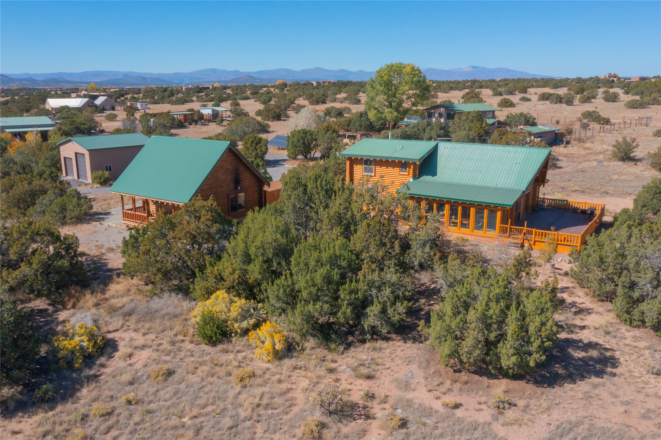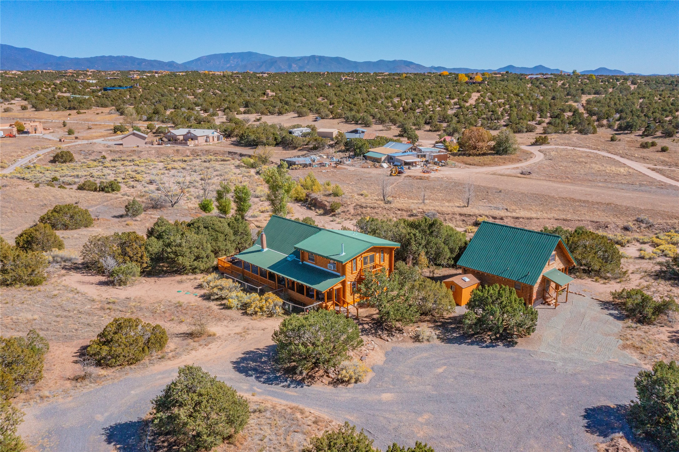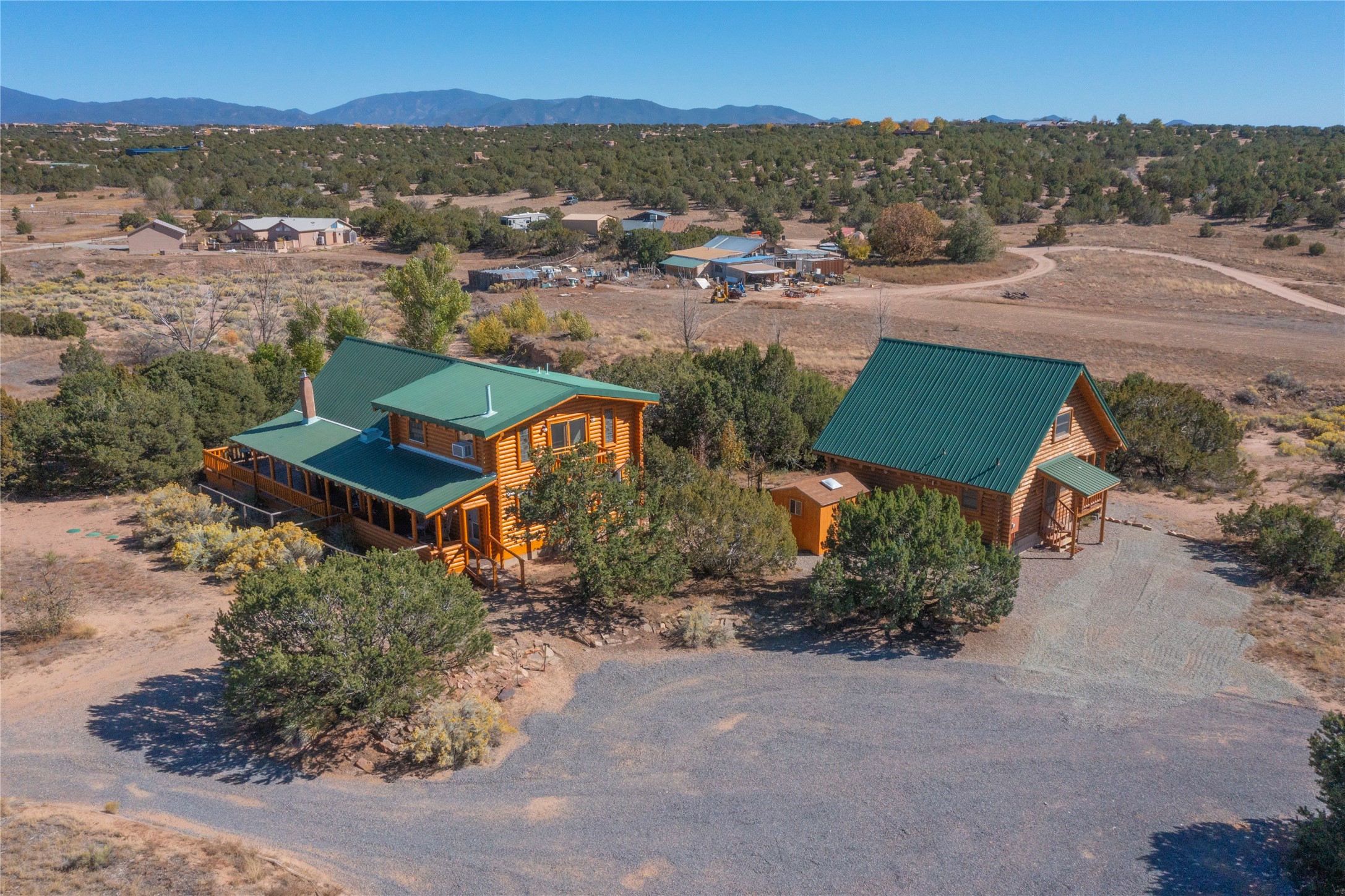 Discover this fantastic take on a large, modern custom log house and detached log guest house in beautiful La Tierra, Santa Fe. Nestled at the end of the famed Arroyo Calabasas Road, this combined 4 bedroom/ 3 bathroom, 2.5-acre property sits atop a hill with 360-degree mountain views and highlights new and old Santa Fe with horse farms, dirt roads, and fields of summer wildflowers. Rural yet only 10 minutes from downtown Santa Fe, the house is perfect for impressive entertaining in all 4 seasons with its sprawling open floor plan and huge back deck. Cozy yet spacious, the large modern kitchen overlooks the living room with high 2-story ceilings, floor-to-ceiling windows, exquisite wood detailing, and a stone fireplace. Three sets of French doors open to the wrap-around wood deck. The back stairs open to a lofted hallway and enclosed a large master bedroom and full bath, with the second bedroom and bathroom on the main floor. A finished south-facing sun room with a passive solar window provides a multi-use space. Both the main and guest houses highlight open floor plans, original wood floors, and high ceilings. The guest house has 2 bedrooms, a full bathroom, and its own laundry space. The previous owner ran a very successful Airbnb in the guest house, grossing over 40k per year for 5 years. This unique property is in a private, peaceful enclave in a close-knit community of friendly individuals who care greatly about preserving the old New Mexico environment and continuously lobby to keep this neighborhood free from excessive development.