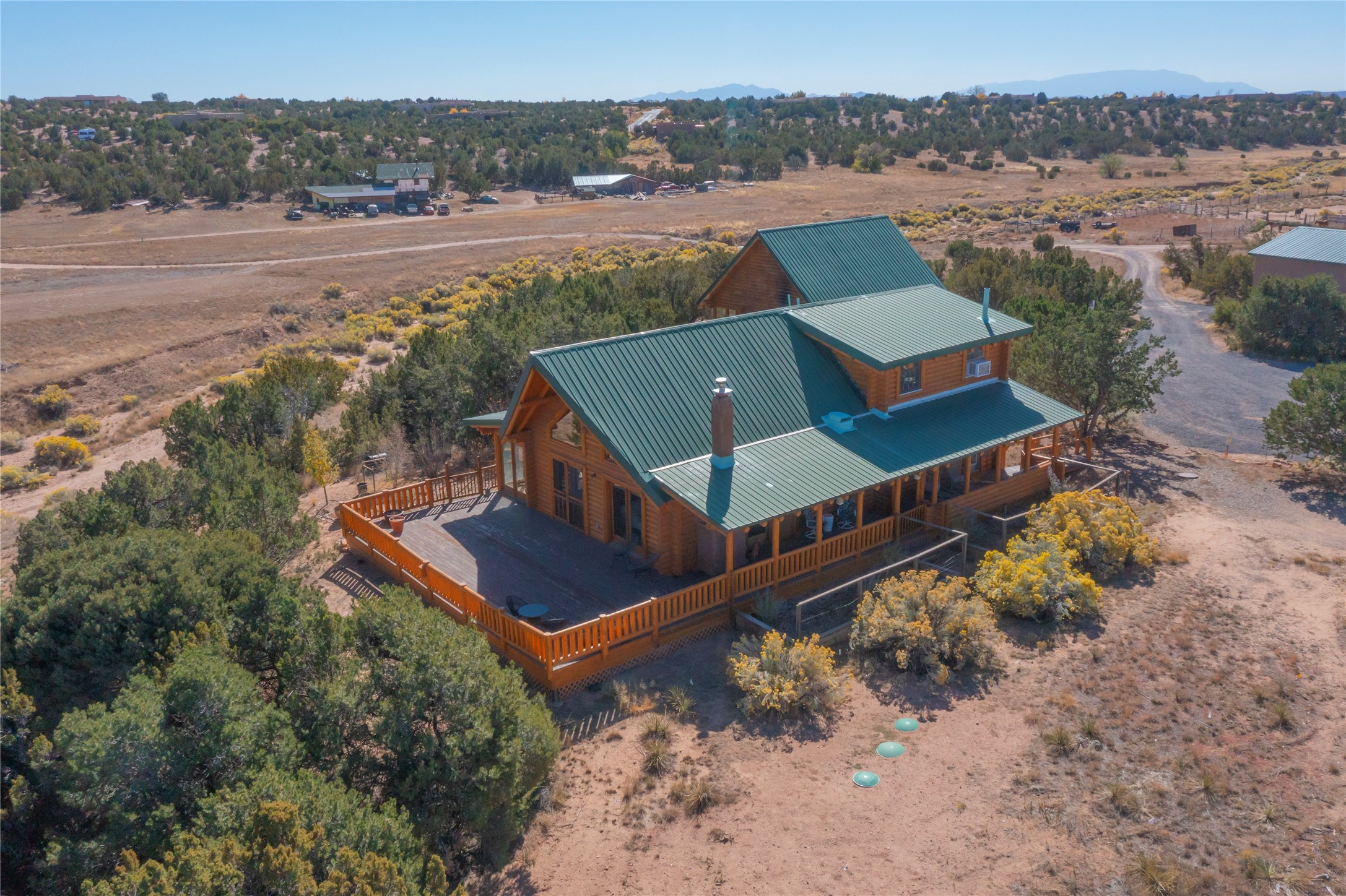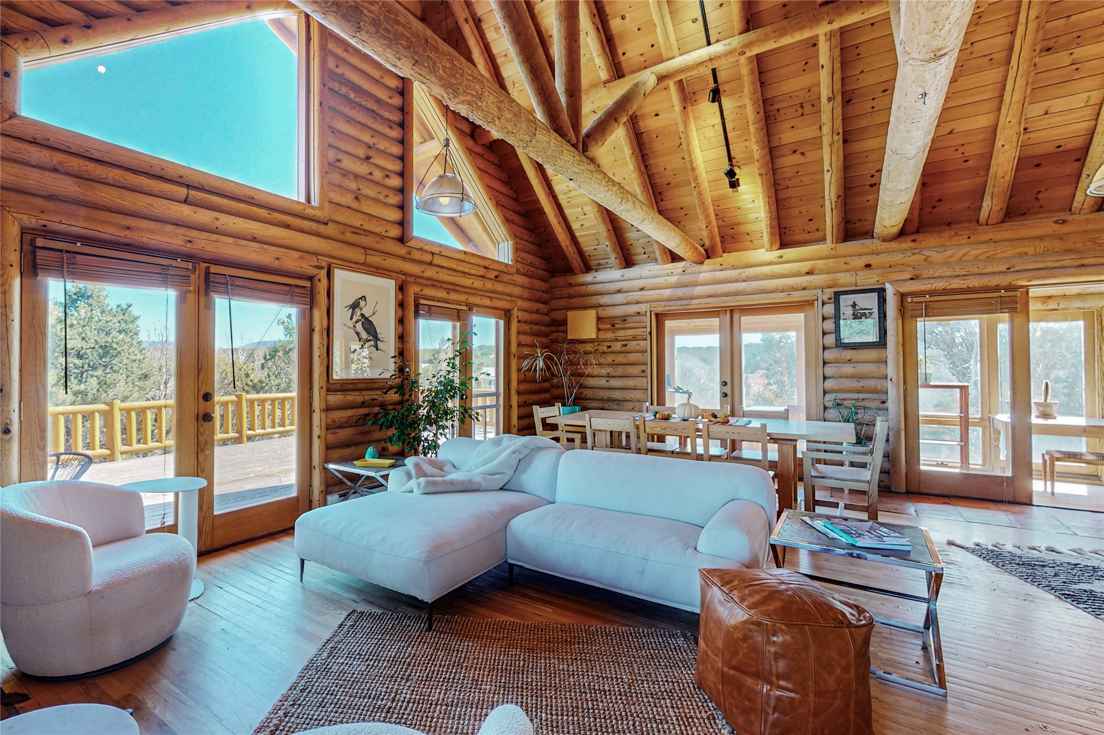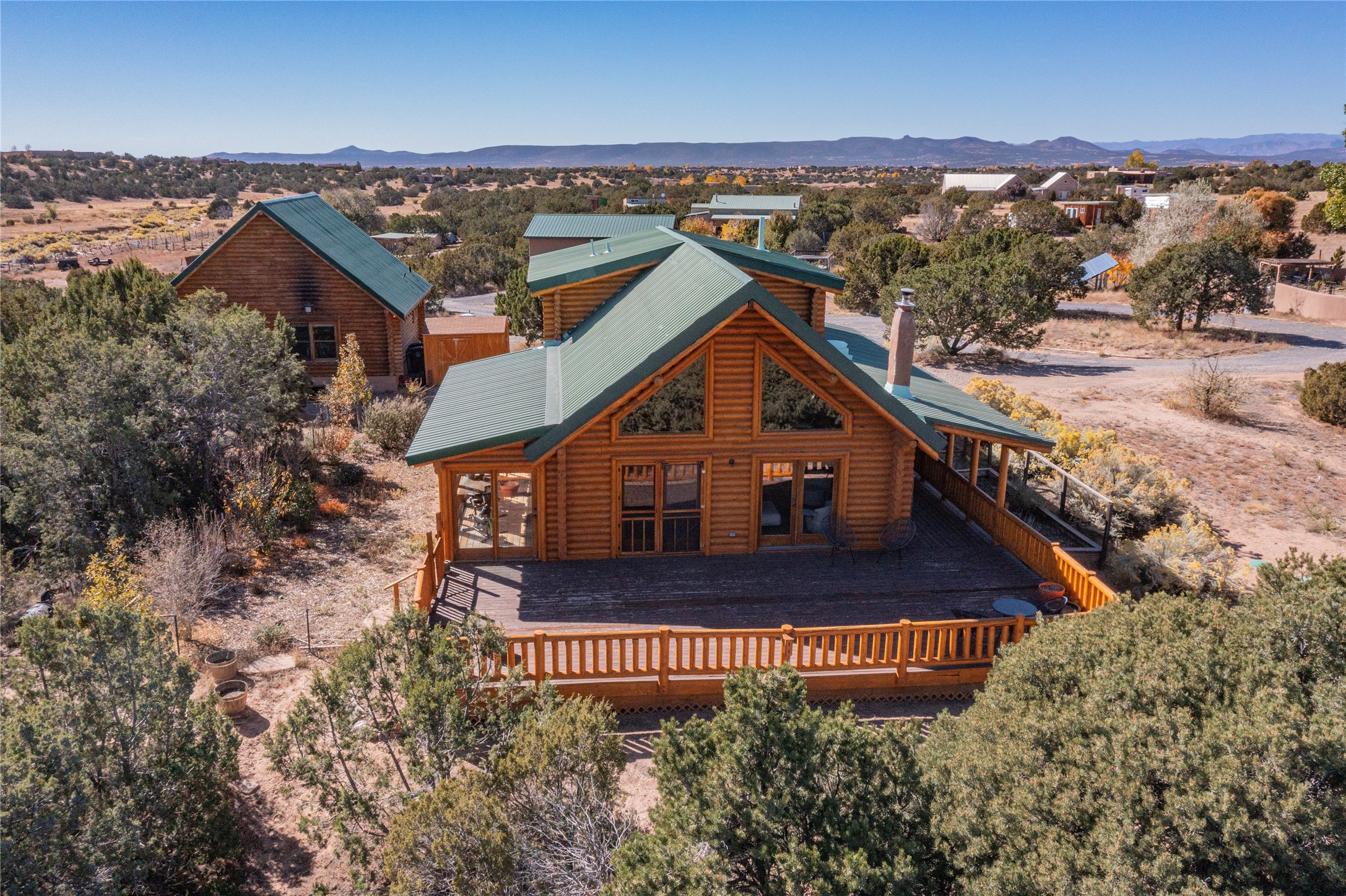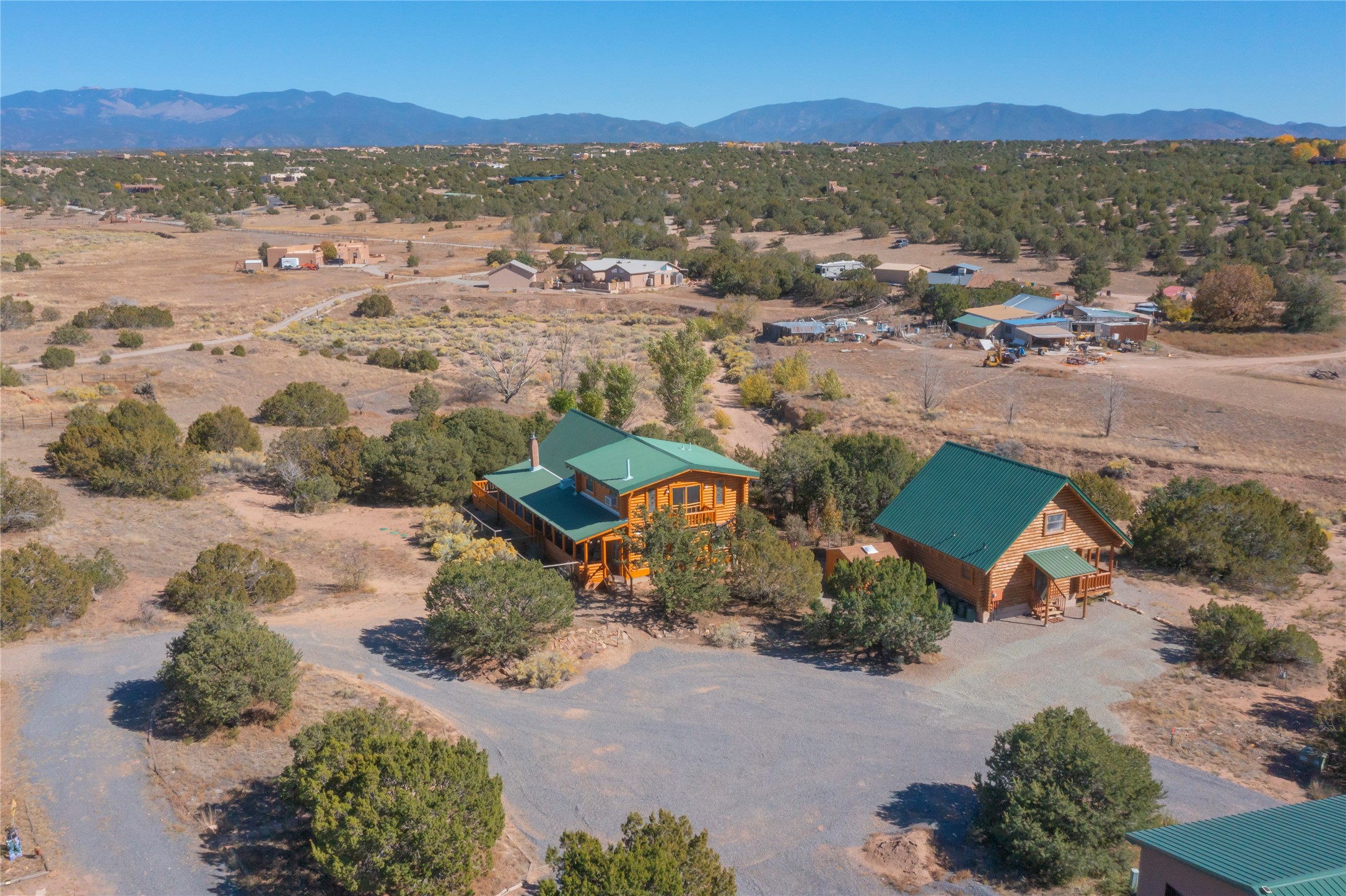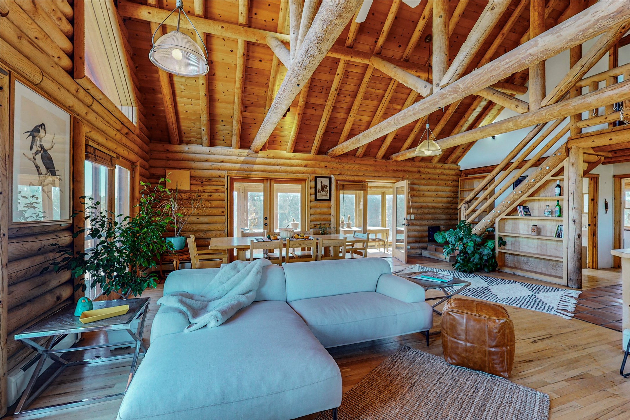 Discover this fantastic take on a large, modern custom log house and detached log guest house in beautiful La Tierra, Santa Fe. Nestled at the end of the famed Arroyo Calabasas Road, this combined 4 bedroom/ 3 bathroom, 2.5-acre property sits atop a hill with 360-degree mountain views and highlights new and old Santa Fe with horse farms, dirt roads, and fields of summer wildflowers. Rural yet only 10 minutes from downtown Santa Fe, the house is perfect for impressive entertaining in all 4 seasons with its sprawling open floor plan and huge back deck. Cozy yet spacious, the large modern kitchen overlooks the living room with high 2-story ceilings, floor-to-ceiling windows, exquisite wood detailing, and a stone fireplace. Three sets of French doors open to the wrap-around wood deck. The back stairs open to a lofted hallway and enclosed a large master bedroom and full bath, with the second bedroom and bathroom on the main floor. A finished south-facing sun room with a passive solar window provides a multi-use space. Both the main and guest houses highlight open floor plans, original wood floors, and high ceilings. The guest house has 2 bedrooms, a full bathroom, and its own laundry space. The previous owner ran a very successful Airbnb in the guest house, grossing over 40k per year for 5 years. This unique property is in a private, peaceful enclave in a close-knit community of friendly individuals who care greatly about preserving the old New Mexico environment and continuously lobby to keep this neighborhood free from excessive development.