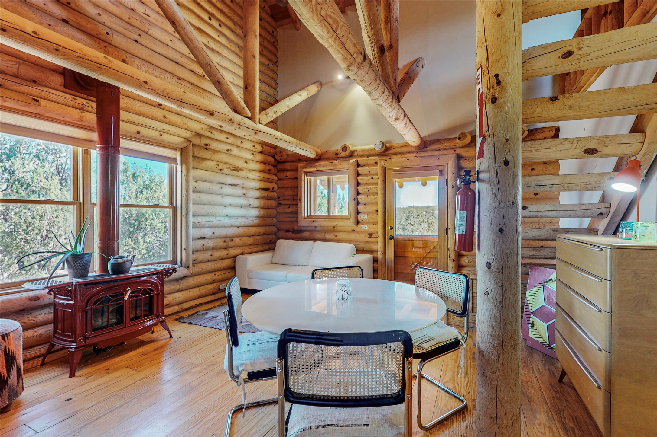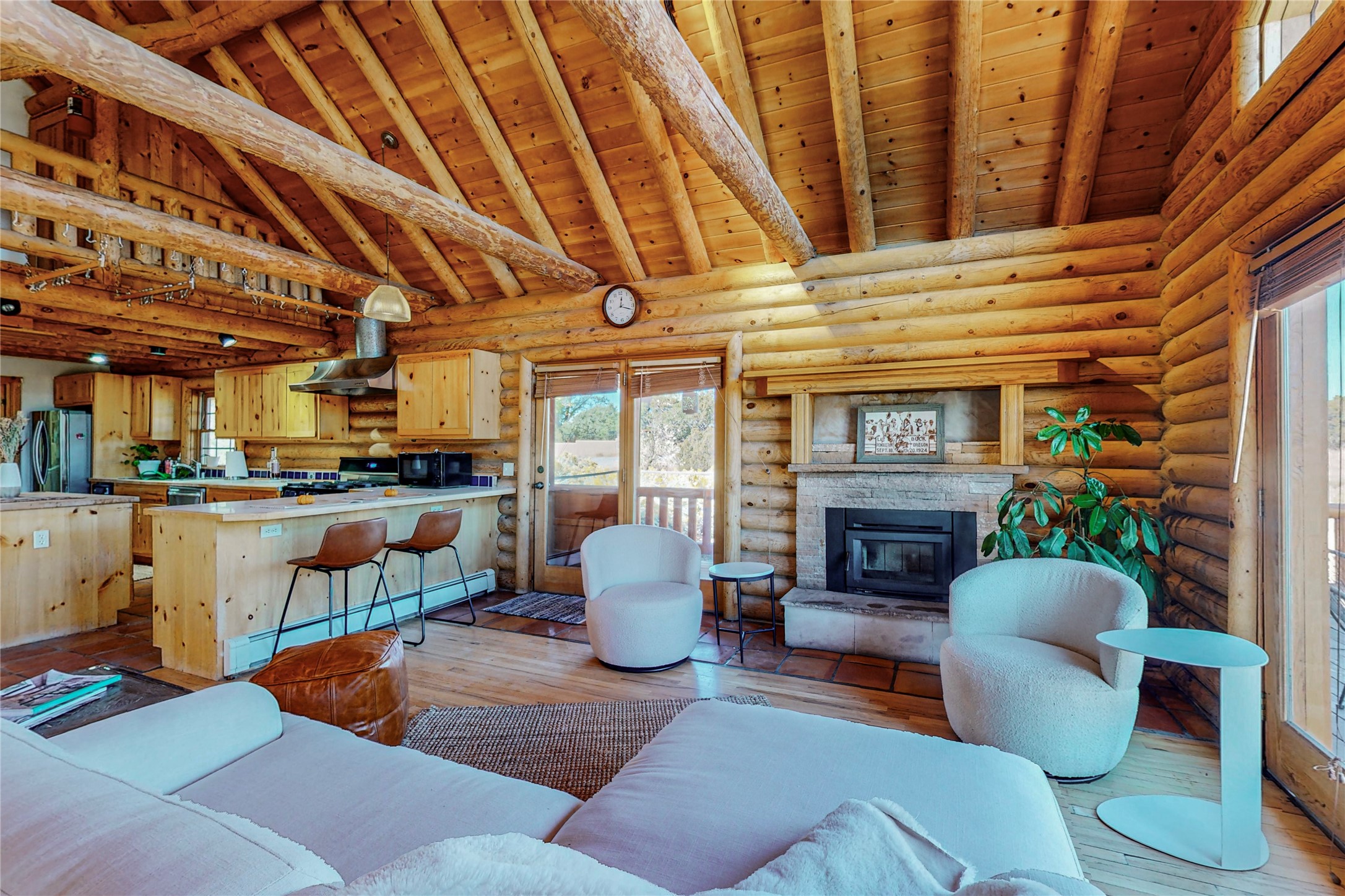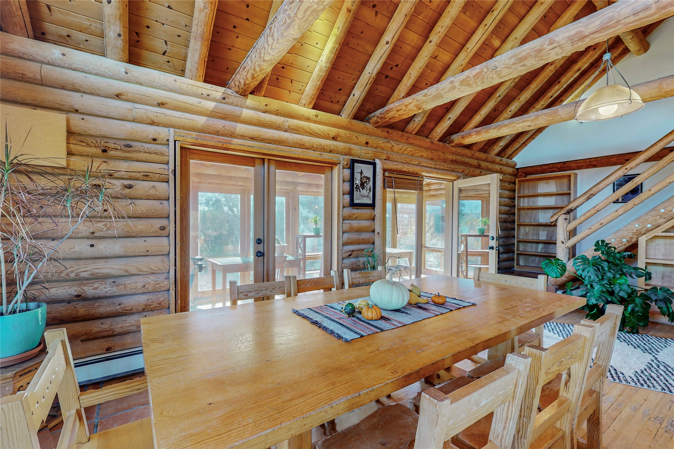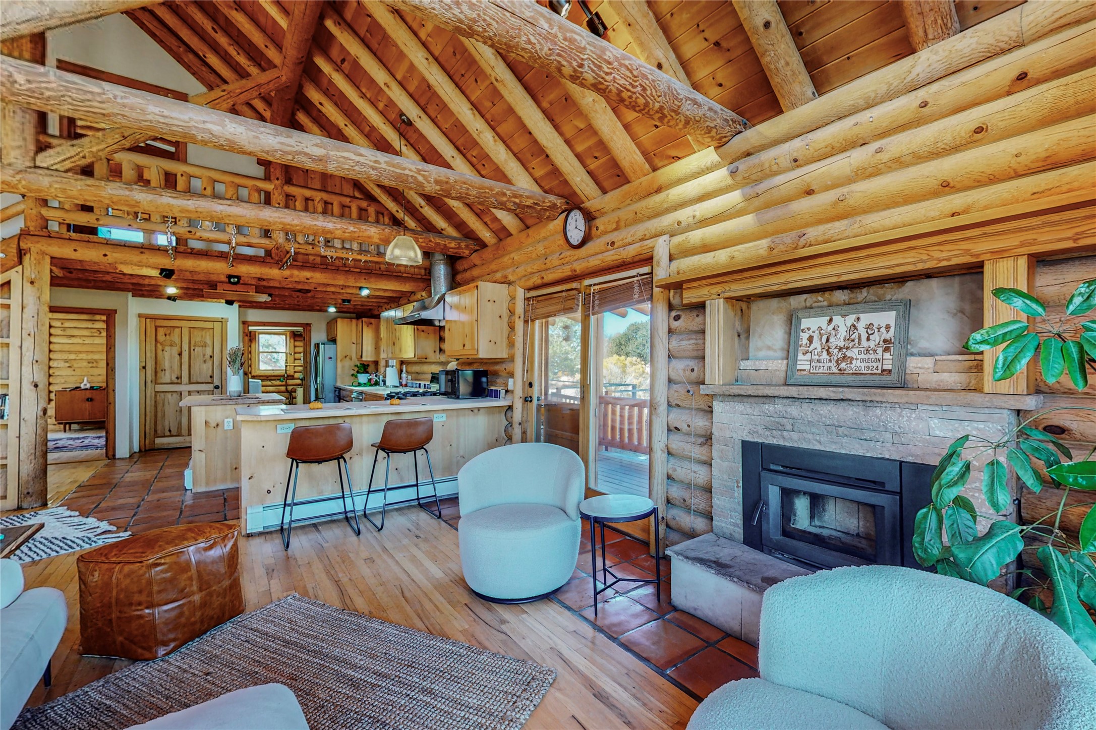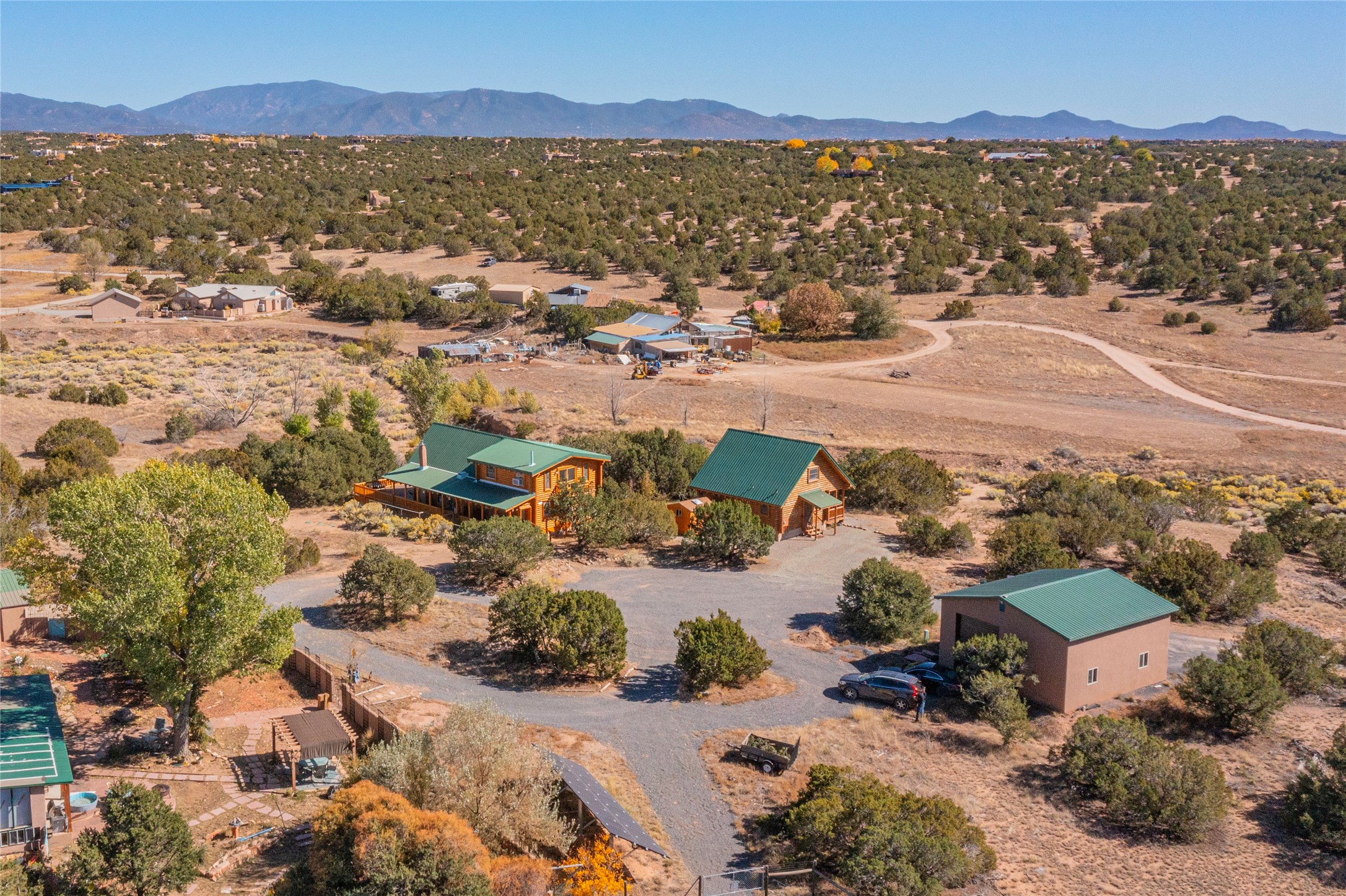Discover this fantastic take on a large, modern custom log house and detached log guest house in beautiful La Tierra, Santa Fe. Nestled at the end of the famed Arroyo Calabasas Road, this combined 4 bedroom/ 3 bathroom, 2.5-acre property sits atop a hill with 360-degree mountain views and highlights new and old Santa Fe with horse farms, dirt roads, and fields of summer wildflowers. Rural yet only 10 minutes from downtown Santa Fe, the house is perfect for impressive entertaining in all 4 seasons with its sprawling open floor plan and huge back deck. Cozy yet spacious, the large modern kitchen overlooks the living room with high 2-story ceilings, floor-to-ceiling windows, exquisite wood detailing, and a stone fireplace. Three sets of French doors open to the wrap-around wood deck. The back stairs open to a lofted hallway and enclosed a large master bedroom and full bath, with the second bedroom and bathroom on the main floor. A finished south-facing sun room with a passive solar window provides a multi-use space. Both the main and guest houses highlight open floor plans, original wood floors, and high ceilings. The guest house has 2 bedrooms, a full bathroom, and its own laundry space. The previous owner ran a very successful Airbnb in the guest house, grossing over 40k per year for 5 years. This unique property is in a private, peaceful enclave in a close-knit community of friendly individuals who care greatly about preserving the old New Mexico environment and continuously lobby to keep this neighborhood free from excessive development.