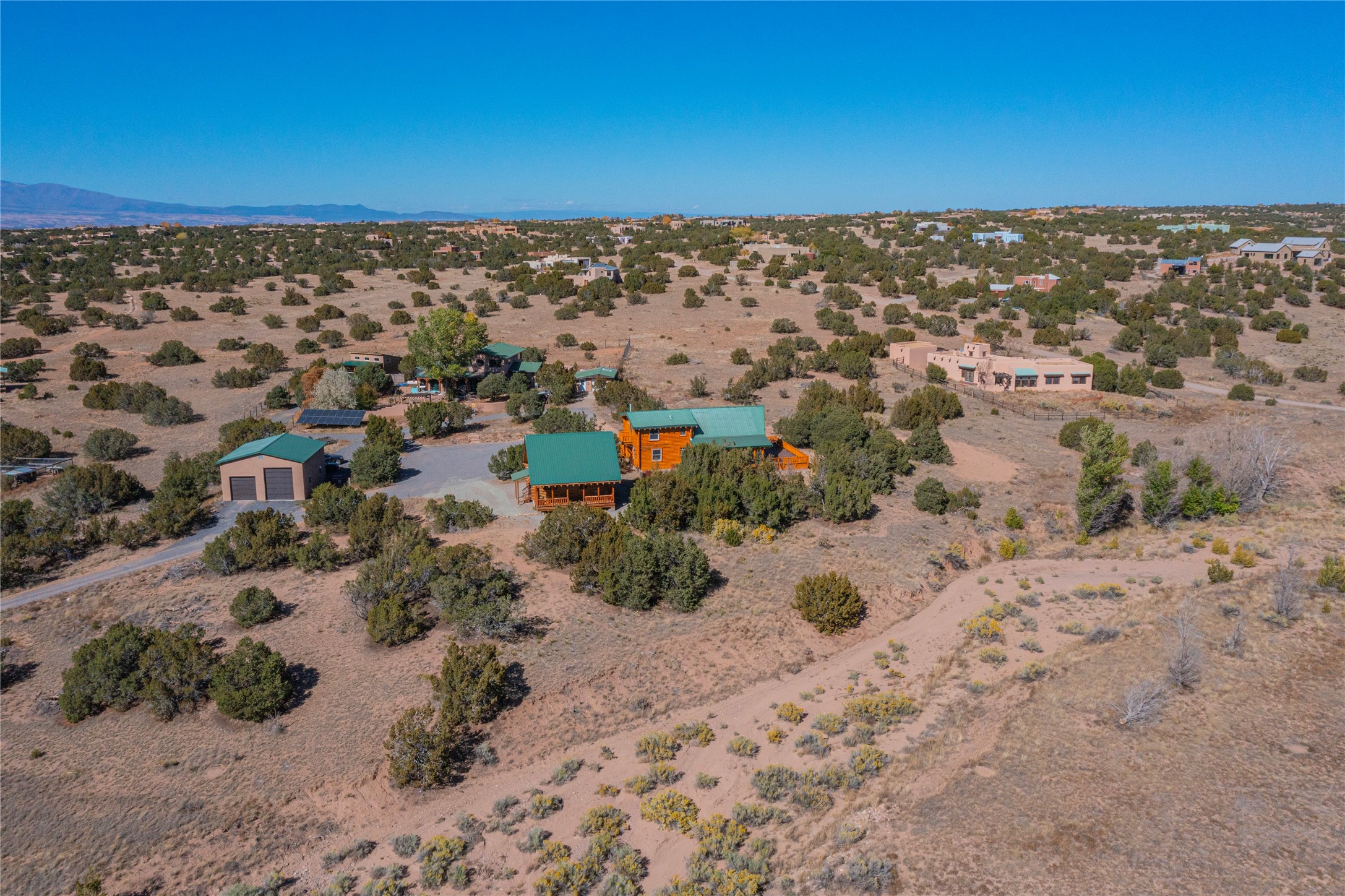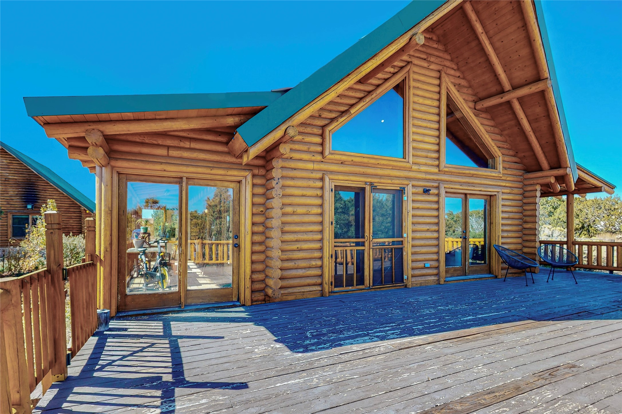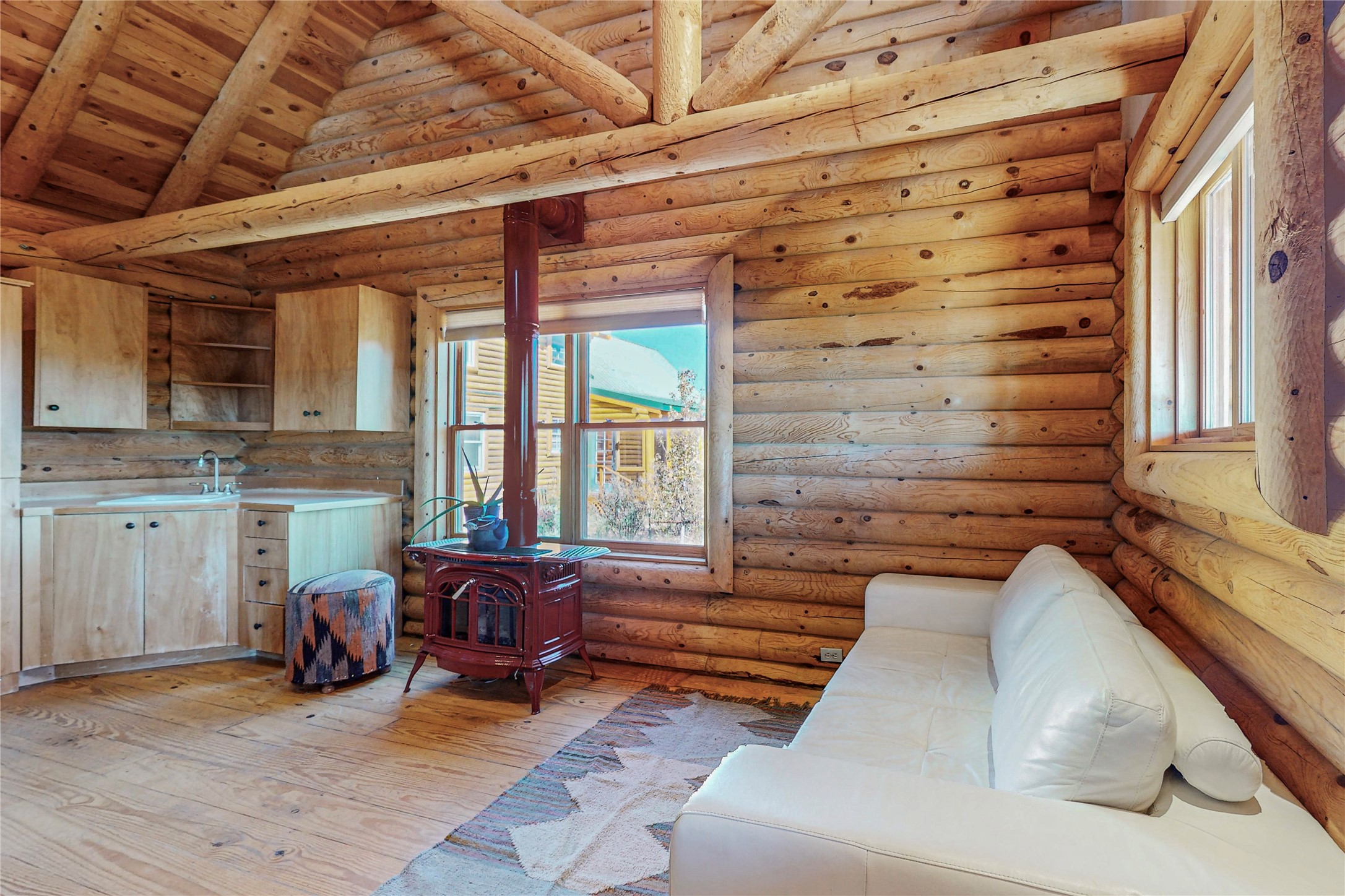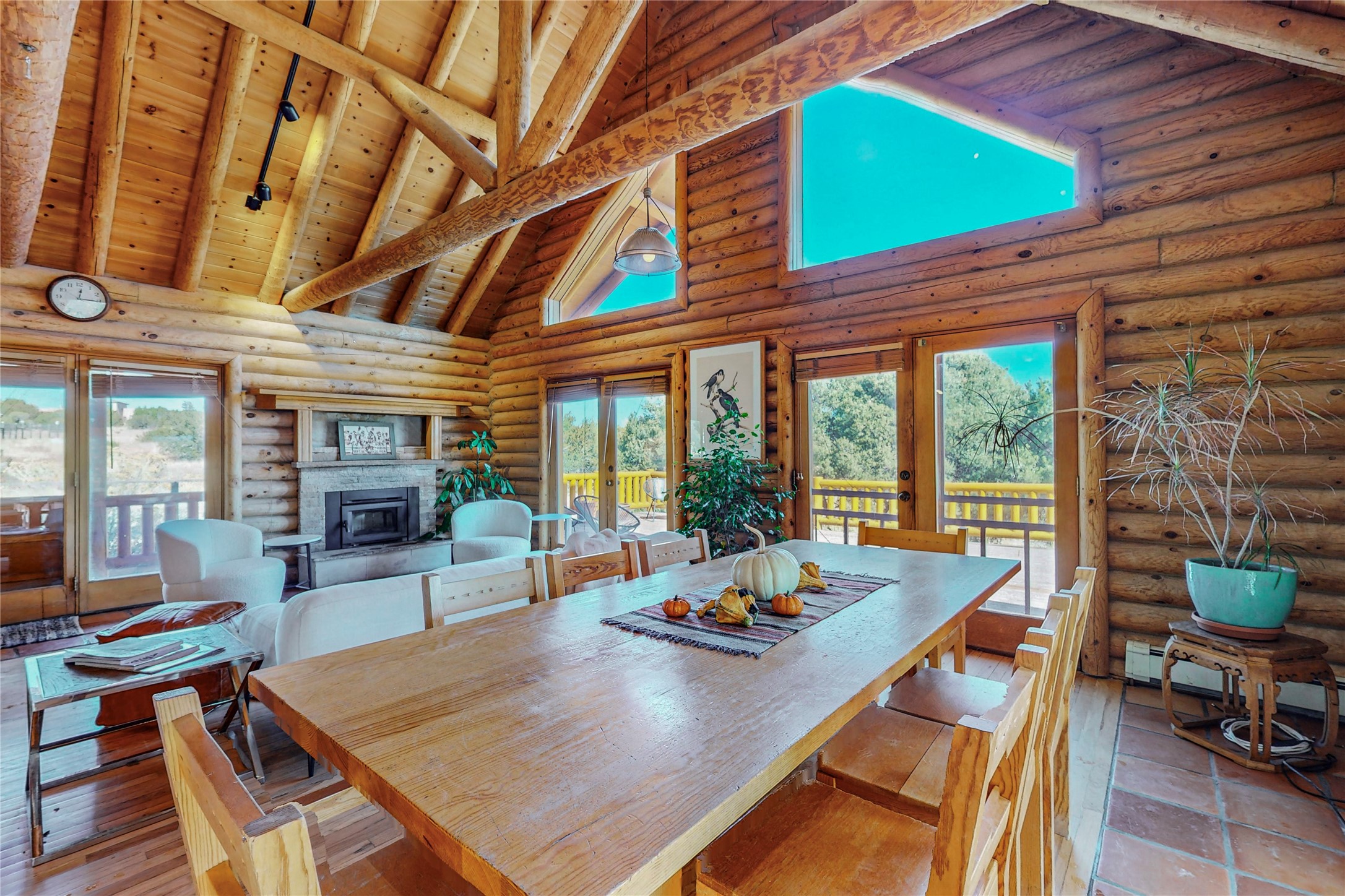 Discover this fantastic take on a large, modern custom log house and detached log guest house in beautiful La Tierra, Santa Fe. Nestled at the end of the famed Arroyo Calabasas Road, this combined 4 bedroom/ 3 bathroom, 2.5-acre property sits atop a hill with 360-degree mountain views and highlights new and old Santa Fe with horse farms, dirt roads, and fields of summer wildflowers. Rural yet only 10 minutes from downtown Santa Fe, the house is perfect for impressive entertaining in all 4 seasons with its sprawling open floor plan and huge back deck. Cozy yet spacious, the large modern kitchen overlooks the living room with high 2-story ceilings, floor-to-ceiling windows, exquisite wood detailing, and a stone fireplace. Three sets of French doors open to the wrap-around wood deck. The back stairs open to a lofted hallway and enclosed a large master bedroom and full bath, with the second bedroom and bathroom on the main floor. A finished south-facing sun room with a passive solar window provides a multi-use space. Both the main and guest houses highlight open floor plans, original wood floors, and high ceilings. The guest house has 2 bedrooms, a full bathroom, and its own laundry space. The previous owner ran a very successful Airbnb in the guest house, grossing over 40k per year for 5 years. This unique property is in a private, peaceful enclave in a close-knit community of friendly individuals who care greatly about preserving the old New Mexico environment and continuously lobby to keep this neighborhood free from excessive development.