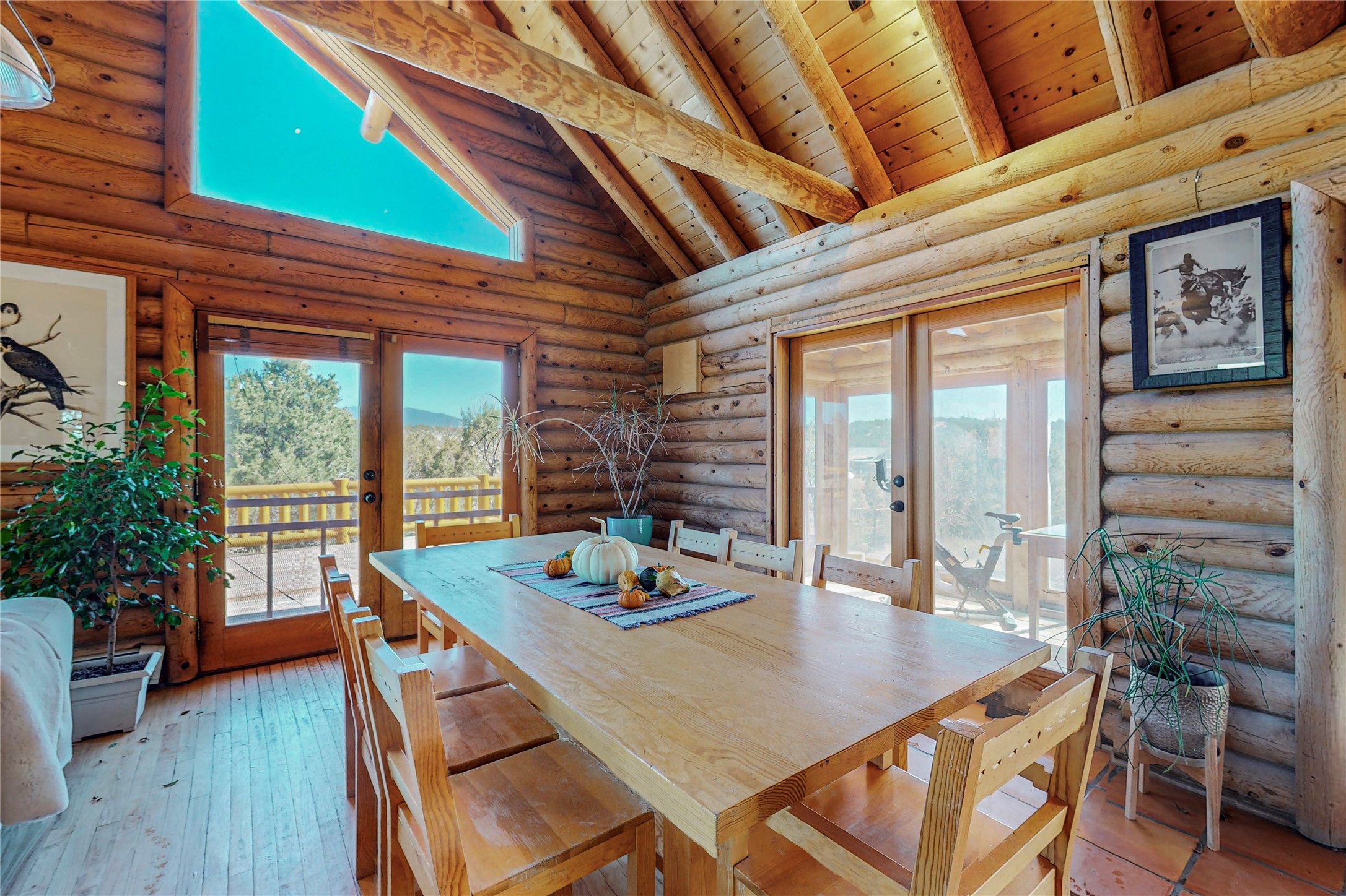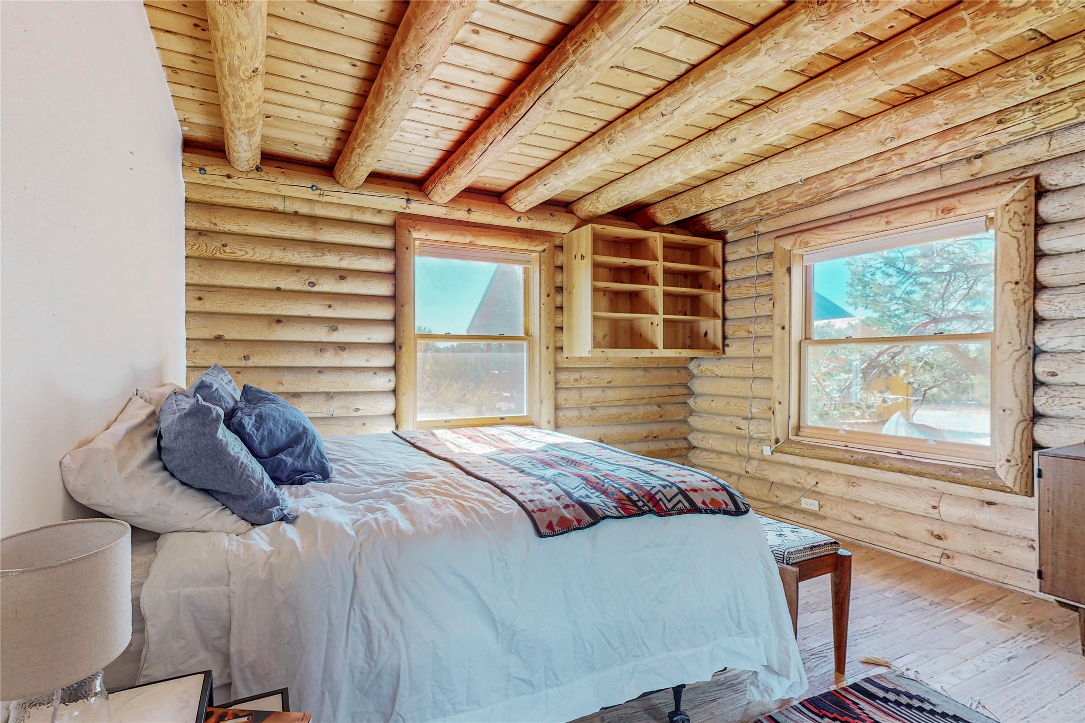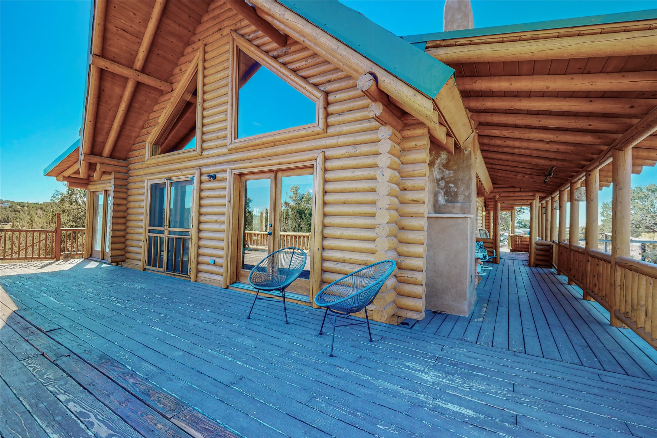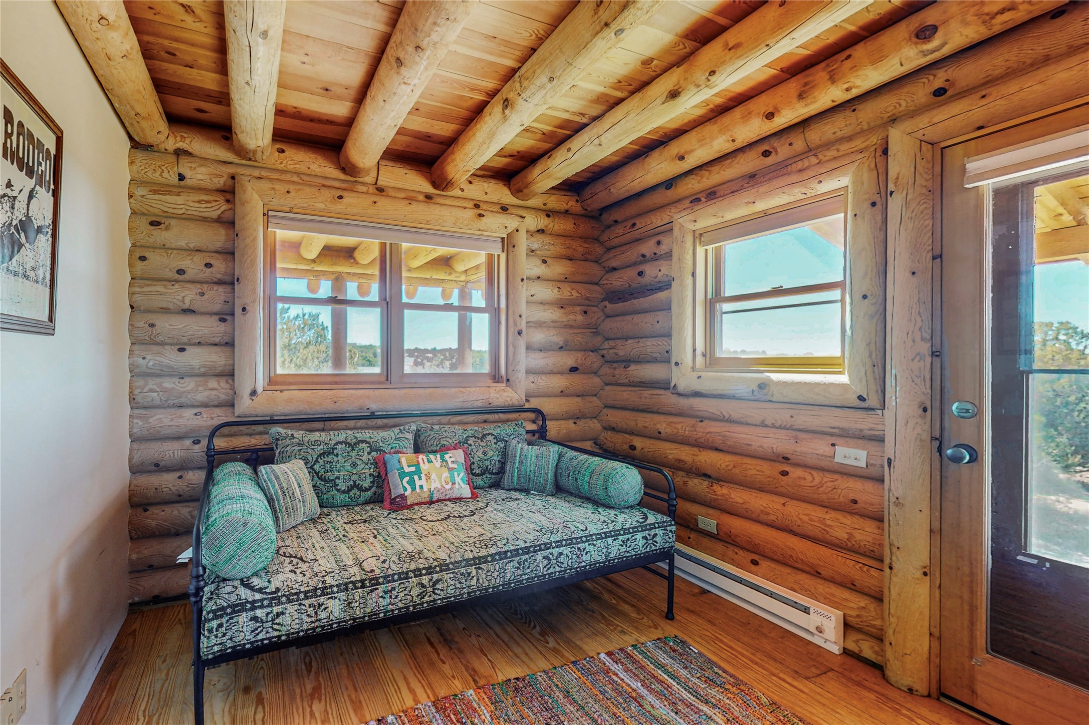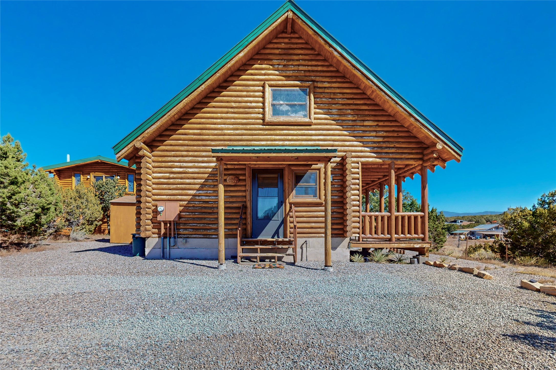 Discover this fantastic take on a large, modern custom log house and detached log guest house in beautiful La Tierra, Santa Fe. Nestled at the end of the famed Arroyo Calabasas Road, this combined 4 bedroom/ 3 bathroom, 2.5-acre property sits atop a hill with 360-degree mountain views and highlights new and old Santa Fe with horse farms, dirt roads, and fields of summer wildflowers. Rural yet only 10 minutes from downtown Santa Fe, the house is perfect for impressive entertaining in all 4 seasons with its sprawling open floor plan and huge back deck. Cozy yet spacious, the large modern kitchen overlooks the living room with high 2-story ceilings, floor-to-ceiling windows, exquisite wood detailing, and a stone fireplace. Three sets of French doors open to the wrap-around wood deck. The back stairs open to a lofted hallway and enclosed a large master bedroom and full bath, with the second bedroom and bathroom on the main floor. A finished south-facing sun room with a passive solar window provides a multi-use space. Both the main and guest houses highlight open floor plans, original wood floors, and high ceilings. The guest house has 2 bedrooms, a full bathroom, and its own laundry space. The previous owner ran a very successful Airbnb in the guest house, grossing over 40k per year for 5 years. This unique property is in a private, peaceful enclave in a close-knit community of friendly individuals who care greatly about preserving the old New Mexico environment and continuously lobby to keep this neighborhood free from excessive development.