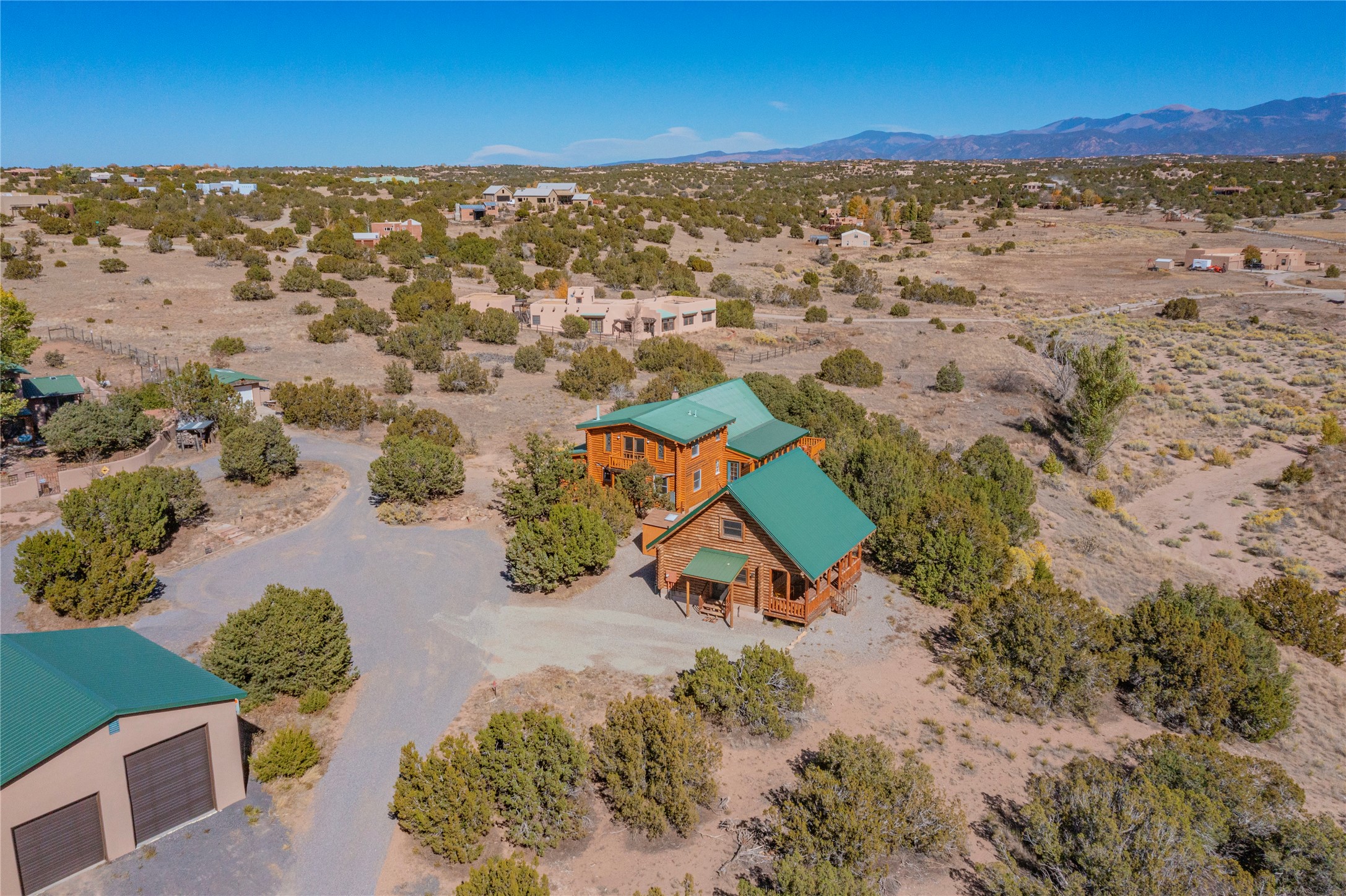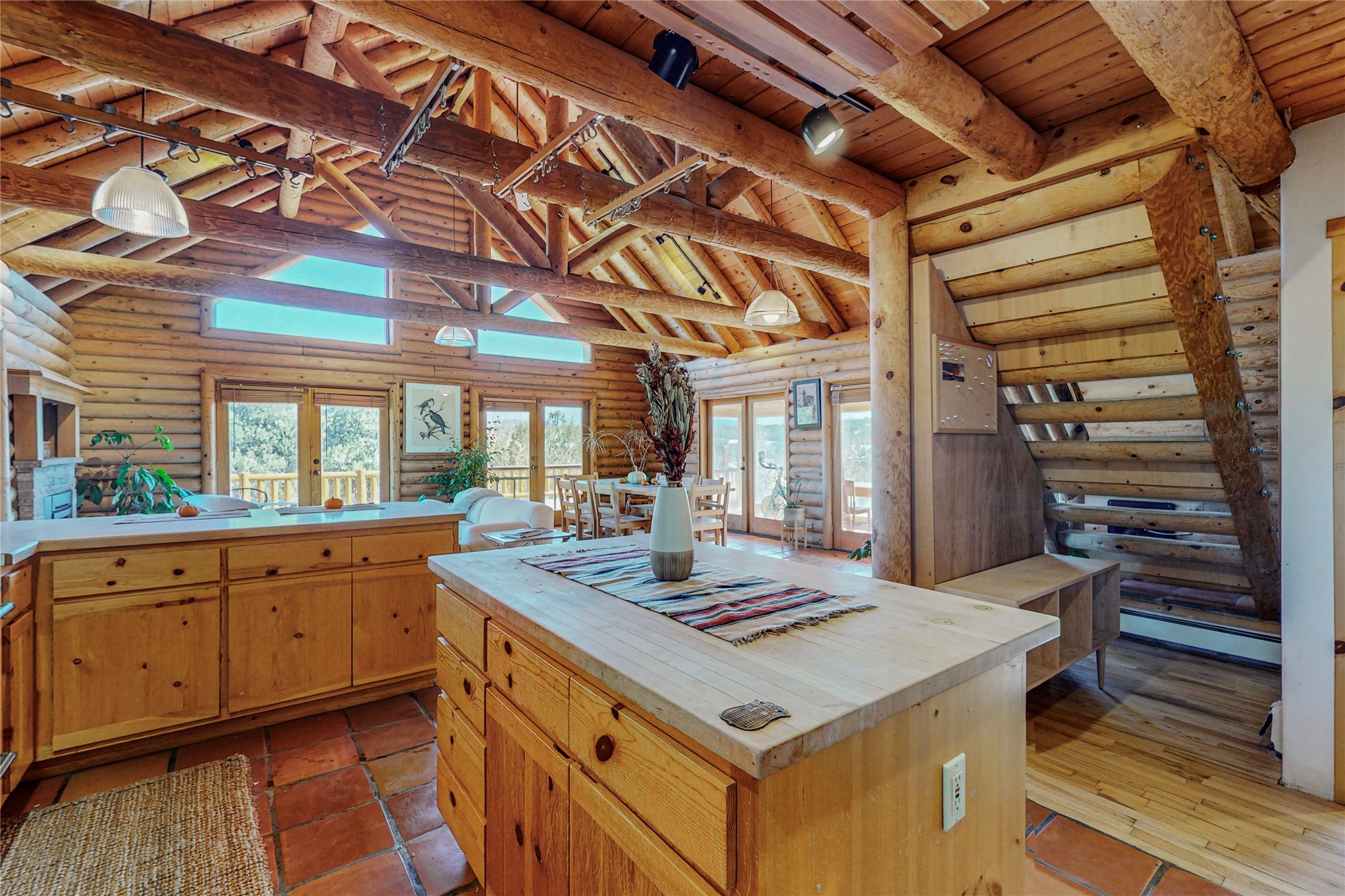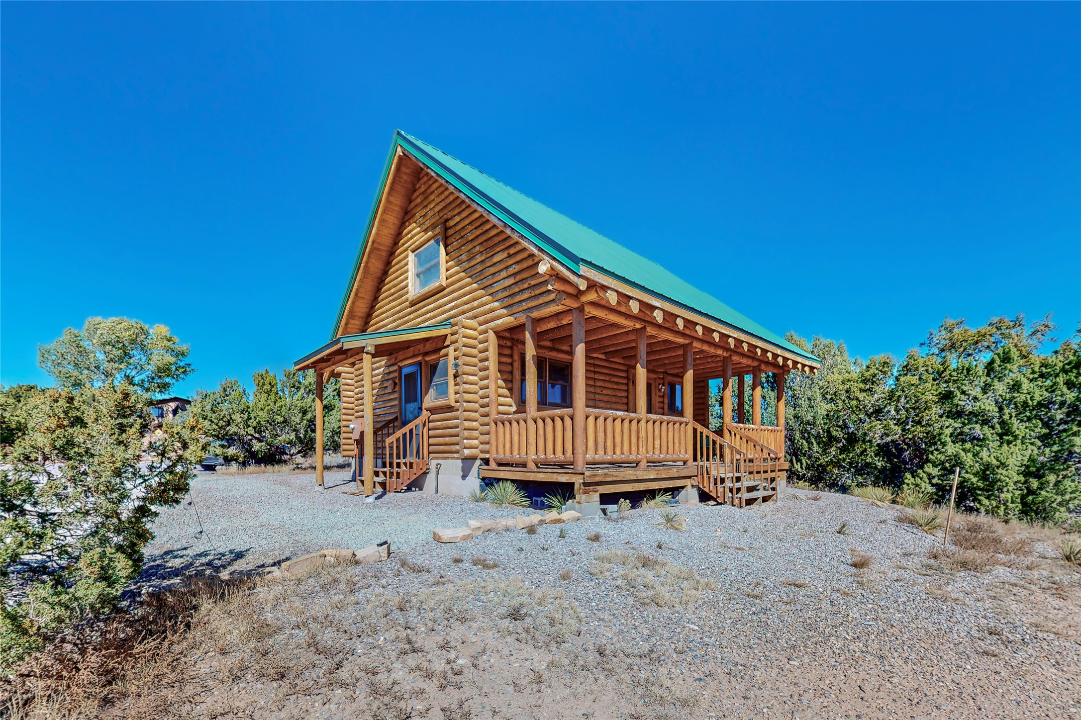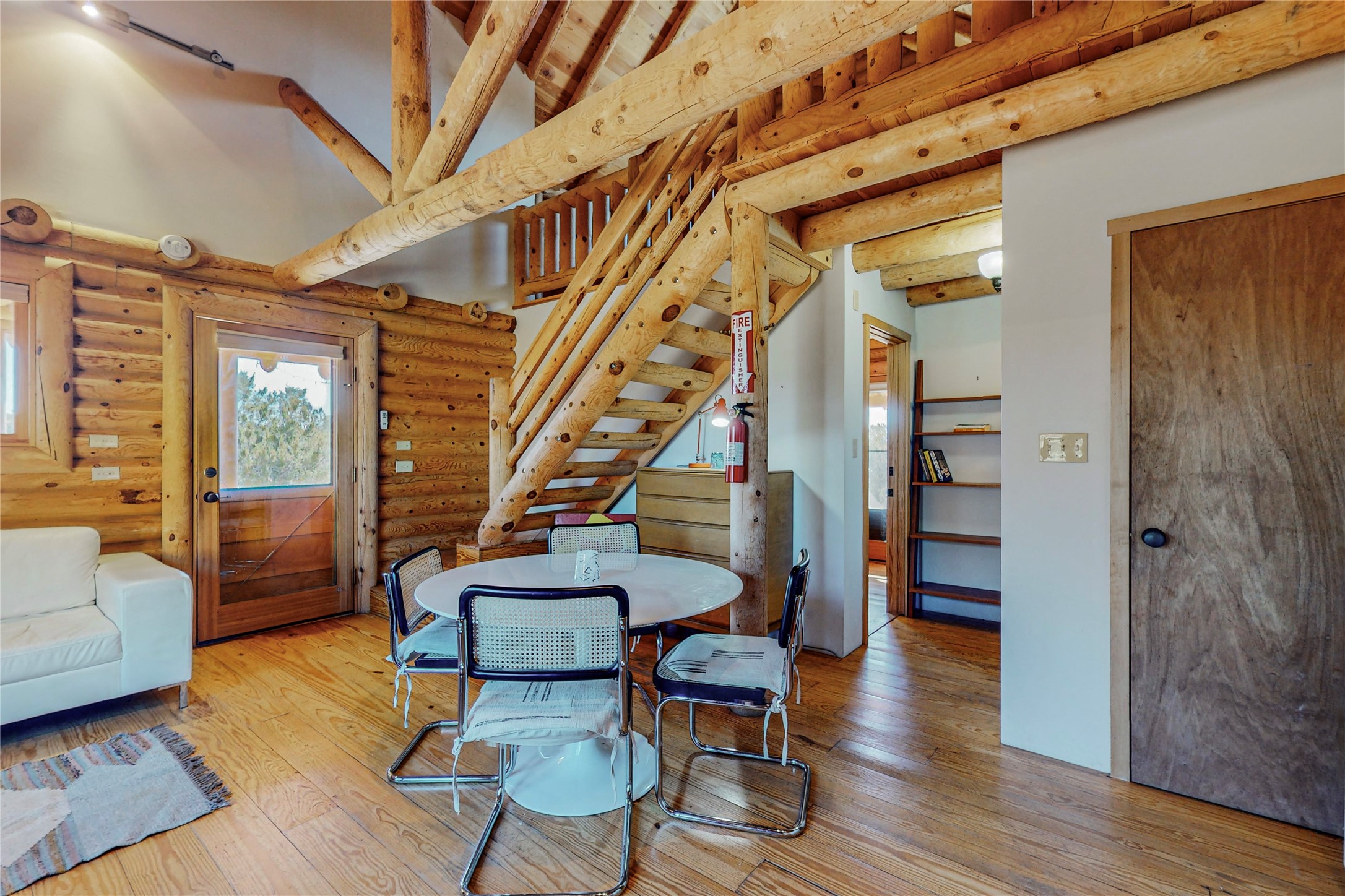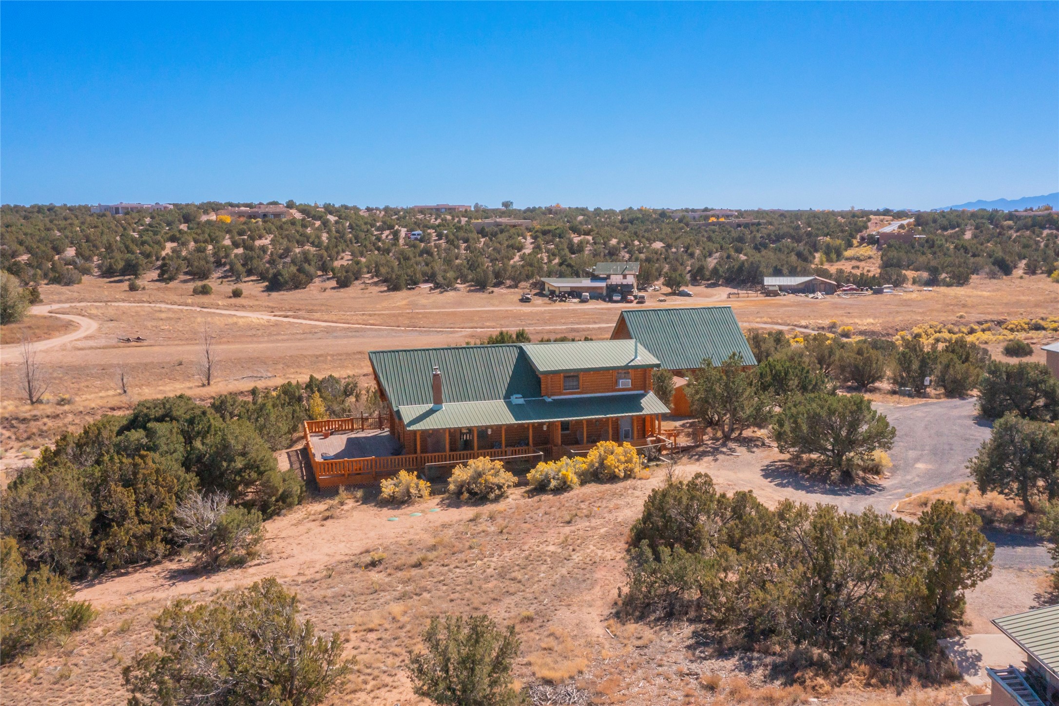 Discover this fantastic take on a large, modern custom log house and detached log guest house in beautiful La Tierra, Santa Fe. Nestled at the end of the famed Arroyo Calabasas Road, this combined 4 bedroom/ 3 bathroom, 2.5-acre property sits atop a hill with 360-degree mountain views and highlights new and old Santa Fe with horse farms, dirt roads, and fields of summer wildflowers. Rural yet only 10 minutes from downtown Santa Fe, the house is perfect for impressive entertaining in all 4 seasons with its sprawling open floor plan and huge back deck. Cozy yet spacious, the large modern kitchen overlooks the living room with high 2-story ceilings, floor-to-ceiling windows, exquisite wood detailing, and a stone fireplace. Three sets of French doors open to the wrap-around wood deck. The back stairs open to a lofted hallway and enclosed a large master bedroom and full bath, with the second bedroom and bathroom on the main floor. A finished south-facing sun room with a passive solar window provides a multi-use space. Both the main and guest houses highlight open floor plans, original wood floors, and high ceilings. The guest house has 2 bedrooms, a full bathroom, and its own laundry space. The previous owner ran a very successful Airbnb in the guest house, grossing over 40k per year for 5 years. This unique property is in a private, peaceful enclave in a close-knit community of friendly individuals who care greatly about preserving the old New Mexico environment and continuously lobby to keep this neighborhood free from excessive development.