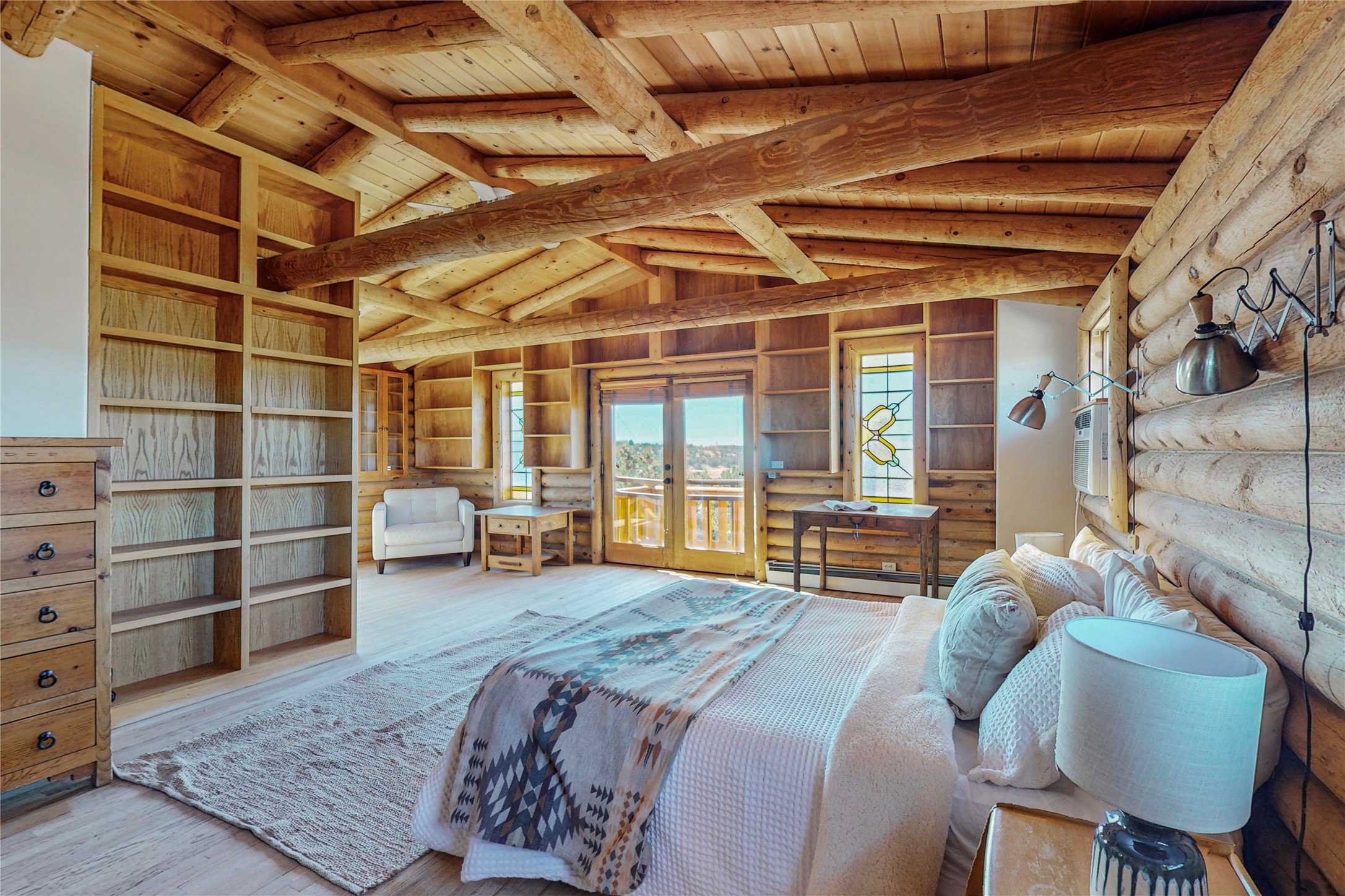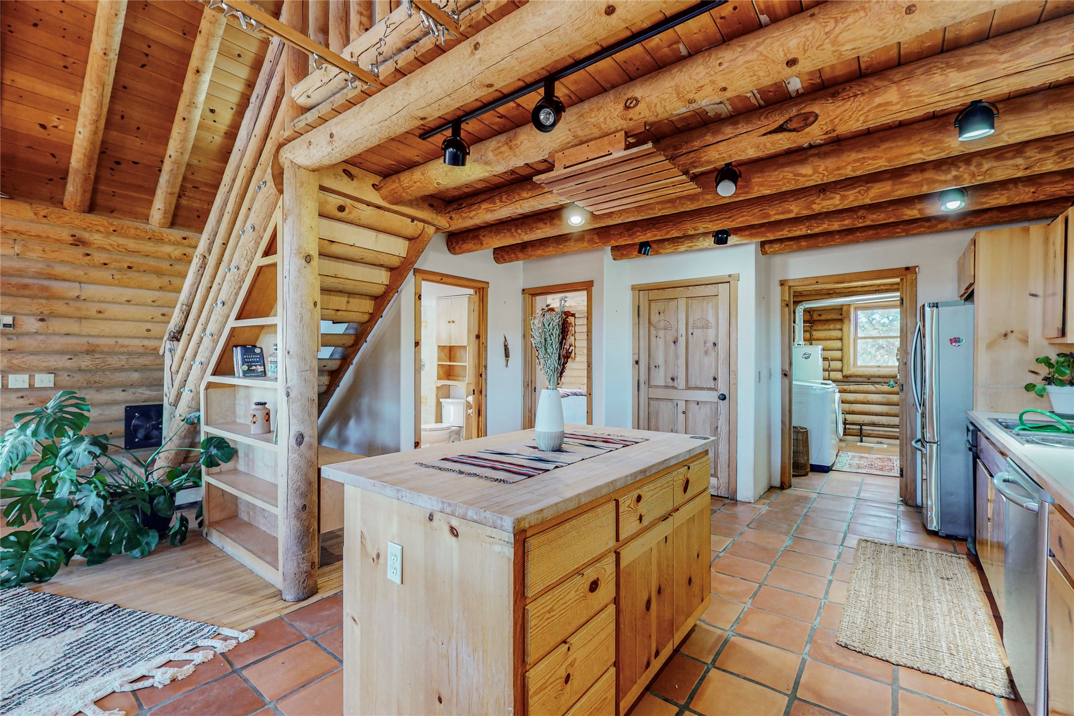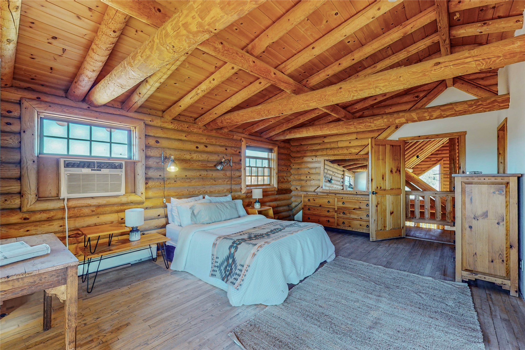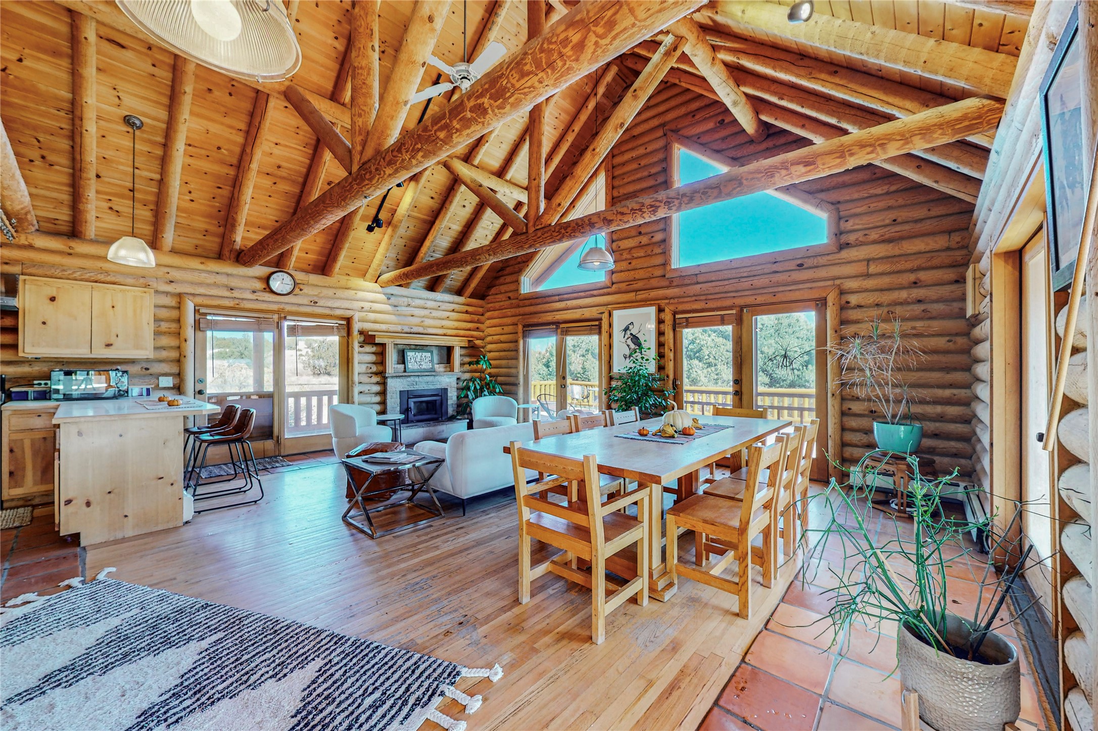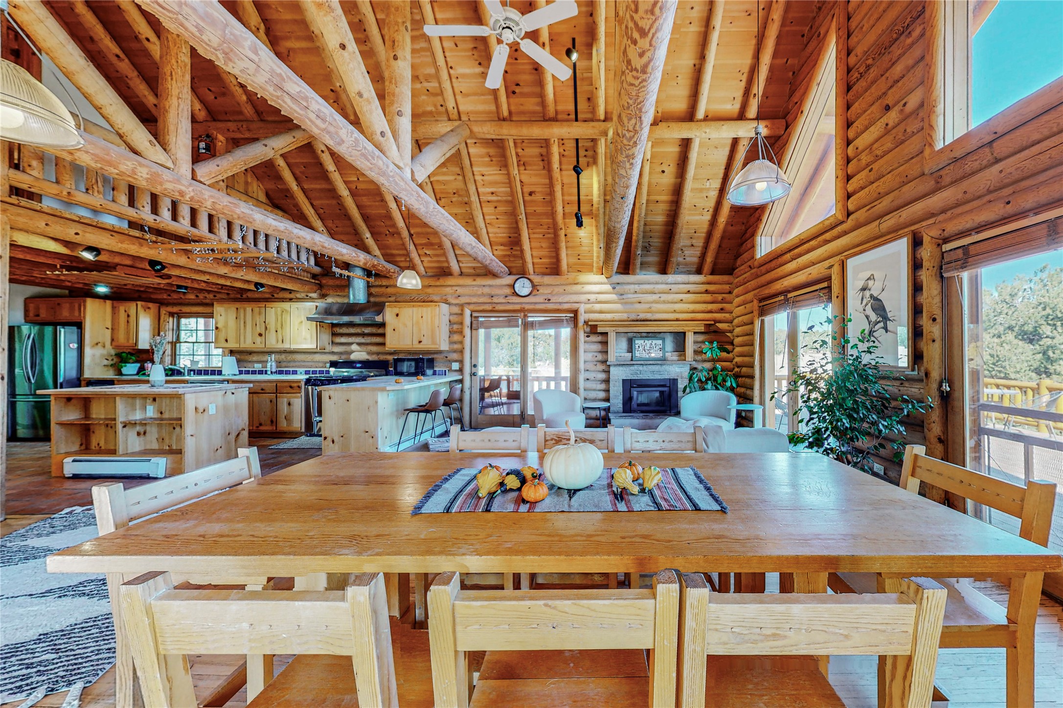 Discover this fantastic take on a large, modern custom log house and detached log guest house in beautiful La Tierra, Santa Fe. Nestled at the end of the famed Arroyo Calabasas Road, this combined 4 bedroom/ 3 bathroom, 2.5-acre property sits atop a hill with 360-degree mountain views and highlights new and old Santa Fe with horse farms, dirt roads, and fields of summer wildflowers. Rural yet only 10 minutes from downtown Santa Fe, the house is perfect for impressive entertaining in all 4 seasons with its sprawling open floor plan and huge back deck. Cozy yet spacious, the large modern kitchen overlooks the living room with high 2-story ceilings, floor-to-ceiling windows, exquisite wood detailing, and a stone fireplace. Three sets of French doors open to the wrap-around wood deck. The back stairs open to a lofted hallway and enclosed a large master bedroom and full bath, with the second bedroom and bathroom on the main floor. A finished south-facing sun room with a passive solar window provides a multi-use space. Both the main and guest houses highlight open floor plans, original wood floors, and high ceilings. The guest house has 2 bedrooms, a full bathroom, and its own laundry space. The previous owner ran a very successful Airbnb in the guest house, grossing over 40k per year for 5 years. This unique property is in a private, peaceful enclave in a close-knit community of friendly individuals who care greatly about preserving the old New Mexico environment and continuously lobby to keep this neighborhood free from excessive development.