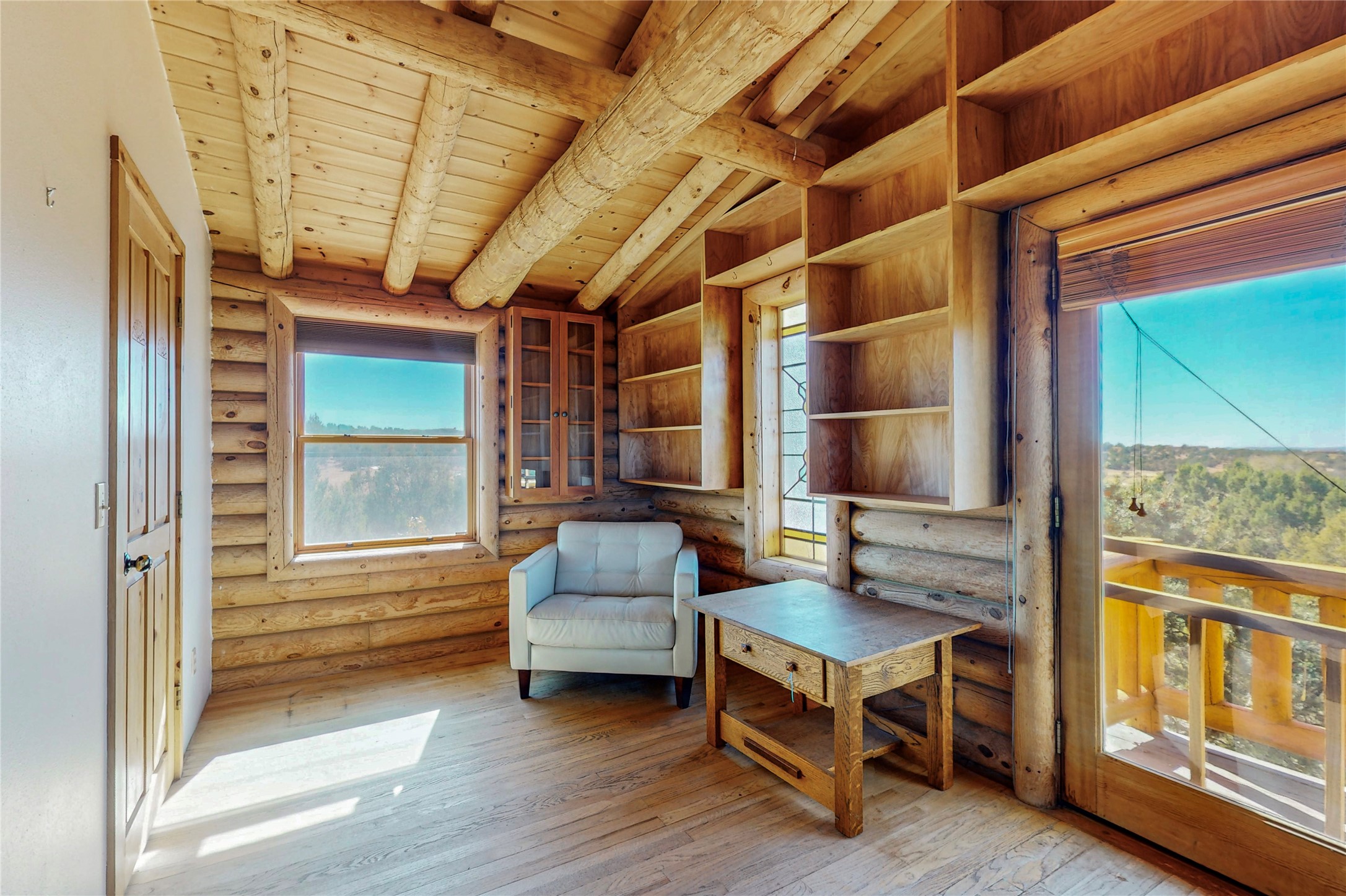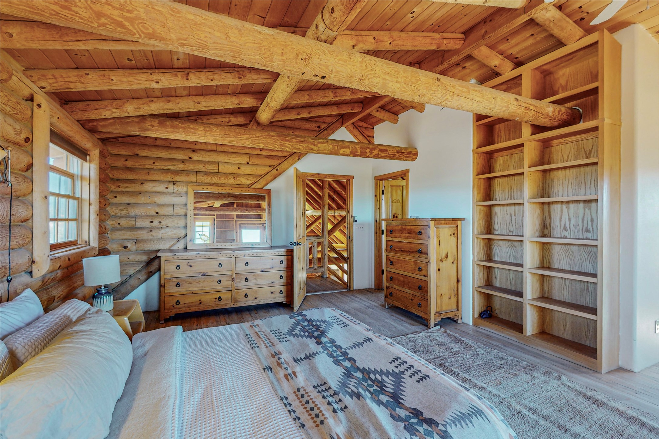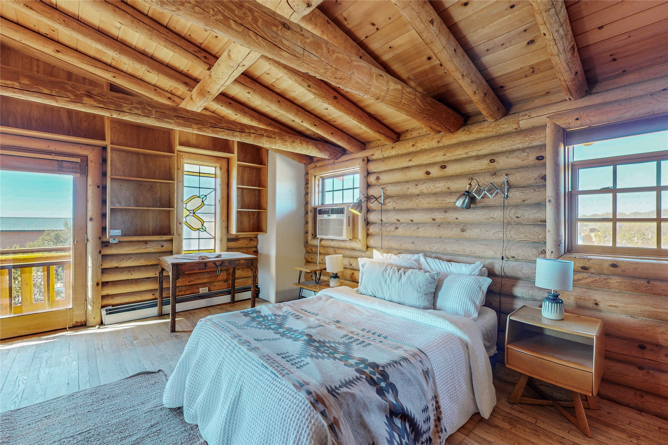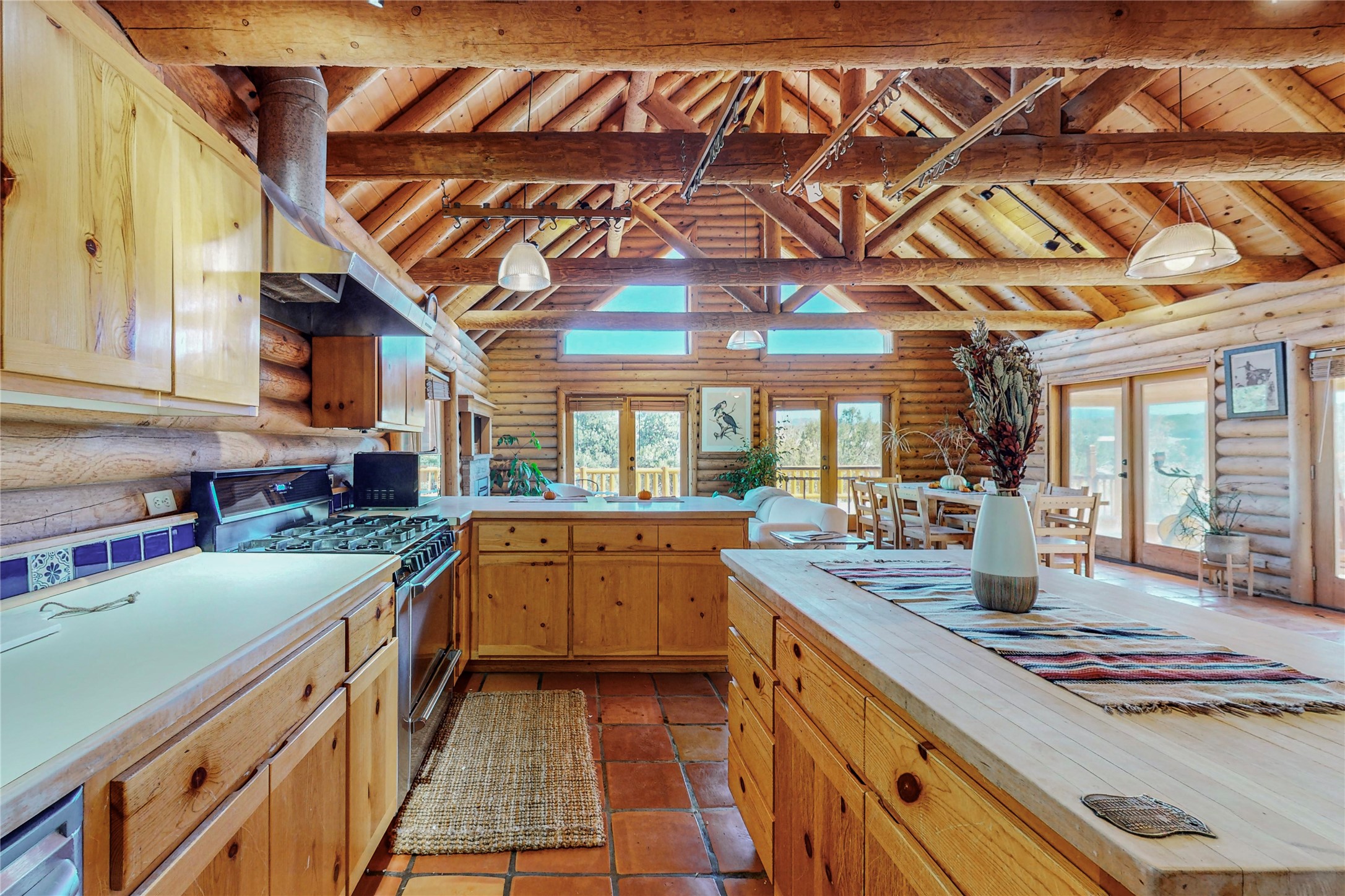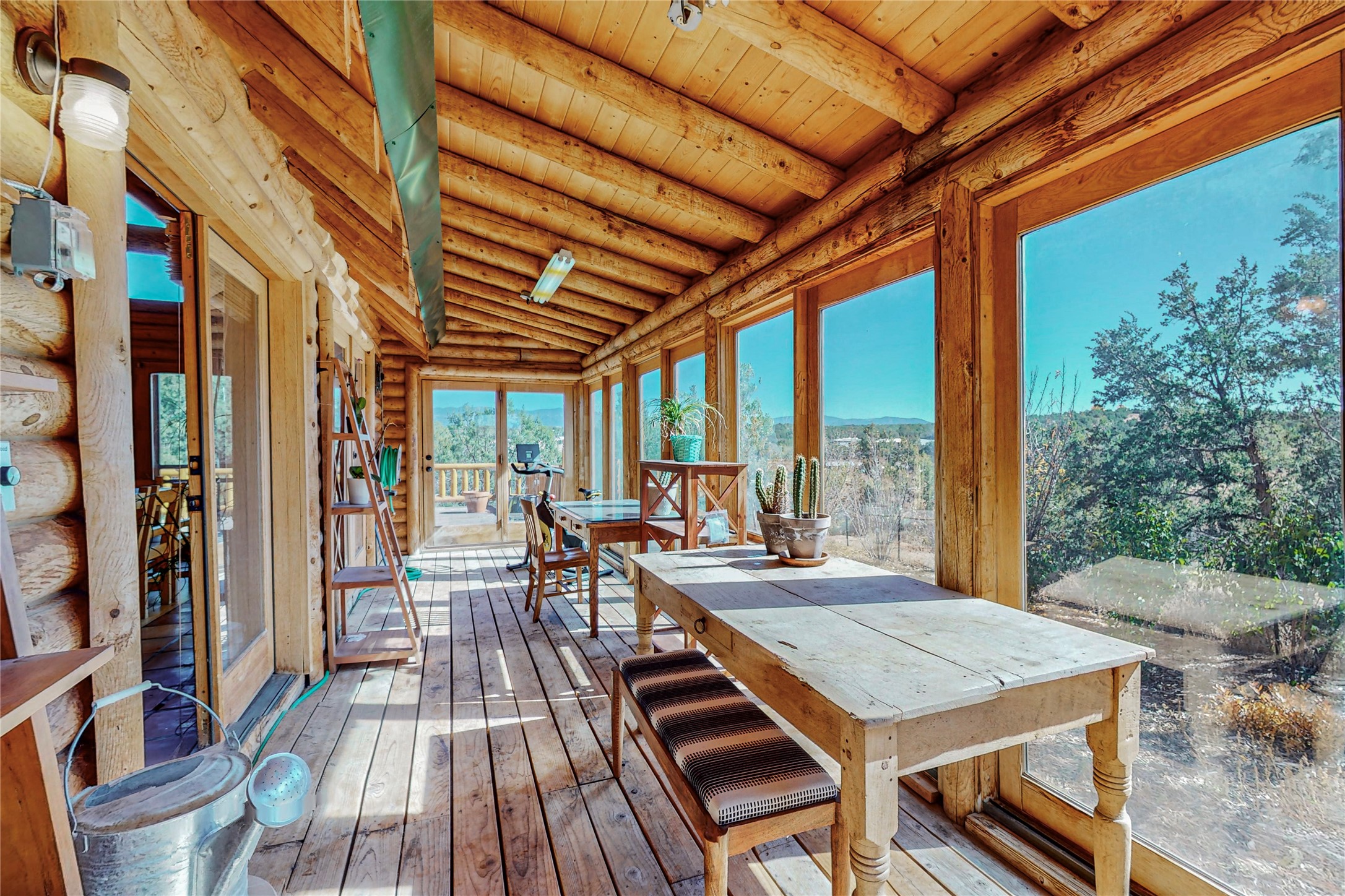 Discover this fantastic take on a large, modern custom log house and detached log guest house in beautiful La Tierra, Santa Fe. Nestled at the end of the famed Arroyo Calabasas Road, this combined 4 bedroom/ 3 bathroom, 2.5-acre property sits atop a hill with 360-degree mountain views and highlights new and old Santa Fe with horse farms, dirt roads, and fields of summer wildflowers. Rural yet only 10 minutes from downtown Santa Fe, the house is perfect for impressive entertaining in all 4 seasons with its sprawling open floor plan and huge back deck. Cozy yet spacious, the large modern kitchen overlooks the living room with high 2-story ceilings, floor-to-ceiling windows, exquisite wood detailing, and a stone fireplace. Three sets of French doors open to the wrap-around wood deck. The back stairs open to a lofted hallway and enclosed a large master bedroom and full bath, with the second bedroom and bathroom on the main floor. A finished south-facing sun room with a passive solar window provides a multi-use space. Both the main and guest houses highlight open floor plans, original wood floors, and high ceilings. The guest house has 2 bedrooms, a full bathroom, and its own laundry space. The previous owner ran a very successful Airbnb in the guest house, grossing over 40k per year for 5 years. This unique property is in a private, peaceful enclave in a close-knit community of friendly individuals who care greatly about preserving the old New Mexico environment and continuously lobby to keep this neighborhood free from excessive development.