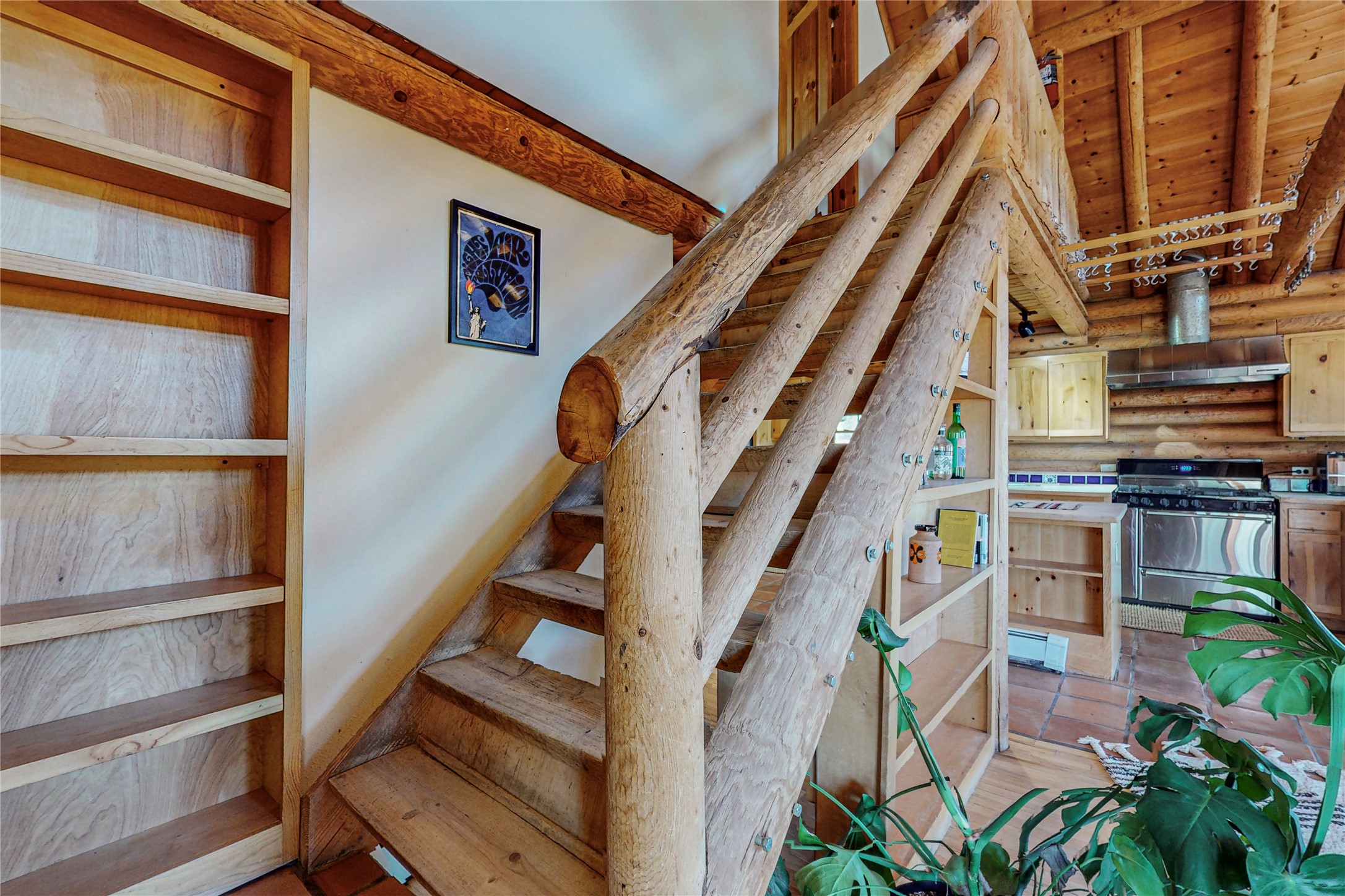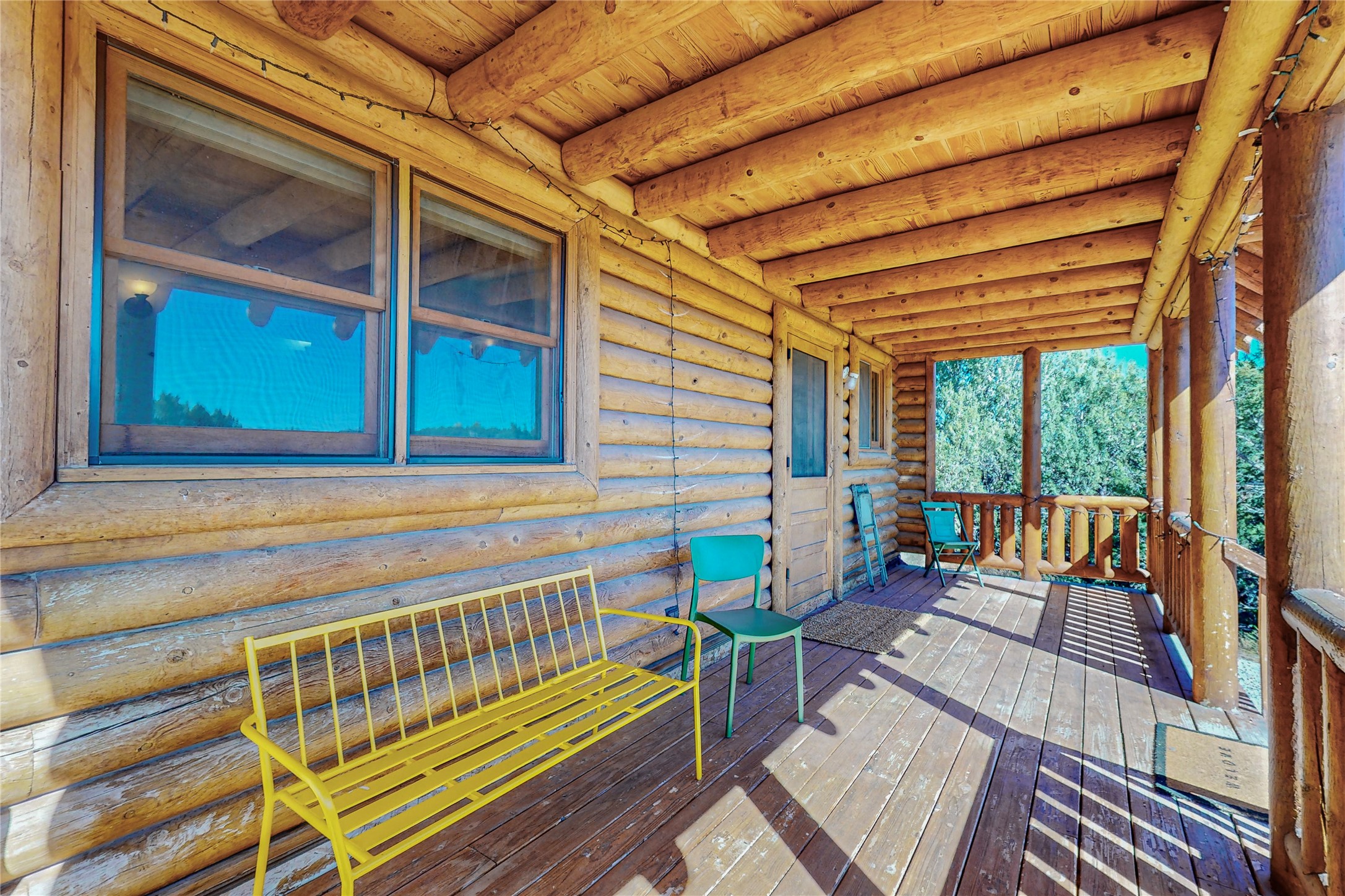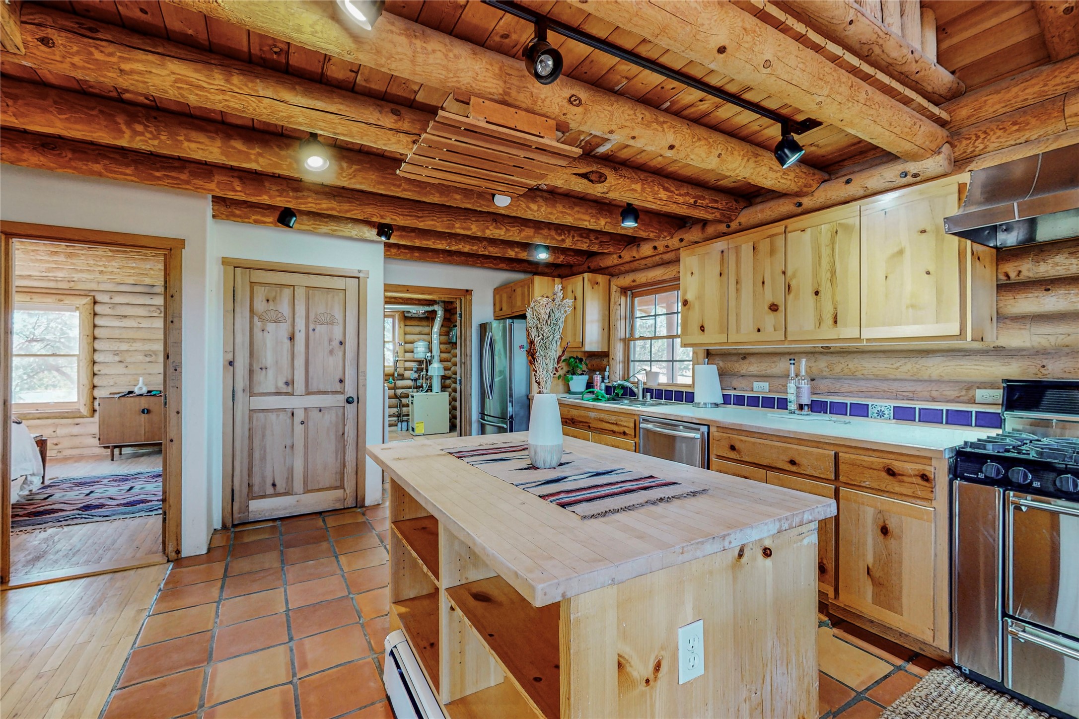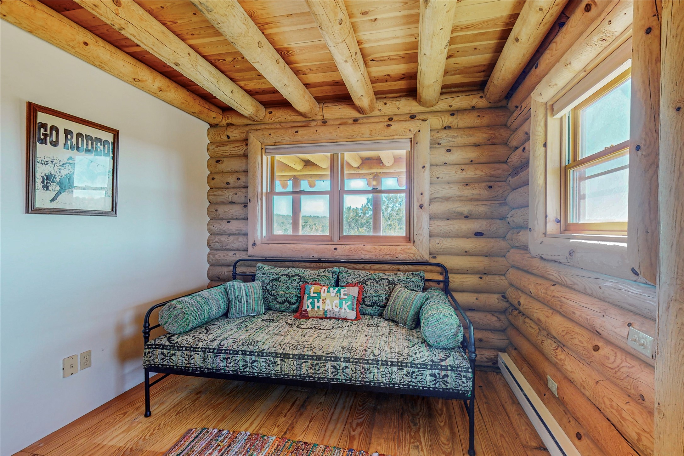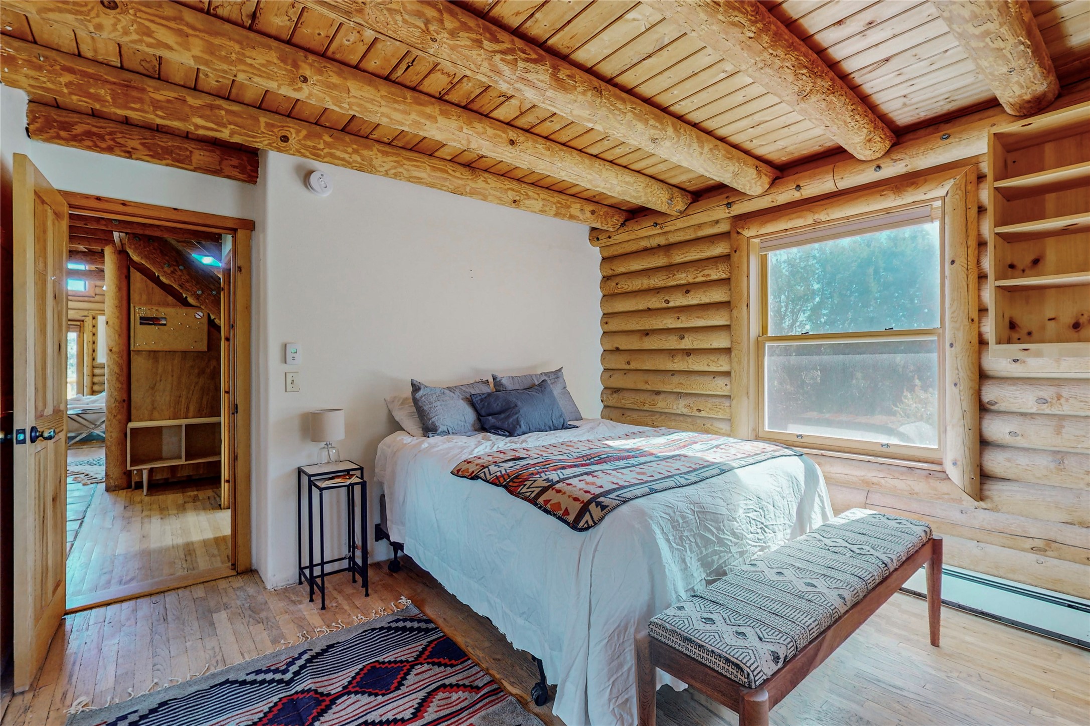 Discover this fantastic take on a large, modern custom log house and detached log guest house in beautiful La Tierra, Santa Fe. Nestled at the end of the famed Arroyo Calabasas Road, this combined 4 bedroom/ 3 bathroom, 2.5-acre property sits atop a hill with 360-degree mountain views and highlights new and old Santa Fe with horse farms, dirt roads, and fields of summer wildflowers. Rural yet only 10 minutes from downtown Santa Fe, the house is perfect for impressive entertaining in all 4 seasons with its sprawling open floor plan and huge back deck. Cozy yet spacious, the large modern kitchen overlooks the living room with high 2-story ceilings, floor-to-ceiling windows, exquisite wood detailing, and a stone fireplace. Three sets of French doors open to the wrap-around wood deck. The back stairs open to a lofted hallway and enclosed a large master bedroom and full bath, with the second bedroom and bathroom on the main floor. A finished south-facing sun room with a passive solar window provides a multi-use space. Both the main and guest houses highlight open floor plans, original wood floors, and high ceilings. The guest house has 2 bedrooms, a full bathroom, and its own laundry space. The previous owner ran a very successful Airbnb in the guest house, grossing over 40k per year for 5 years. This unique property is in a private, peaceful enclave in a close-knit community of friendly individuals who care greatly about preserving the old New Mexico environment and continuously lobby to keep this neighborhood free from excessive development.
