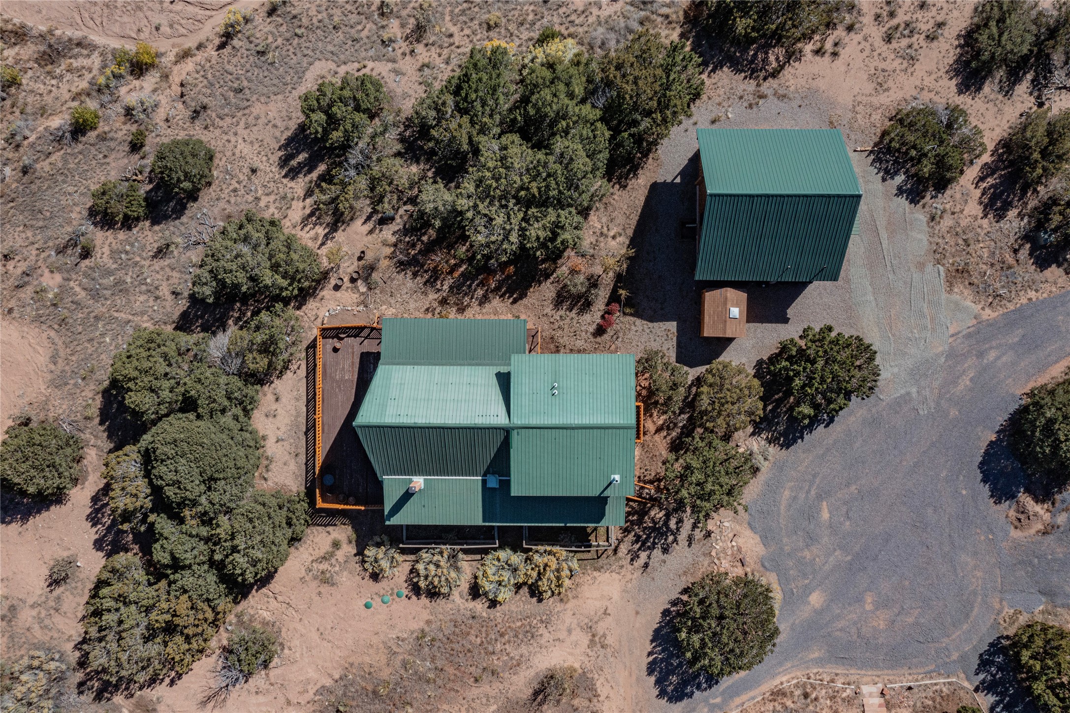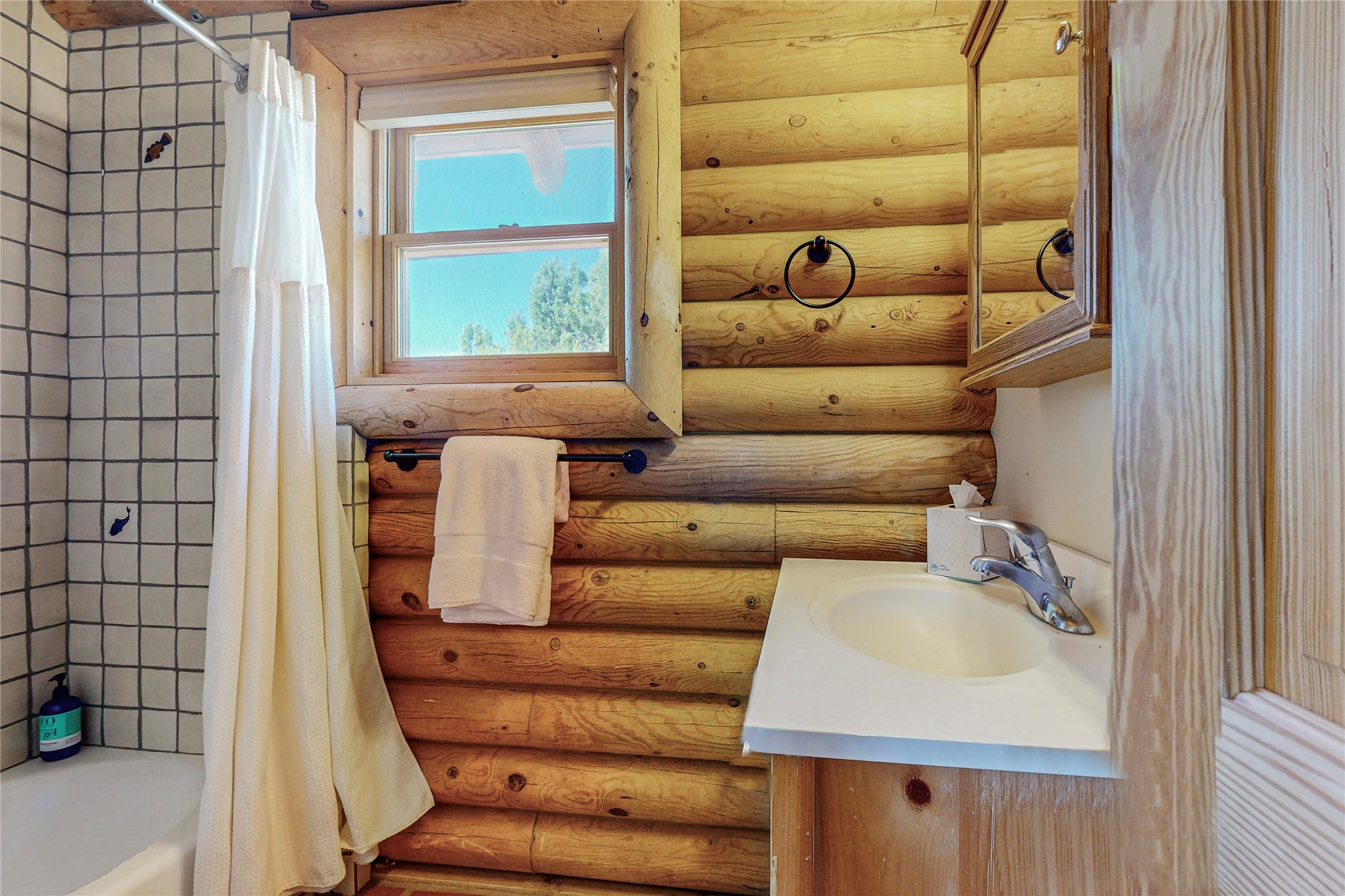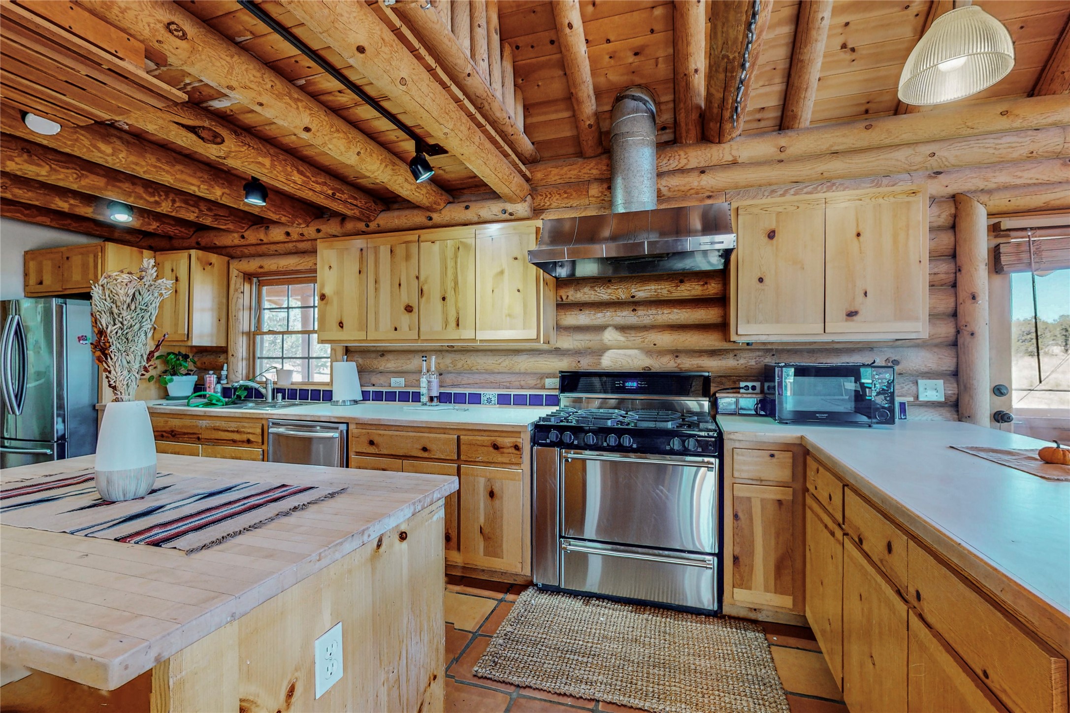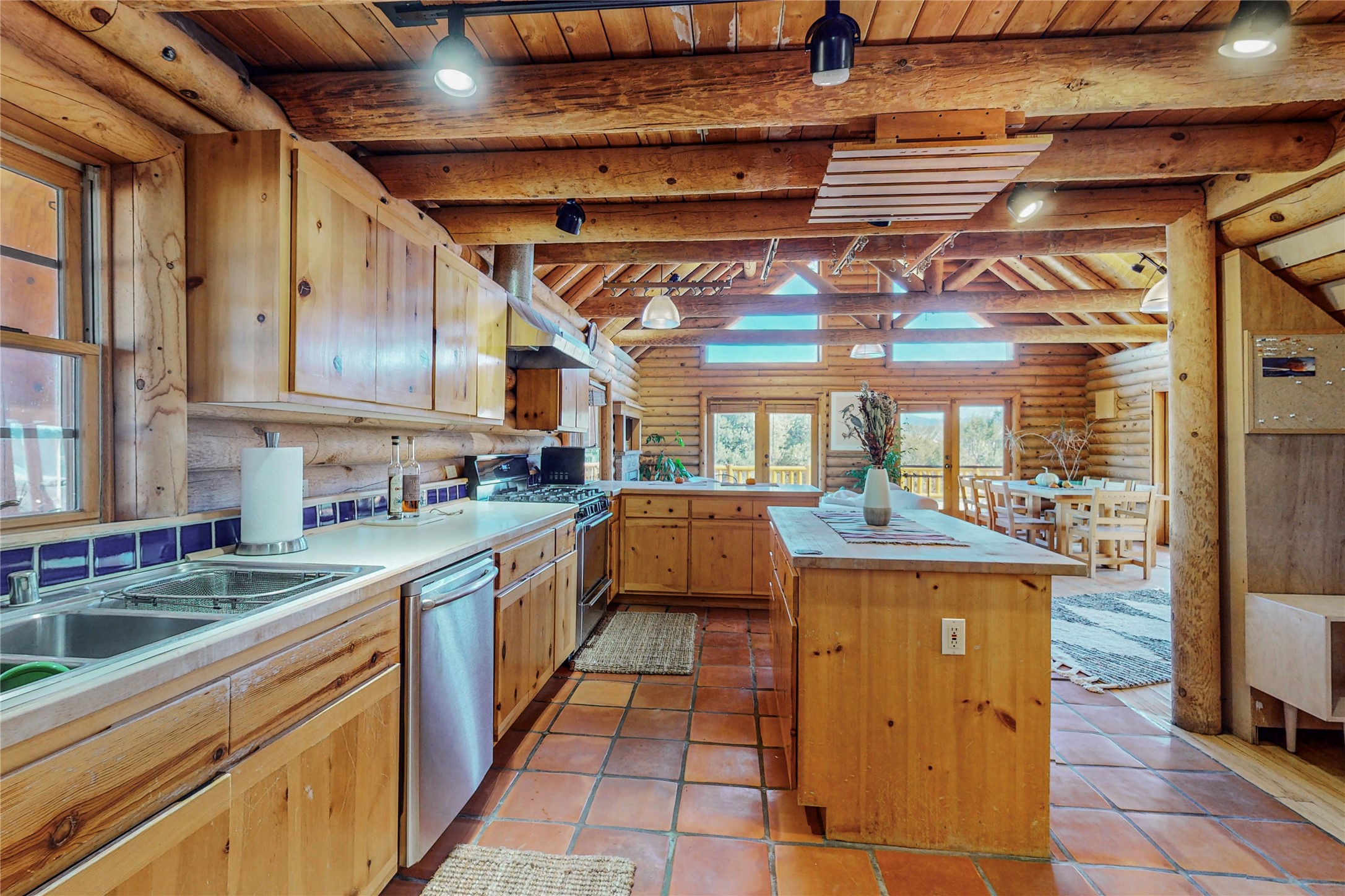 Discover this fantastic take on a large, modern custom log house and detached log guest house in beautiful La Tierra, Santa Fe. Nestled at the end of the famed Arroyo Calabasas Road, this combined 4 bedroom/ 3 bathroom, 2.5-acre property sits atop a hill with 360-degree mountain views and highlights new and old Santa Fe with horse farms, dirt roads, and fields of summer wildflowers. Rural yet only 10 minutes from downtown Santa Fe, the house is perfect for impressive entertaining in all 4 seasons with its sprawling open floor plan and huge back deck. Cozy yet spacious, the large modern kitchen overlooks the living room with high 2-story ceilings, floor-to-ceiling windows, exquisite wood detailing, and a stone fireplace. Three sets of French doors open to the wrap-around wood deck. The back stairs open to a lofted hallway and enclosed a large master bedroom and full bath, with the second bedroom and bathroom on the main floor. A finished south-facing sun room with a passive solar window provides a multi-use space. Both the main and guest houses highlight open floor plans, original wood floors, and high ceilings. The guest house has 2 bedrooms, a full bathroom, and its own laundry space. The previous owner ran a very successful Airbnb in the guest house, grossing over 40k per year for 5 years. This unique property is in a private, peaceful enclave in a close-knit community of friendly individuals who care greatly about preserving the old New Mexico environment and continuously lobby to keep this neighborhood free from excessive development.