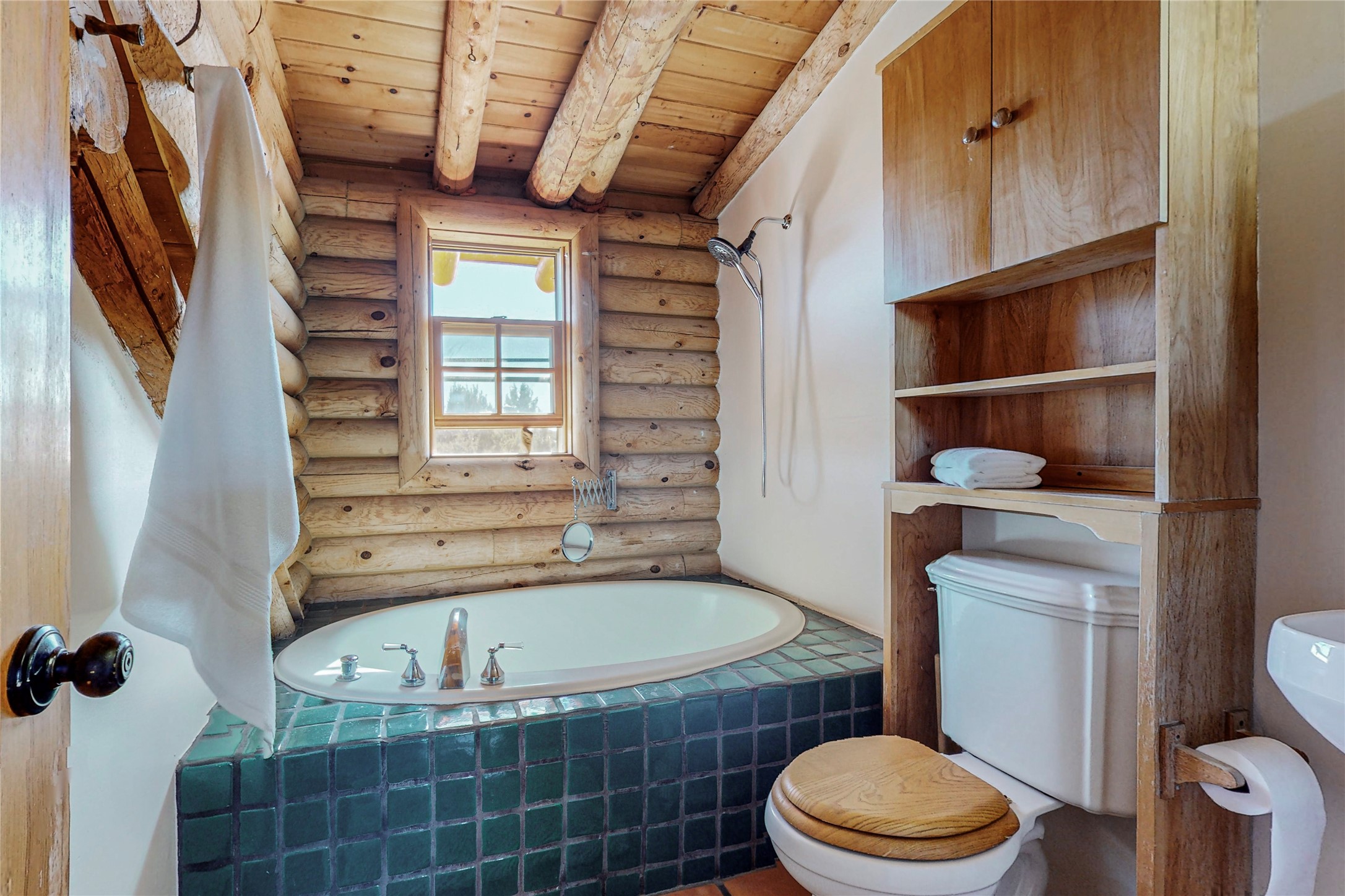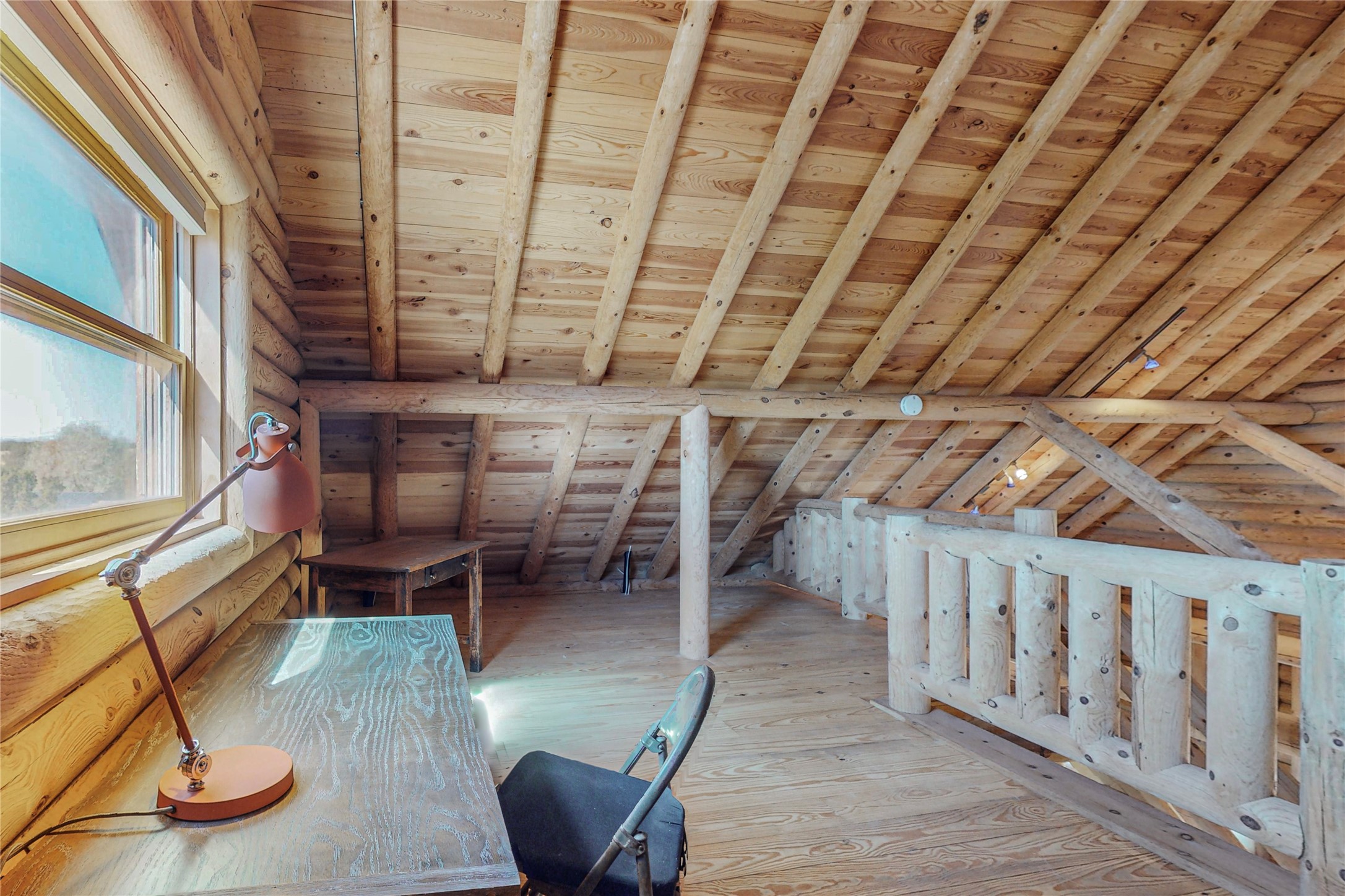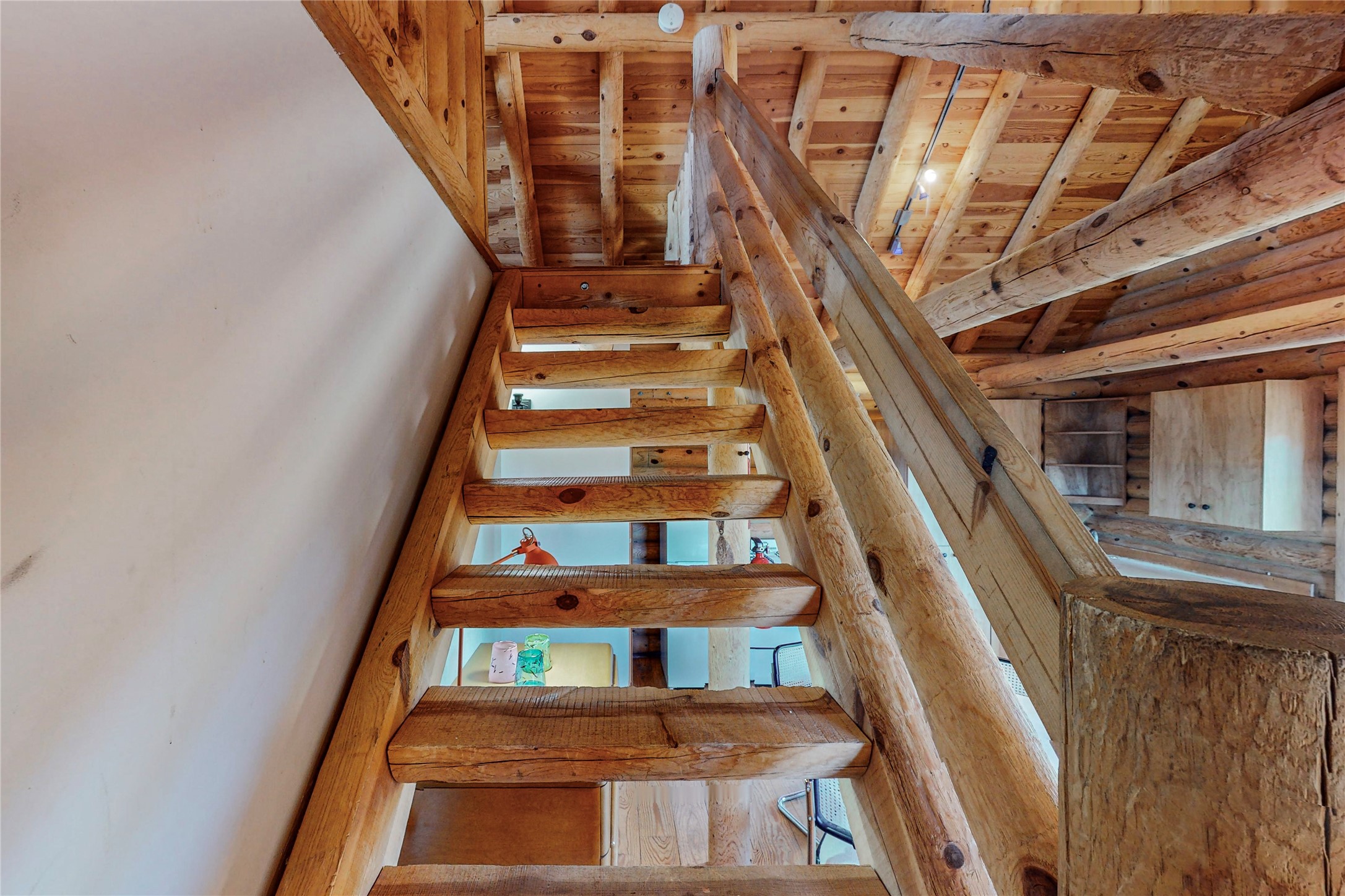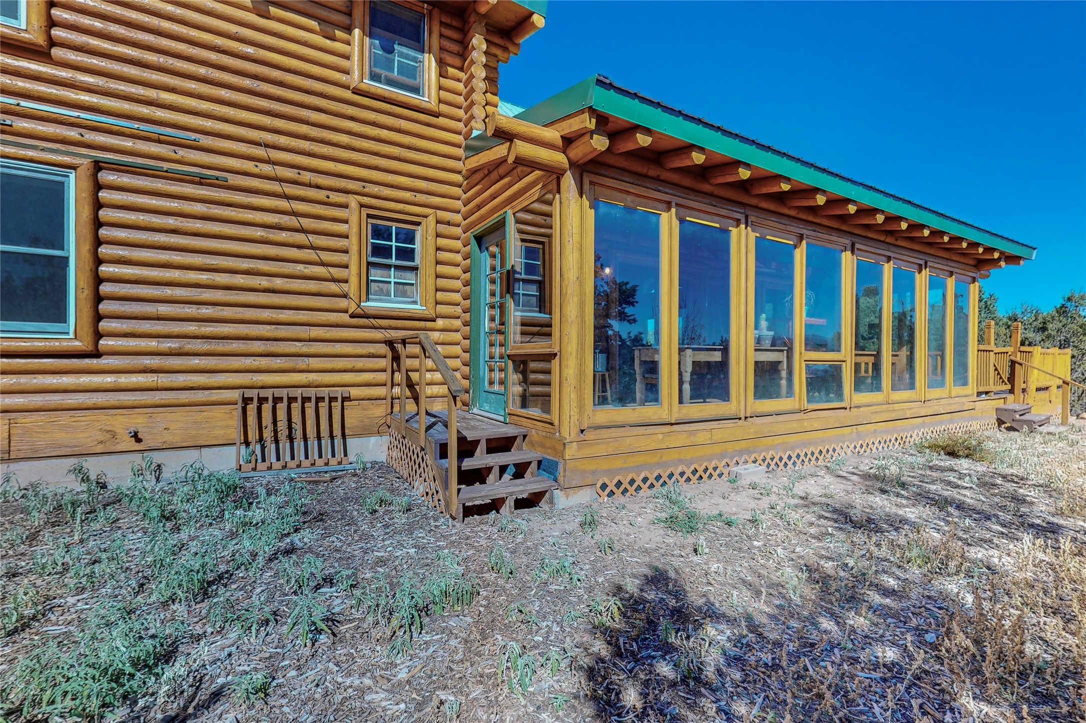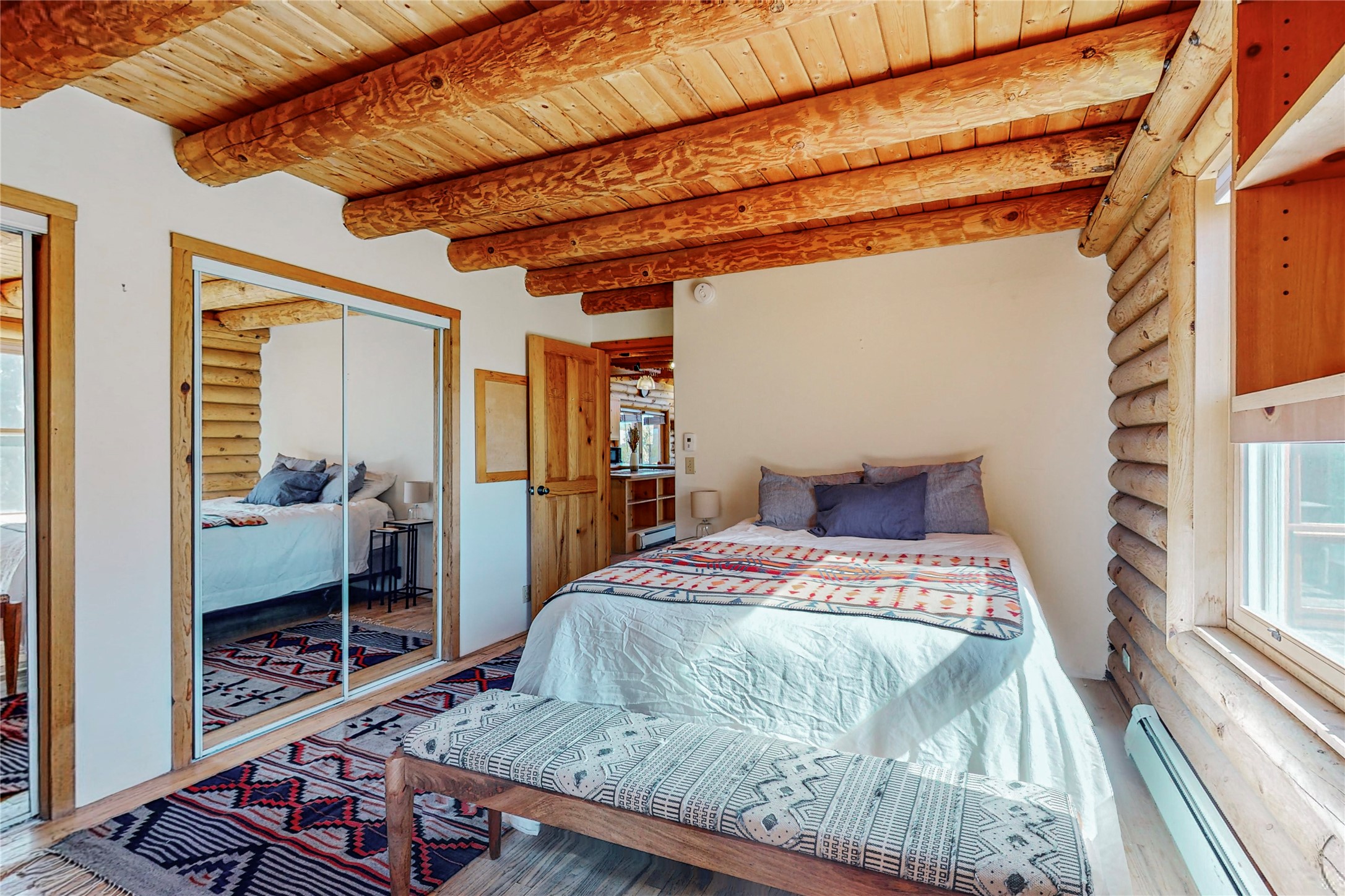 Discover this fantastic take on a large, modern custom log house and detached log guest house in beautiful La Tierra, Santa Fe. Nestled at the end of the famed Arroyo Calabasas Road, this combined 4 bedroom/ 3 bathroom, 2.5-acre property sits atop a hill with 360-degree mountain views and highlights new and old Santa Fe with horse farms, dirt roads, and fields of summer wildflowers. Rural yet only 10 minutes from downtown Santa Fe, the house is perfect for impressive entertaining in all 4 seasons with its sprawling open floor plan and huge back deck. Cozy yet spacious, the large modern kitchen overlooks the living room with high 2-story ceilings, floor-to-ceiling windows, exquisite wood detailing, and a stone fireplace. Three sets of French doors open to the wrap-around wood deck. The back stairs open to a lofted hallway and enclosed a large master bedroom and full bath, with the second bedroom and bathroom on the main floor. A finished south-facing sun room with a passive solar window provides a multi-use space. Both the main and guest houses highlight open floor plans, original wood floors, and high ceilings. The guest house has 2 bedrooms, a full bathroom, and its own laundry space. The previous owner ran a very successful Airbnb in the guest house, grossing over 40k per year for 5 years. This unique property is in a private, peaceful enclave in a close-knit community of friendly individuals who care greatly about preserving the old New Mexico environment and continuously lobby to keep this neighborhood free from excessive development.