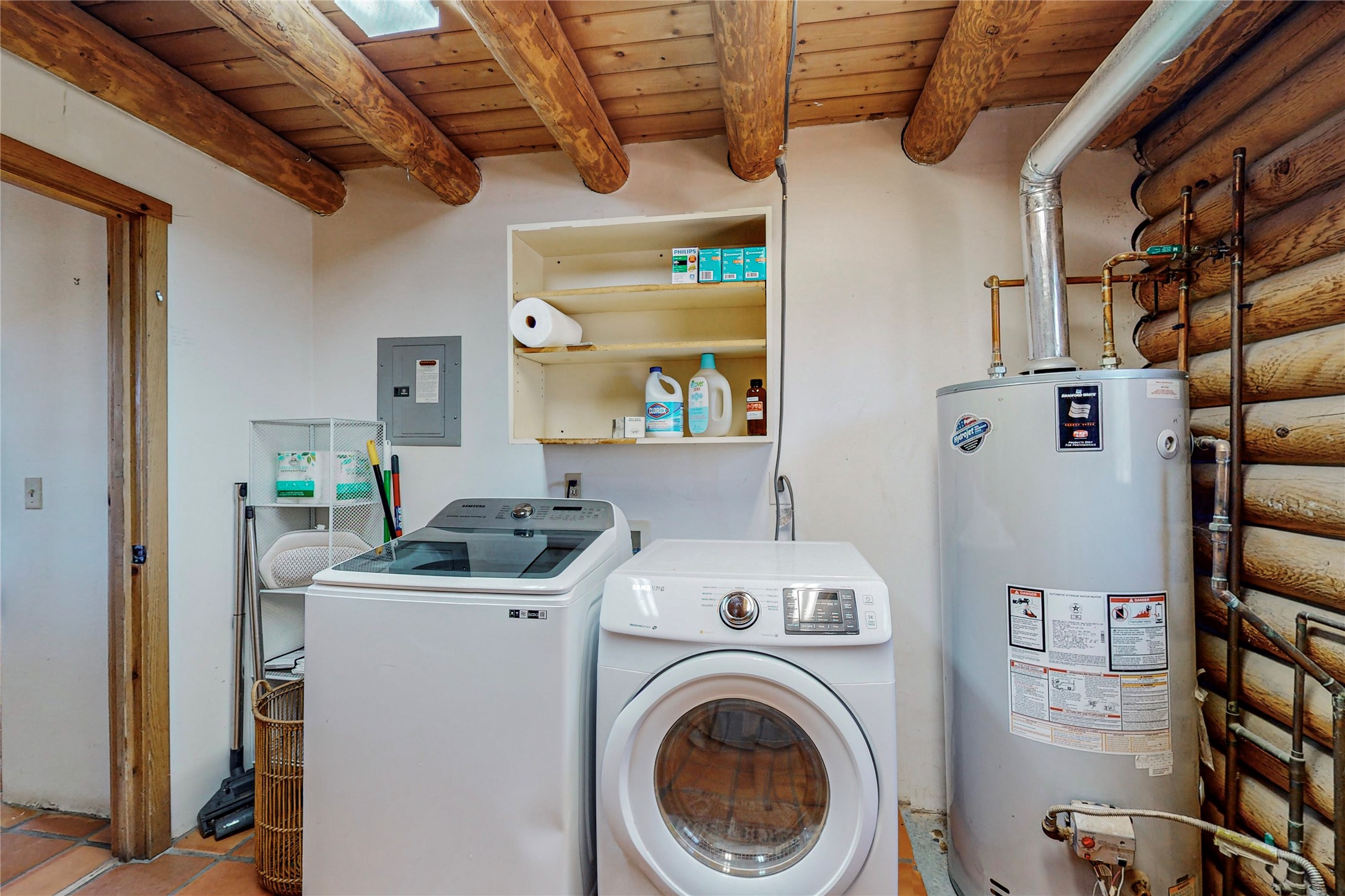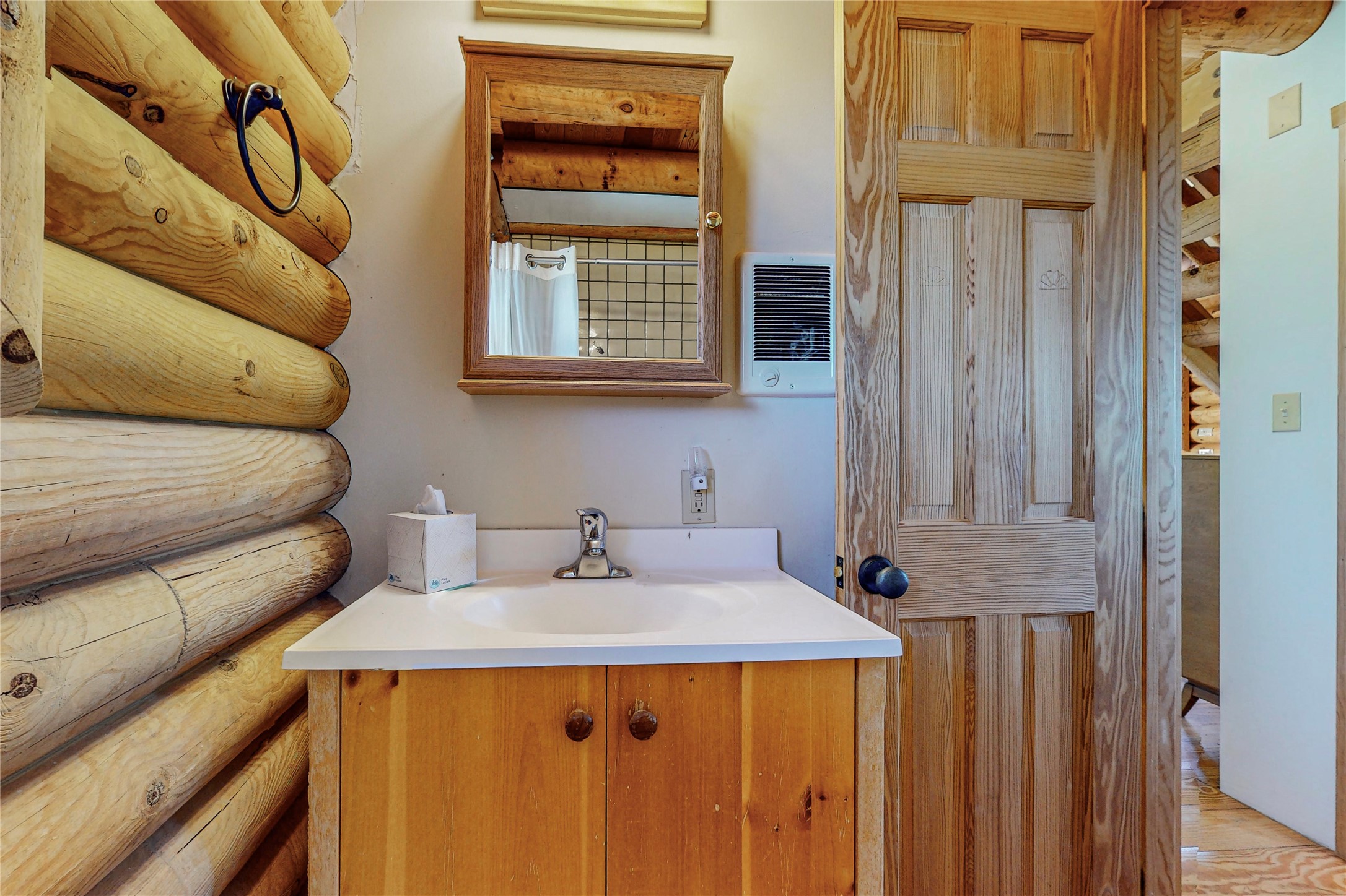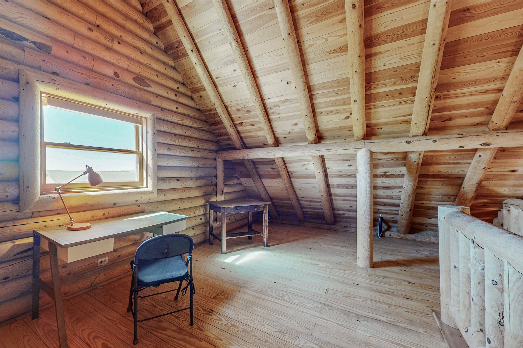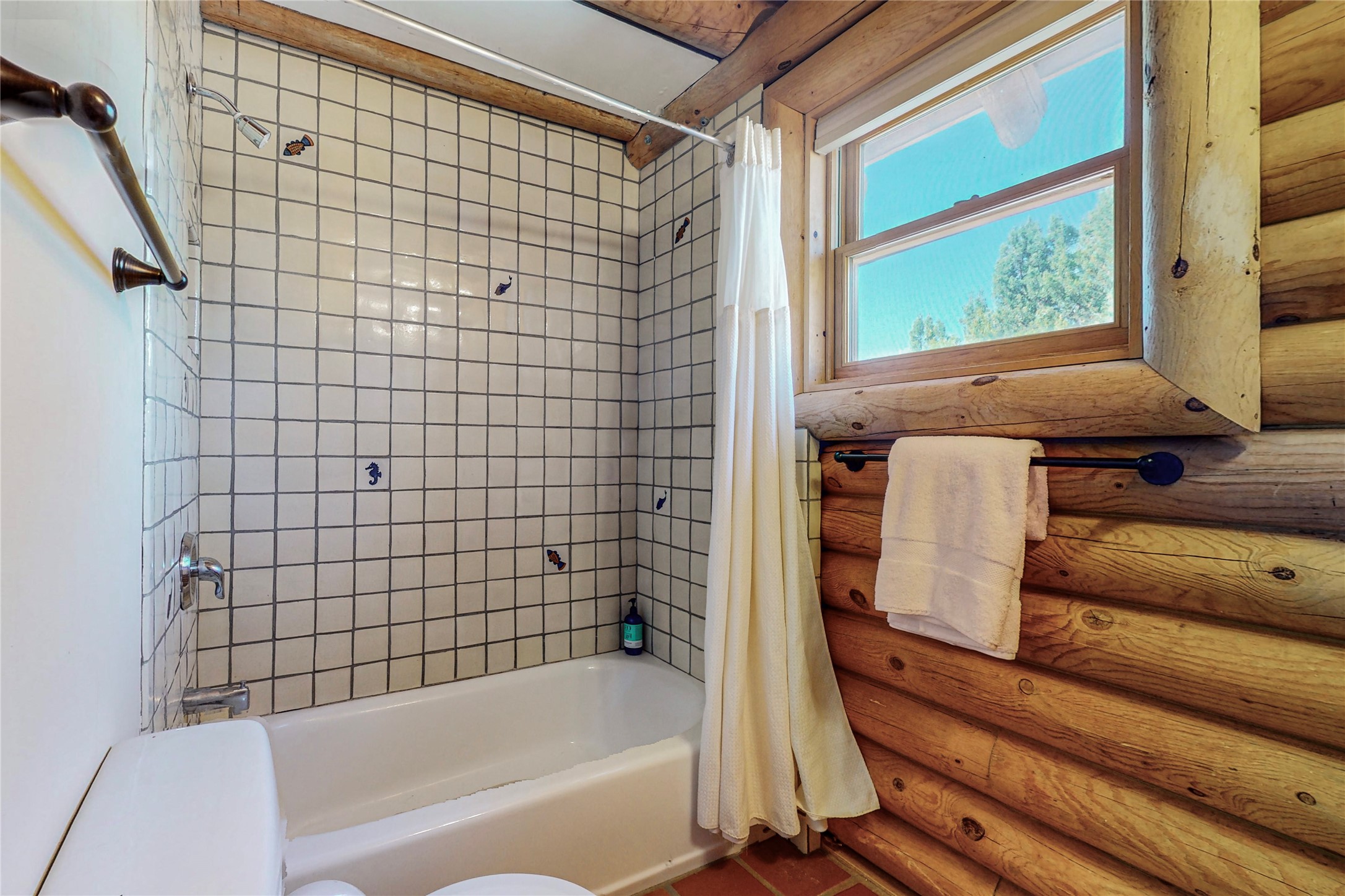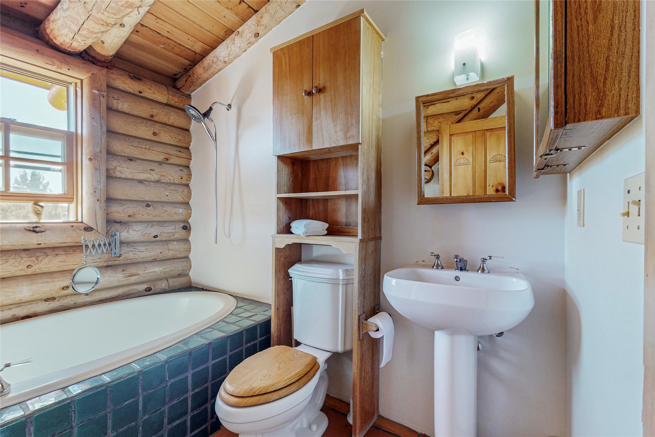 Discover this fantastic take on a large, modern custom log house and detached log guest house in beautiful La Tierra, Santa Fe. Nestled at the end of the famed Arroyo Calabasas Road, this combined 4 bedroom/ 3 bathroom, 2.5-acre property sits atop a hill with 360-degree mountain views and highlights new and old Santa Fe with horse farms, dirt roads, and fields of summer wildflowers. Rural yet only 10 minutes from downtown Santa Fe, the house is perfect for impressive entertaining in all 4 seasons with its sprawling open floor plan and huge back deck. Cozy yet spacious, the large modern kitchen overlooks the living room with high 2-story ceilings, floor-to-ceiling windows, exquisite wood detailing, and a stone fireplace. Three sets of French doors open to the wrap-around wood deck. The back stairs open to a lofted hallway and enclosed a large master bedroom and full bath, with the second bedroom and bathroom on the main floor. A finished south-facing sun room with a passive solar window provides a multi-use space. Both the main and guest houses highlight open floor plans, original wood floors, and high ceilings. The guest house has 2 bedrooms, a full bathroom, and its own laundry space. The previous owner ran a very successful Airbnb in the guest house, grossing over 40k per year for 5 years. This unique property is in a private, peaceful enclave in a close-knit community of friendly individuals who care greatly about preserving the old New Mexico environment and continuously lobby to keep this neighborhood free from excessive development.