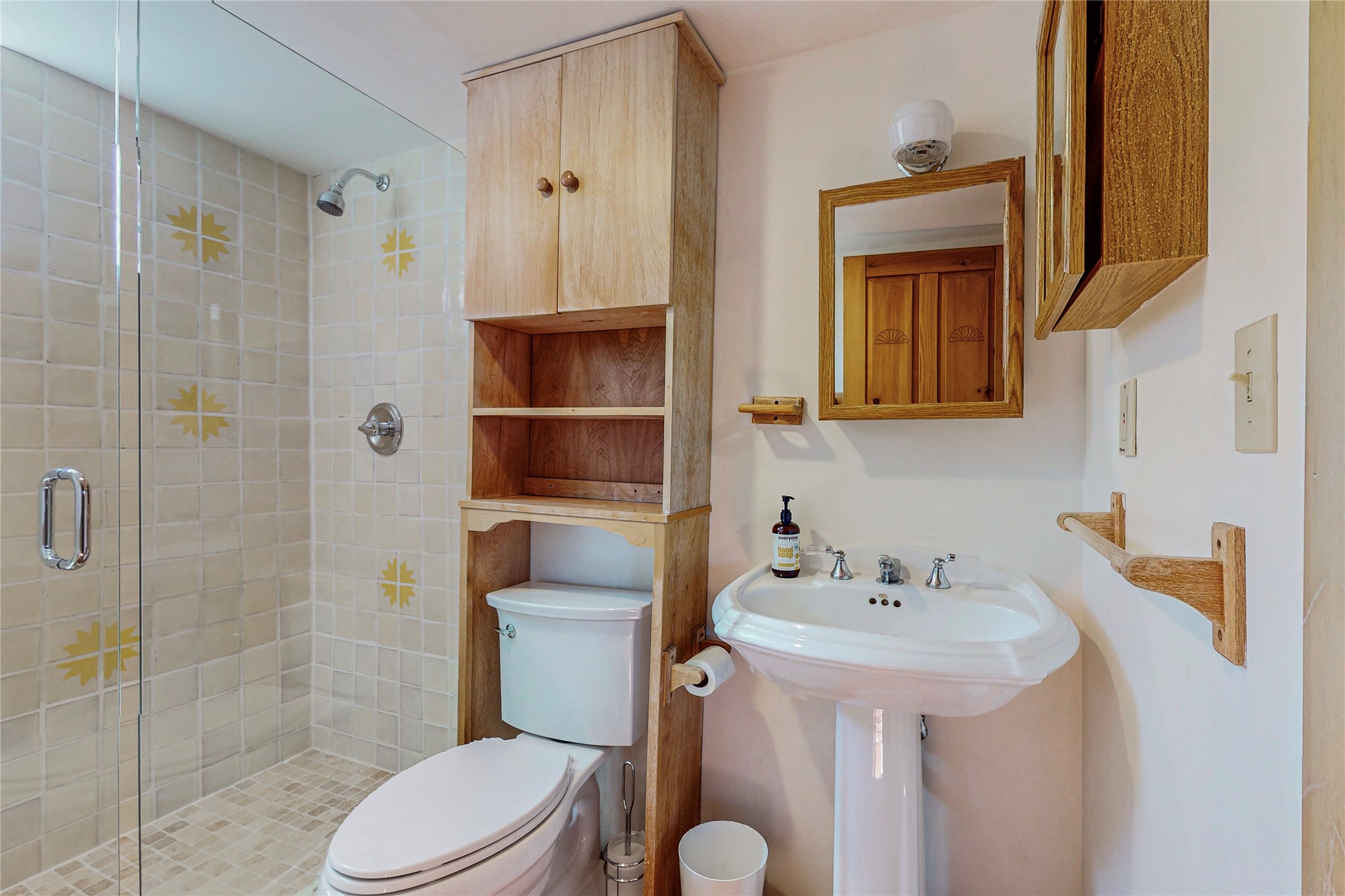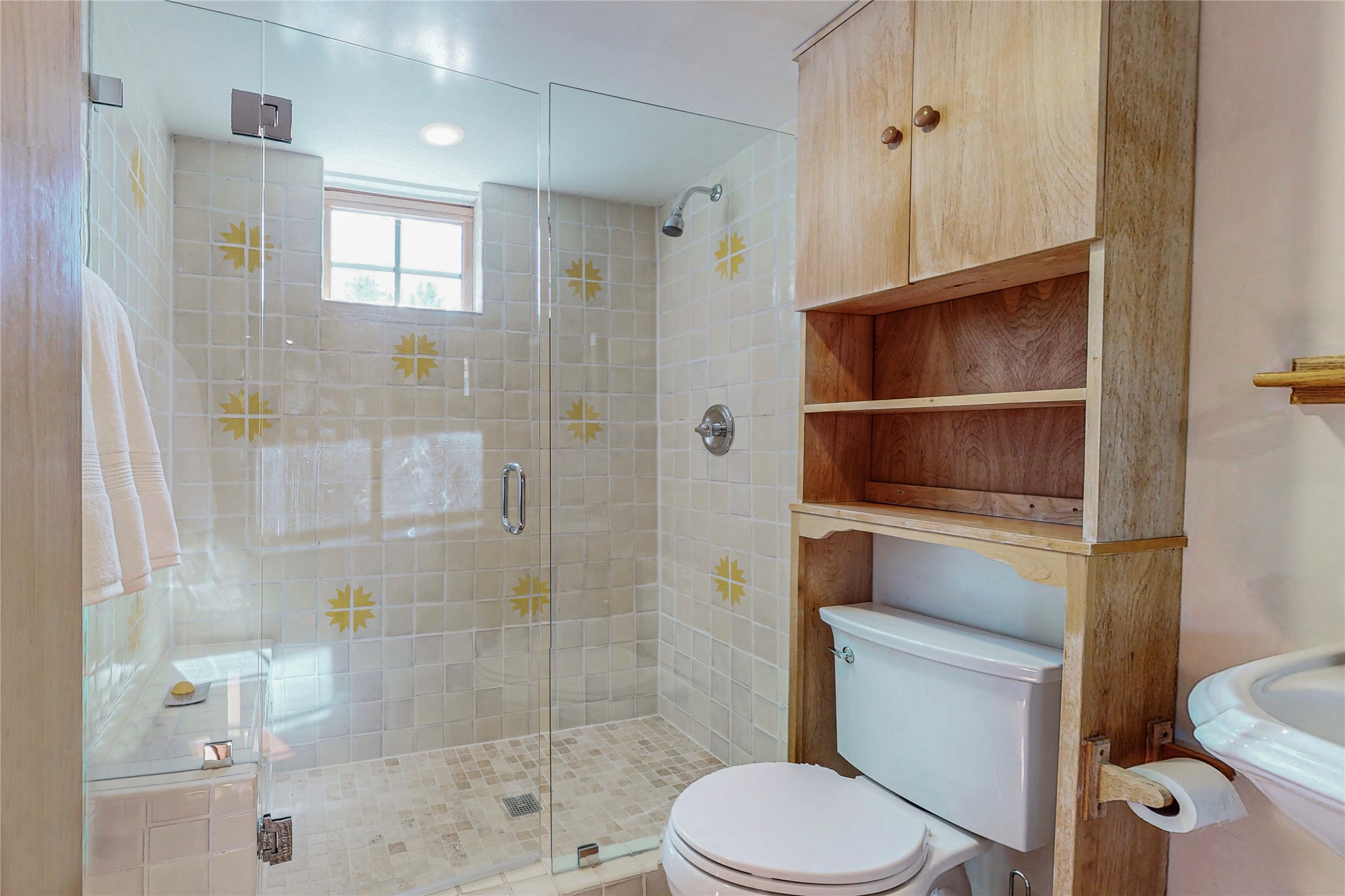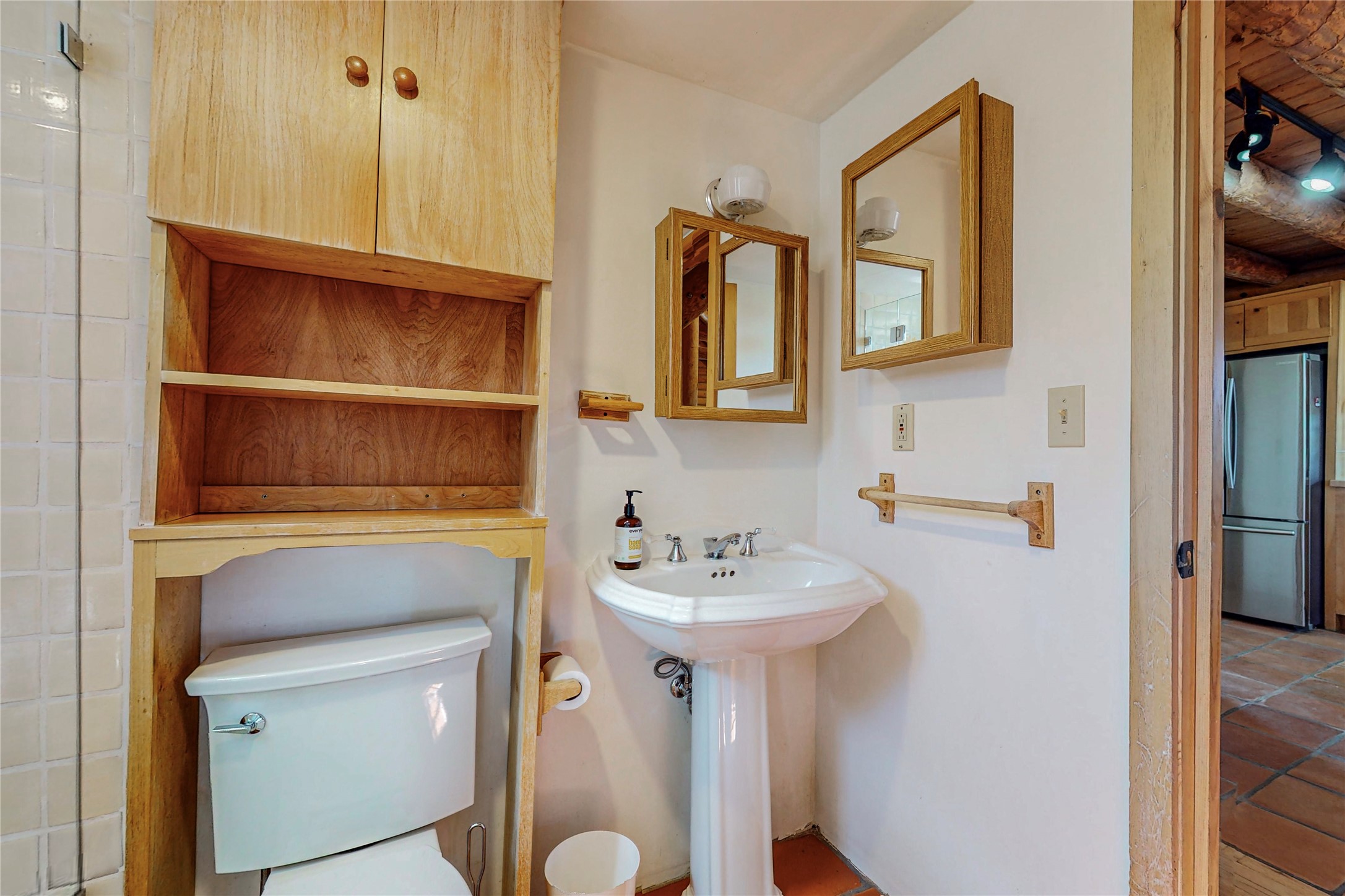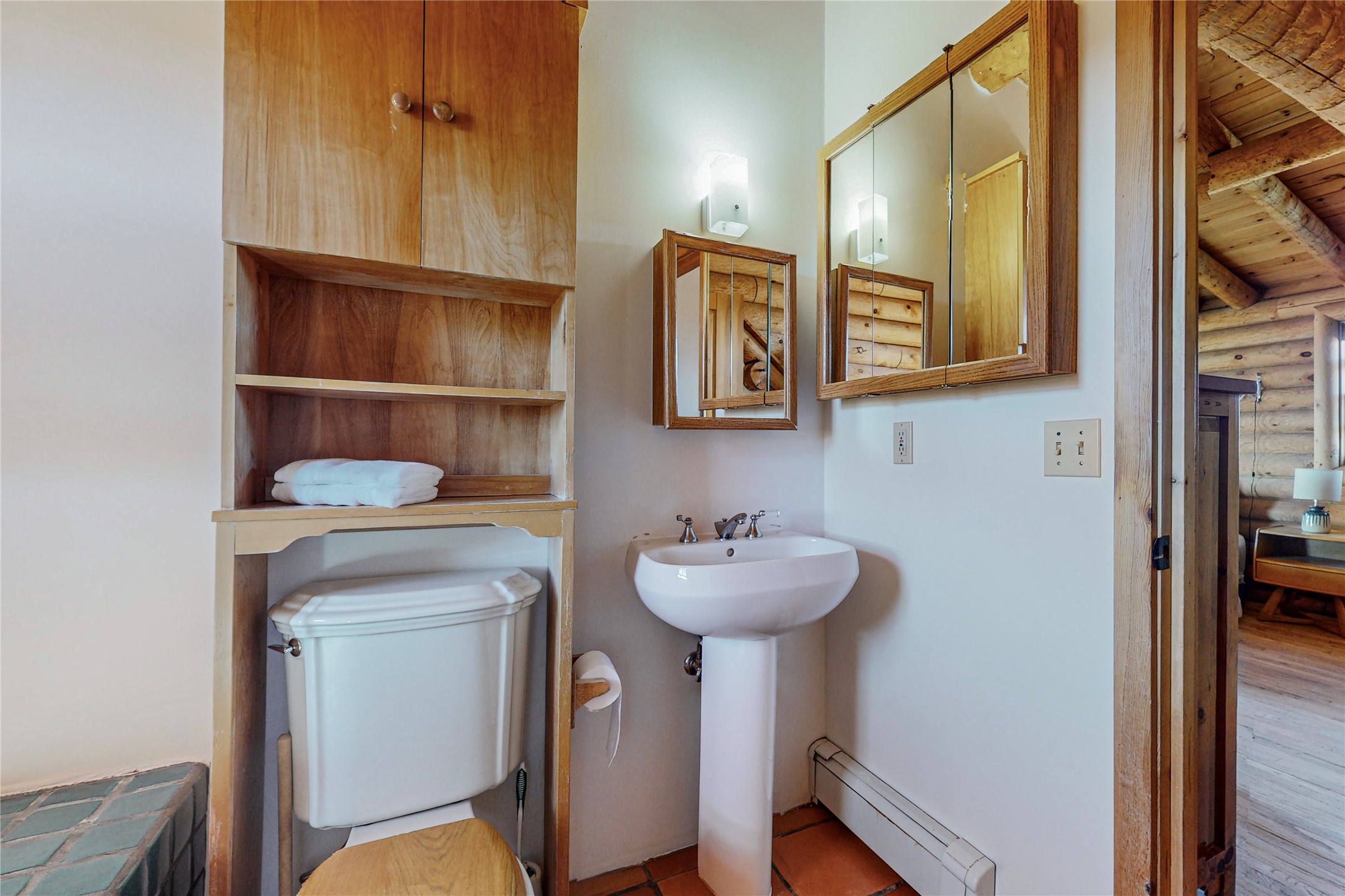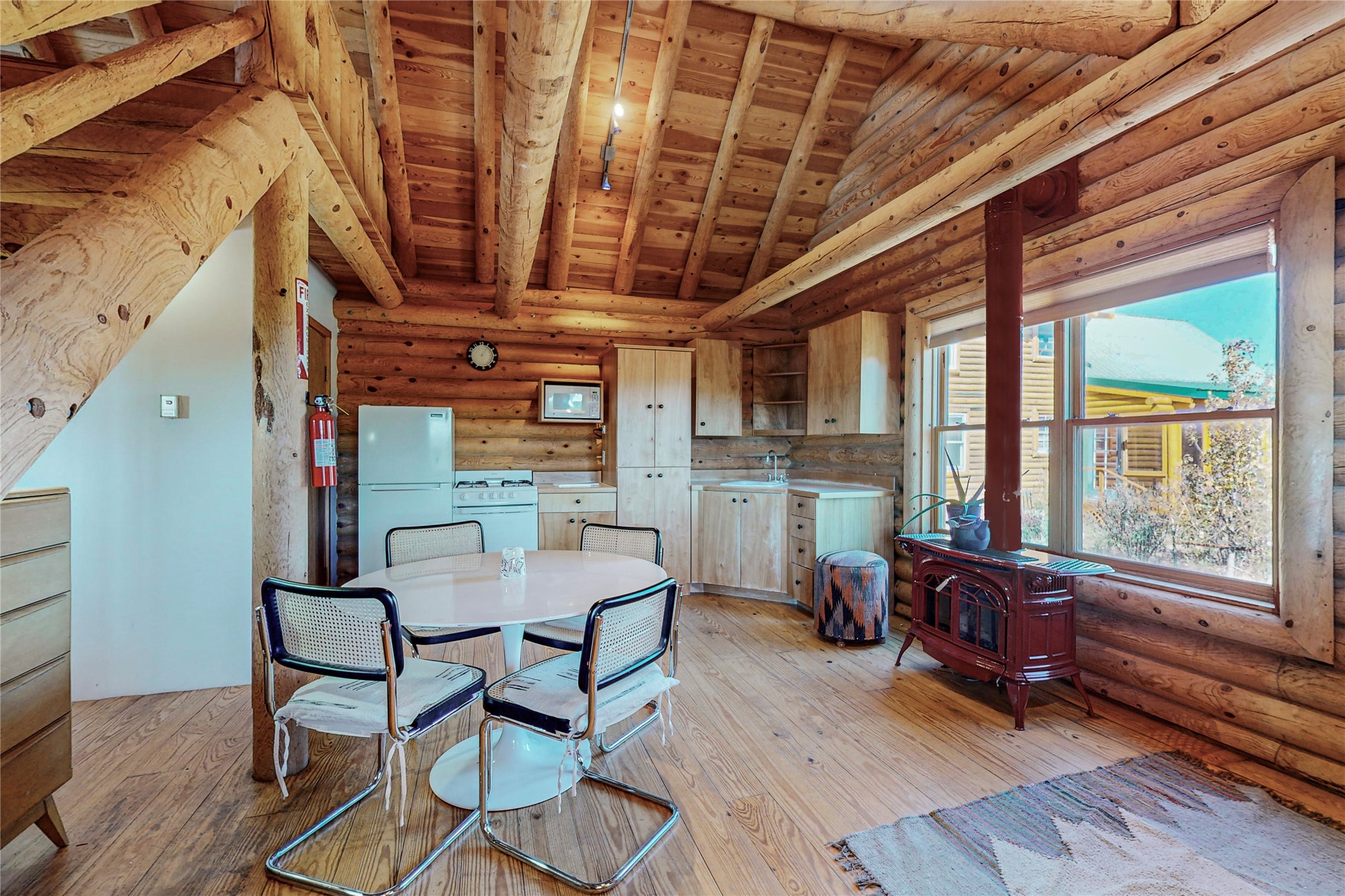 Discover this fantastic take on a large, modern custom log house and detached log guest house in beautiful La Tierra, Santa Fe. Nestled at the end of the famed Arroyo Calabasas Road, this combined 4 bedroom/ 3 bathroom, 2.5-acre property sits atop a hill with 360-degree mountain views and highlights new and old Santa Fe with horse farms, dirt roads, and fields of summer wildflowers. Rural yet only 10 minutes from downtown Santa Fe, the house is perfect for impressive entertaining in all 4 seasons with its sprawling open floor plan and huge back deck. Cozy yet spacious, the large modern kitchen overlooks the living room with high 2-story ceilings, floor-to-ceiling windows, exquisite wood detailing, and a stone fireplace. Three sets of French doors open to the wrap-around wood deck. The back stairs open to a lofted hallway and enclosed a large master bedroom and full bath, with the second bedroom and bathroom on the main floor. A finished south-facing sun room with a passive solar window provides a multi-use space. Both the main and guest houses highlight open floor plans, original wood floors, and high ceilings. The guest house has 2 bedrooms, a full bathroom, and its own laundry space. The previous owner ran a very successful Airbnb in the guest house, grossing over 40k per year for 5 years. This unique property is in a private, peaceful enclave in a close-knit community of friendly individuals who care greatly about preserving the old New Mexico environment and continuously lobby to keep this neighborhood free from excessive development.
