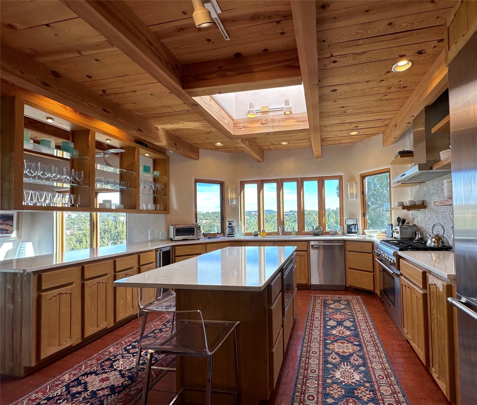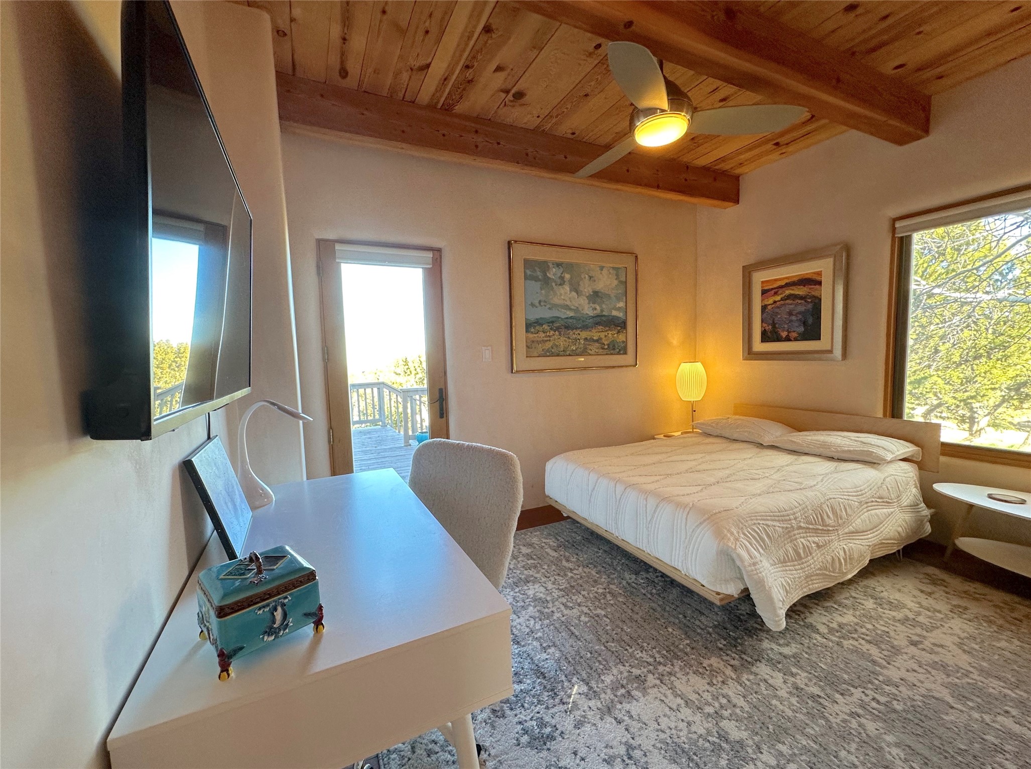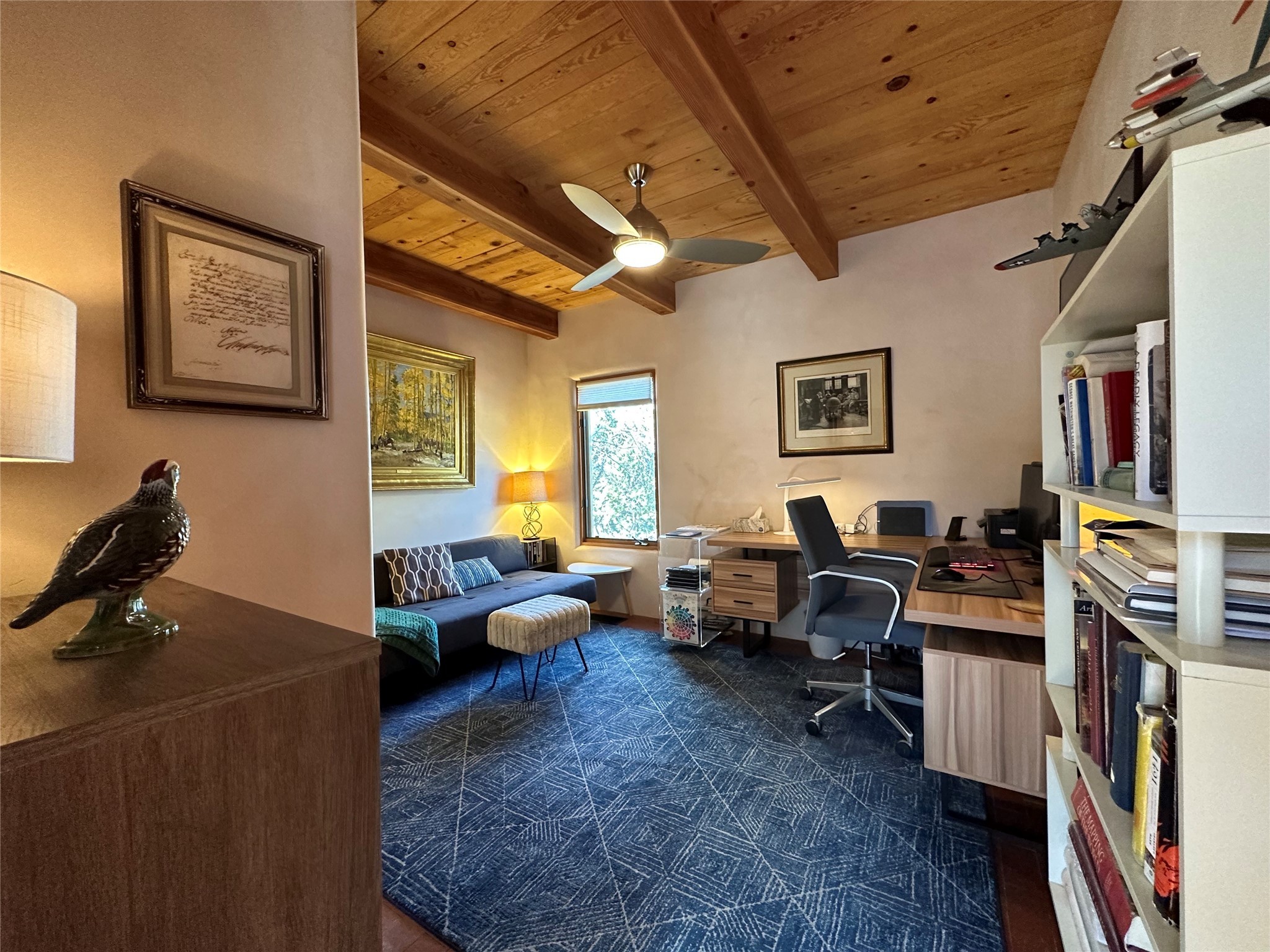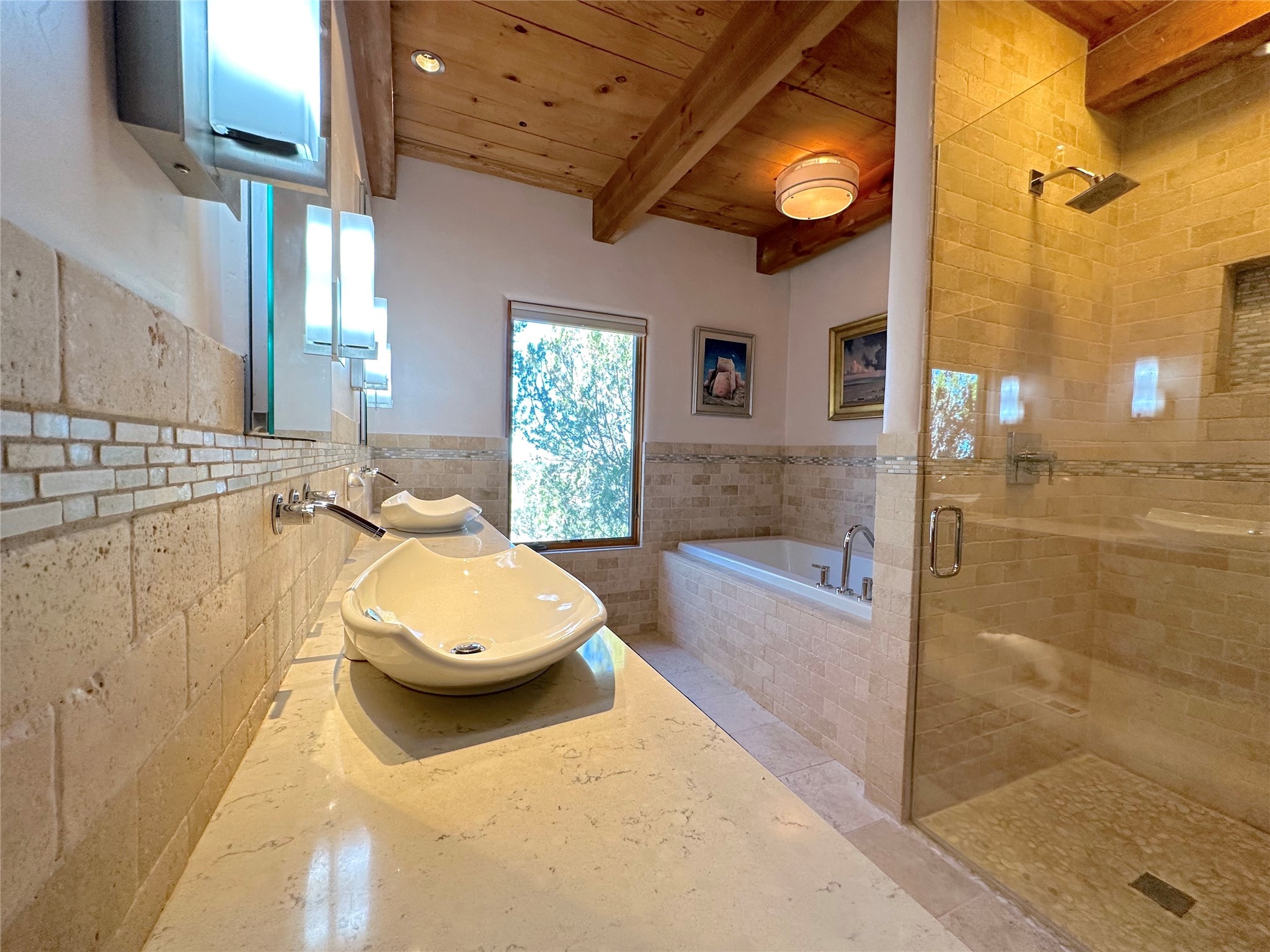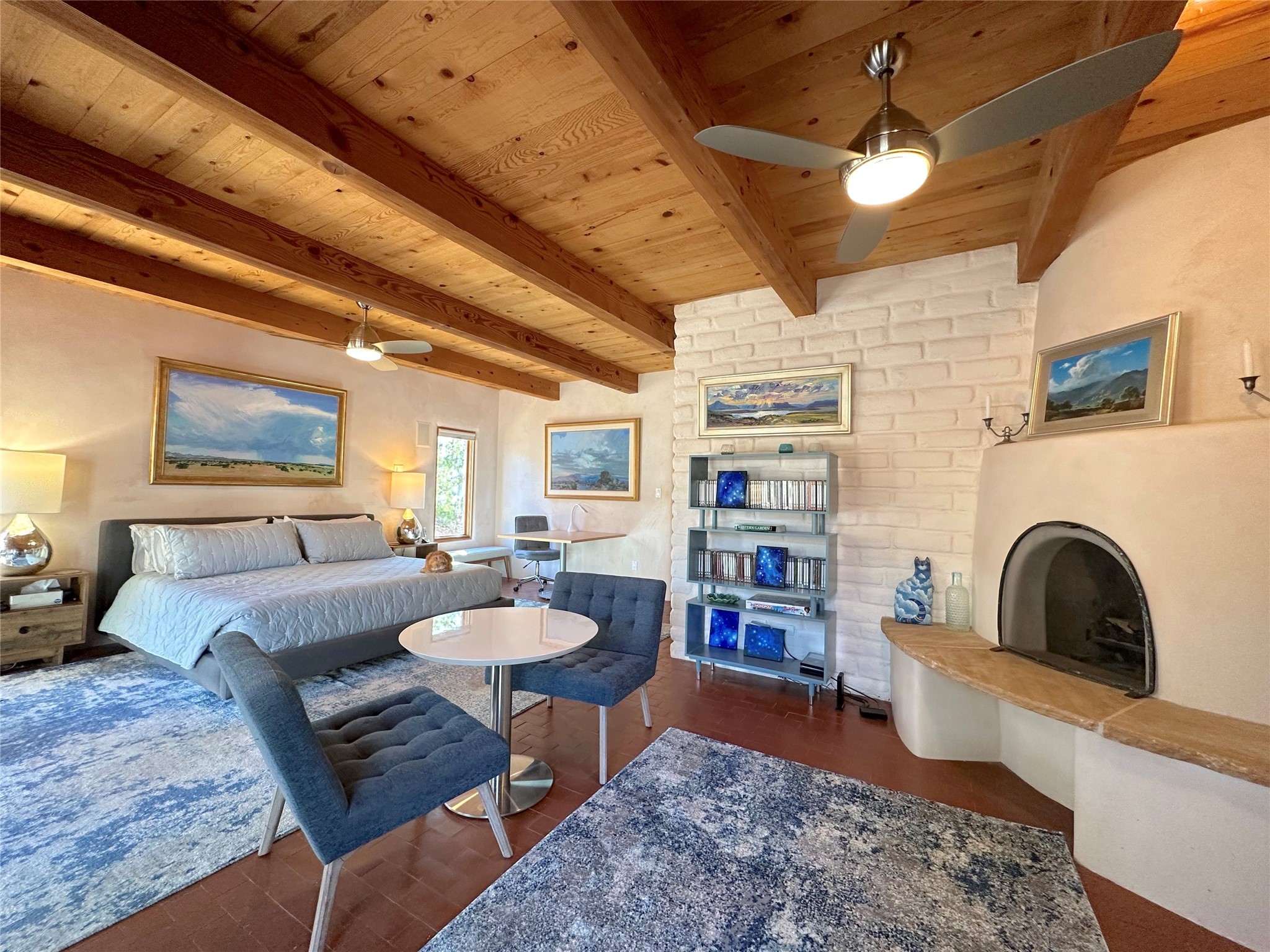 Elegant Santa Fe home custom designed and built in 1998 by Evans nestled in a park like setting on over 3 treed acres. This open plan design opens to the glorious naturally landscaped treed surroundings offering wildlife viewing from every window. Exquisite Santa Fe detailing throughout the interior spaces featuring high ceilings, adobe accent walls, corbelled beams, hand carved nichos and 3 traditional kiva fireplaces. Embued with ambience and character this is a one of a kind home. Tastefully remodeled in 2014 including new stucco, new high efficiency boiler for the natural gas radiant heating(pex tubing), new kitchen and baths. A new on demand hotwater heater in 2020. Roof, patio doors and windows carefully maintained with some replaced as needed. Two septic tanks for greywater and blackwater systems in place and managed. Lovely gated courtyard entry to greet your guests and a lovely flagstone patio spills out to the land to the rear. Horses are allowed on this lot although currently just deer and other wildlife roams freely! A 3 car garage for all the toys or studio space. Ideally located close to local community amenities and shopping and only minutes into Santa Fe