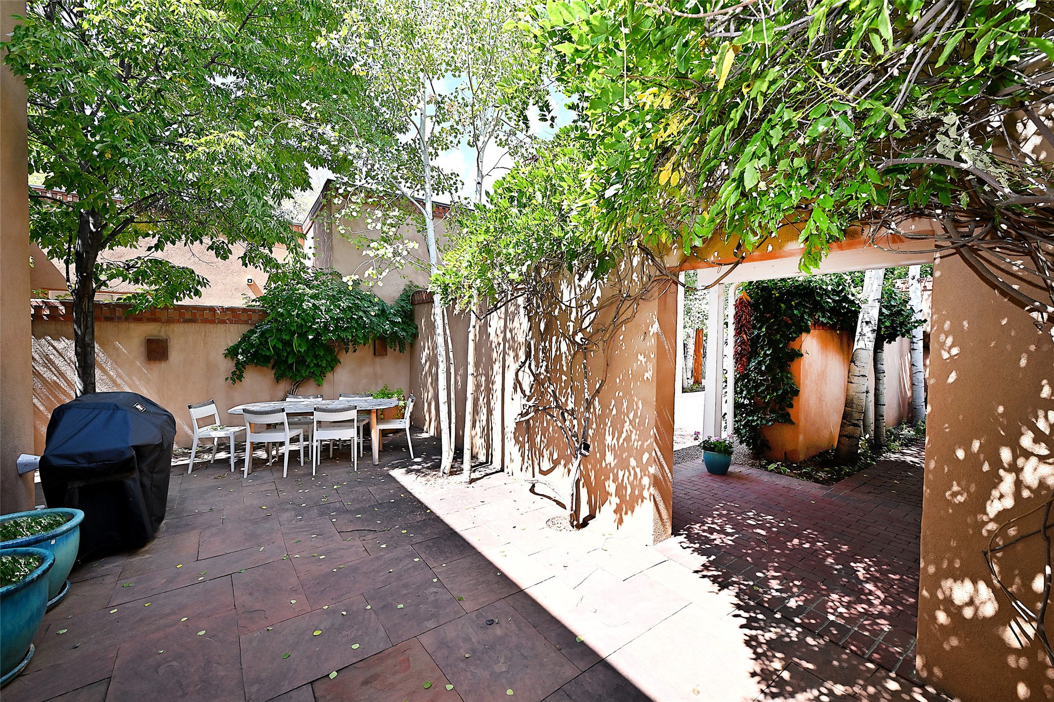 A unique opportunity to own a 3 bedroom 2.5 bath New Mexico Territorial style home in the Historic Eastside. Built in 2006 on a private lane. Single level, no interior steps. Inviting layout with wood flooring throughout. Open concept living and dining with warm, wooden beams and fireplace with brick surround. Sleek, modern kitchen is appointed with recessed lighting, double sink, a 6-burner gas range and plentiful cabinetry. Split bedroom plan for privacy. Primary suite has access to an outdoor courtyard, dual walk-in closets and an ensuite bath. Several private patio areas expand options for entertaining and dining. Central cooling system and radiant heating. There are 2 off-street designated parking spaces - an important feature in this limited Eastside location. Close to Downtown Subscription, Kaune's Neighborhood Market, and Canyon Road.