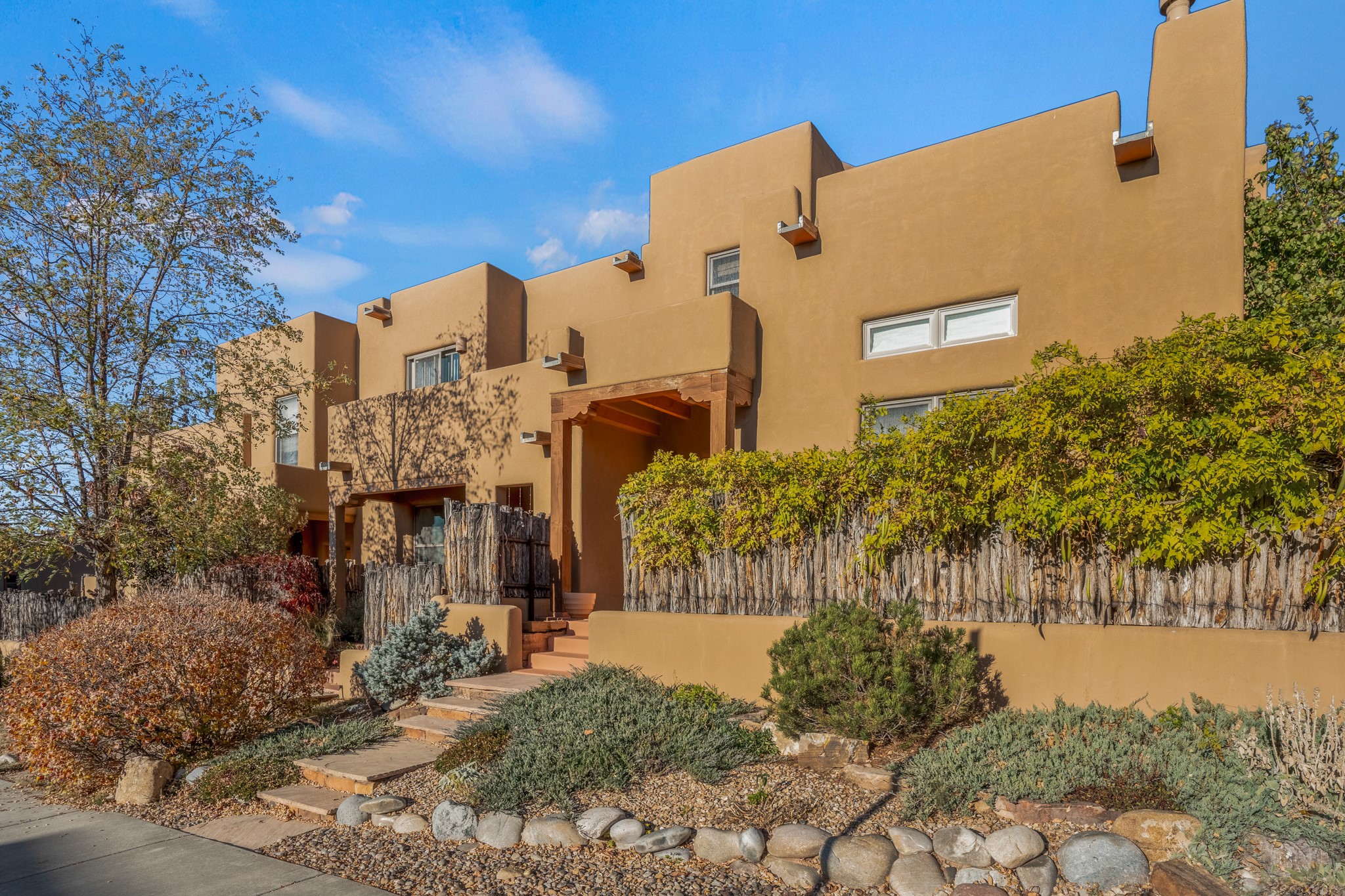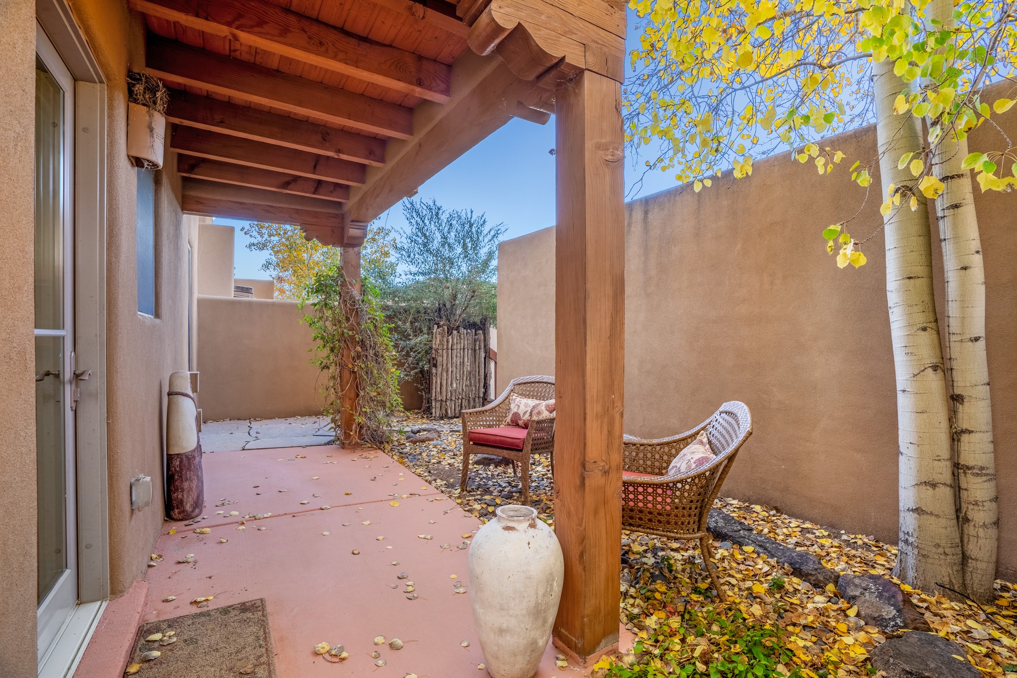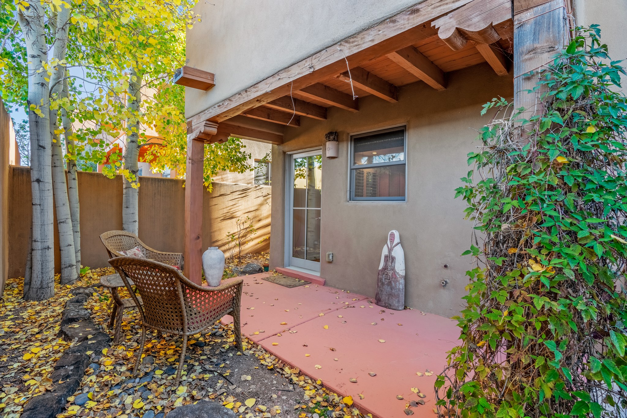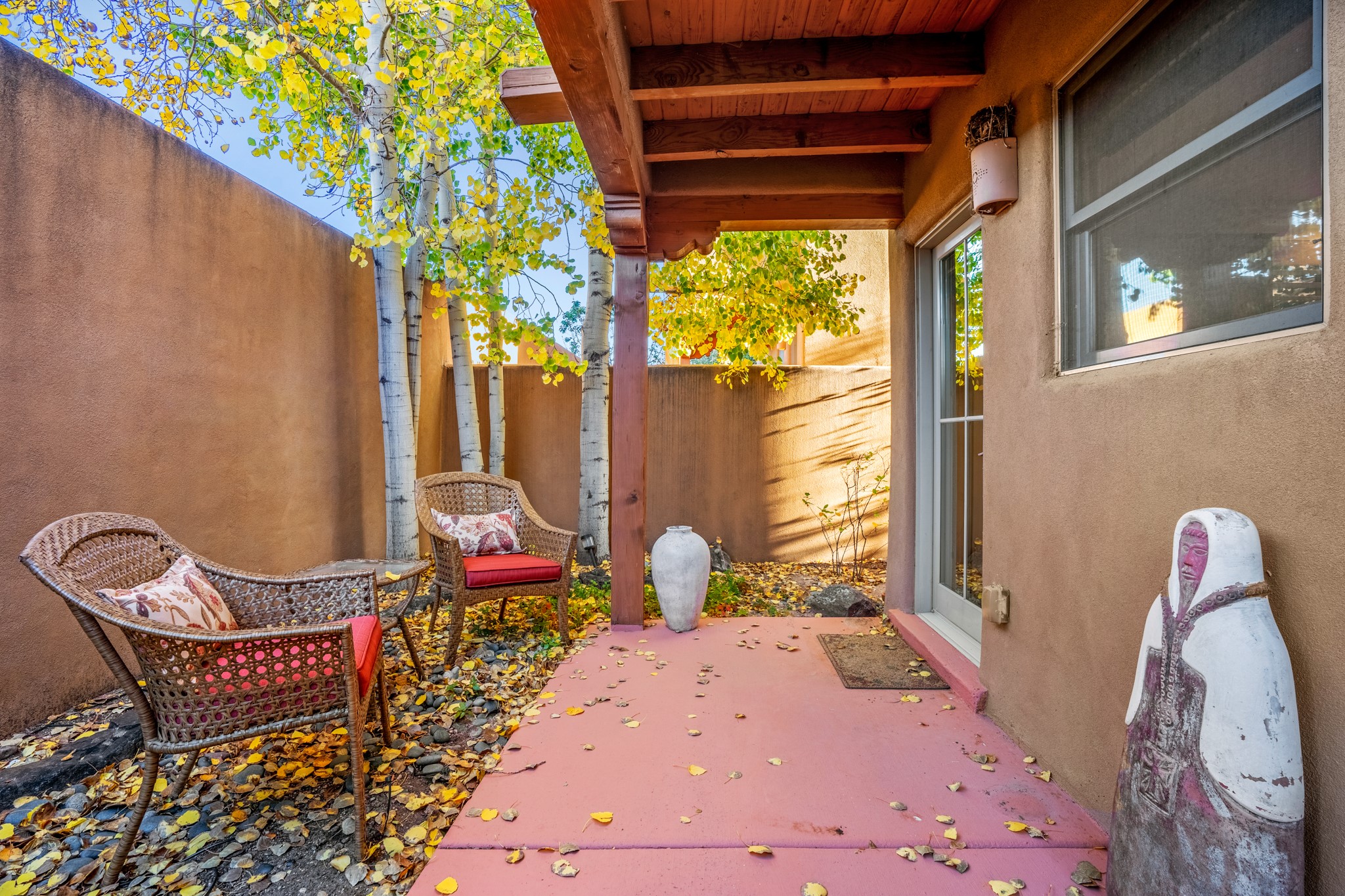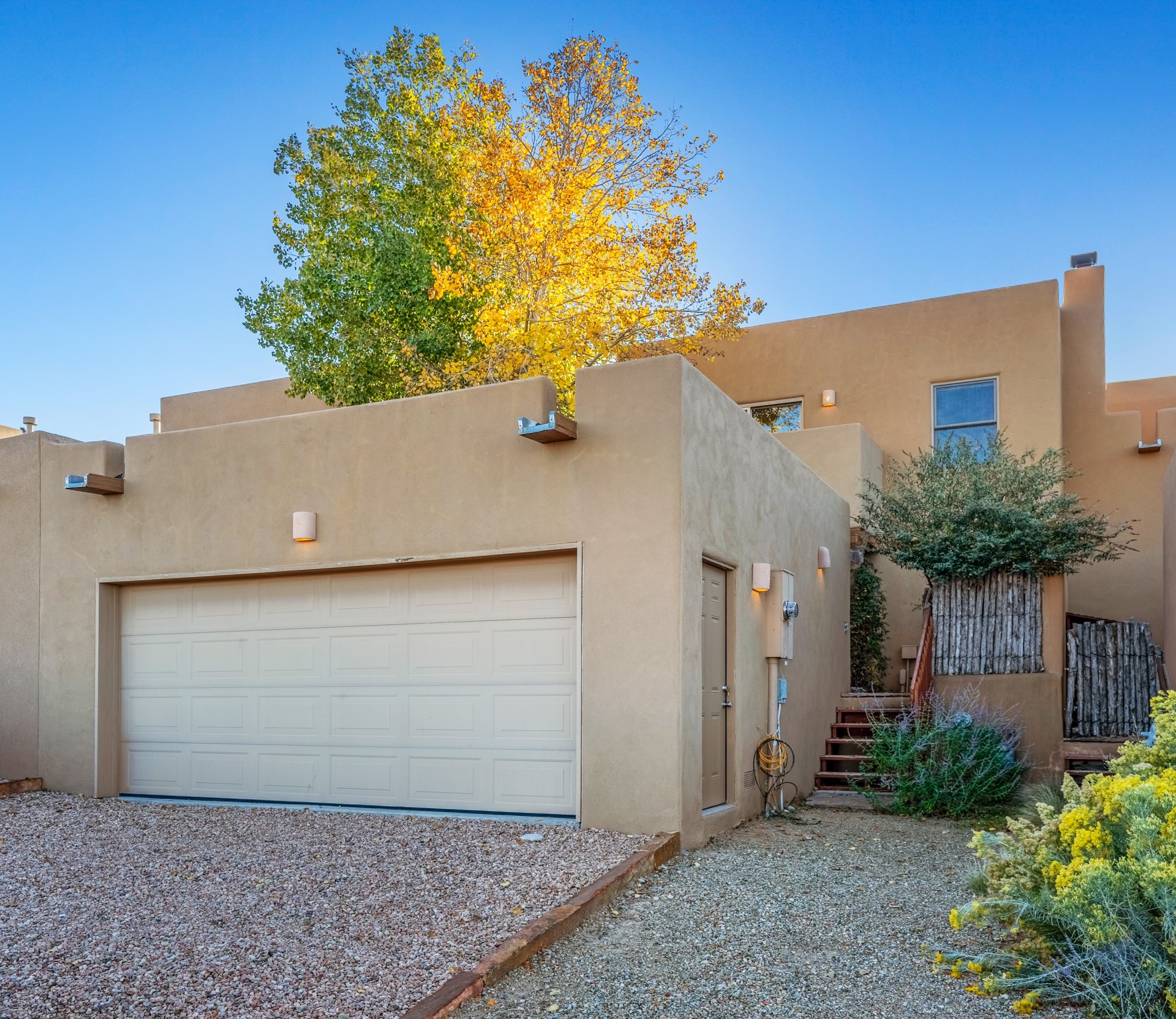 This lovely townhouse is situated in Aldea de Santa Fe, a popular area known for its lifestyle and attractiveness. The property boasts stunning views of the ski basin, providing a picturesque backdrop. The front door leads to a cozy living room equipped with a gas fireplace. The living room features soaring ceilings and large windows that allow an abundance of natural light to flood the space. The open floor plan seamlessly connects the living room to a spacious dining room, creating a welcoming and inclusive atmosphere. The well-Equipped Kitchen is generously sized and offers ample counter space and cabinets for storage. This is ideal for those who enjoy cooking or need plenty of kitchen space. Adjacent to the kitchen, there is a private patio where you can enjoy your morning coffee or outdoor relaxation. On the main floor, there is a bedroom and a bathroom, which can be used for guests or as an office space, providing versatility in its use. The upper floor features two more bedrooms. The primary bedroom suite is particularly spacious, providing room for a sitting area, and it offers a generous closet for storage. The primary bedroom includes an ensuite bathroom with dual sinks, a tub, and a shower, offering convenience and comfort.Behind the house, there is alley access to a spacious two-car garage making parking and storage convenient. Overall, this townhouse is an inviting and well-appointed property, offering a comfortable living space with great natural light, scenic views, and practical features for daily living.Aldea is an active new-urbanist community with 13 miles of walking trails, many parks including one with a playground, tennis, basketball and bocce ball courts. There is a plaza with community center, coffee shop and doctors office.