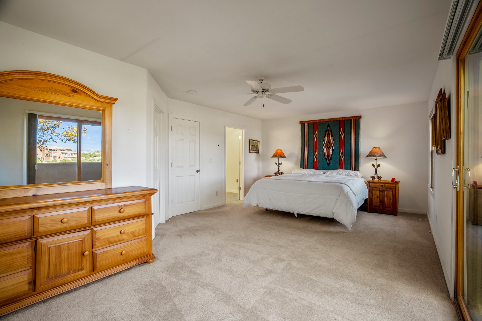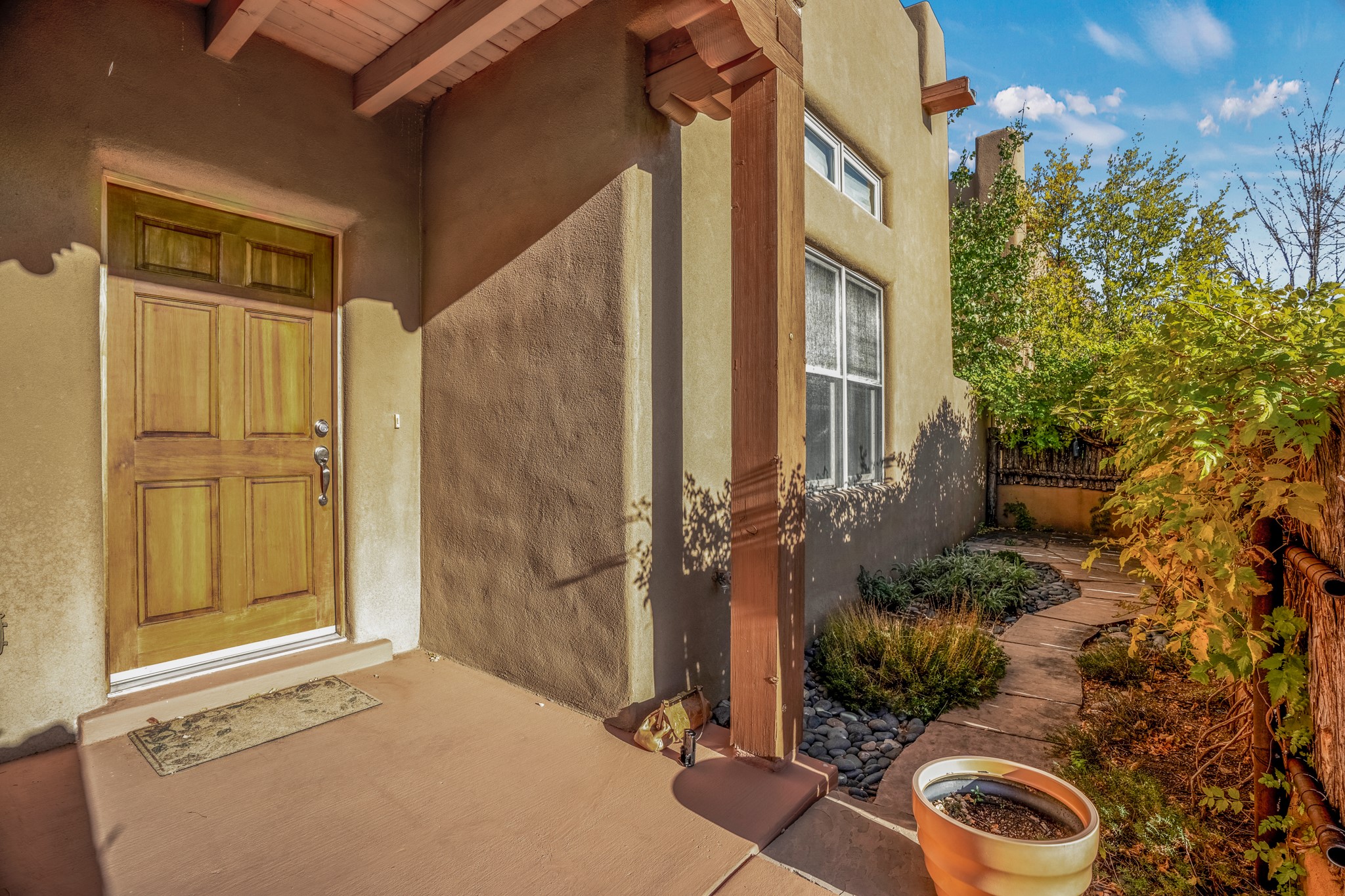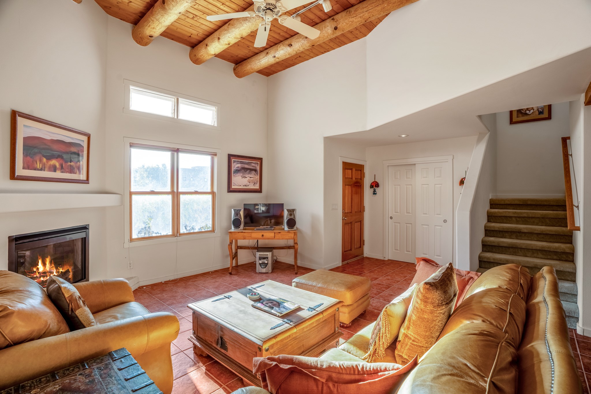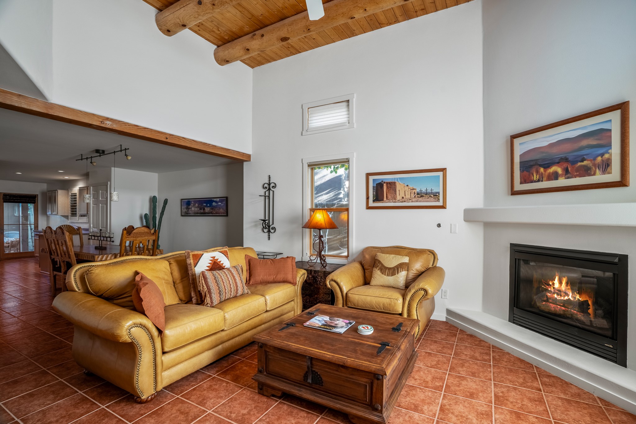 This lovely townhouse is situated in Aldea de Santa Fe, a popular area known for its lifestyle and attractiveness. The property boasts stunning views of the ski basin, providing a picturesque backdrop. The front door leads to a cozy living room equipped with a gas fireplace. The living room features soaring ceilings and large windows that allow an abundance of natural light to flood the space. The open floor plan seamlessly connects the living room to a spacious dining room, creating a welcoming and inclusive atmosphere. The well-Equipped Kitchen is generously sized and offers ample counter space and cabinets for storage. This is ideal for those who enjoy cooking or need plenty of kitchen space. Adjacent to the kitchen, there is a private patio where you can enjoy your morning coffee or outdoor relaxation. On the main floor, there is a bedroom and a bathroom, which can be used for guests or as an office space, providing versatility in its use. The upper floor features two more bedrooms. The primary bedroom suite is particularly spacious, providing room for a sitting area, and it offers a generous closet for storage. The primary bedroom includes an ensuite bathroom with dual sinks, a tub, and a shower, offering convenience and comfort.Behind the house, there is alley access to a spacious two-car garage making parking and storage convenient. Overall, this townhouse is an inviting and well-appointed property, offering a comfortable living space with great natural light, scenic views, and practical features for daily living.Aldea is an active new-urbanist community with 13 miles of walking trails, many parks including one with a playground, tennis, basketball and bocce ball courts. There is a plaza with community center, coffee shop and doctors office.