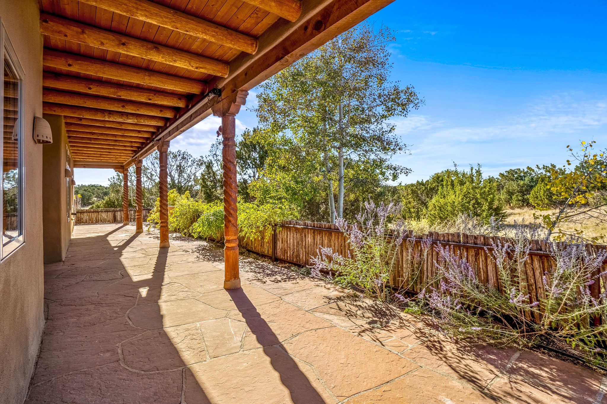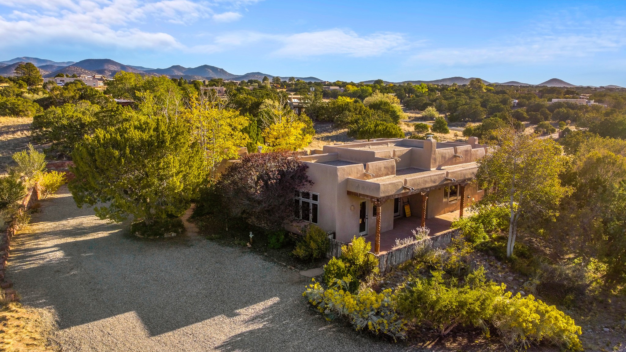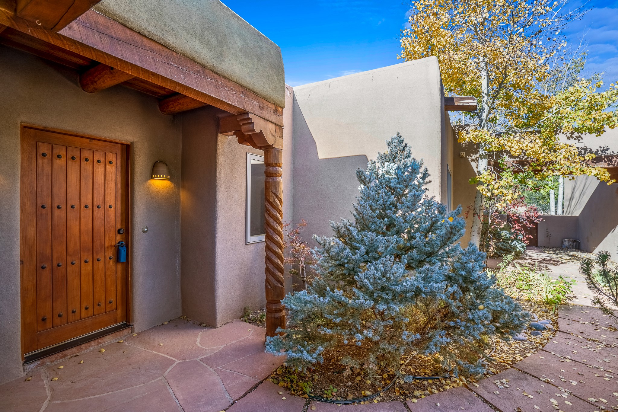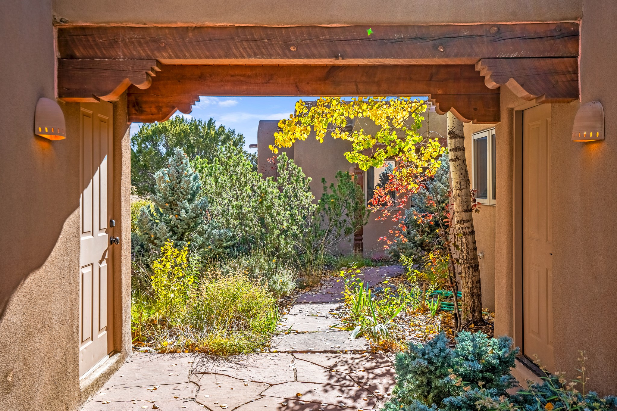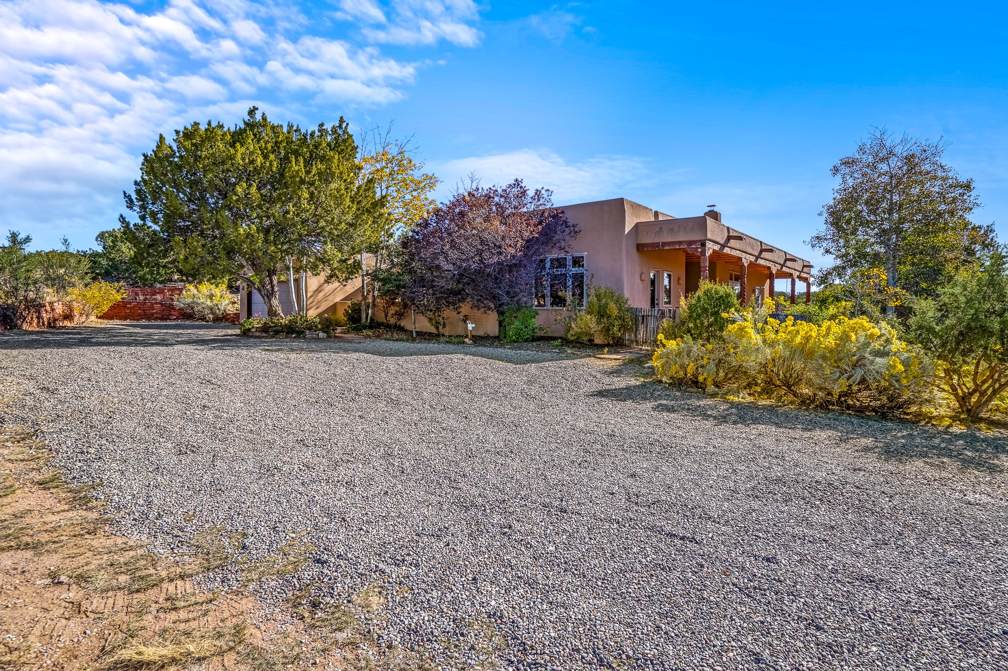 This four bedroom, three bath Adobeworks home, just off a paved road, is located to offer privacy and quiet. There's ample parking, a two car garage, established landscaping (Aspens, Spruce, Crabapple) and hardscaping, and the home is all on one level. Santa Fe features: vigas, two kiva fireplaces, talavera tile, high ceilings, and a media room/library/den/office with built-in shelves, bancos, and separate entrance. The floorplan is open, with good separation of bedrooms; the kitchen has a dining area and stainless appliances. Radiant heat, evaporative cooling, washer/dryer, excellent storage, Murphy Bed in the guest room. Enjoy an outsized front portal and large fenced yard for dogs or just for gardening--there's a drip system. Not far from the many amenities of Eldorado.