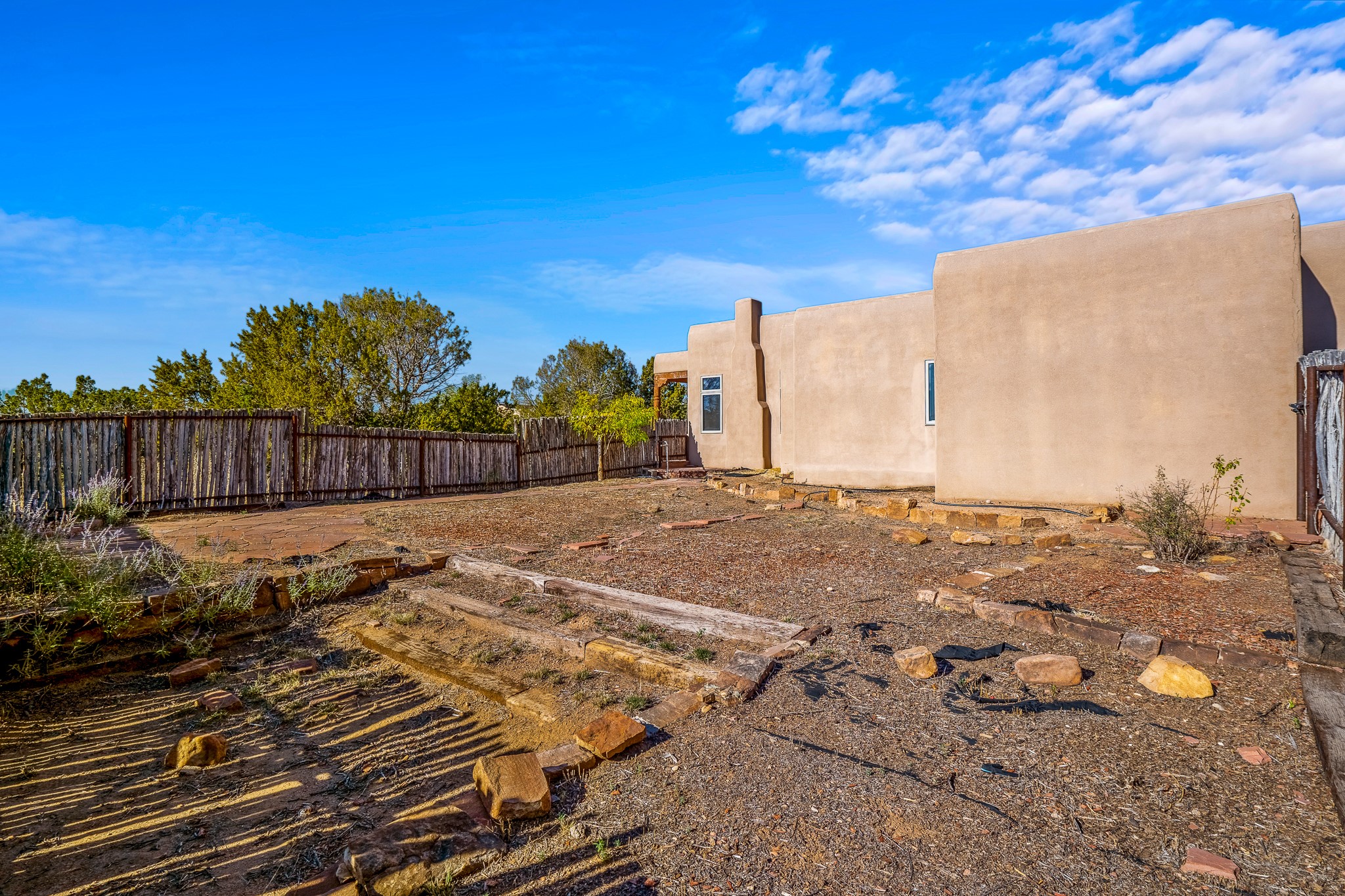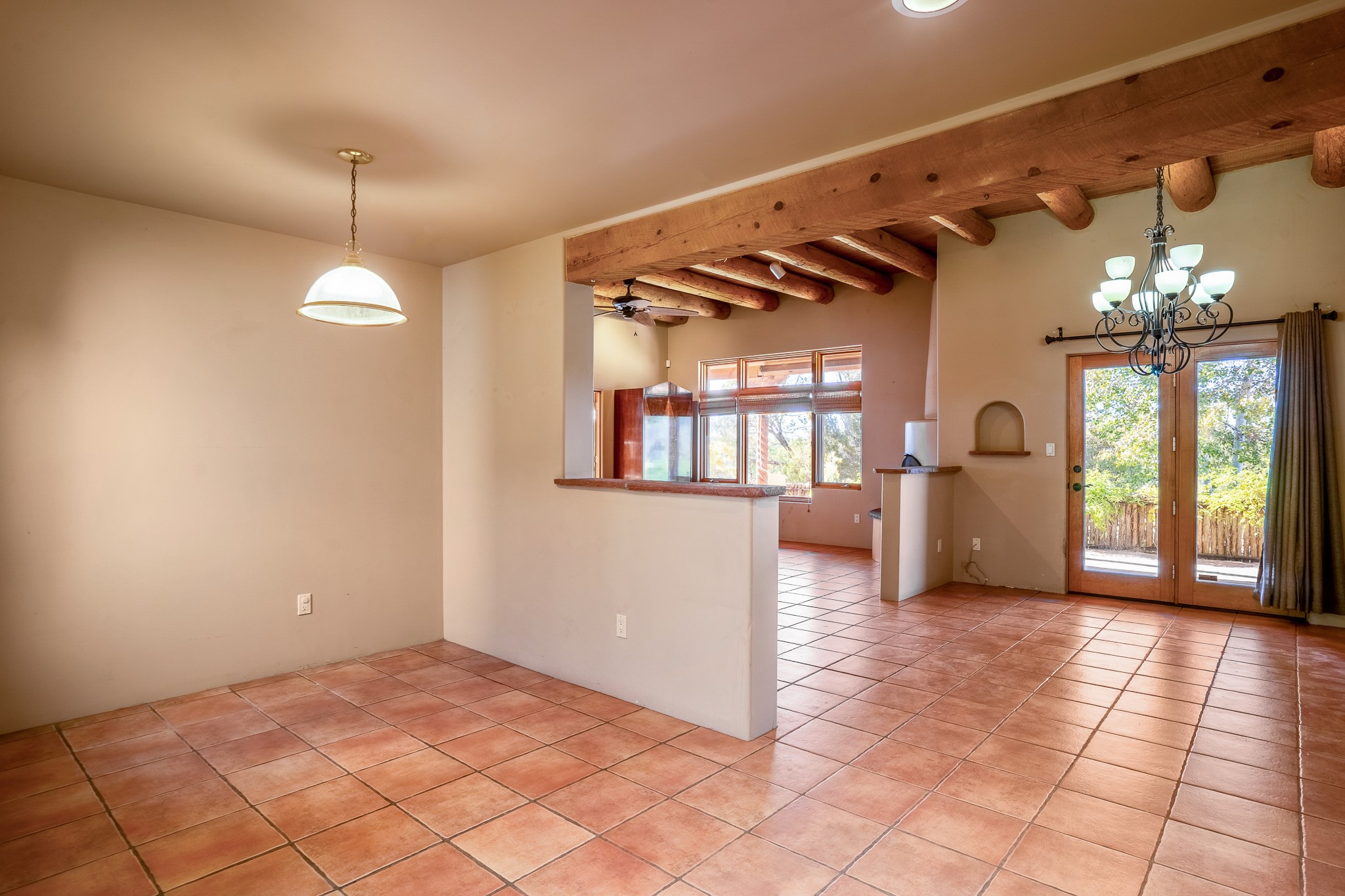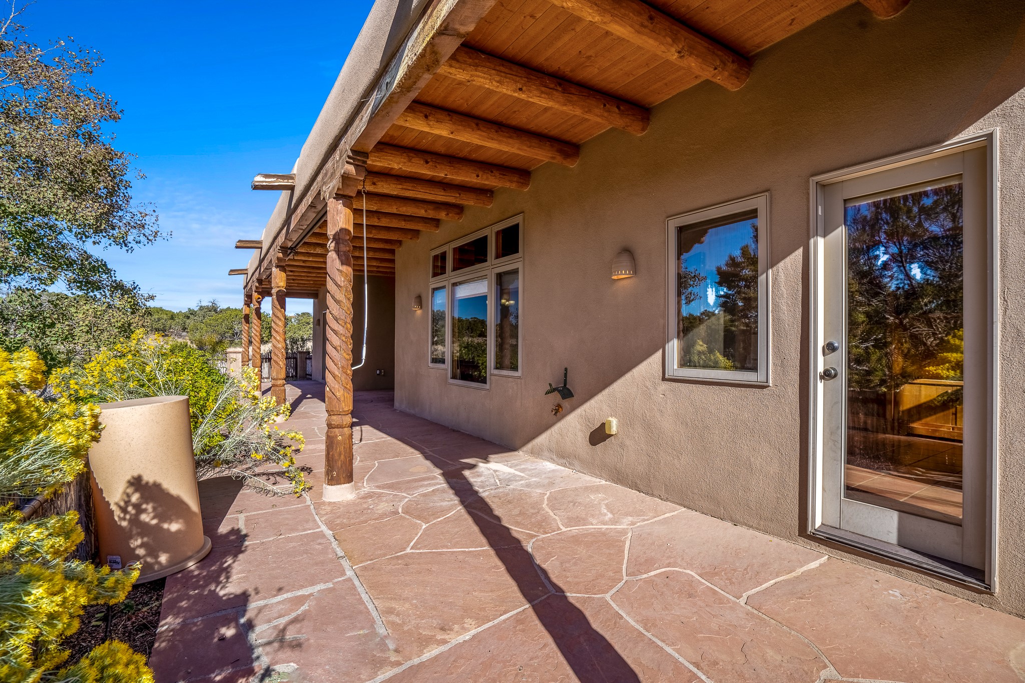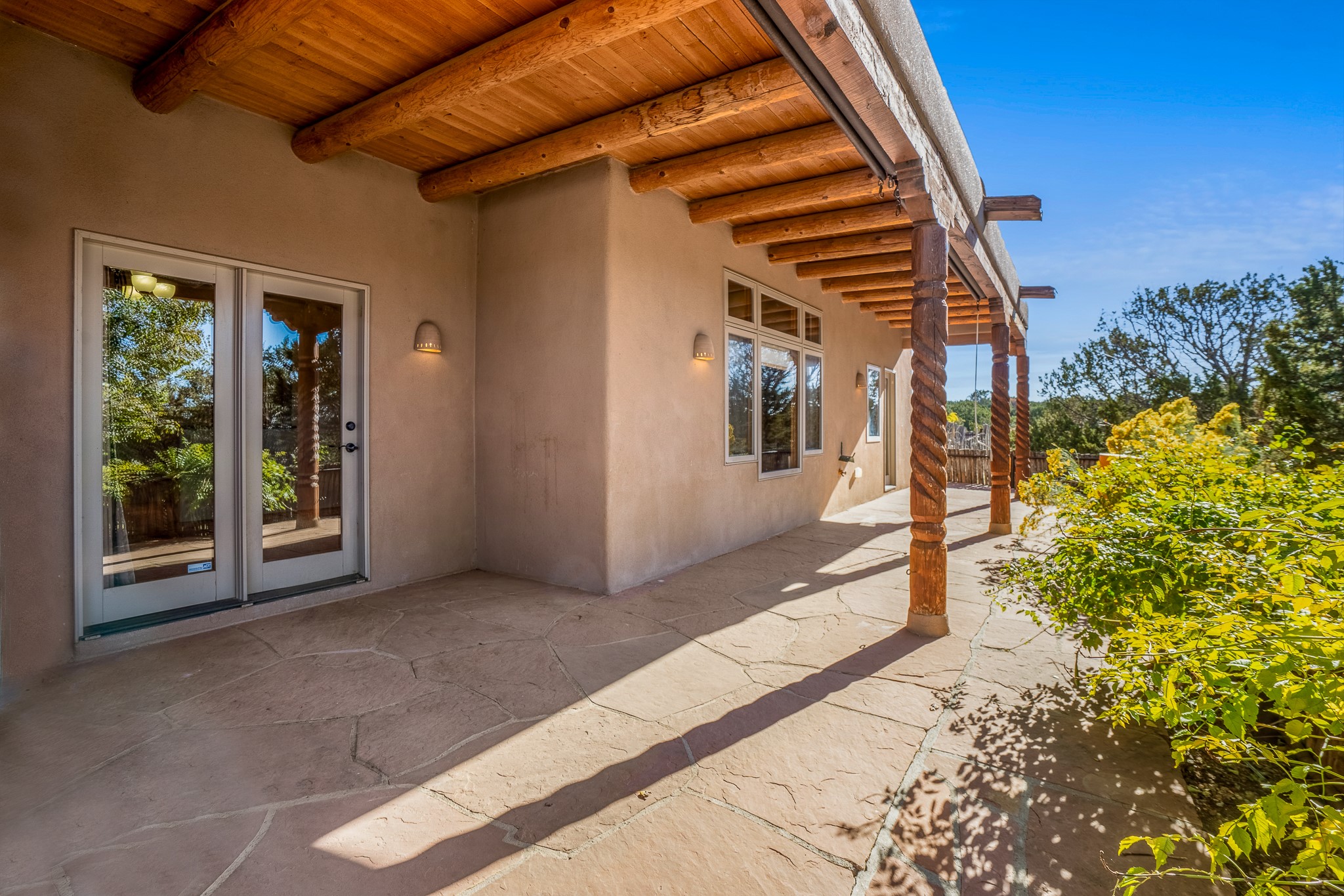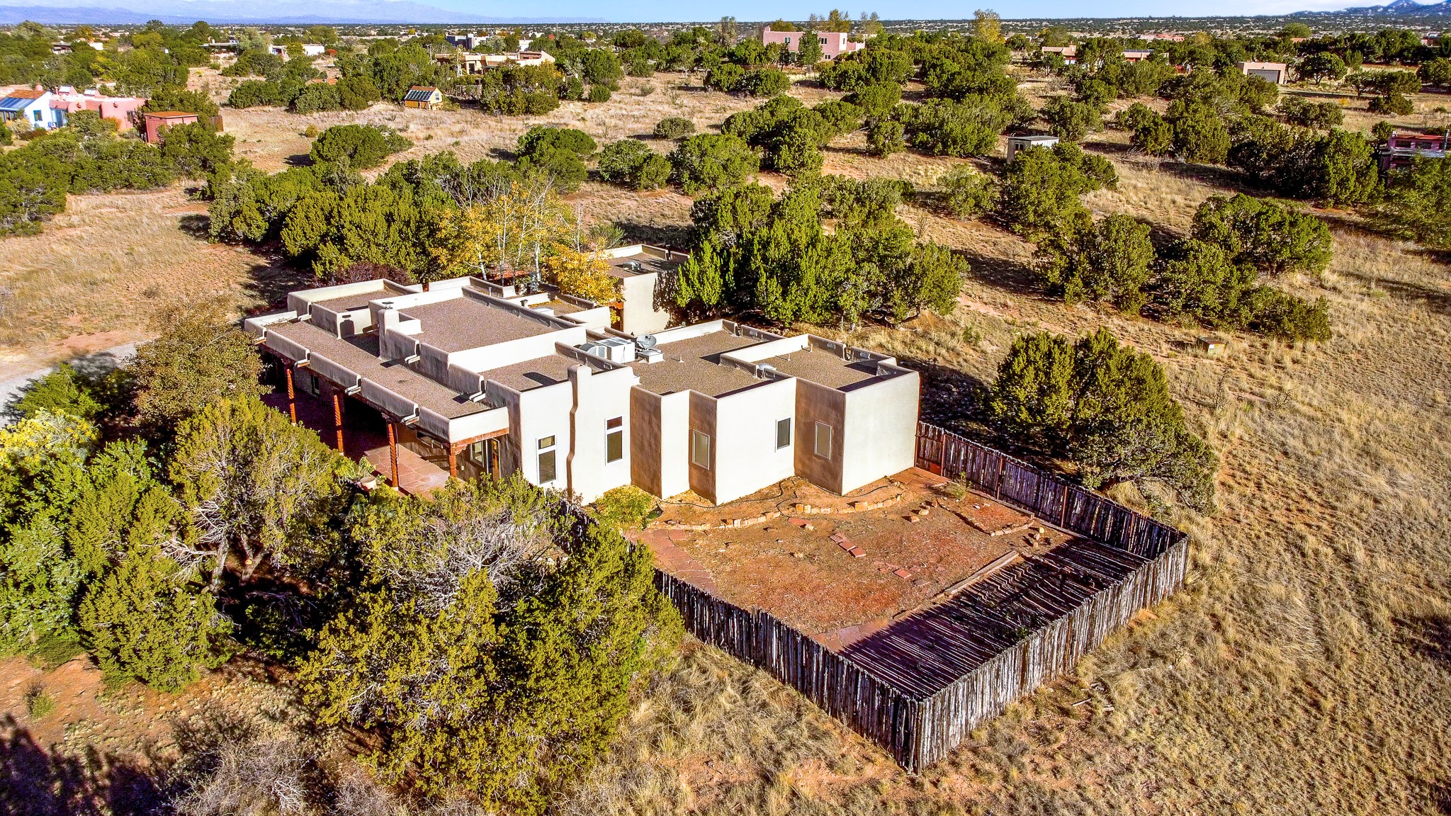 This four bedroom, three bath Adobeworks home, just off a paved road, is located to offer privacy and quiet. There's ample parking, a two car garage, established landscaping (Aspens, Spruce, Crabapple) and hardscaping, and the home is all on one level. Santa Fe features: vigas, two kiva fireplaces, talavera tile, high ceilings, and a media room/library/den/office with built-in shelves, bancos, and separate entrance. The floorplan is open, with good separation of bedrooms; the kitchen has a dining area and stainless appliances. Radiant heat, evaporative cooling, washer/dryer, excellent storage, Murphy Bed in the guest room. Enjoy an outsized front portal and large fenced yard for dogs or just for gardening--there's a drip system. Not far from the many amenities of Eldorado.