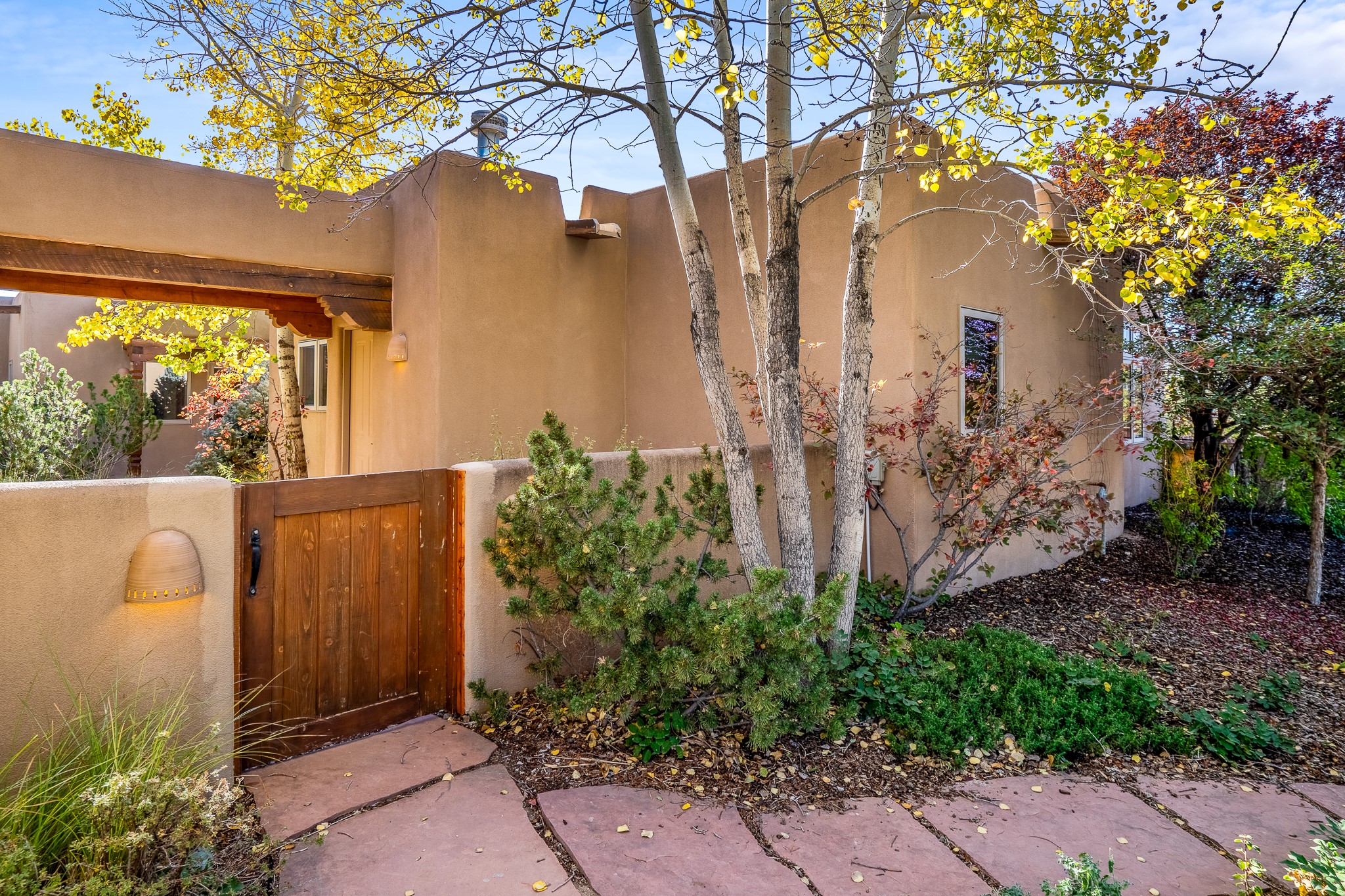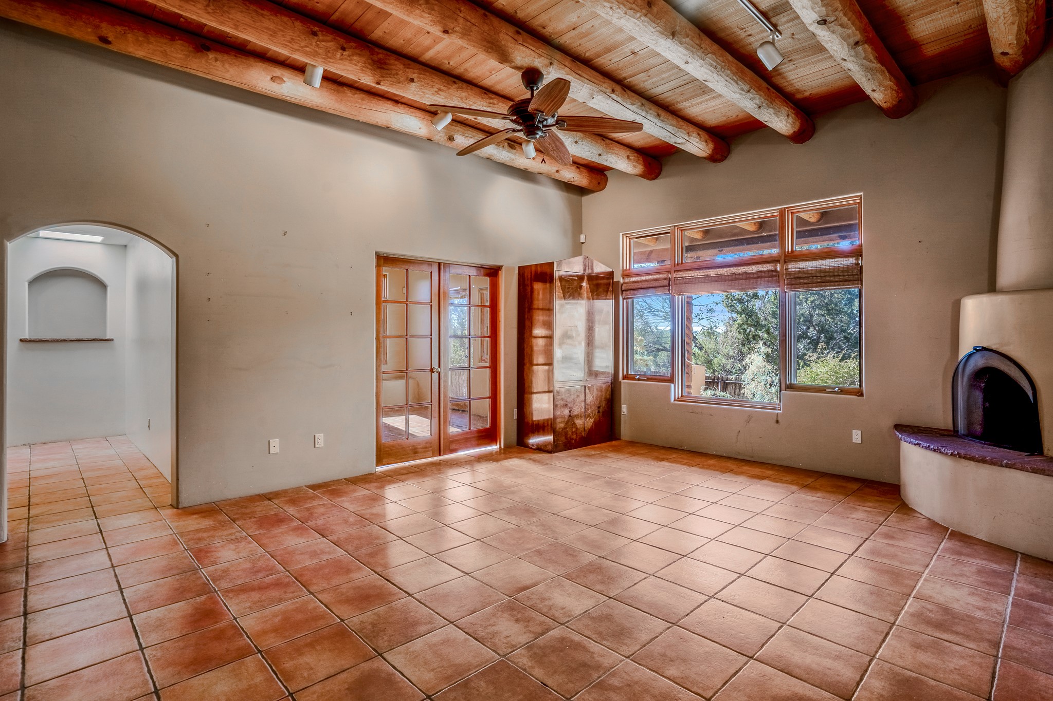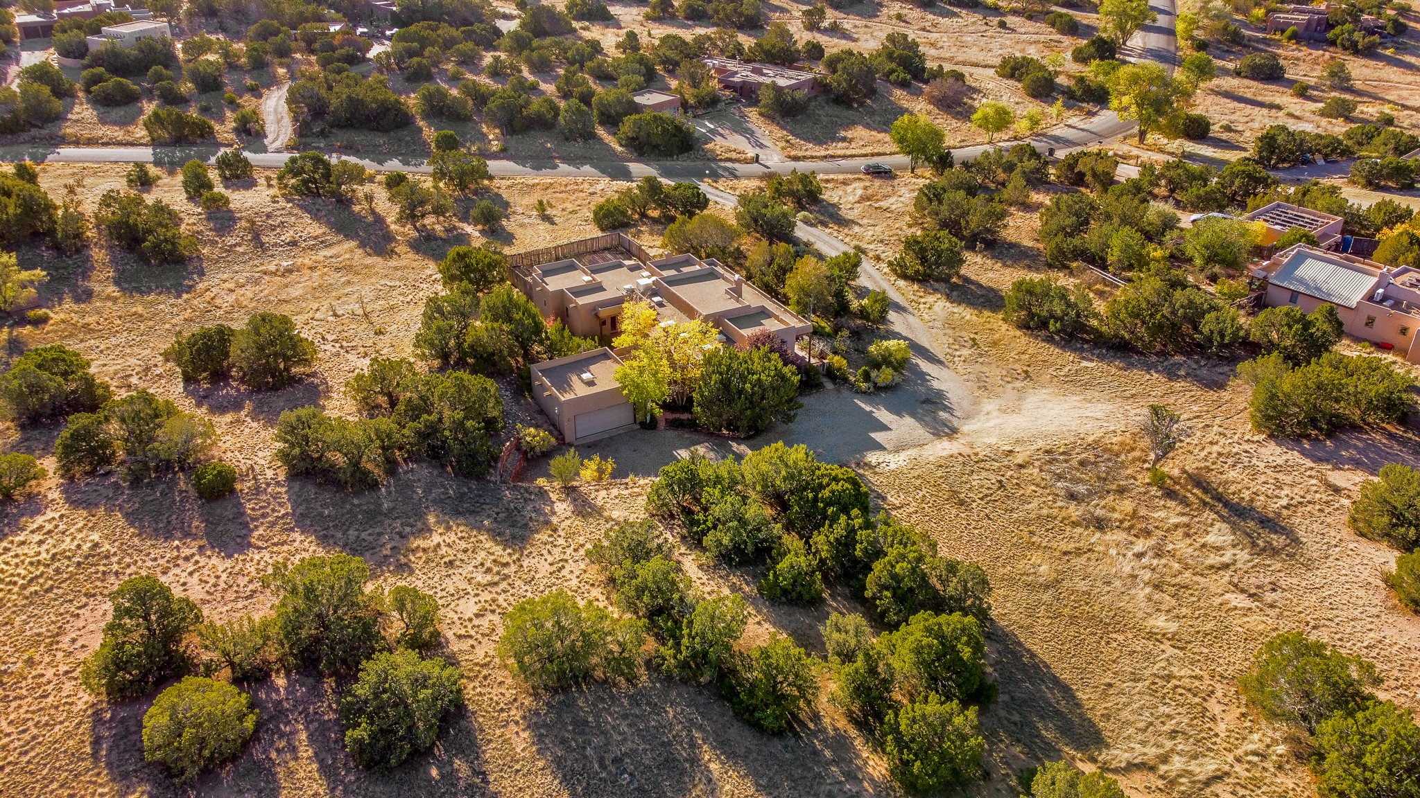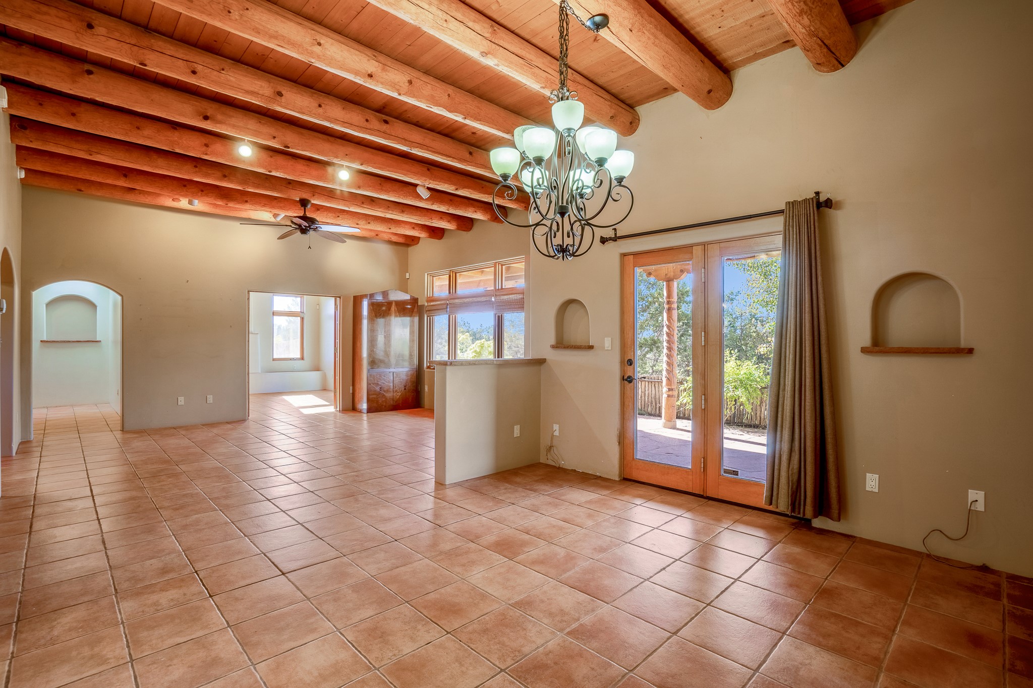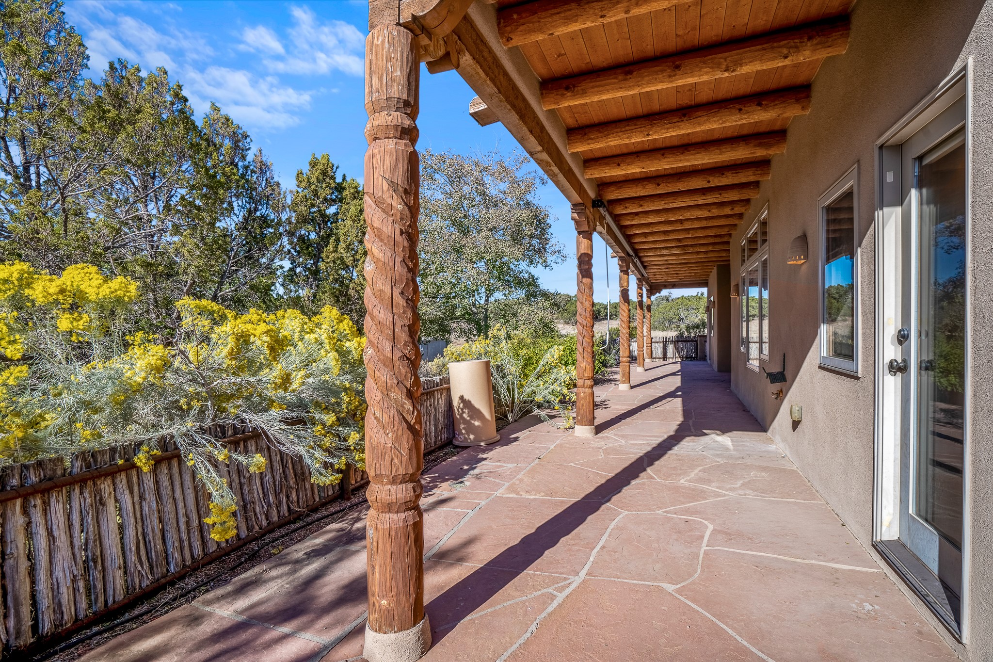 This four bedroom, three bath Adobeworks home, just off a paved road, is located to offer privacy and quiet. There's ample parking, a two car garage, established landscaping (Aspens, Spruce, Crabapple) and hardscaping, and the home is all on one level. Santa Fe features: vigas, two kiva fireplaces, talavera tile, high ceilings, and a media room/library/den/office with built-in shelves, bancos, and separate entrance. The floorplan is open, with good separation of bedrooms; the kitchen has a dining area and stainless appliances. Radiant heat, evaporative cooling, washer/dryer, excellent storage, Murphy Bed in the guest room. Enjoy an outsized front portal and large fenced yard for dogs or just for gardening--there's a drip system. Not far from the many amenities of Eldorado.