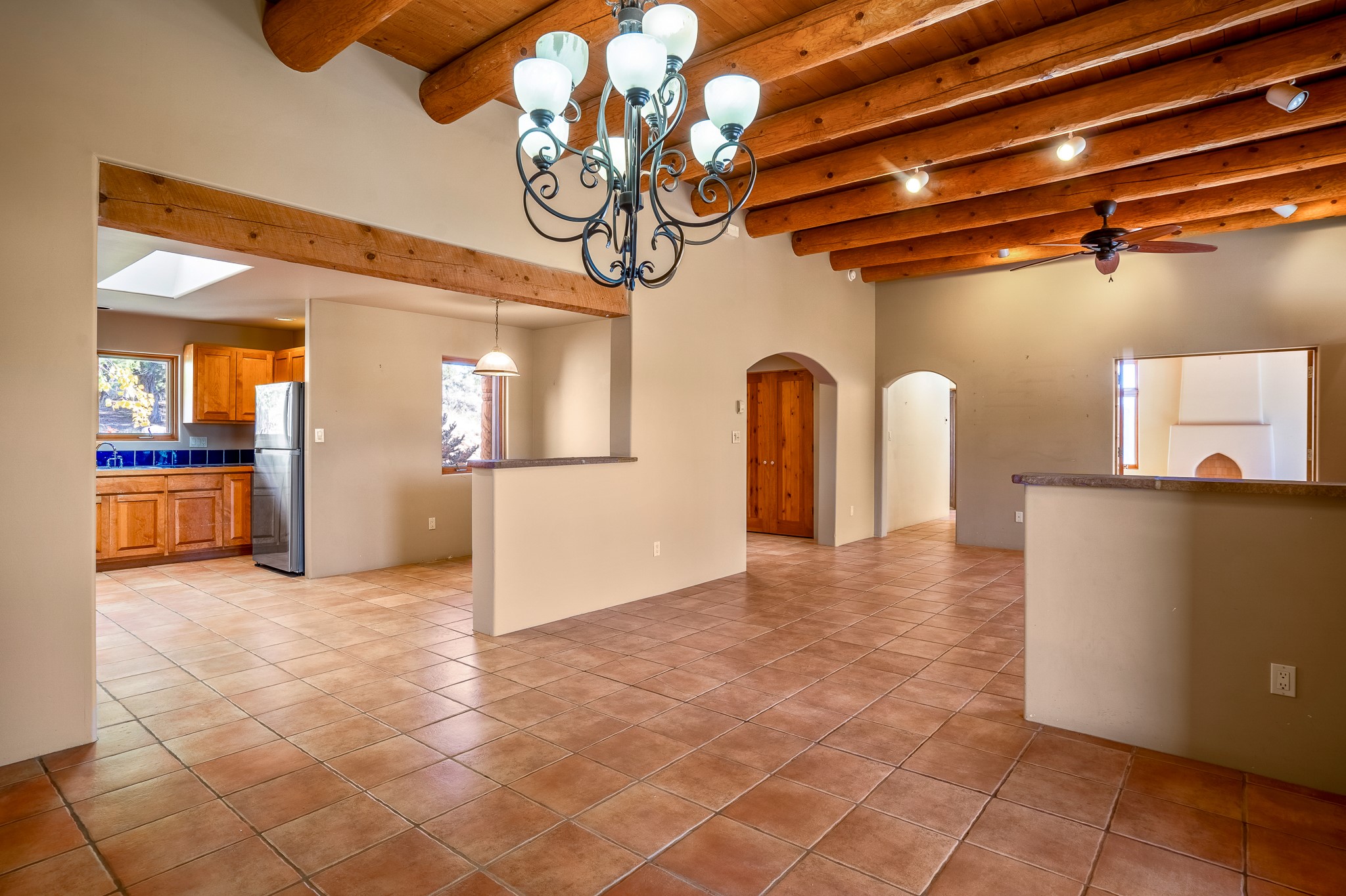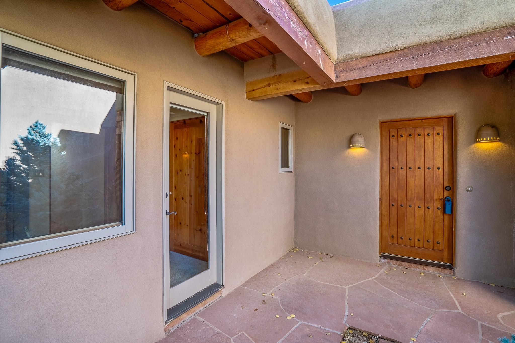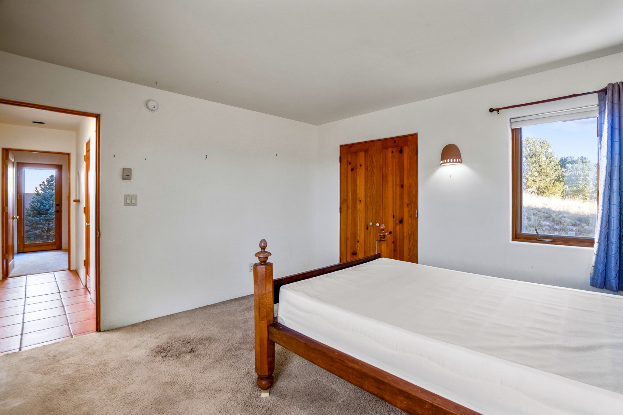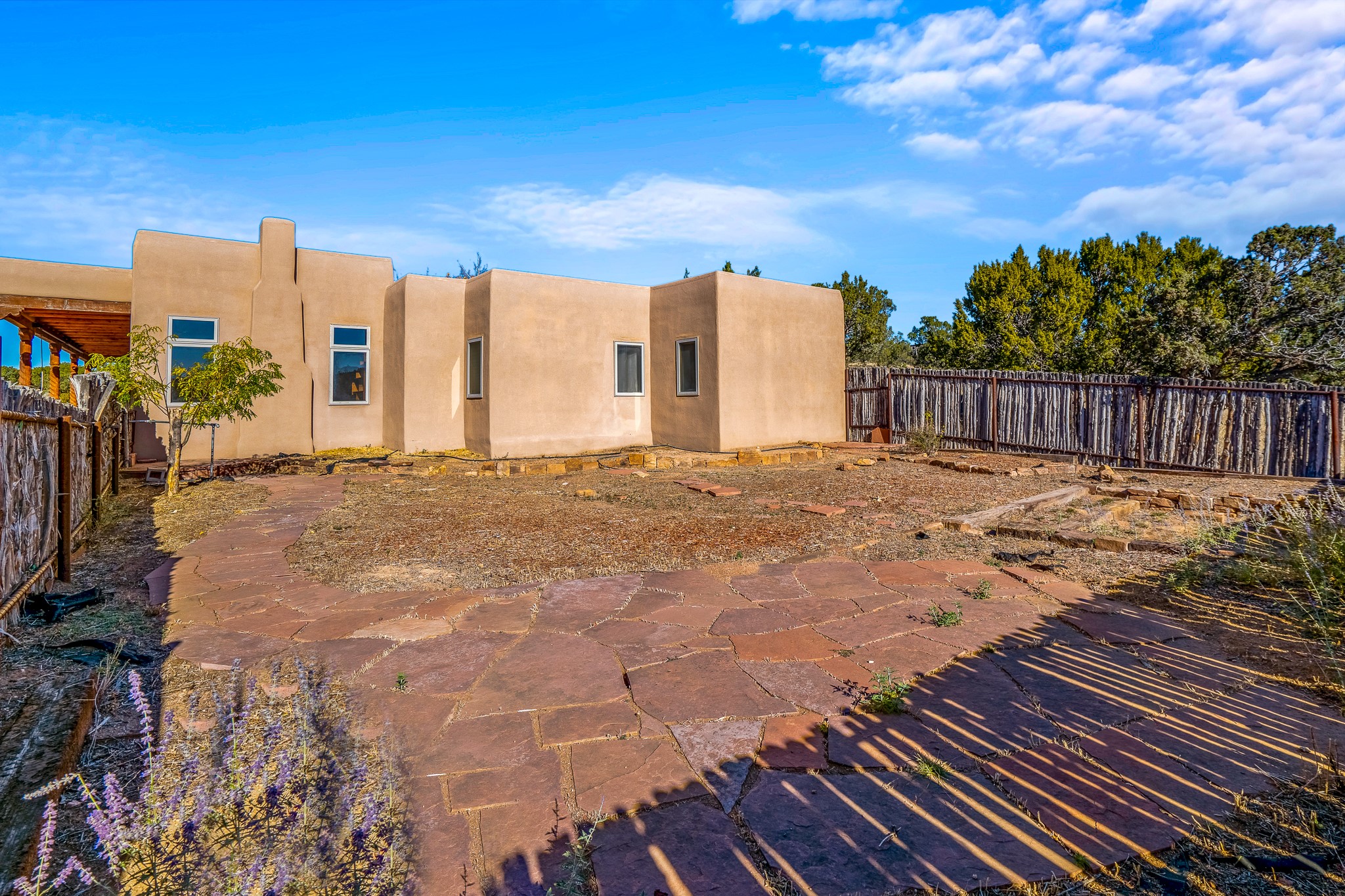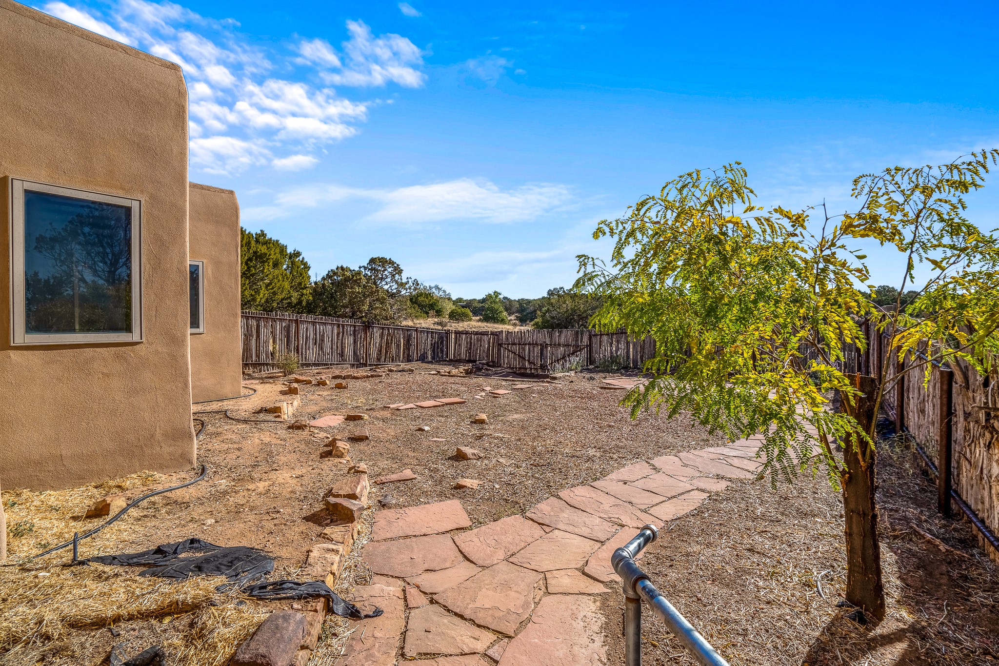This four bedroom, three bath Adobeworks home, just off a paved road, is located to offer privacy and quiet. There's ample parking, a two car garage, established landscaping (Aspens, Spruce, Crabapple) and hardscaping, and the home is all on one level. Santa Fe features: vigas, two kiva fireplaces, talavera tile, high ceilings, and a media room/library/den/office with built-in shelves, bancos, and separate entrance. The floorplan is open, with good separation of bedrooms; the kitchen has a dining area and stainless appliances. Radiant heat, evaporative cooling, washer/dryer, excellent storage, Murphy Bed in the guest room. Enjoy an outsized front portal and large fenced yard for dogs or just for gardening--there's a drip system. Not far from the many amenities of Eldorado.