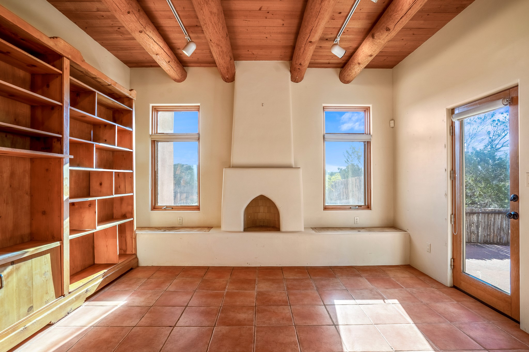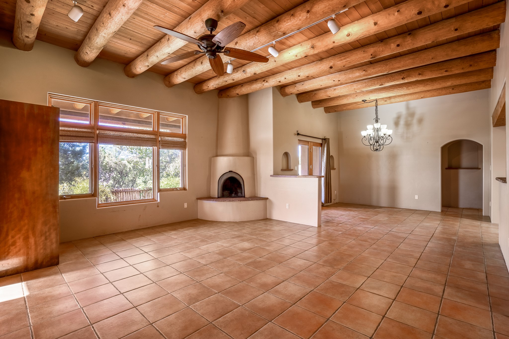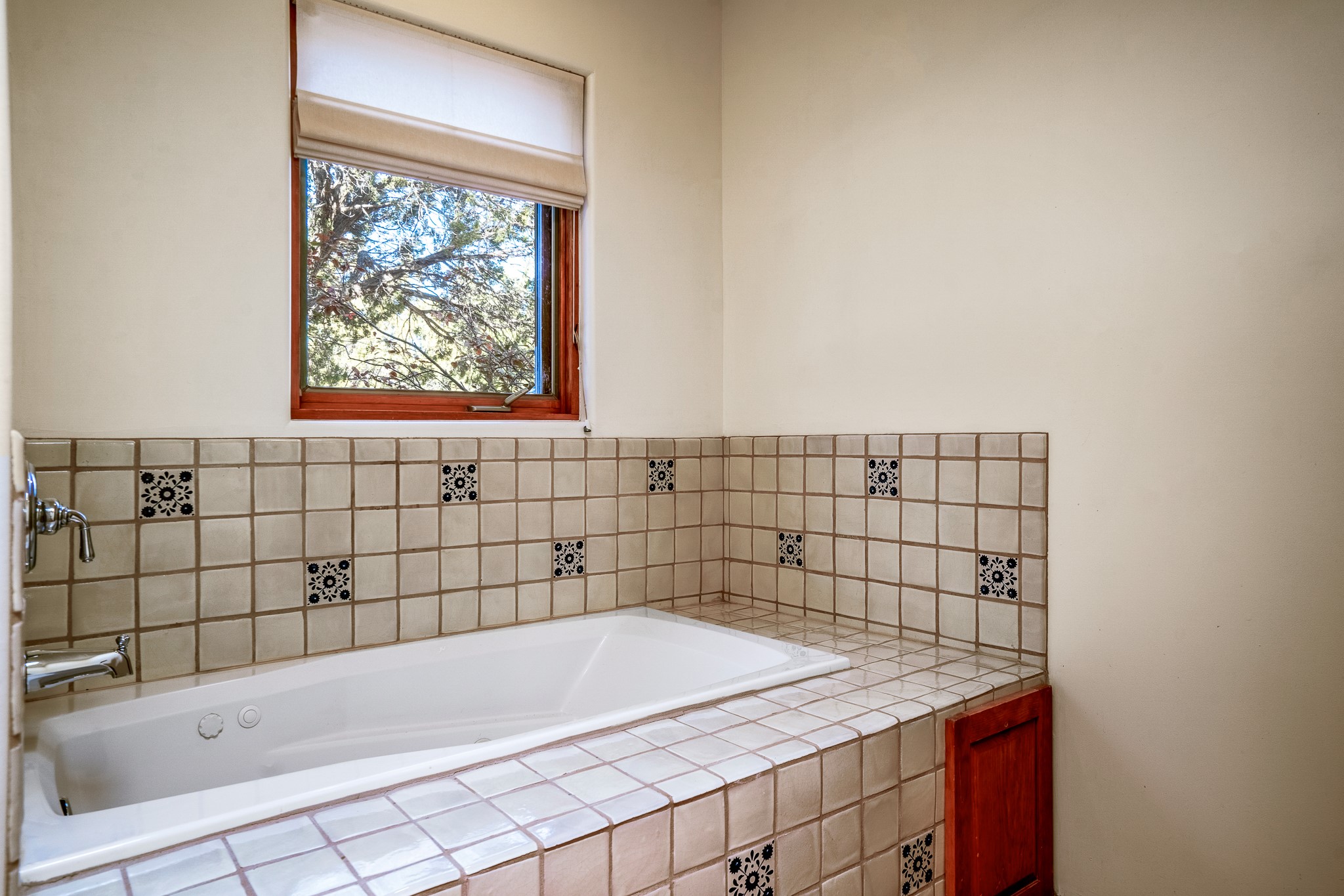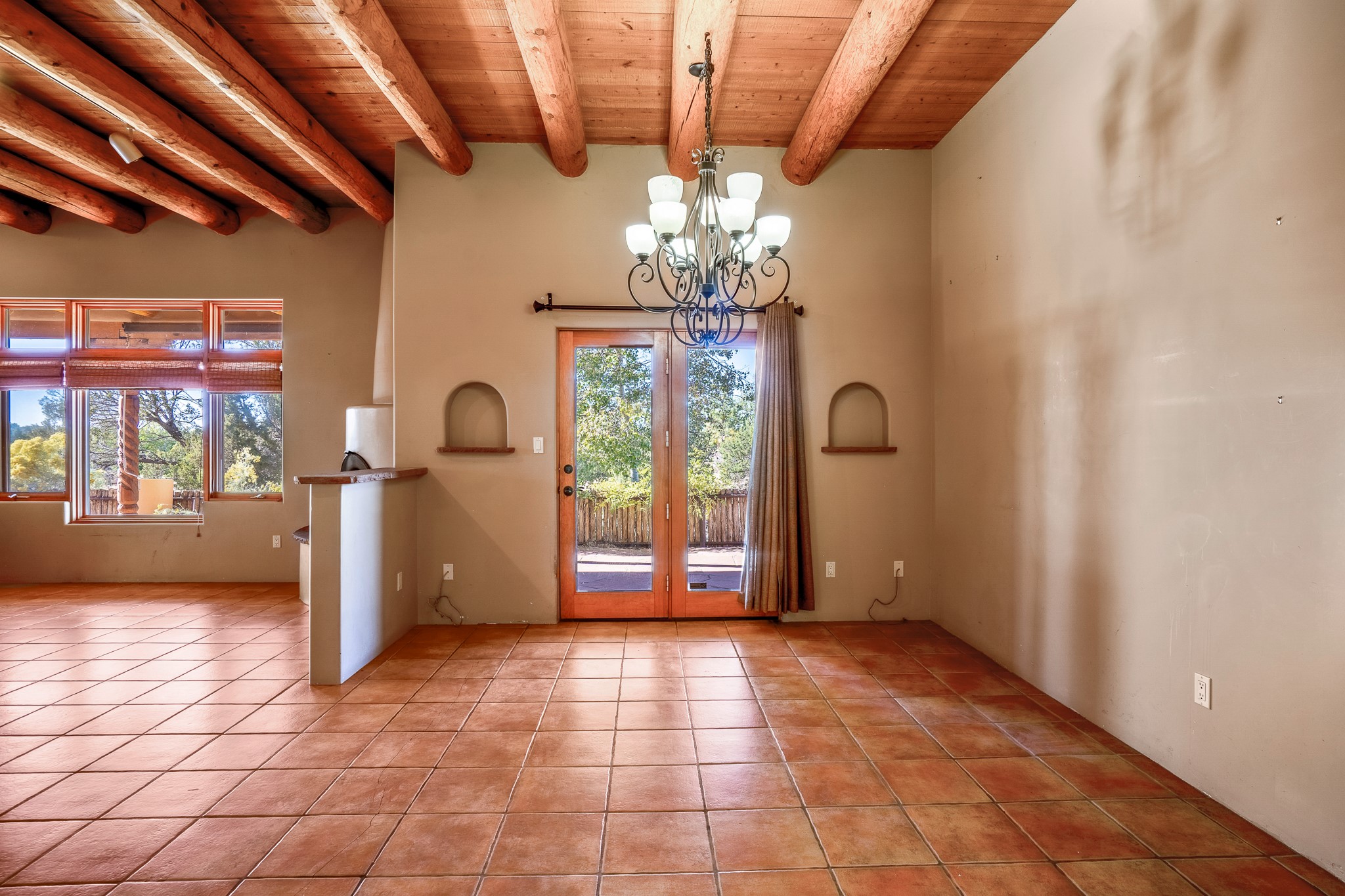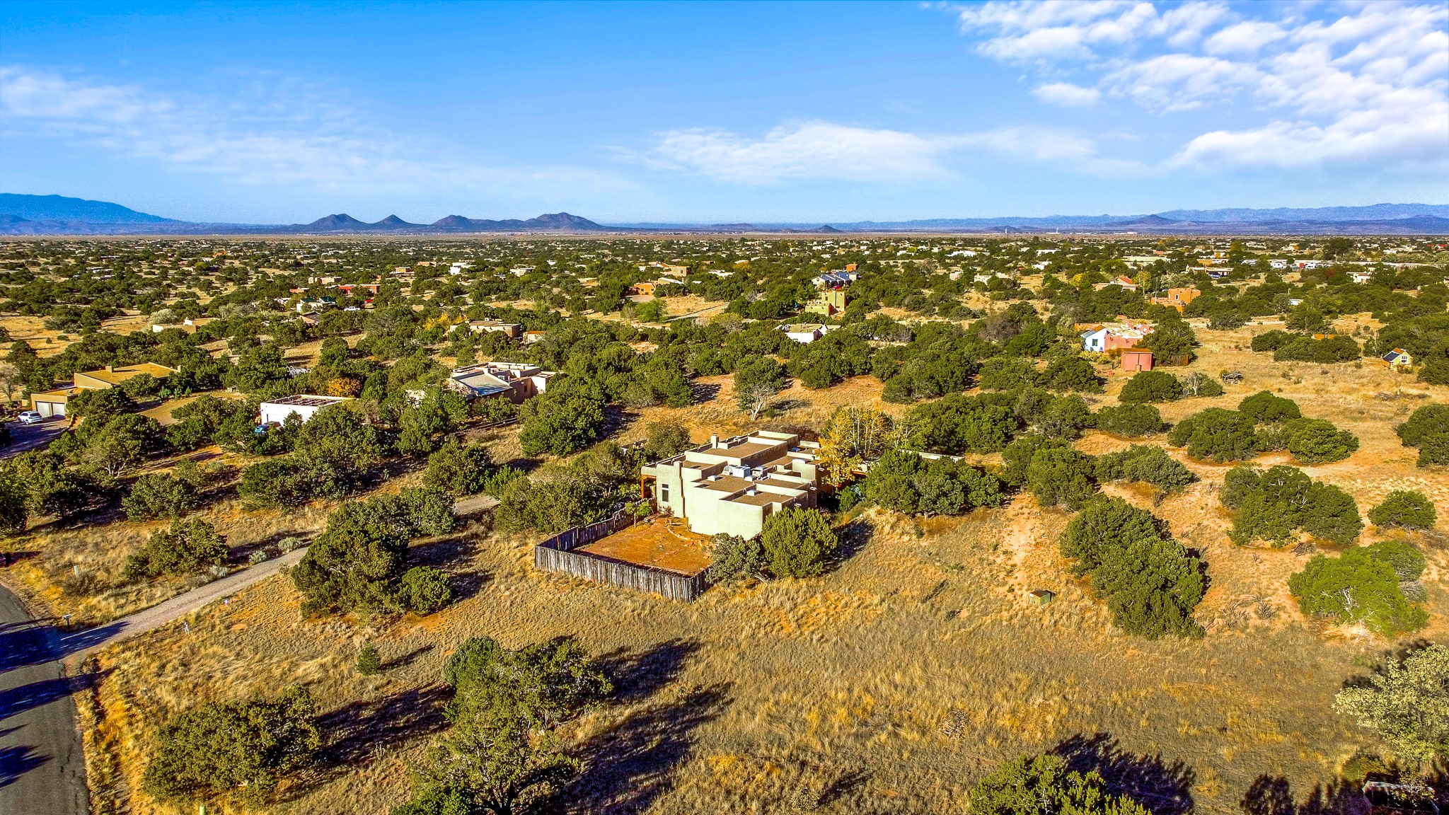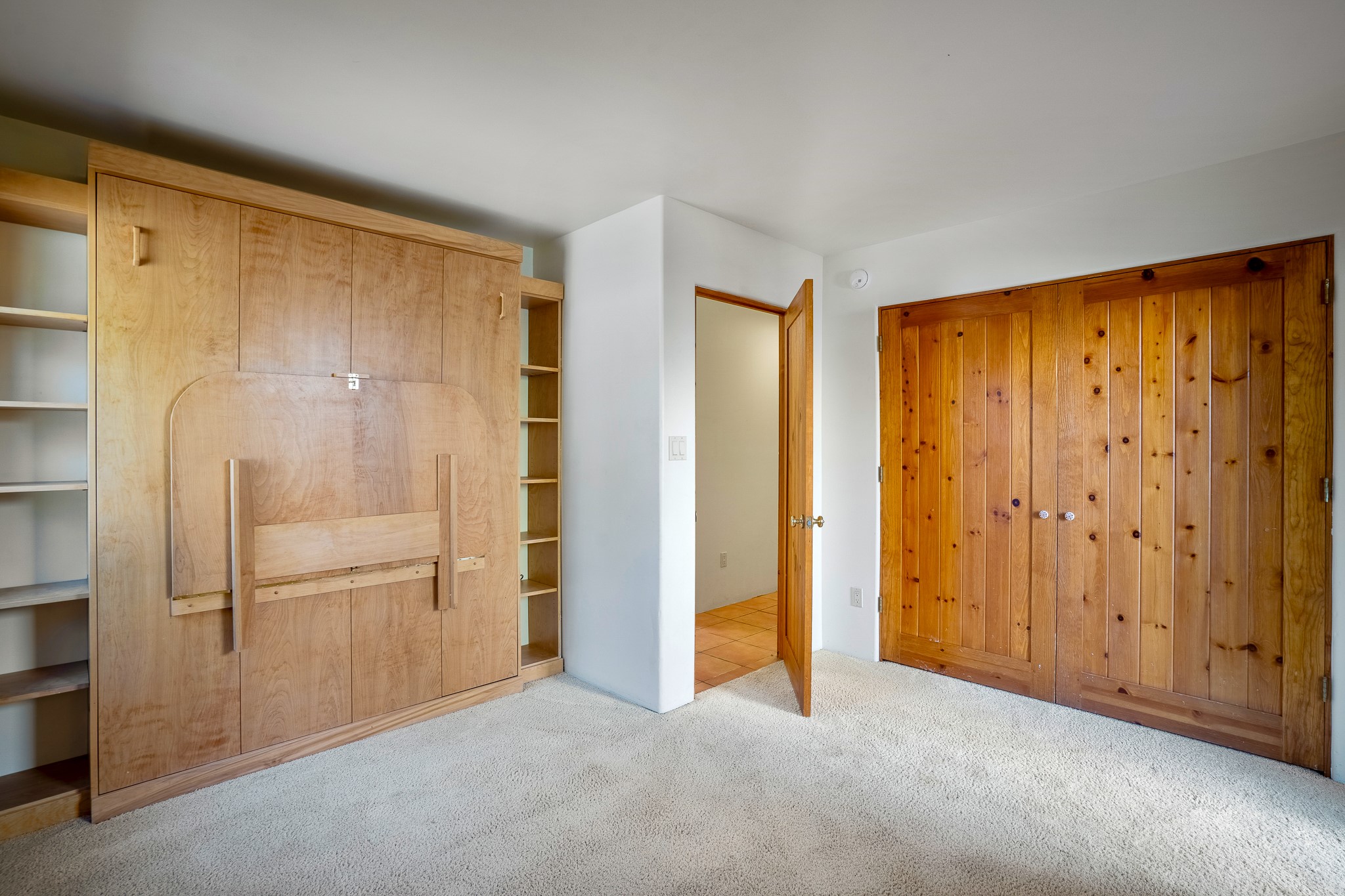 This four bedroom, three bath Adobeworks home, just off a paved road, is located to offer privacy and quiet. There's ample parking, a two car garage, established landscaping (Aspens, Spruce, Crabapple) and hardscaping, and the home is all on one level. Santa Fe features: vigas, two kiva fireplaces, talavera tile, high ceilings, and a media room/library/den/office with built-in shelves, bancos, and separate entrance. The floorplan is open, with good separation of bedrooms; the kitchen has a dining area and stainless appliances. Radiant heat, evaporative cooling, washer/dryer, excellent storage, Murphy Bed in the guest room. Enjoy an outsized front portal and large fenced yard for dogs or just for gardening--there's a drip system. Not far from the many amenities of Eldorado.