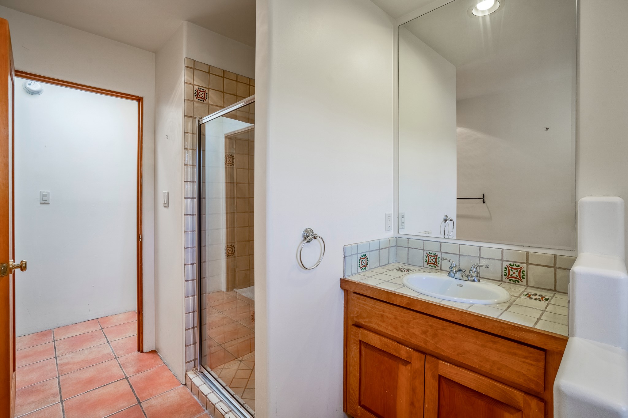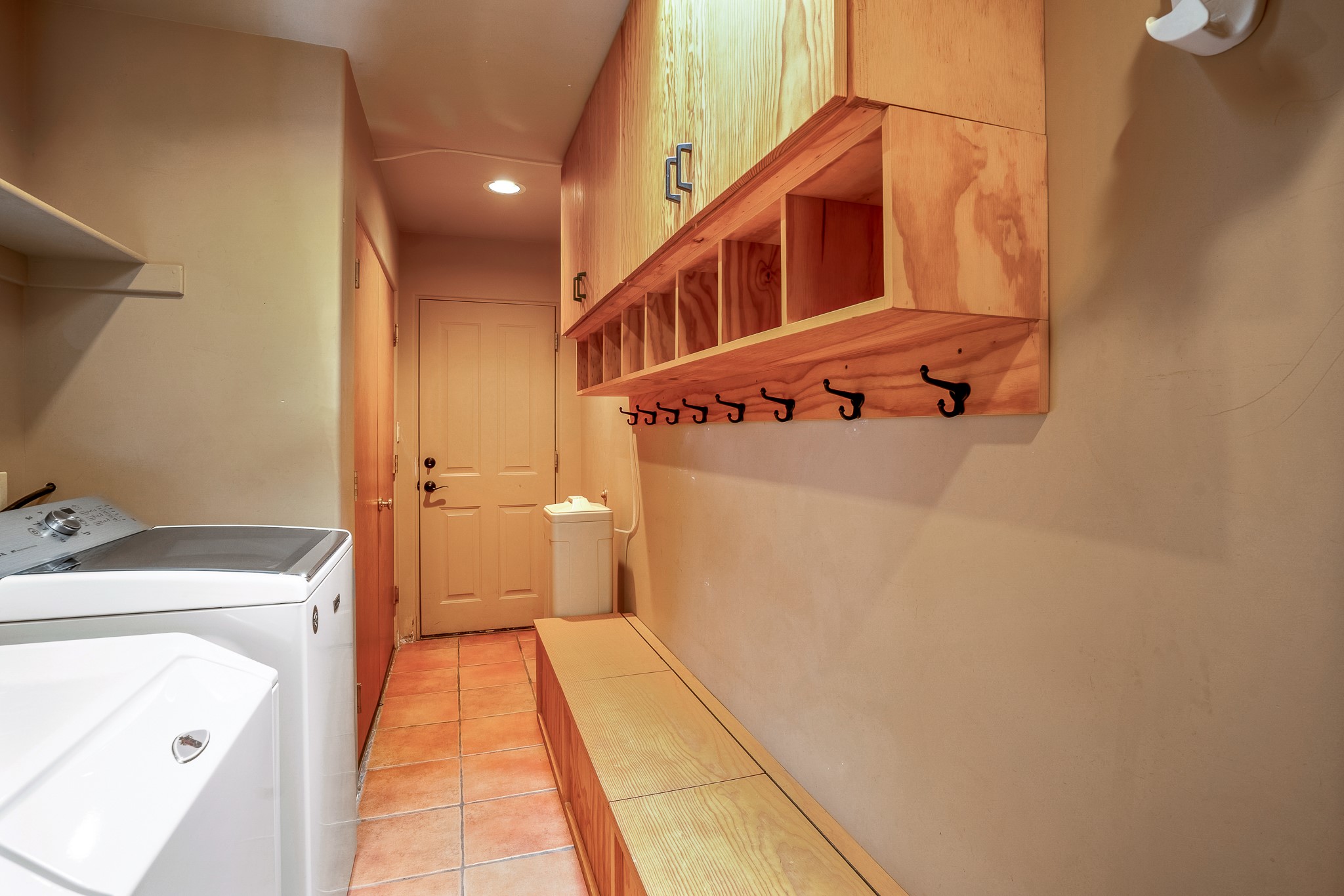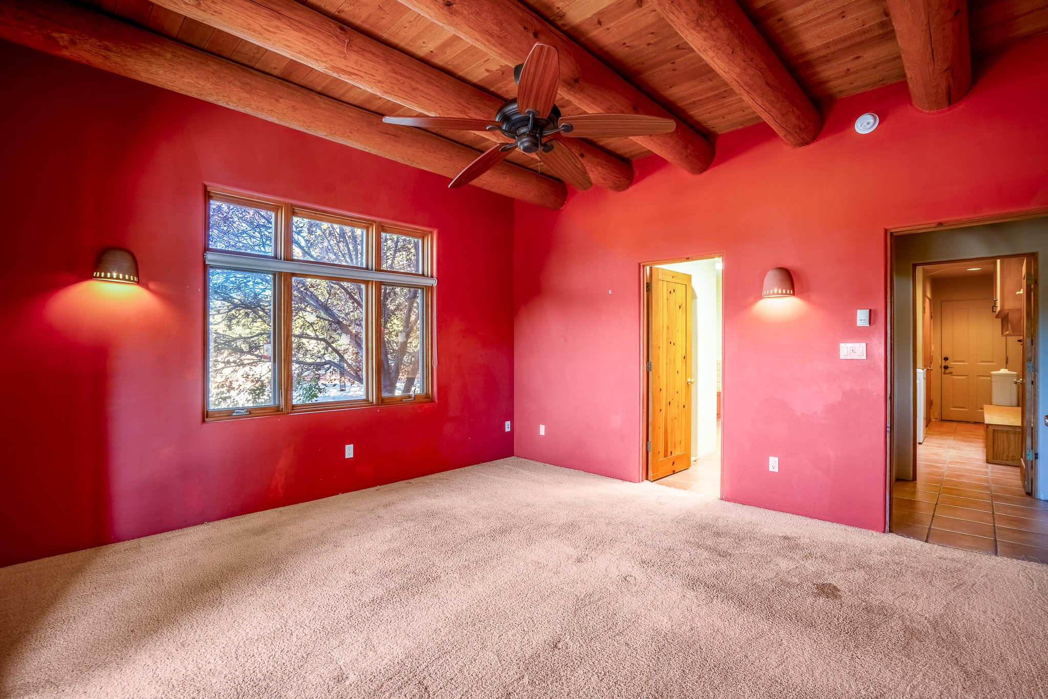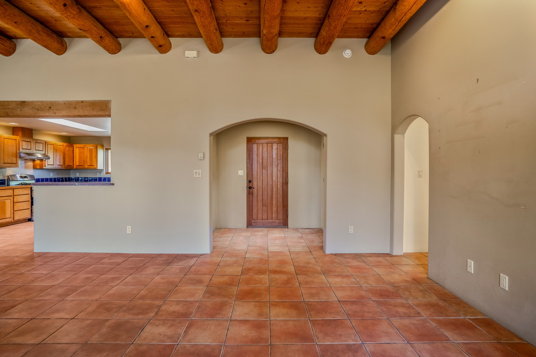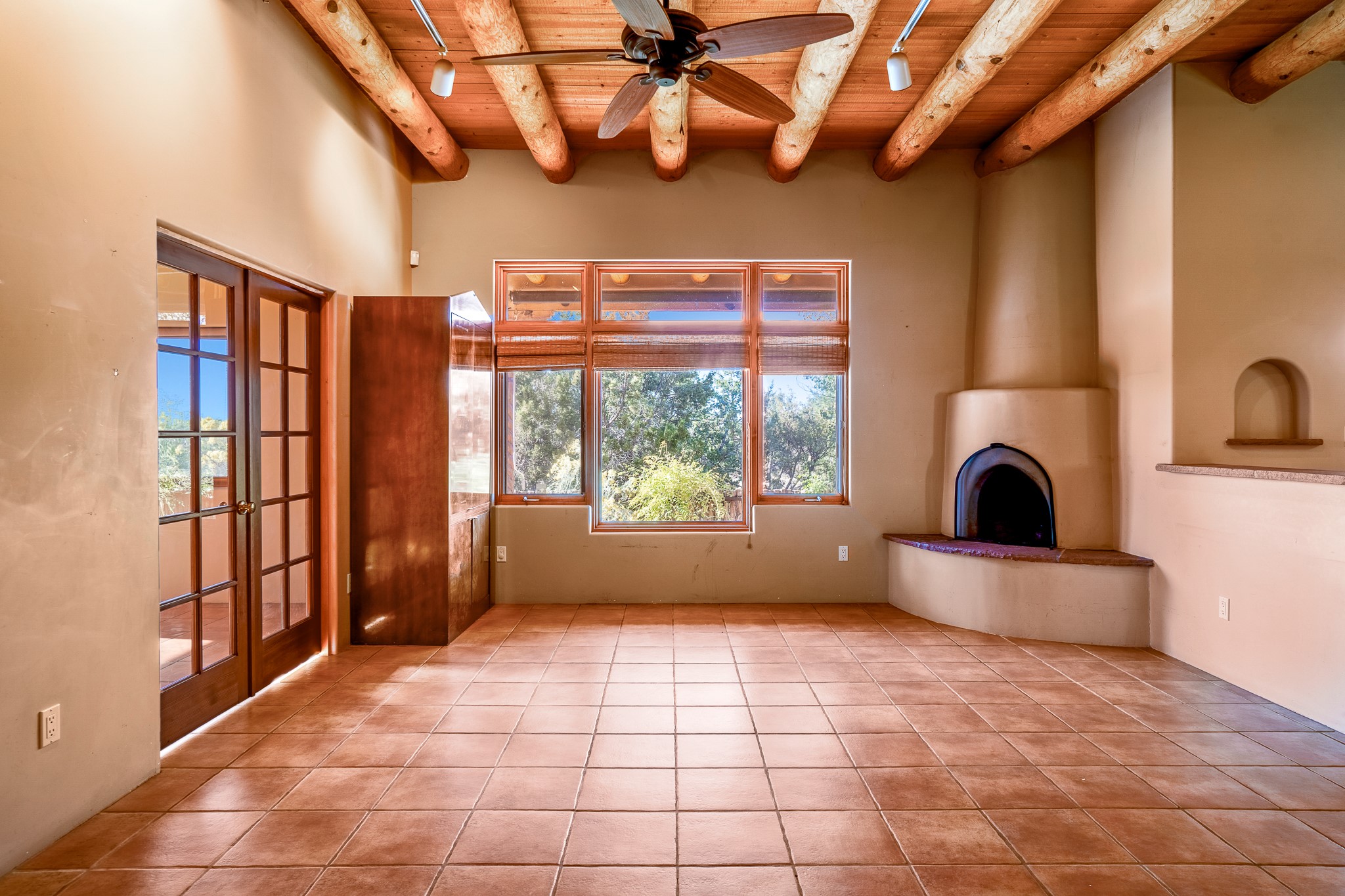 This four bedroom, three bath Adobeworks home, just off a paved road, is located to offer privacy and quiet. There's ample parking, a two car garage, established landscaping (Aspens, Spruce, Crabapple) and hardscaping, and the home is all on one level. Santa Fe features: vigas, two kiva fireplaces, talavera tile, high ceilings, and a media room/library/den/office with built-in shelves, bancos, and separate entrance. The floorplan is open, with good separation of bedrooms; the kitchen has a dining area and stainless appliances. Radiant heat, evaporative cooling, washer/dryer, excellent storage, Murphy Bed in the guest room. Enjoy an outsized front portal and large fenced yard for dogs or just for gardening--there's a drip system. Not far from the many amenities of Eldorado.