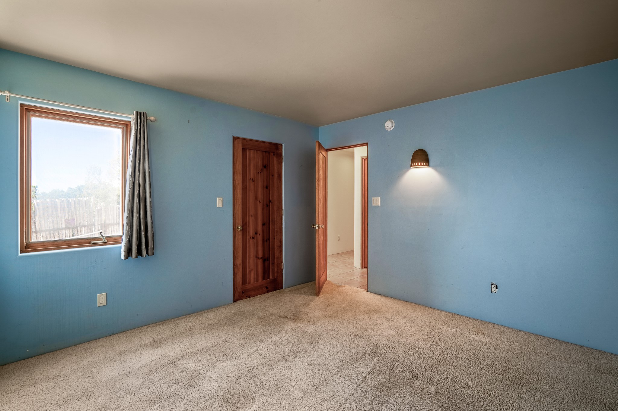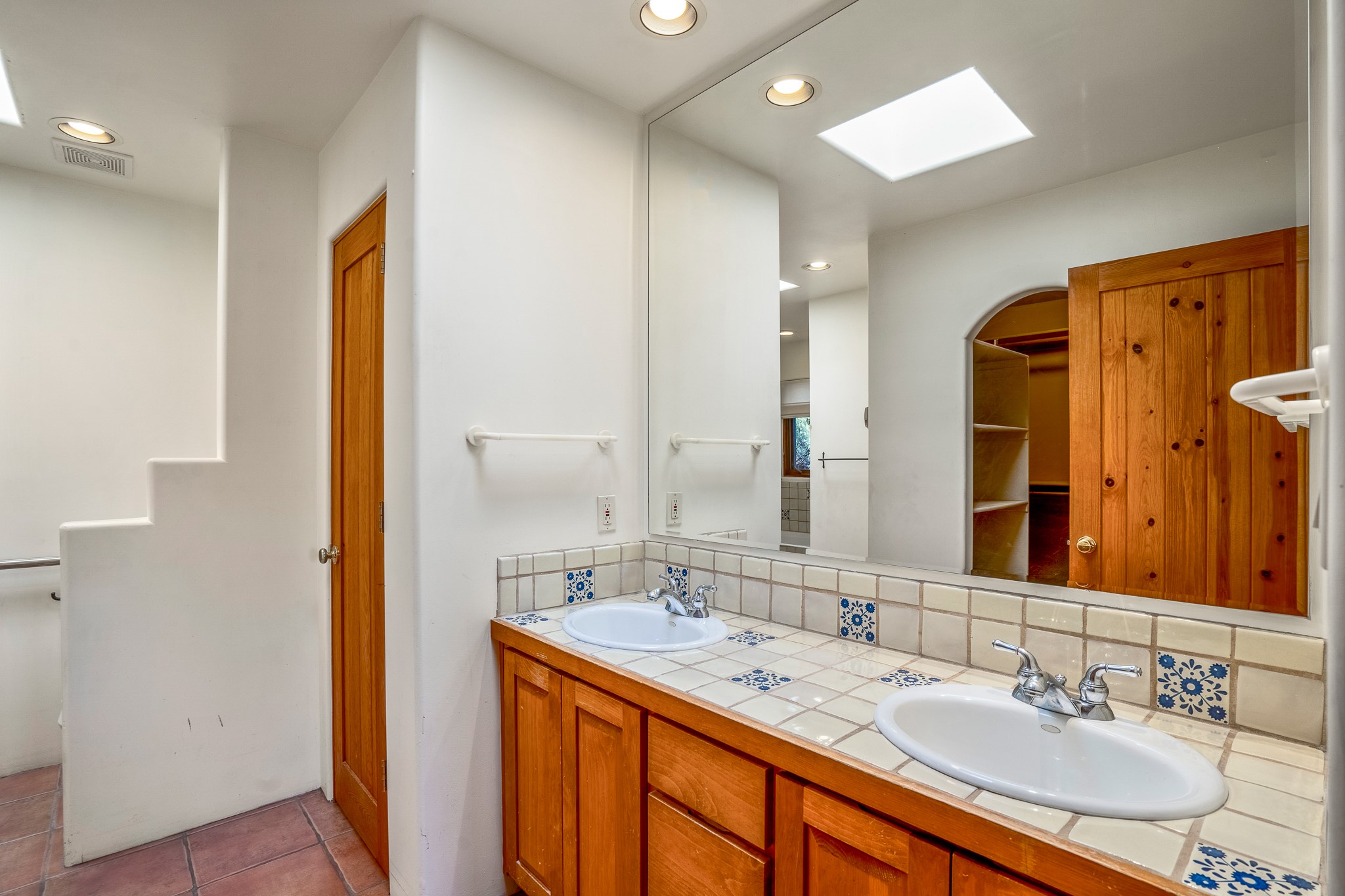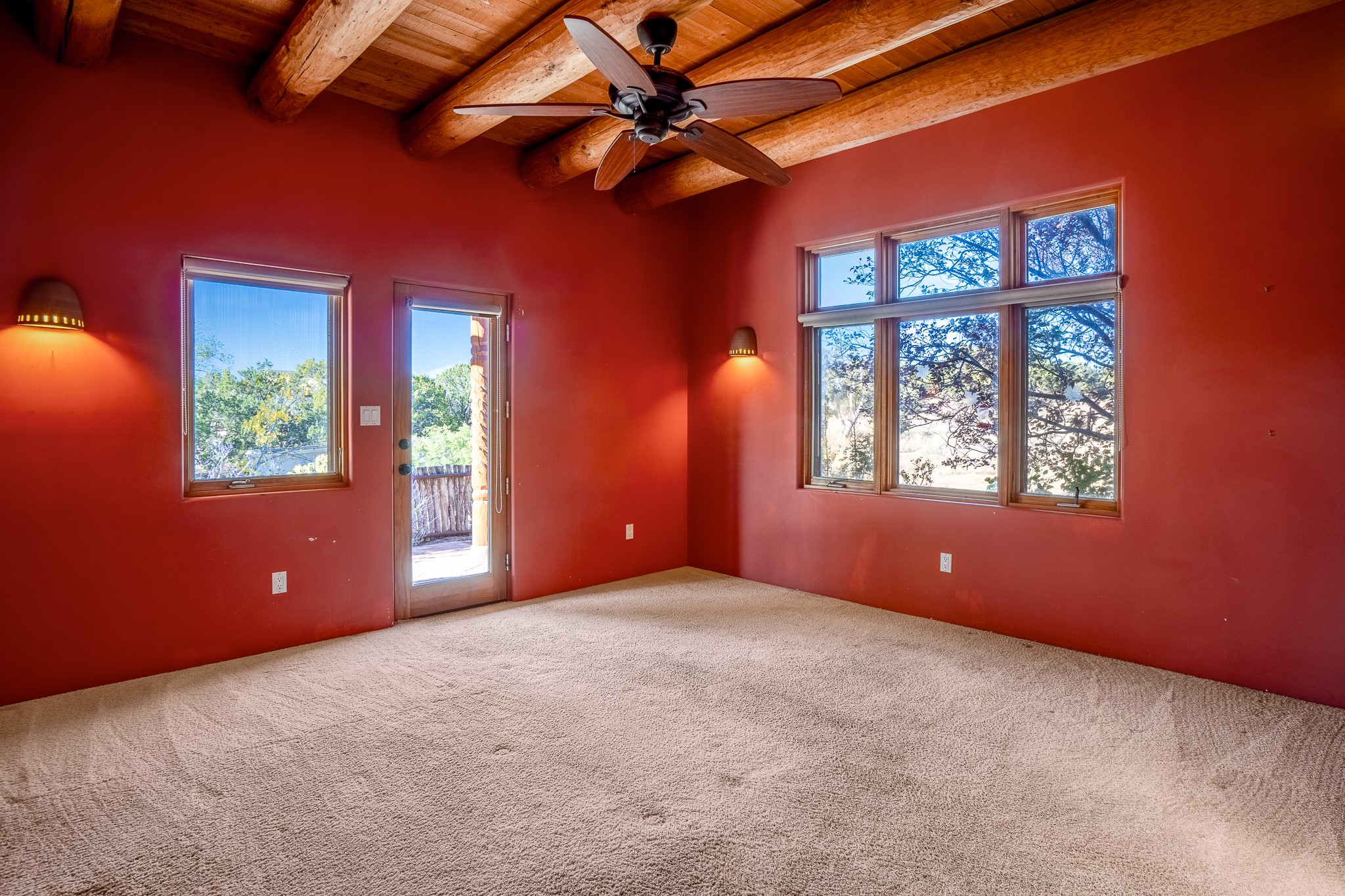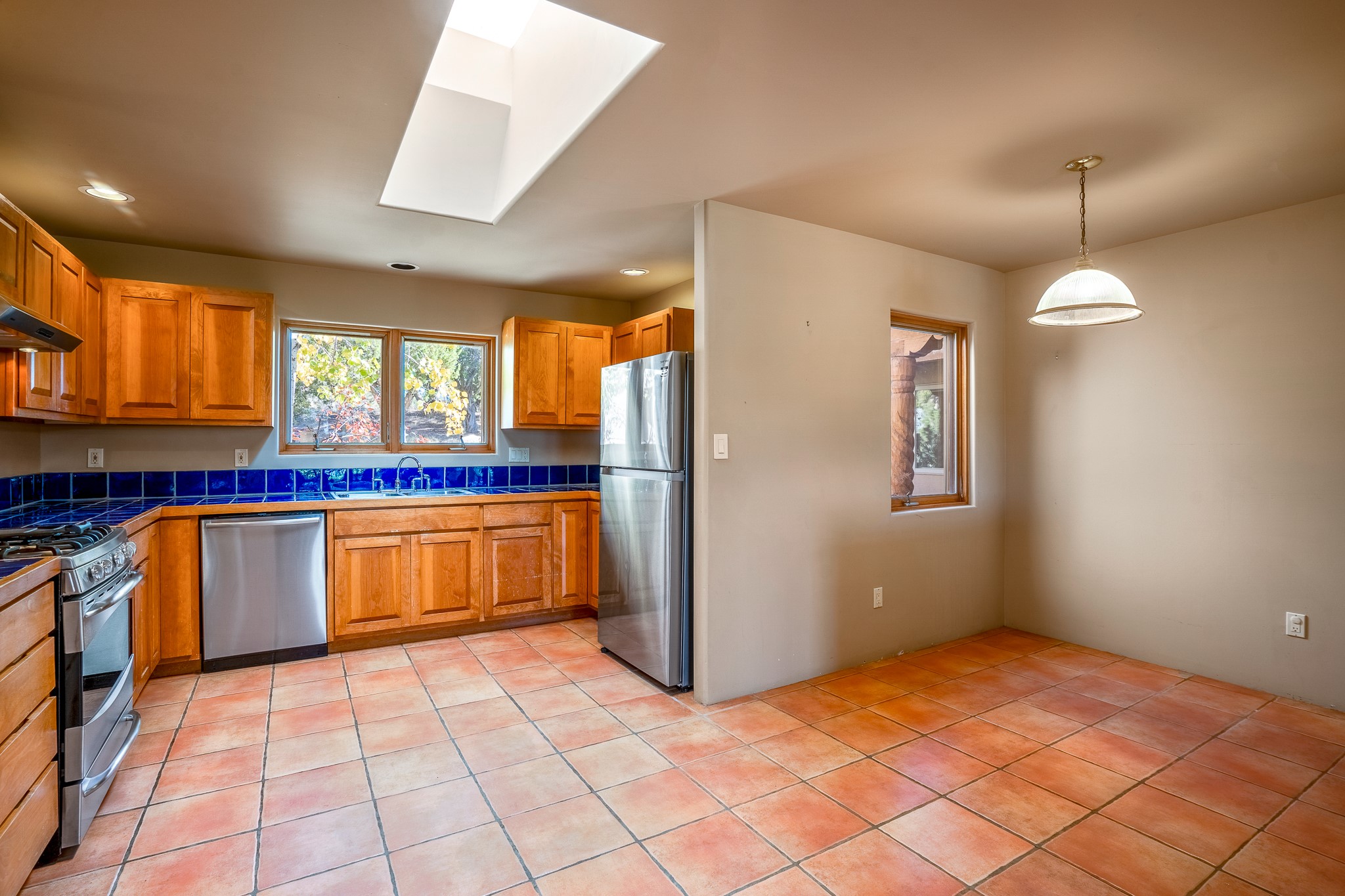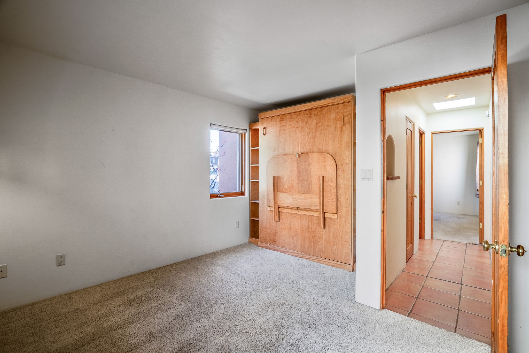 This four bedroom, three bath Adobeworks home, just off a paved road, is located to offer privacy and quiet. There's ample parking, a two car garage, established landscaping (Aspens, Spruce, Crabapple) and hardscaping, and the home is all on one level. Santa Fe features: vigas, two kiva fireplaces, talavera tile, high ceilings, and a media room/library/den/office with built-in shelves, bancos, and separate entrance. The floorplan is open, with good separation of bedrooms; the kitchen has a dining area and stainless appliances. Radiant heat, evaporative cooling, washer/dryer, excellent storage, Murphy Bed in the guest room. Enjoy an outsized front portal and large fenced yard for dogs or just for gardening--there's a drip system. Not far from the many amenities of Eldorado.