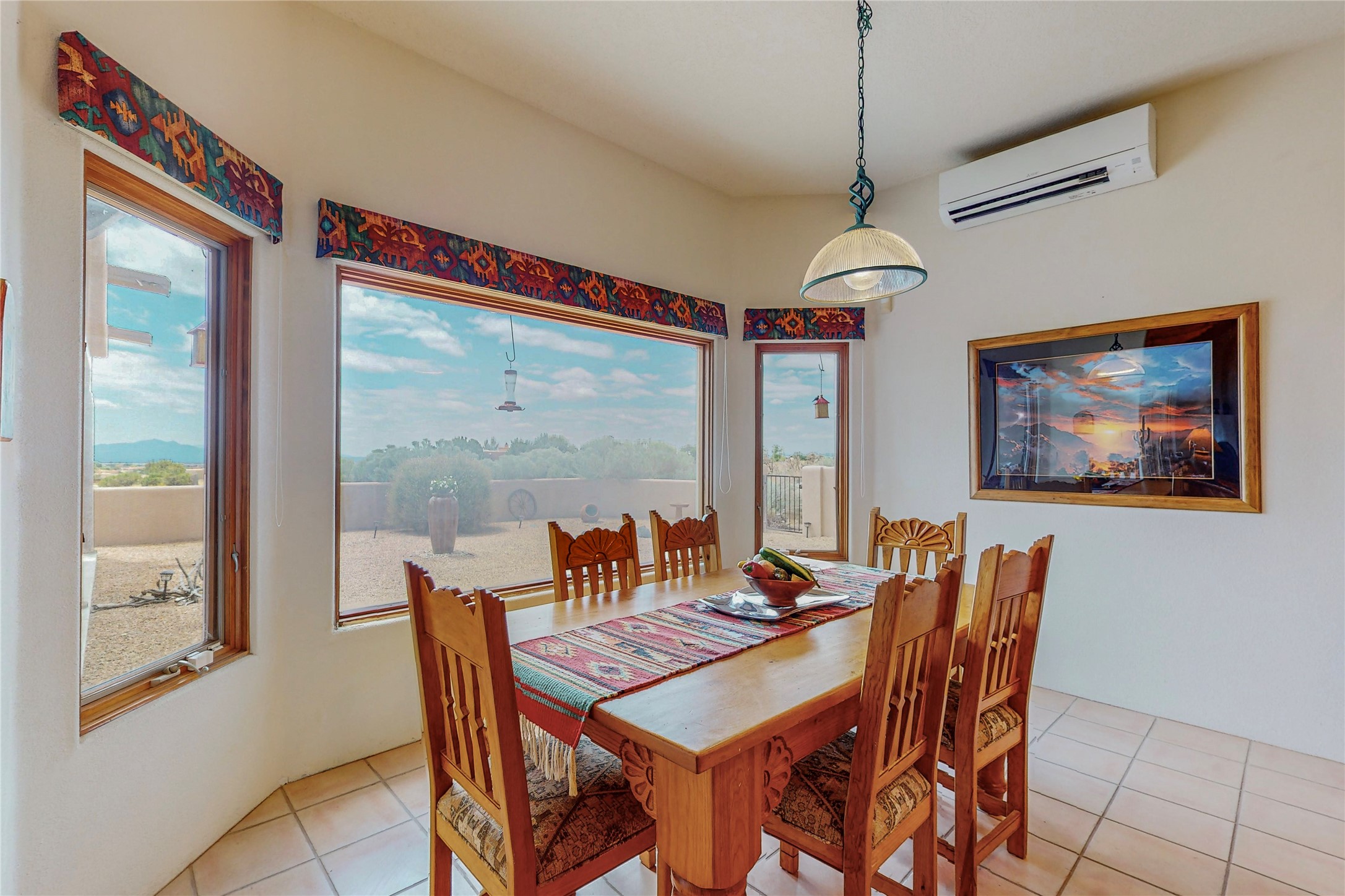 This lovely one owner home was carefully sited and built by Homes by Marie to access expansive mountain views. Lovely light and spacious open plan contemporary pueblo design. The split 3 bedroom design has been enlarged to add a den on one side and an exquisite expansive main bedroom suite with a spa like bathroom and large walk in closet on the other. 3 mini-splits have been added for summer cool, natural gas radiant heating in the original home and gas forced air in the newer wing. A large portal for summer sunset dining overlooking a privately walled garden and an easterly front view portal for early coffee or breakfast. This home is ideally located close to the Eldorado Community Center and amenities, 2 local shopping centers, a school, library and senior center. It is on a paved road close to the exits making it an easy few minutes into Santa Fe or to the train station in historic Lamy village.